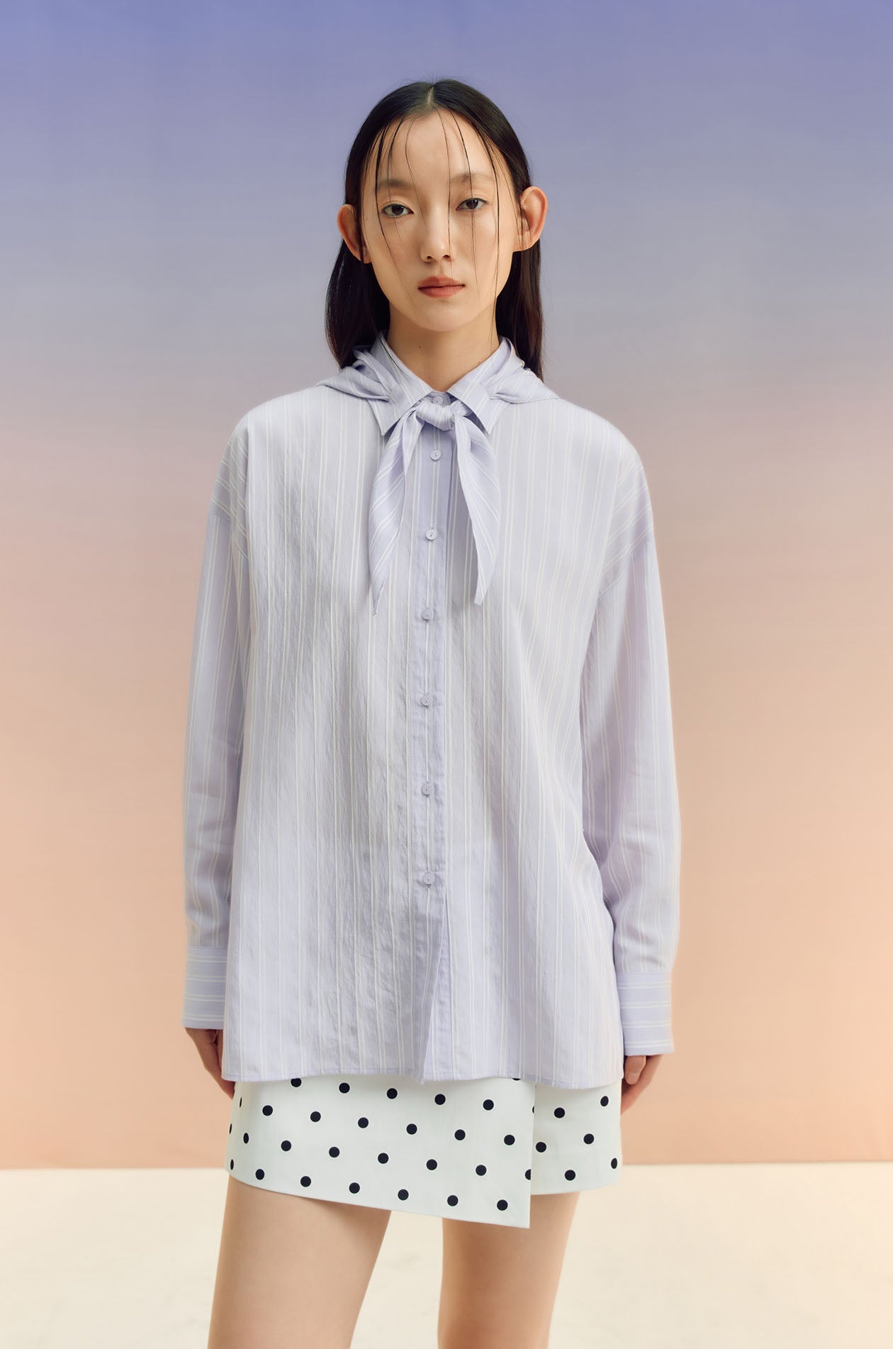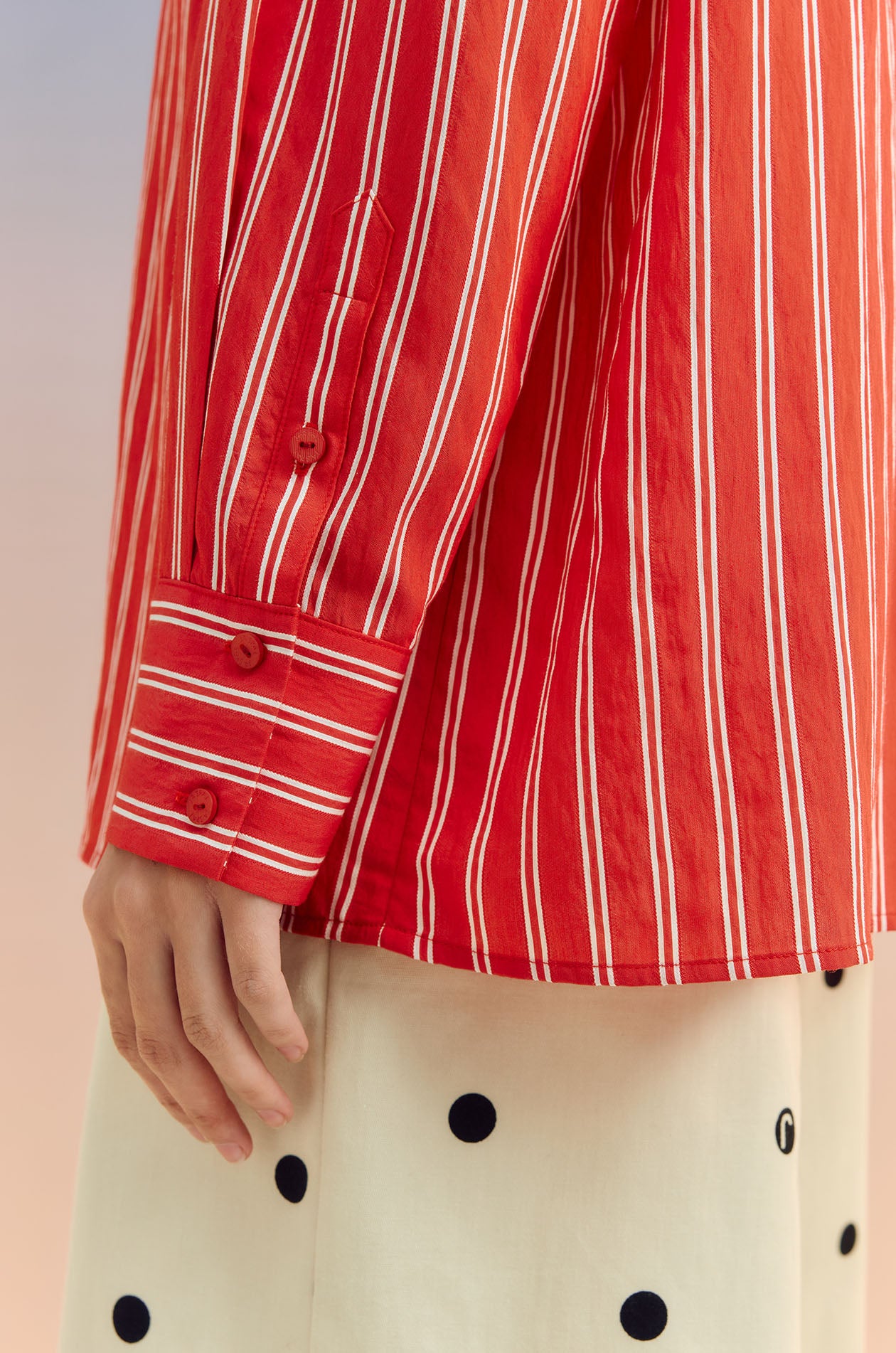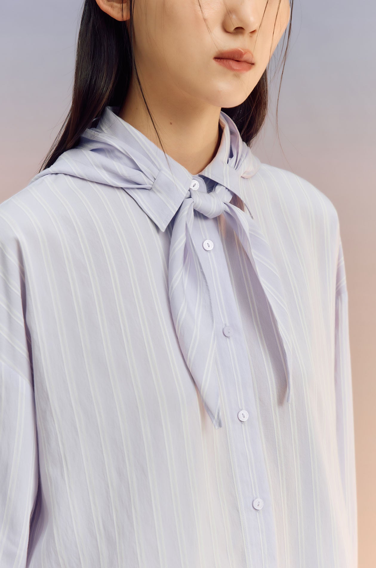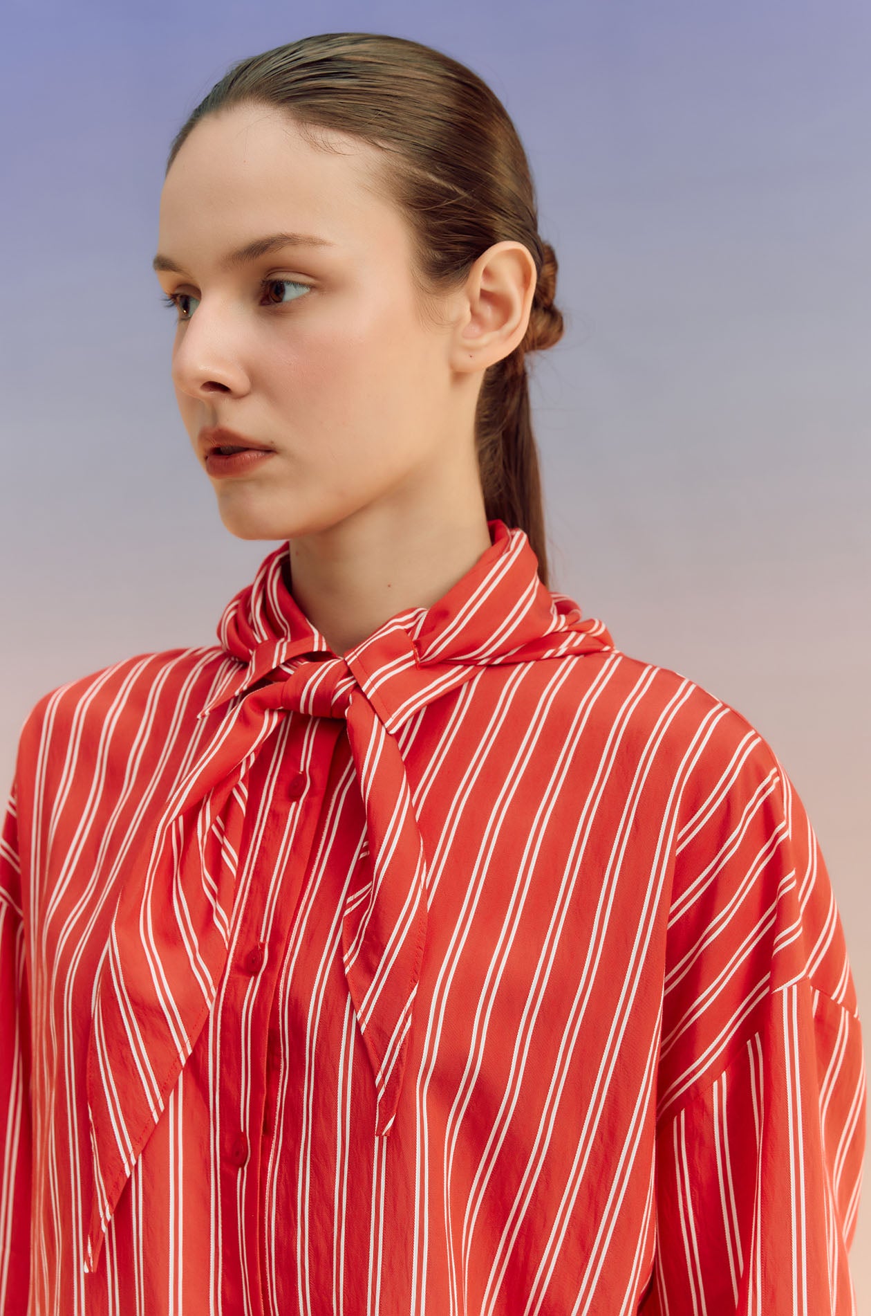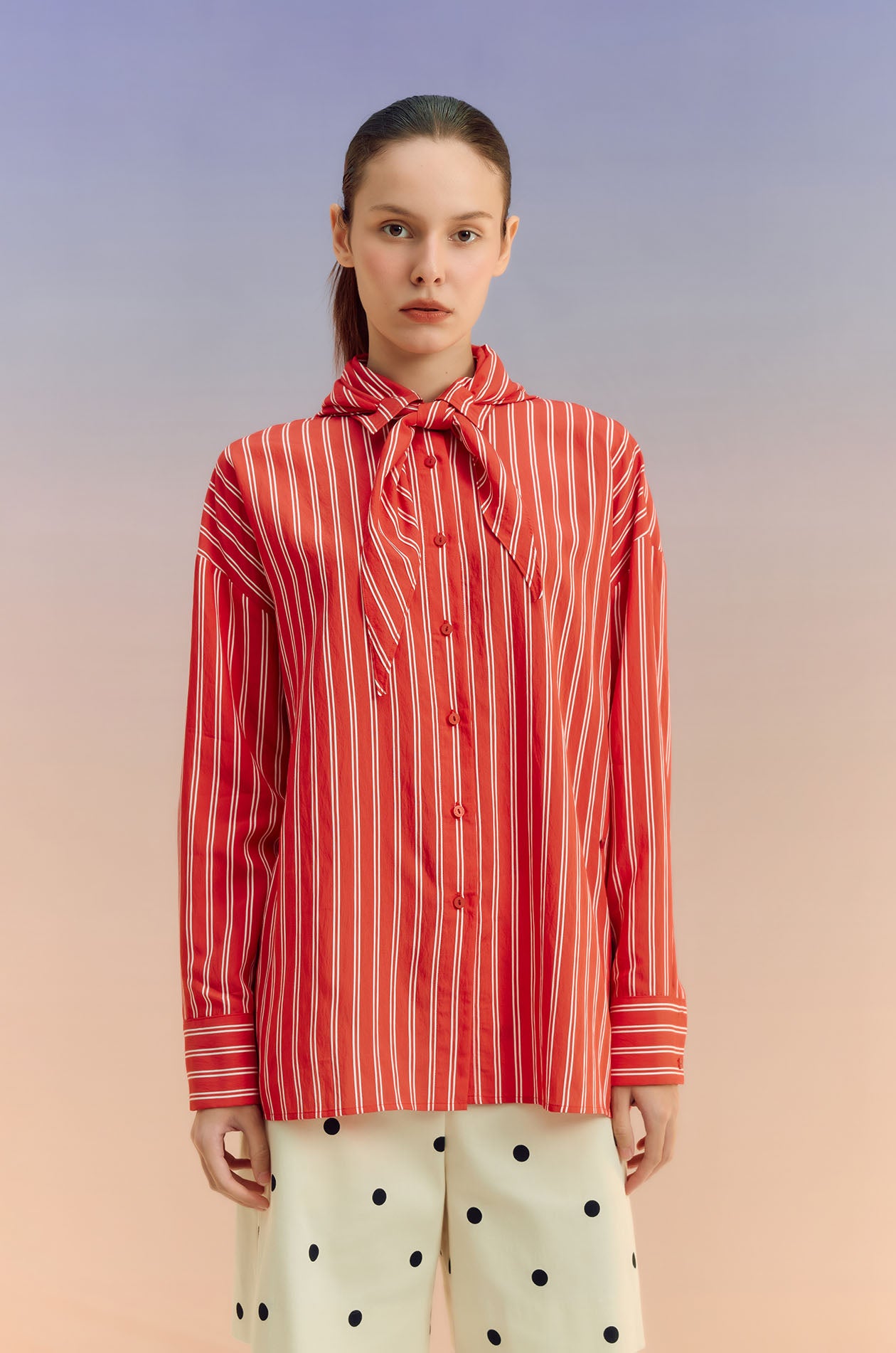 Long-sleeved shirt in viscose blend with stripes. Regular fit with classic collar, matching poplin scarf, and buttoned cuffs. Front button closure. Available in red and purple.