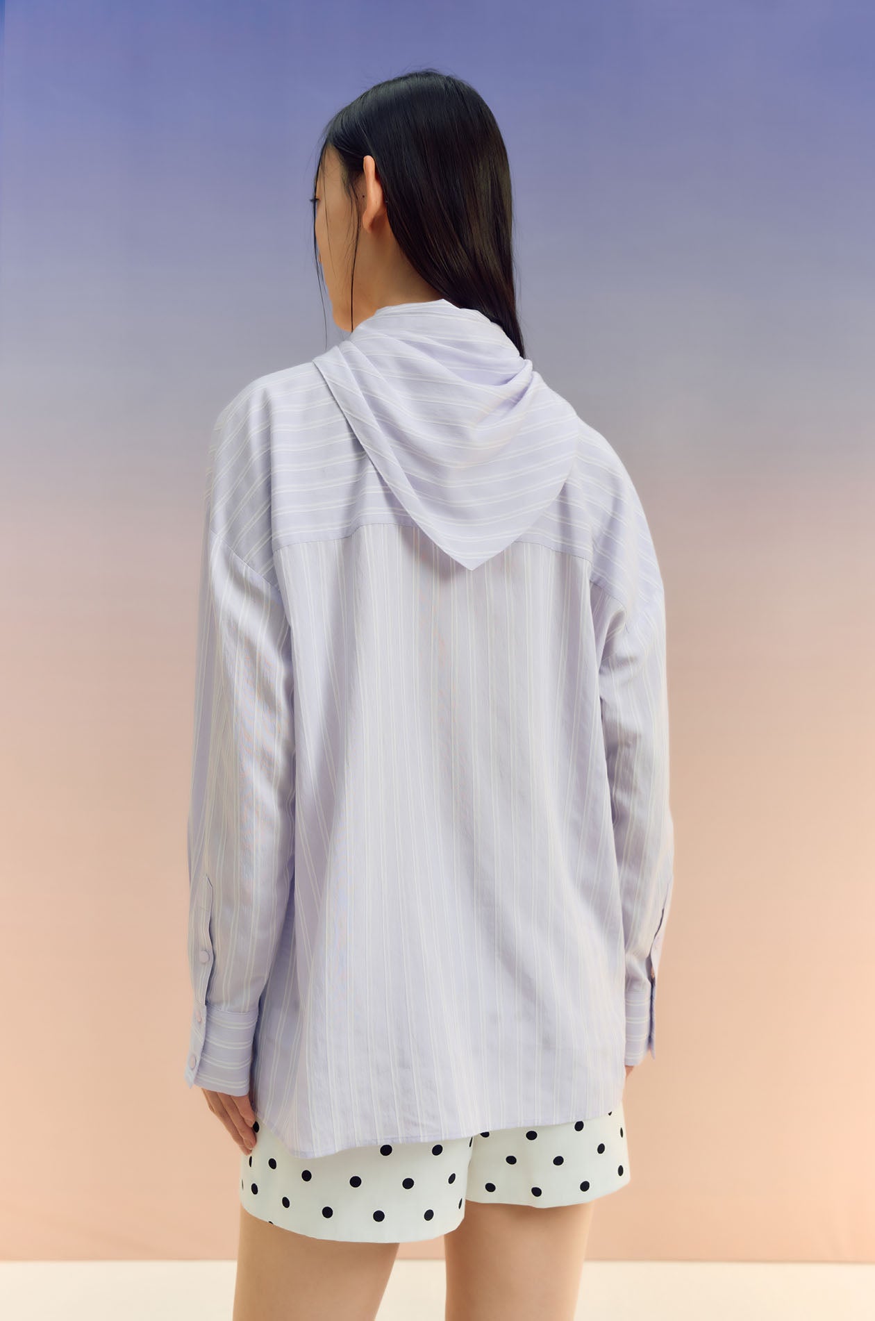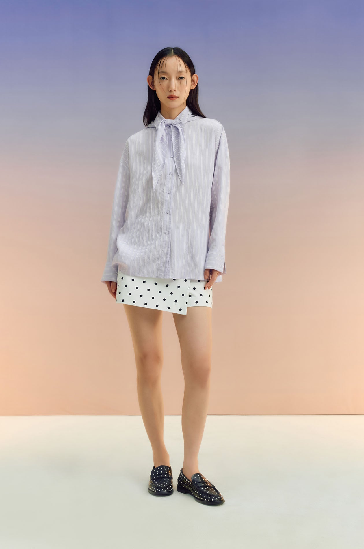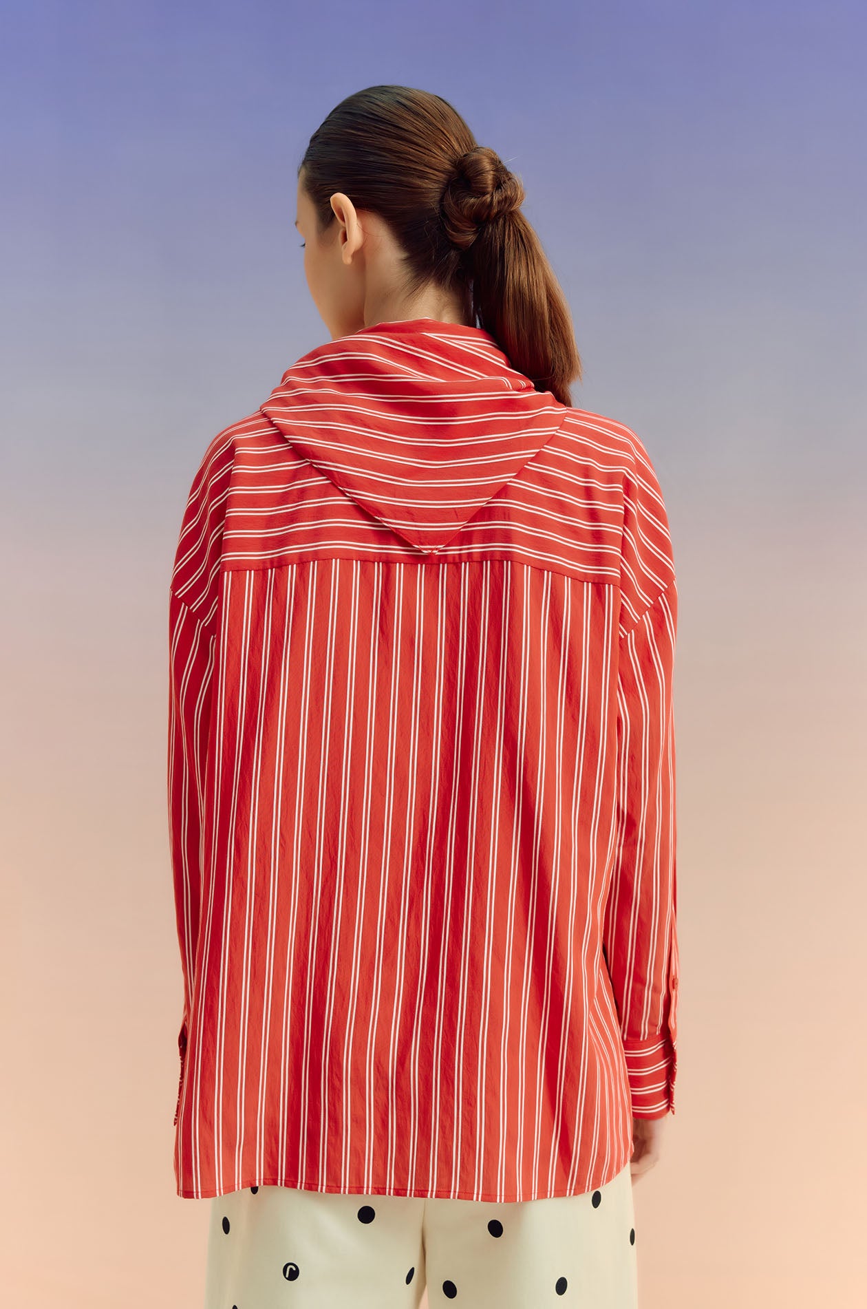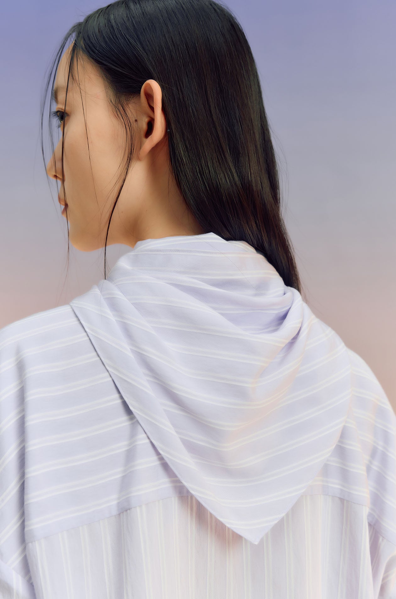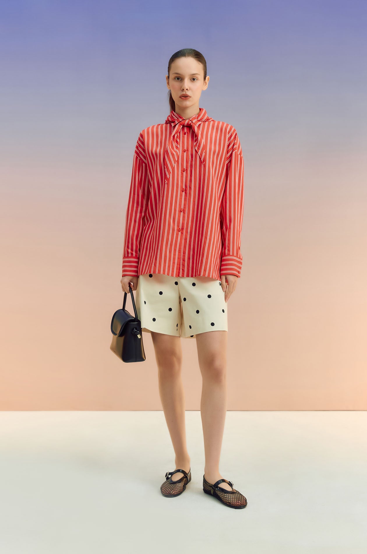 Long-sleeved shirt in viscose blend with stripes. Regular fit with classic collar, matching poplin scarf, and buttoned cuffs. Front button closure. Available in red and purple.