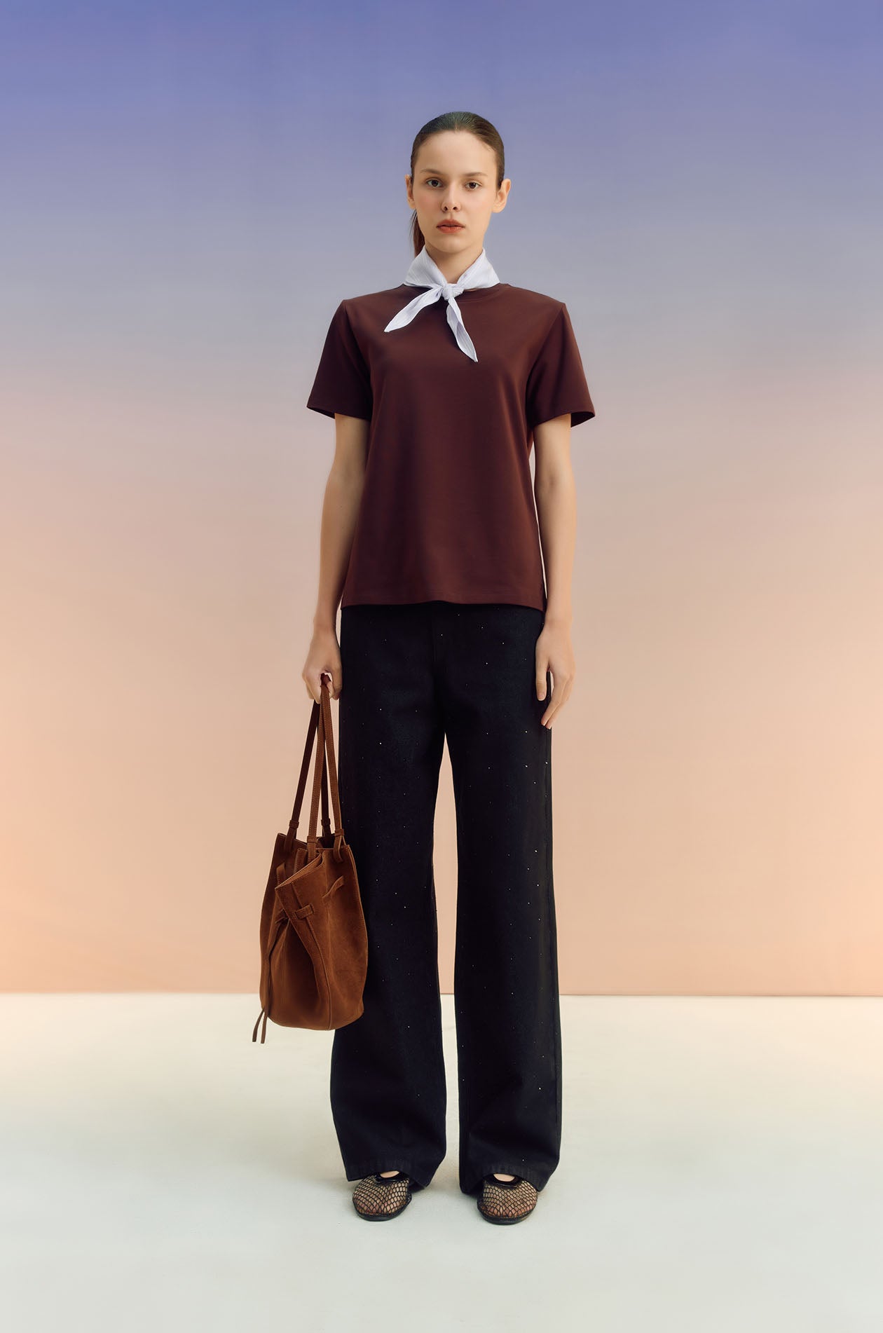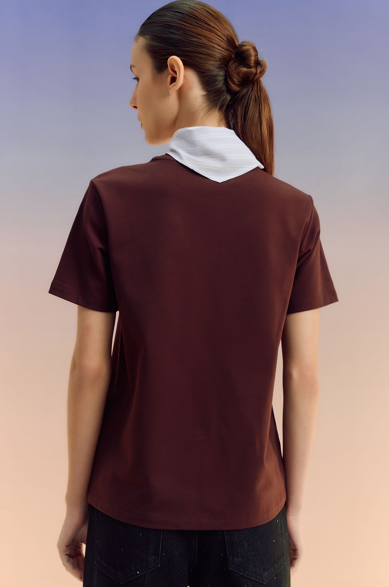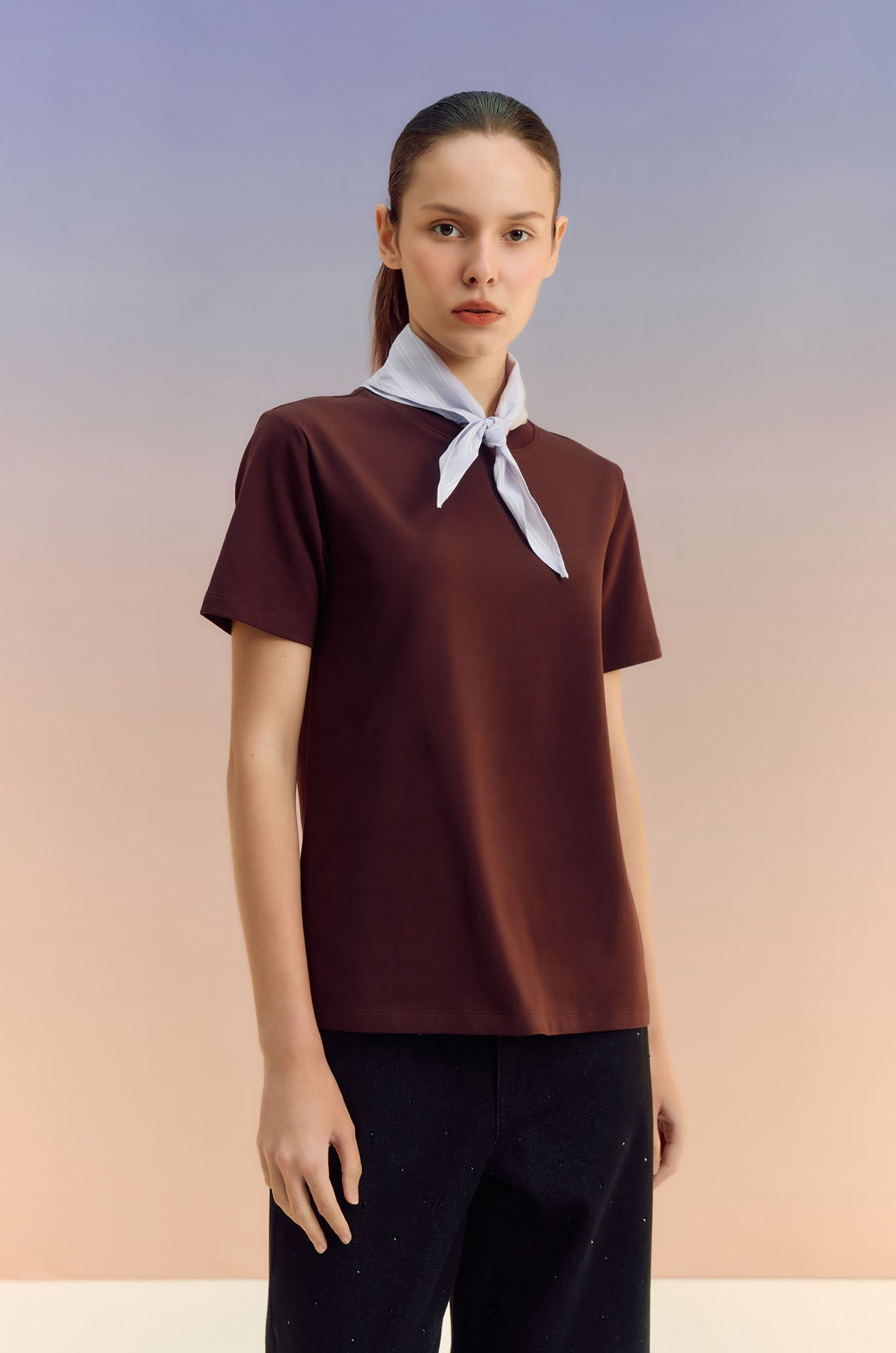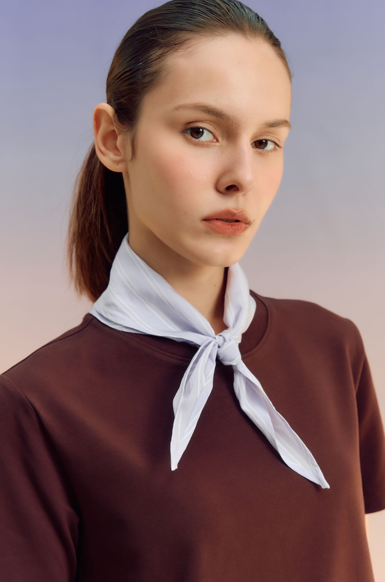 Short-sleeved T-shirt in viscose jersey. Regular fit with round neckline and striped poplin scarf. Available in mahogany.