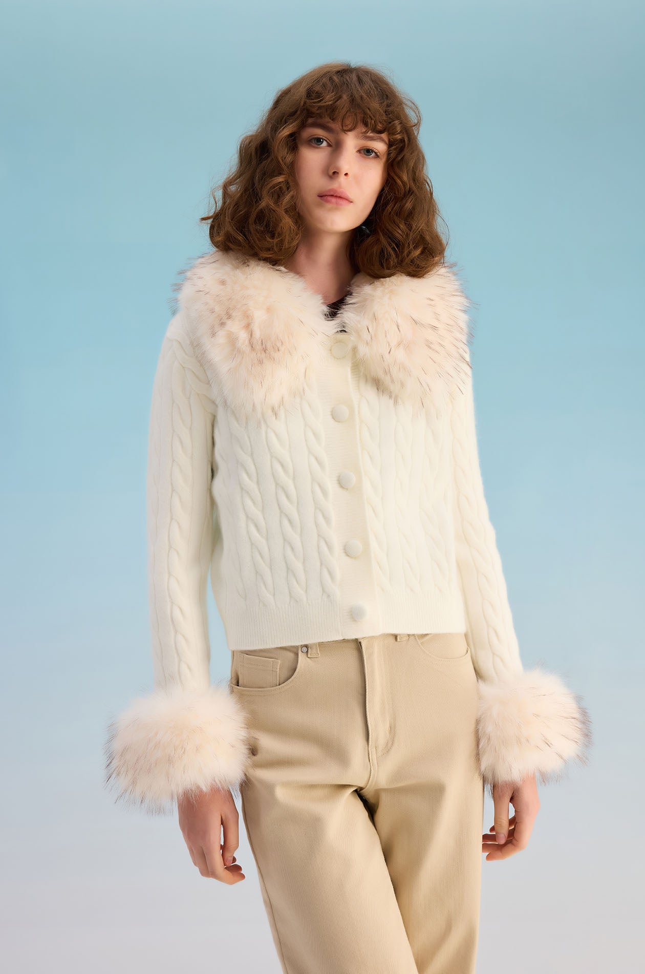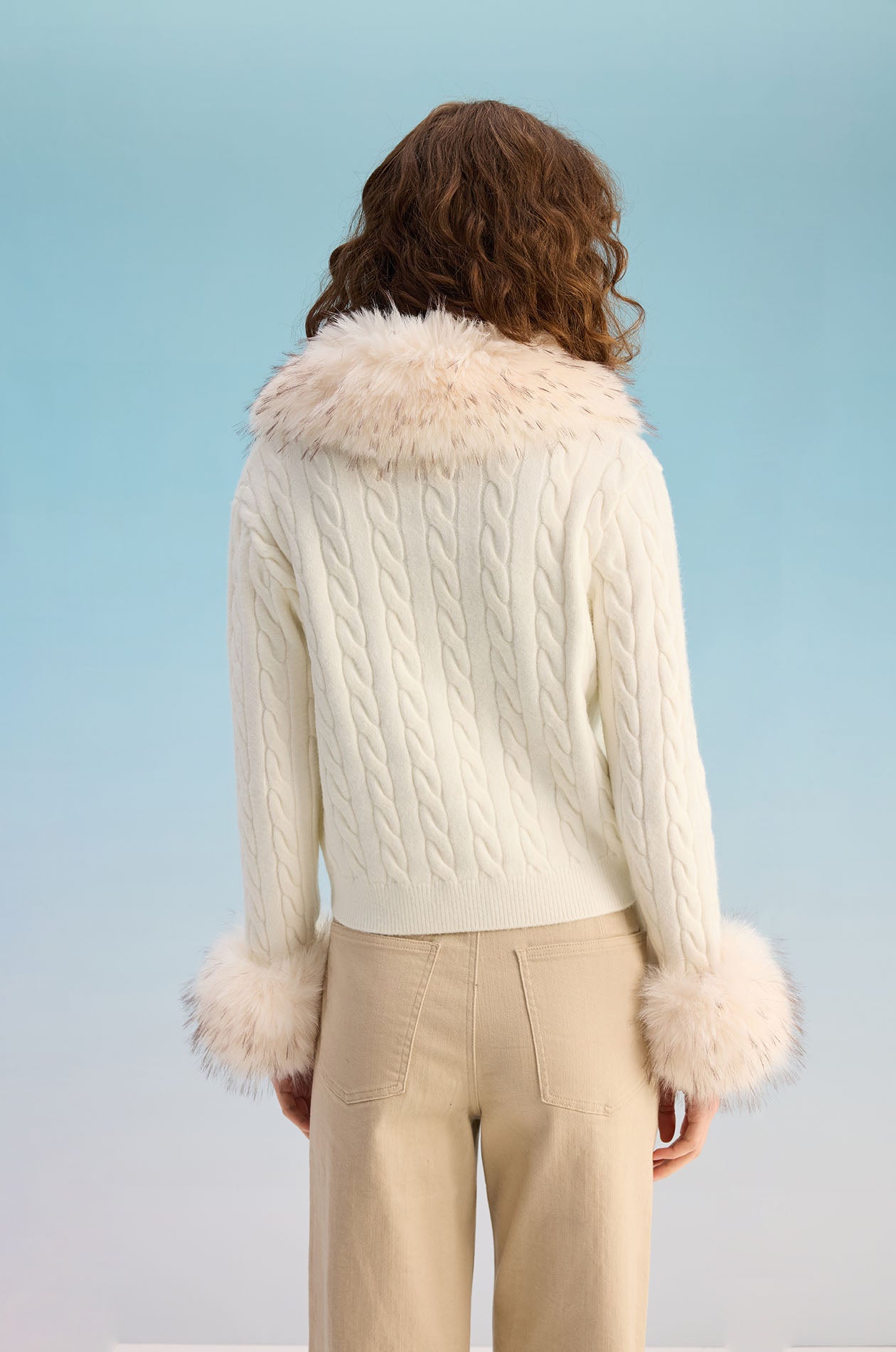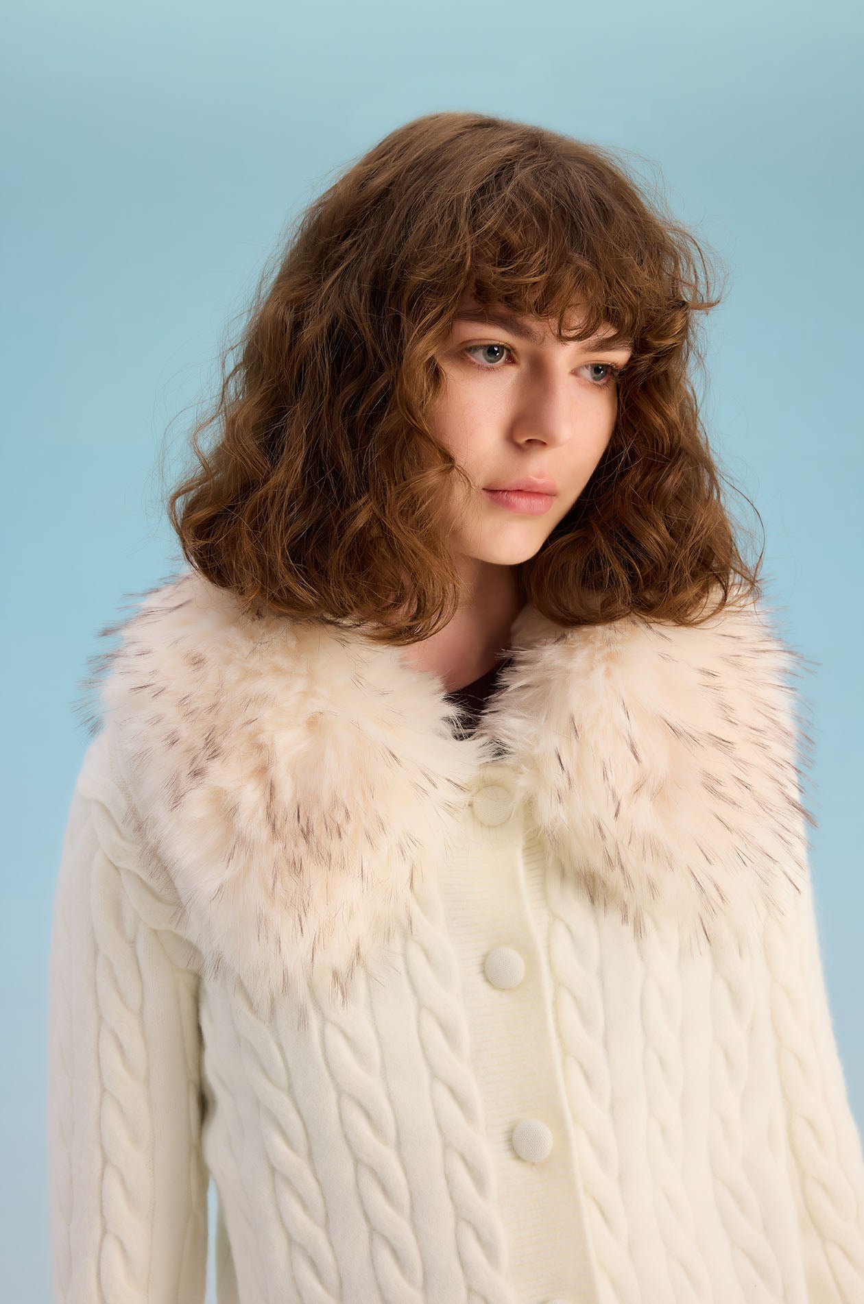 Long-sleeved cardigan in cable knit. Regular fit with round neckline and ribbed edges. Removable faux fur at the collar and cuffs. Front button closure. Available in cream.
