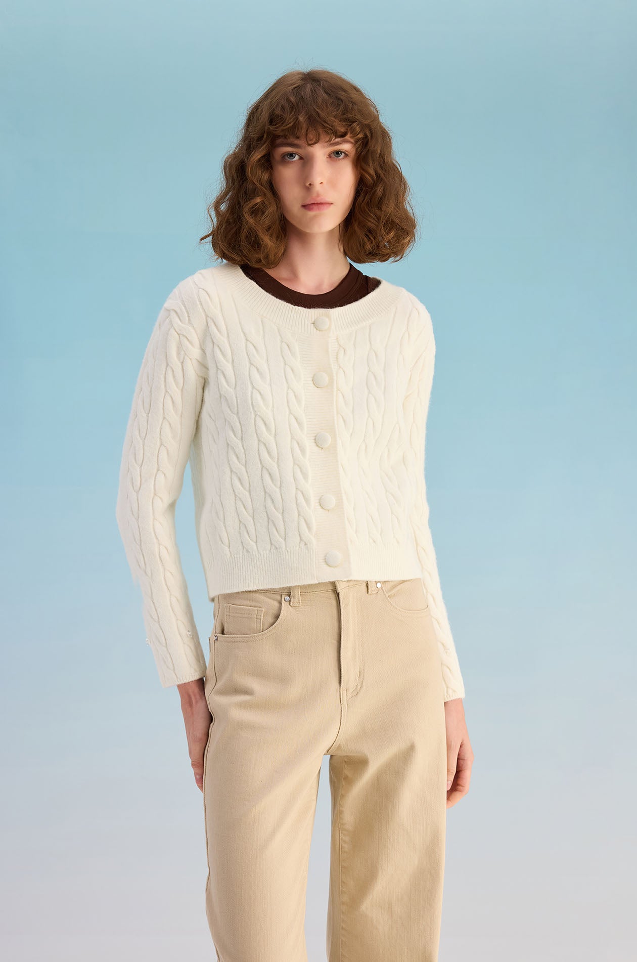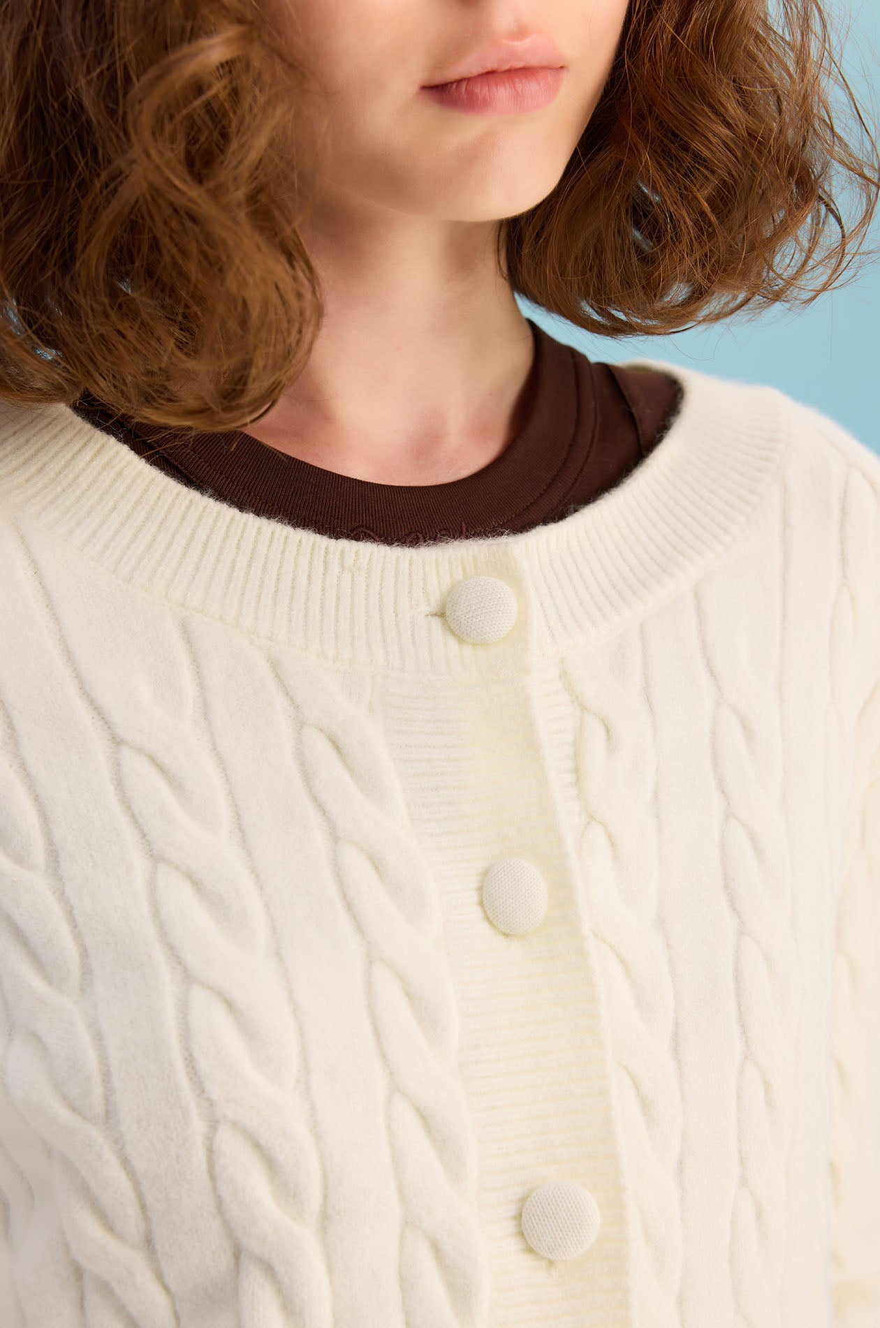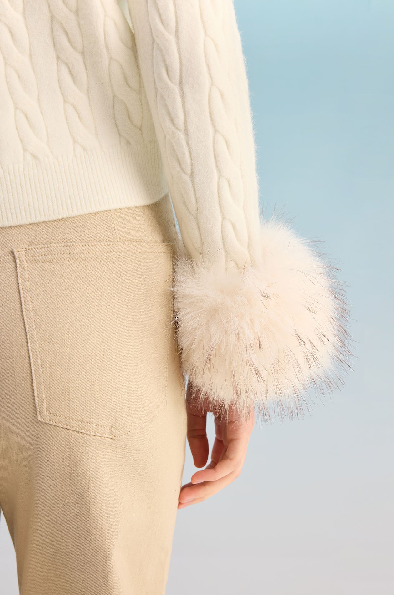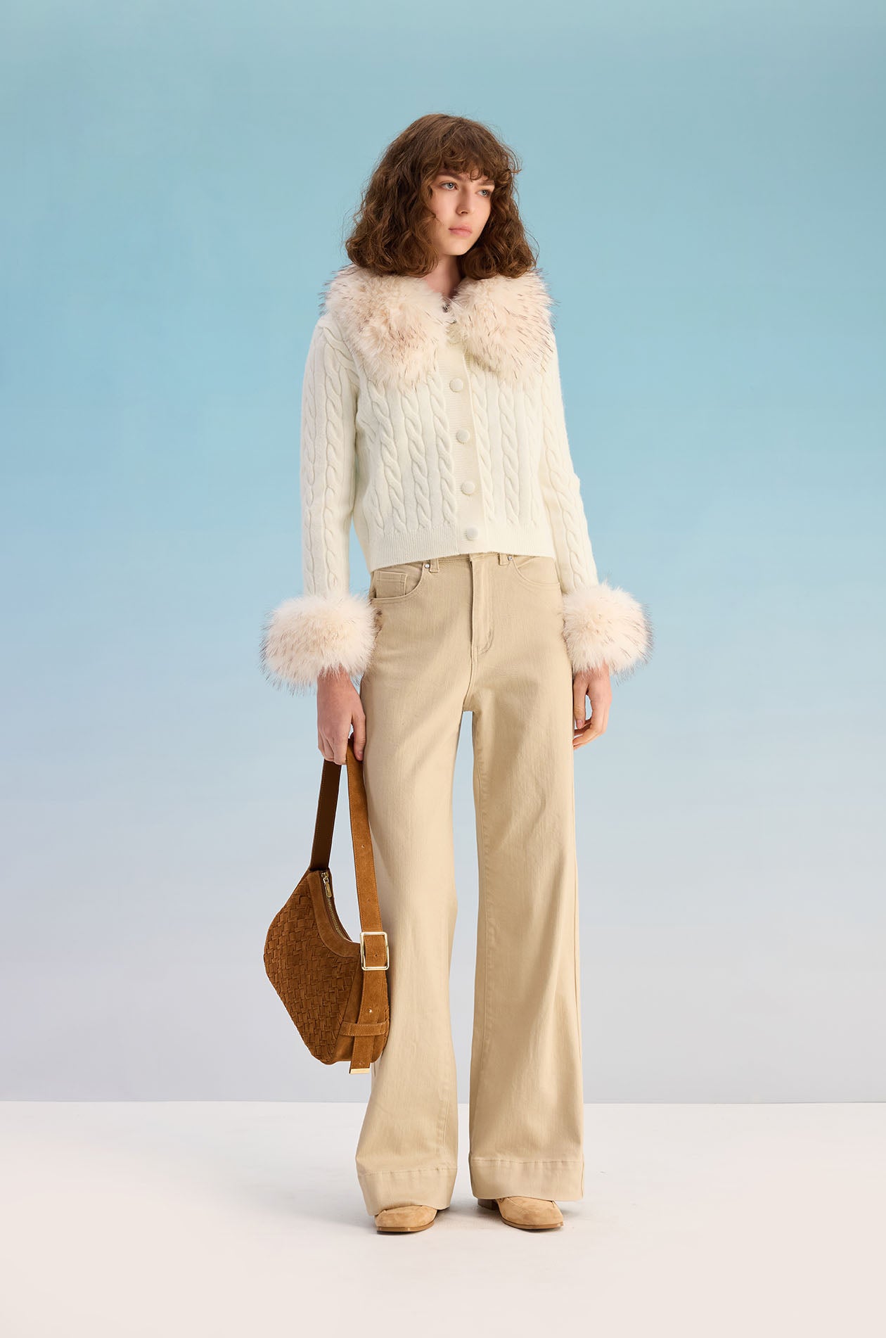 Long-sleeved cardigan in cable knit. Regular fit with round neckline and ribbed edges. Removable faux fur at the collar and cuffs. Front button closure. Available in cream.
