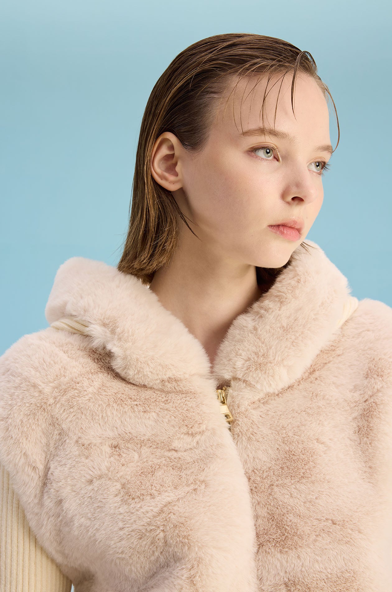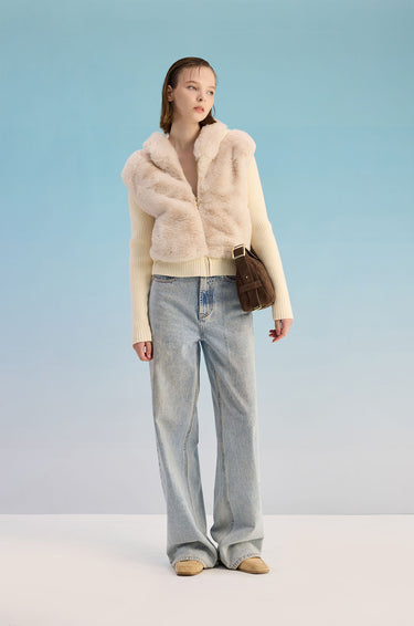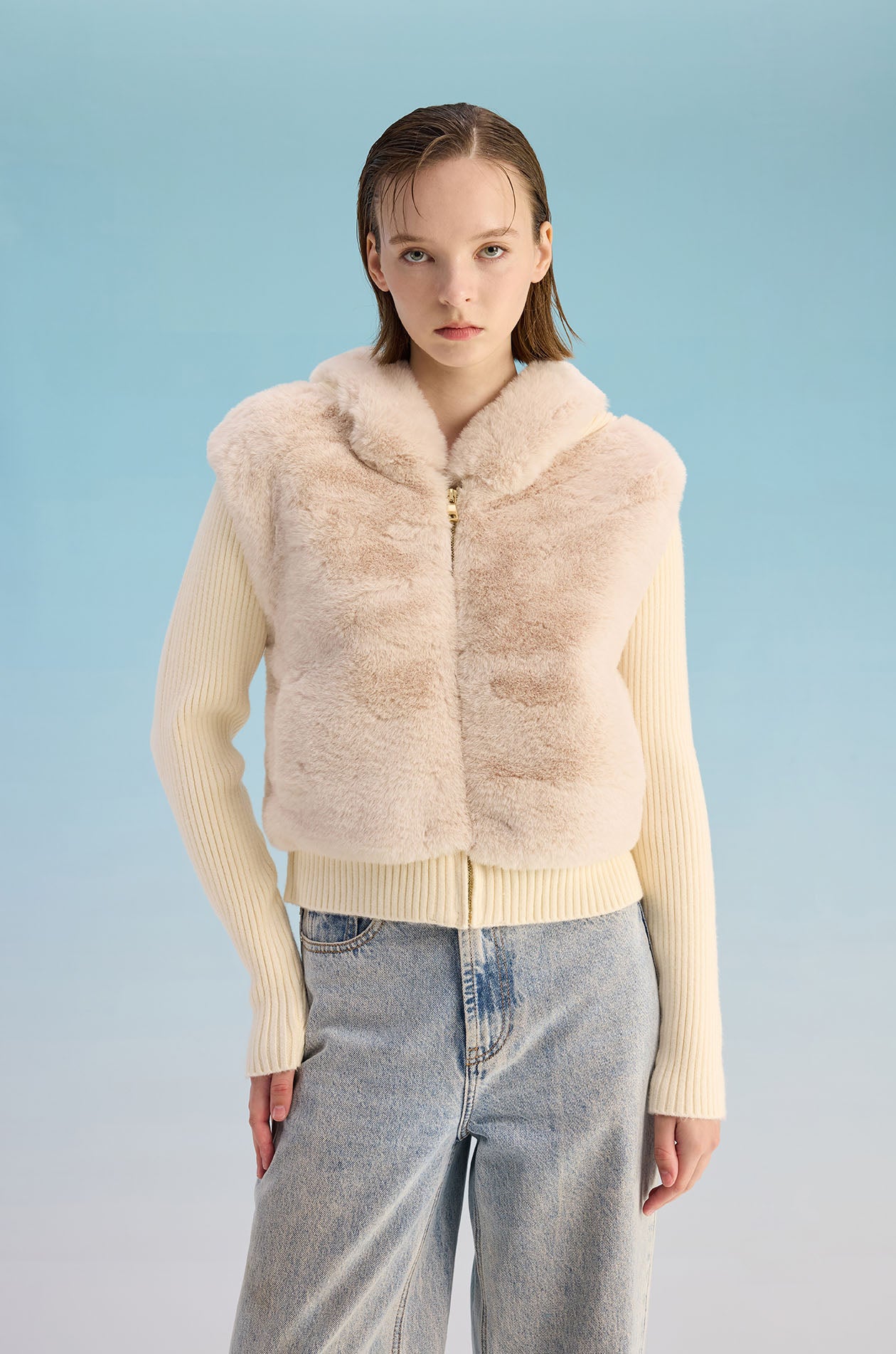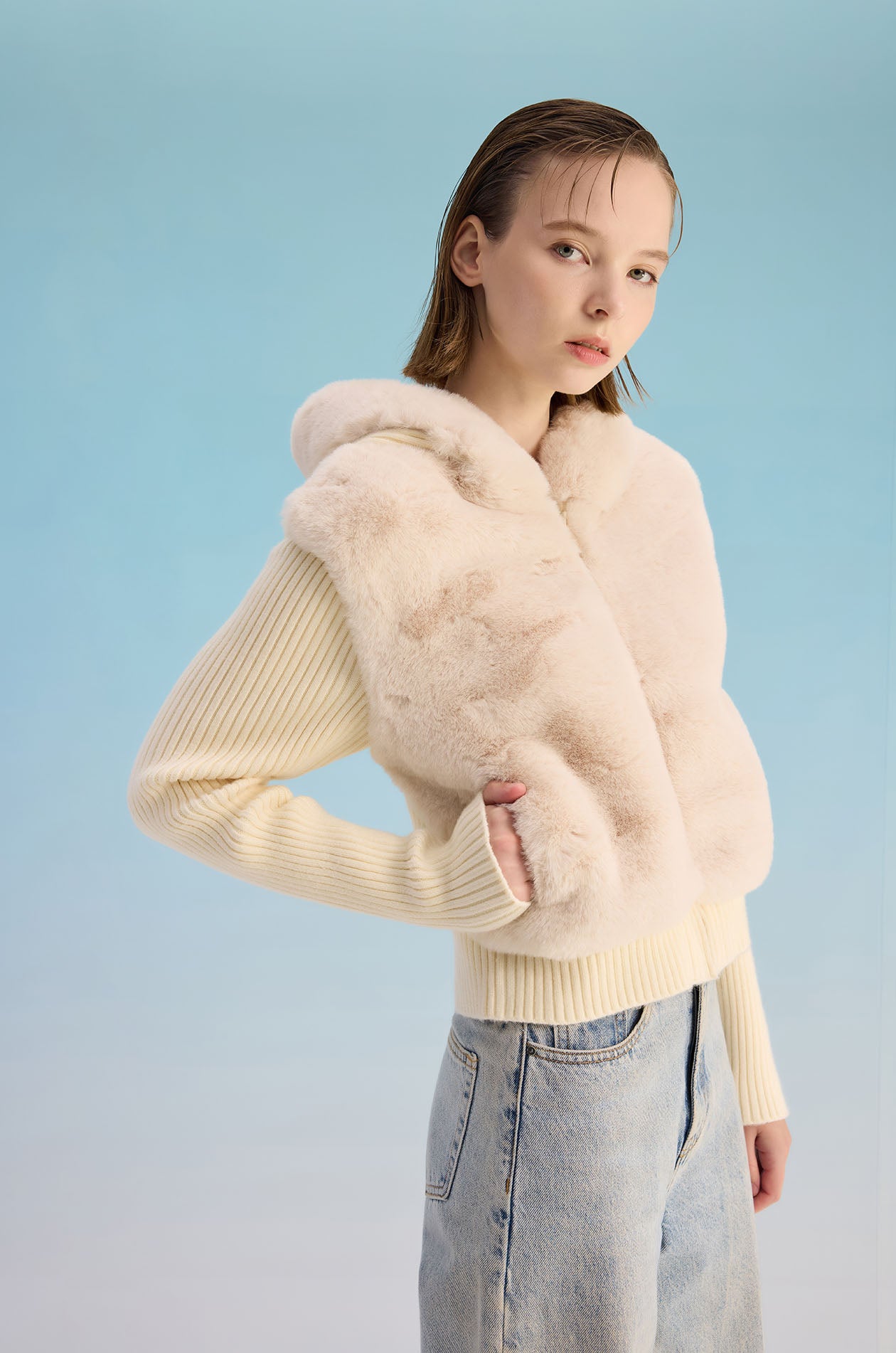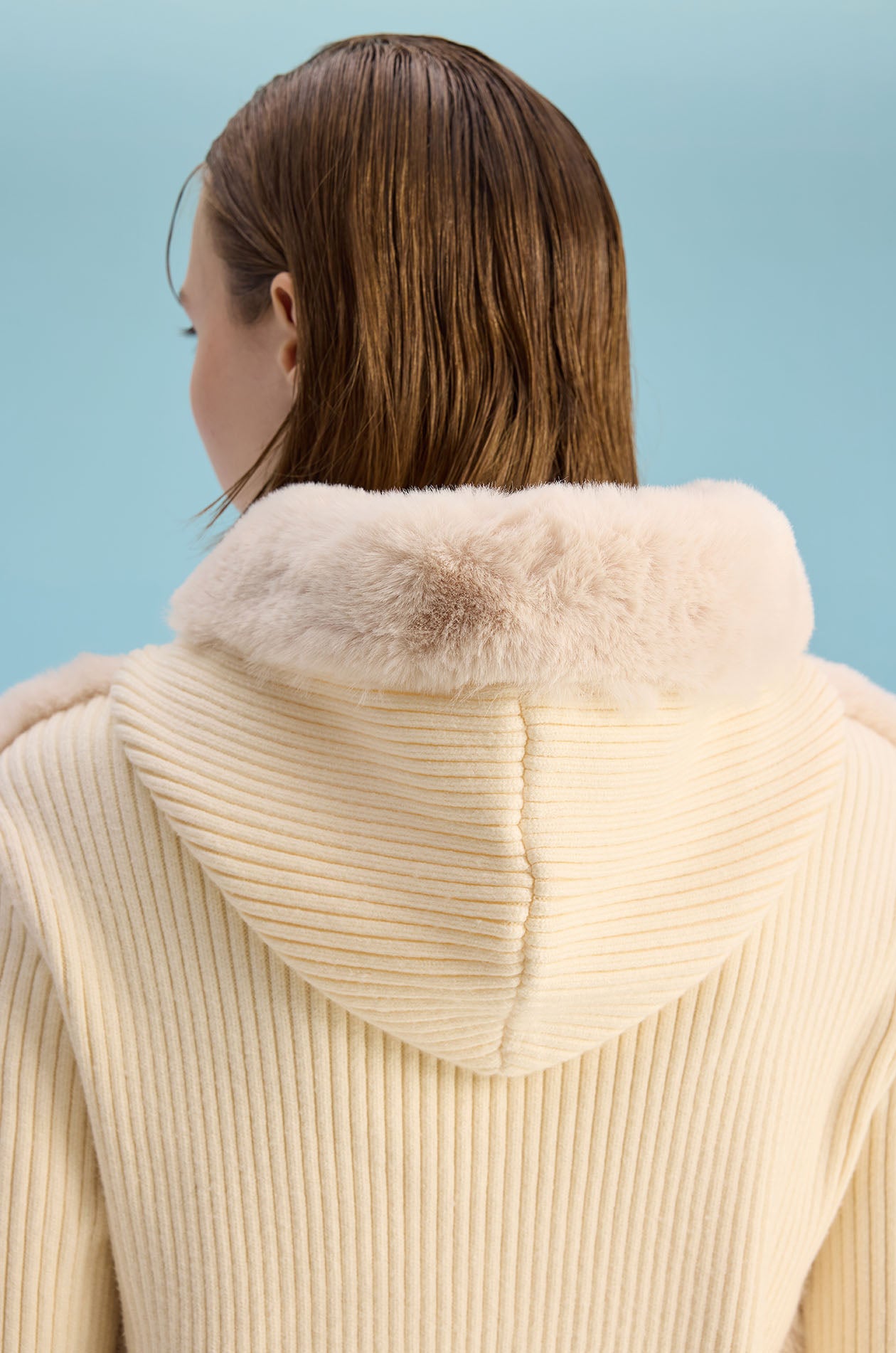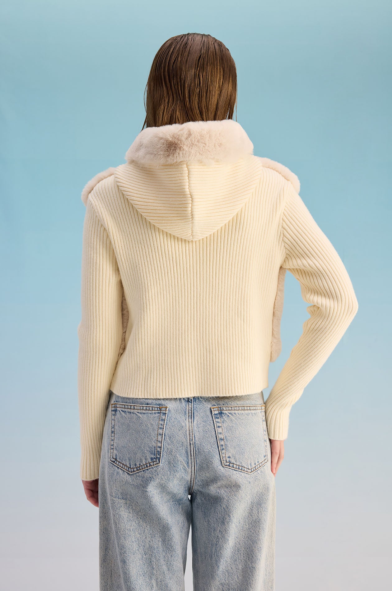 Zipper hoodie in chunky ribbed knit with faux fur panel. Slim fit with slant pockets. Front zip closure. Available in cream.