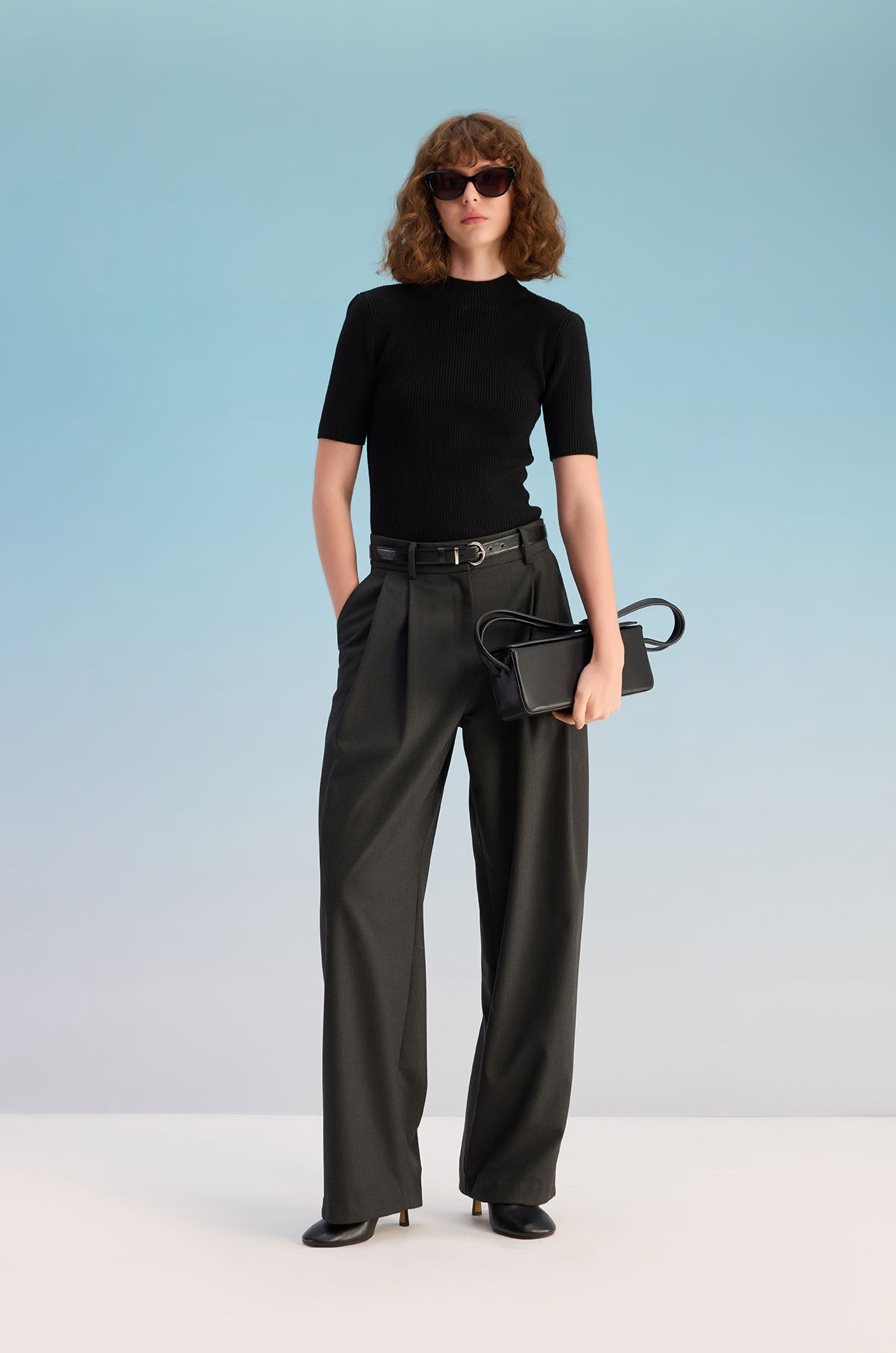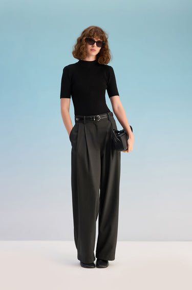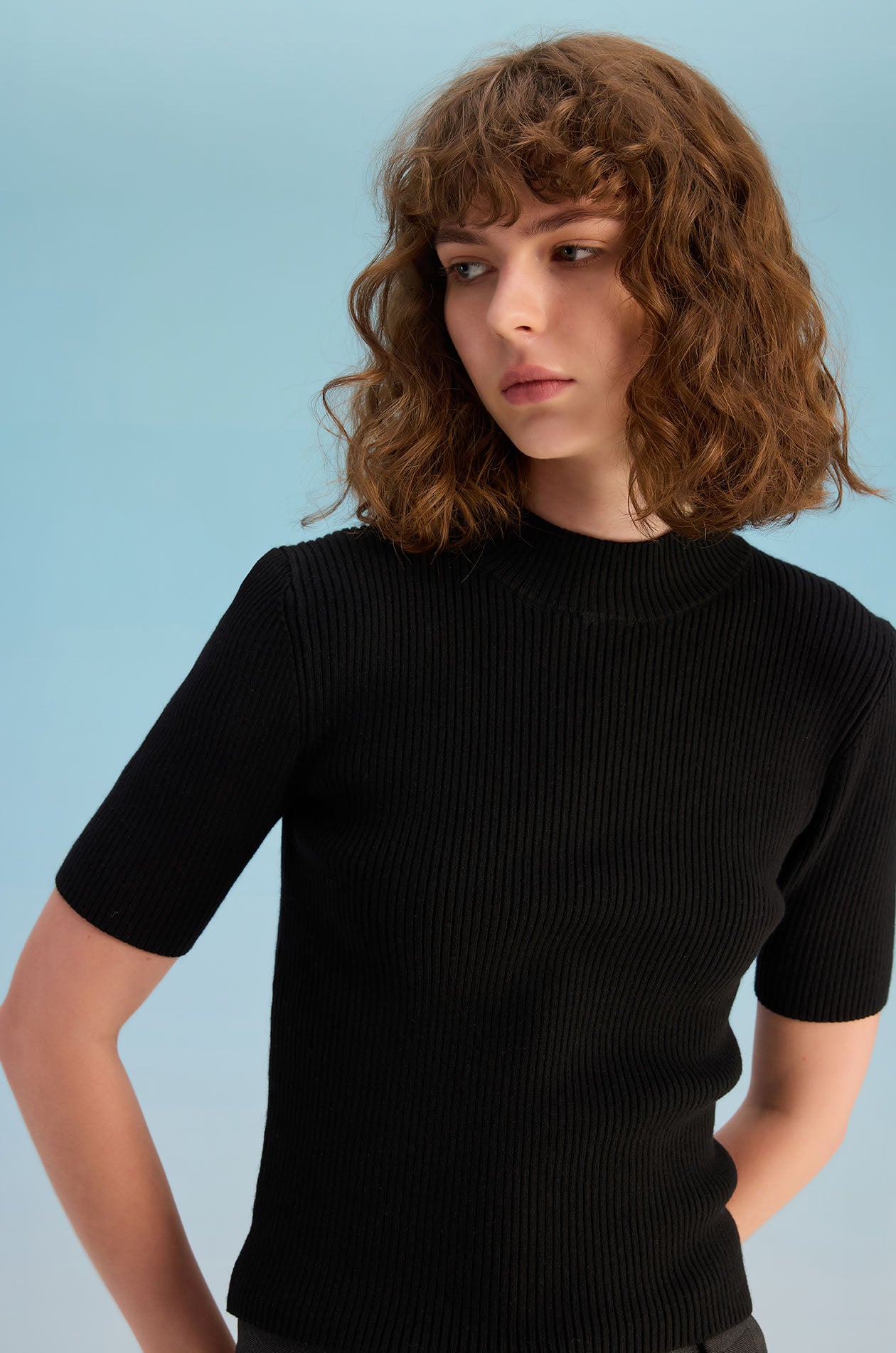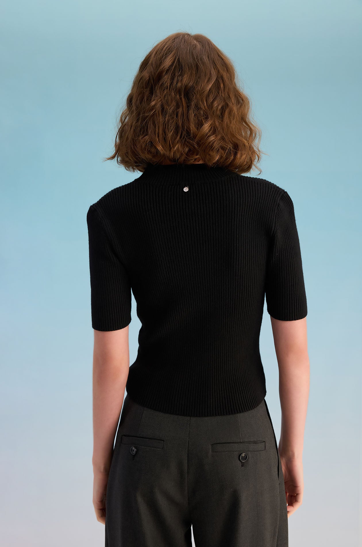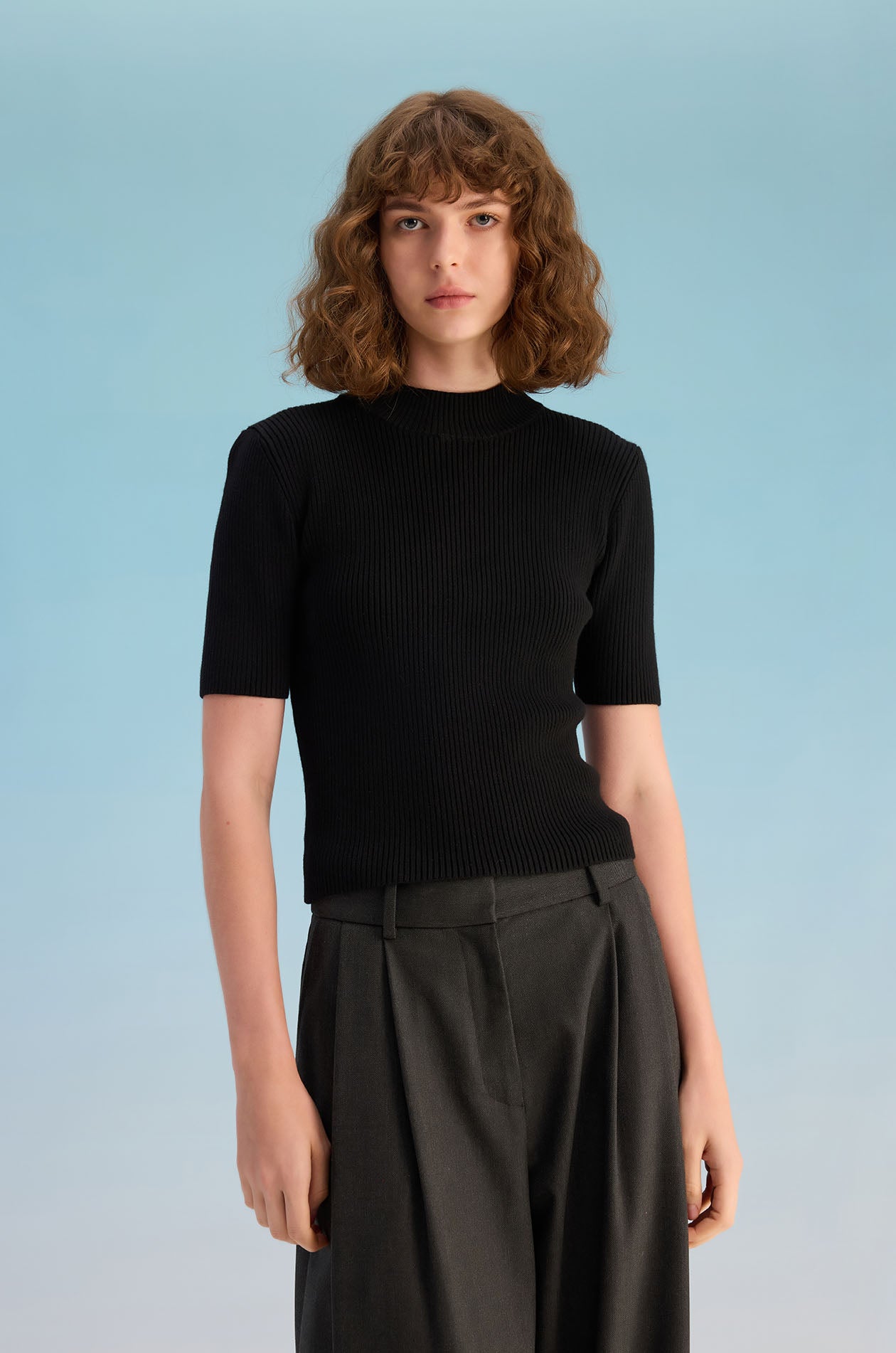 Short-sleeved top in chunky ribbed knit. Fitted silhouette with mock neck. Available in black.