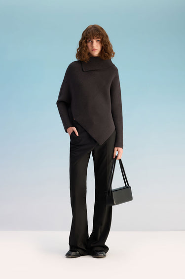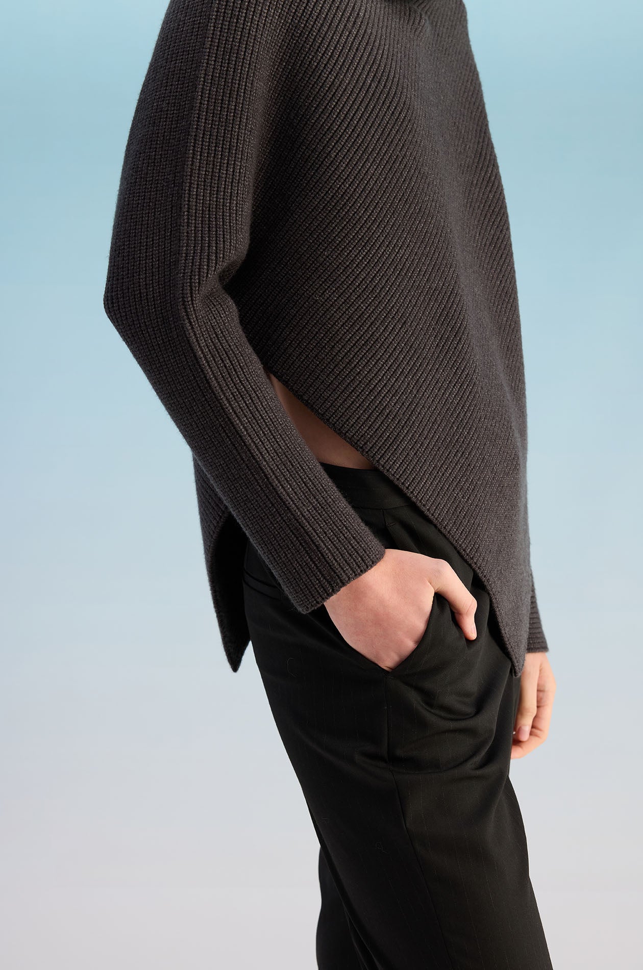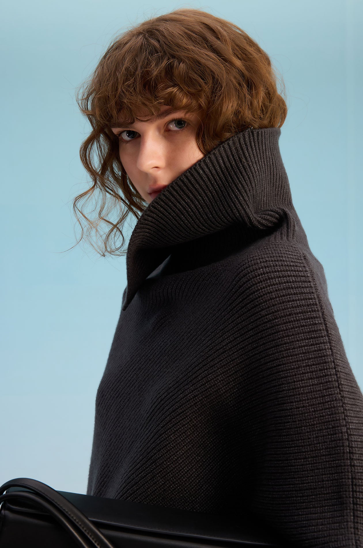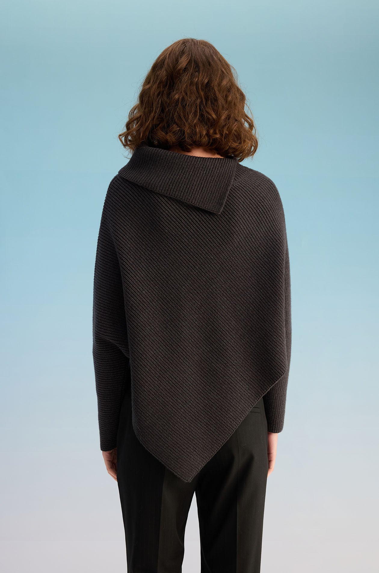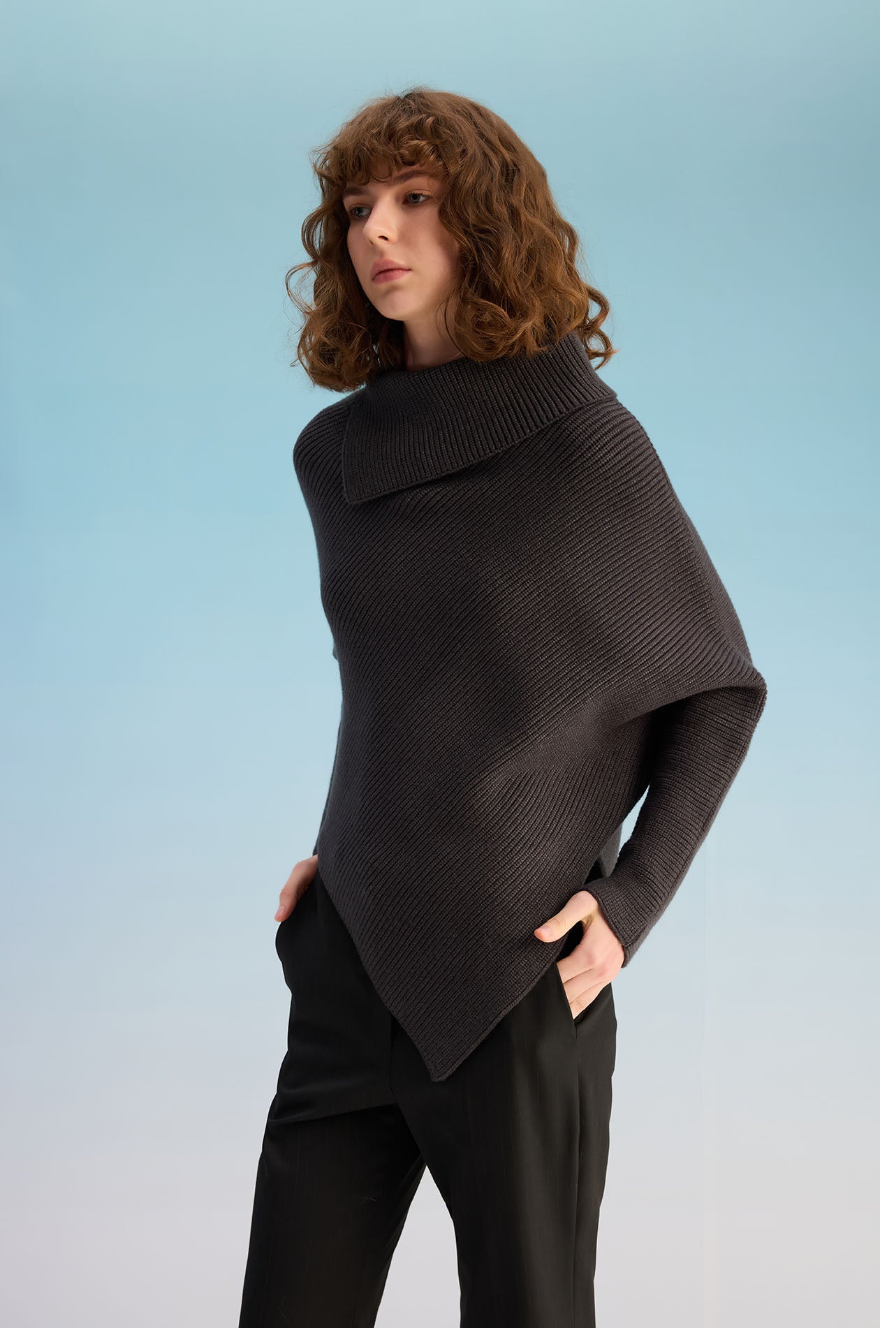 Pullover sweater in chunky ribbed knit. Asymmetric design with turtle neck. Available in dark grey.