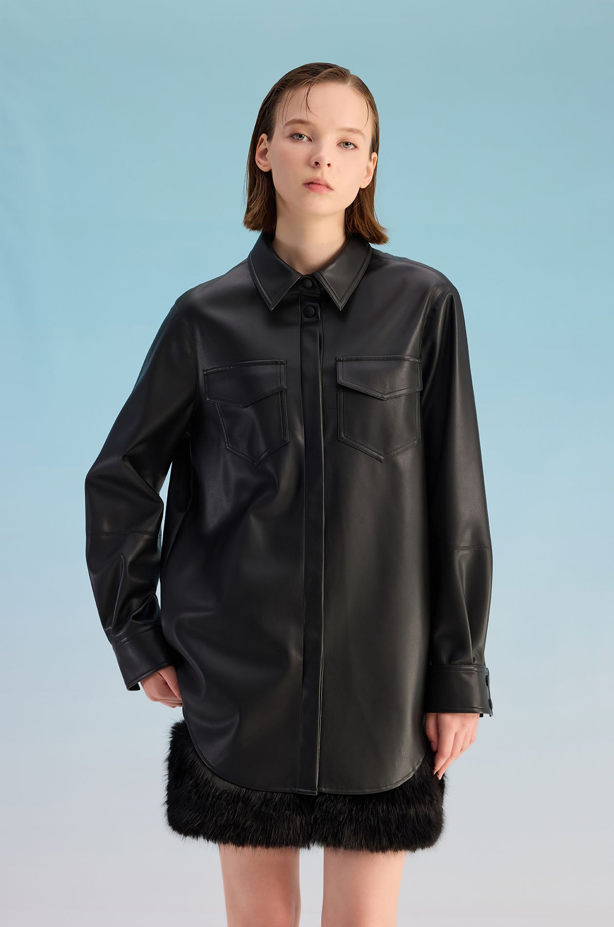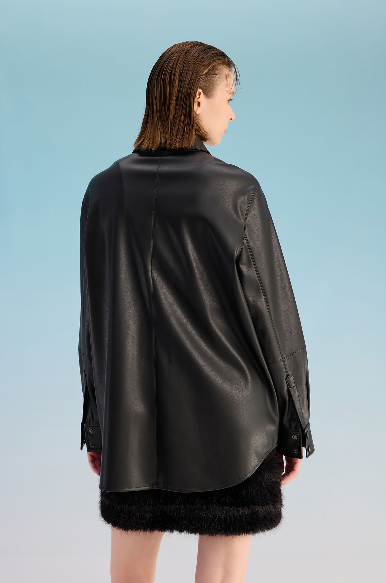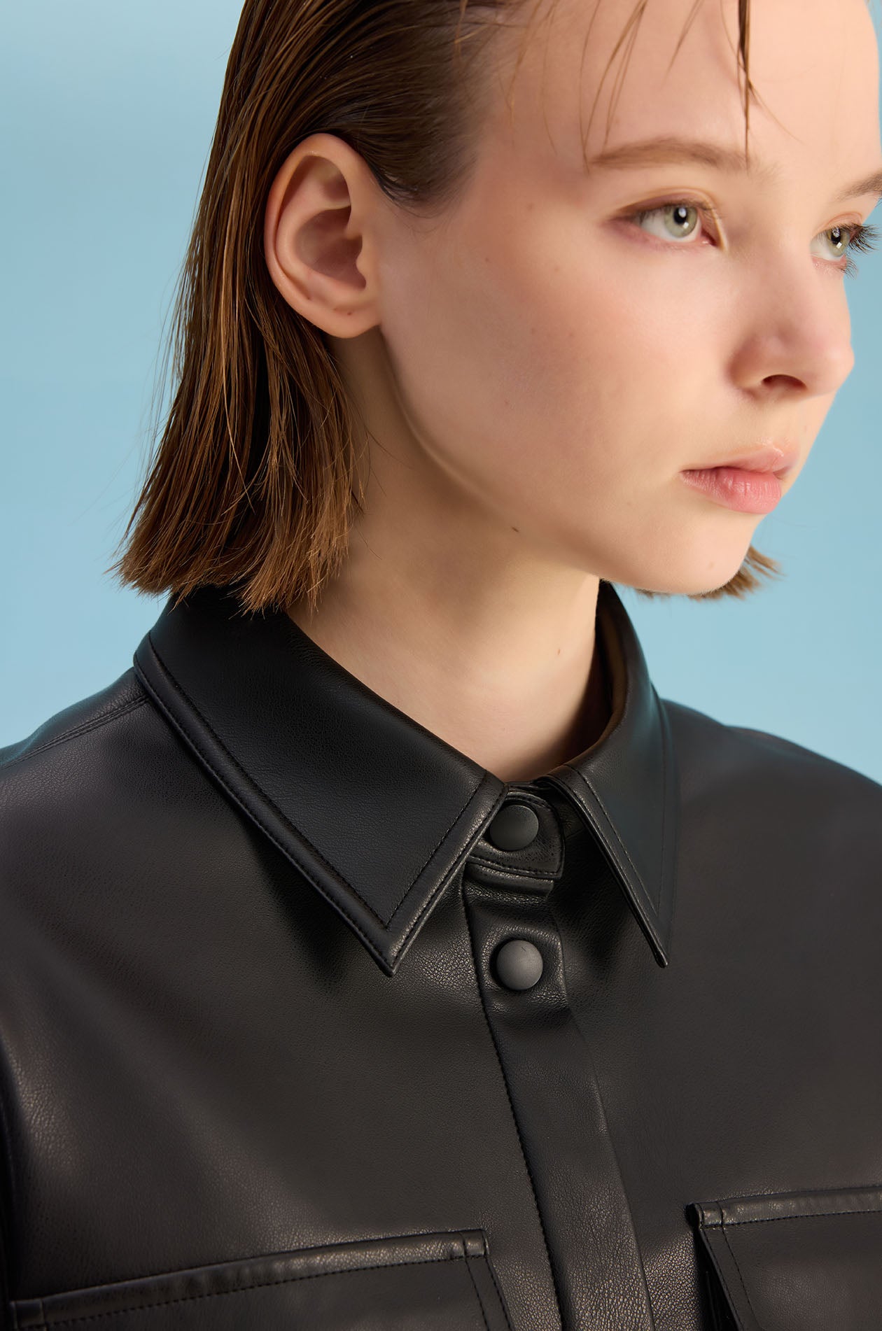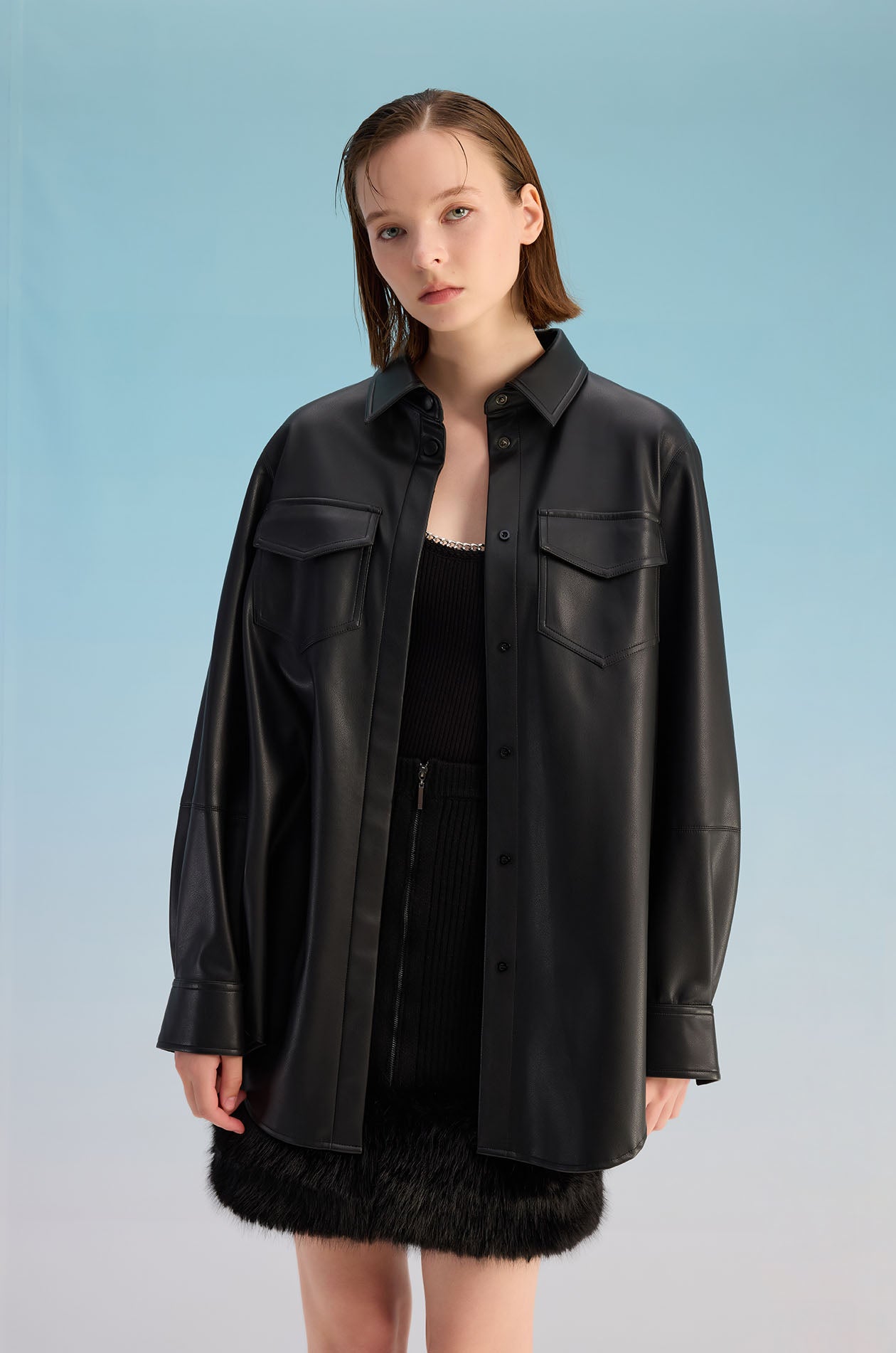 Long-sleeved overshirt in faux leather. Relax fit with classic collar and chest pockets. Front button closure. Available in black.