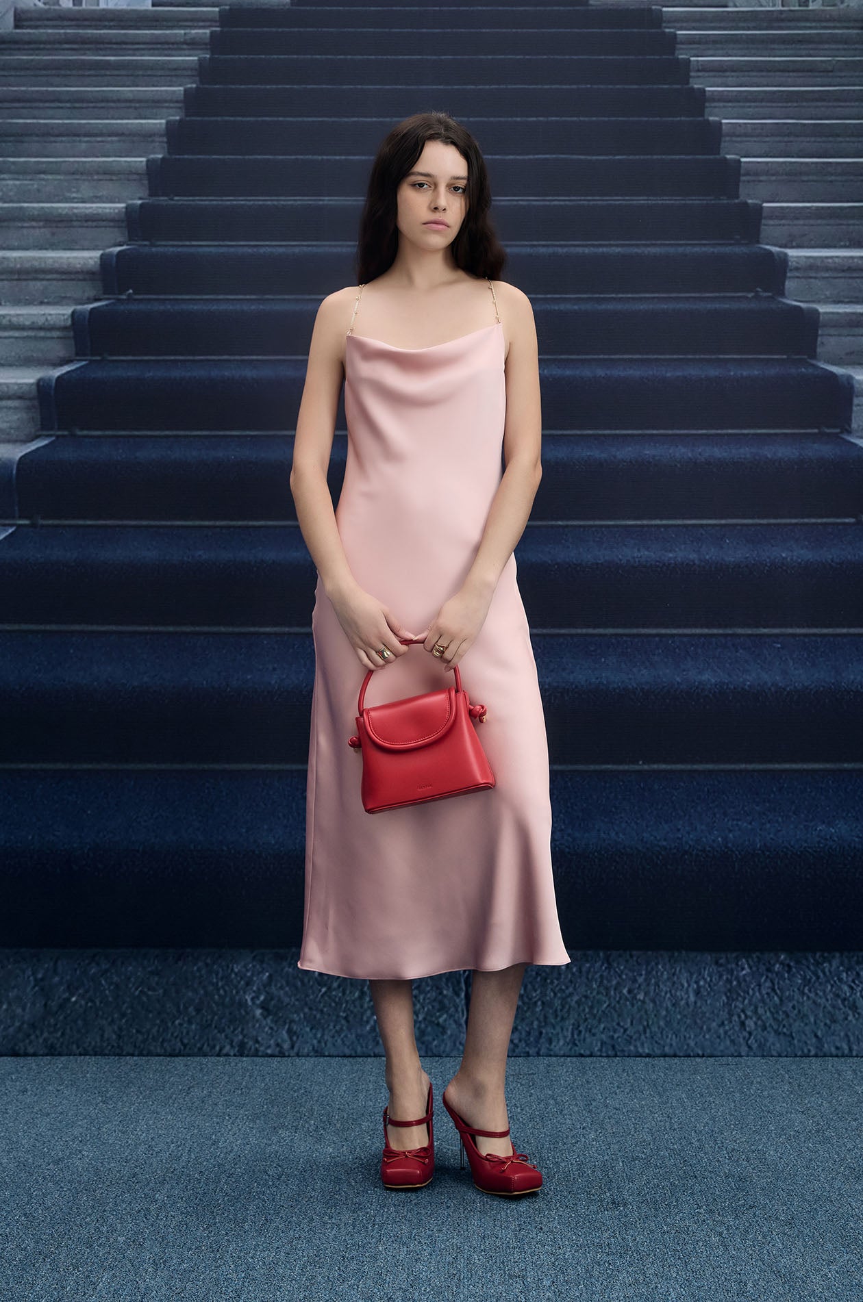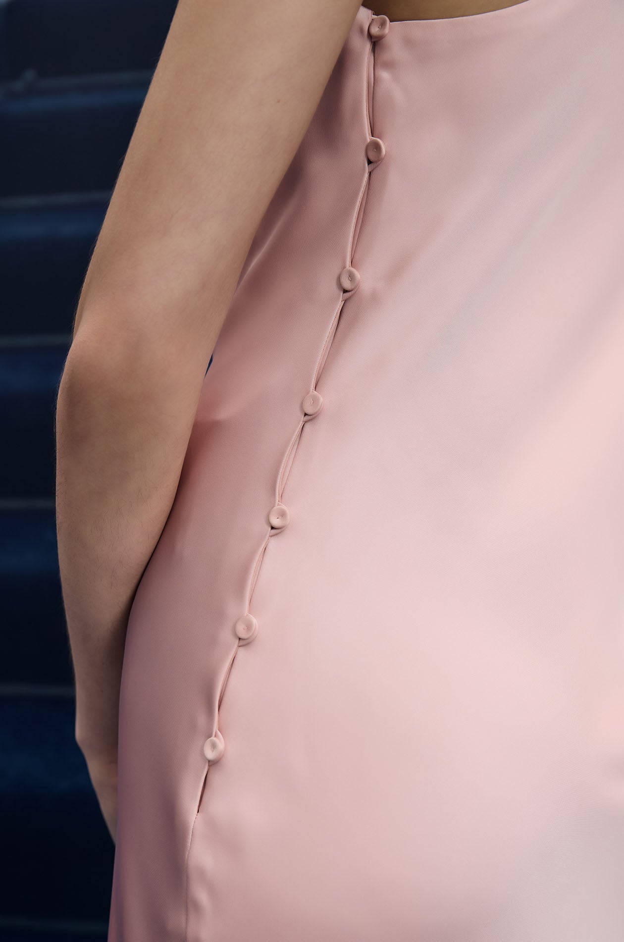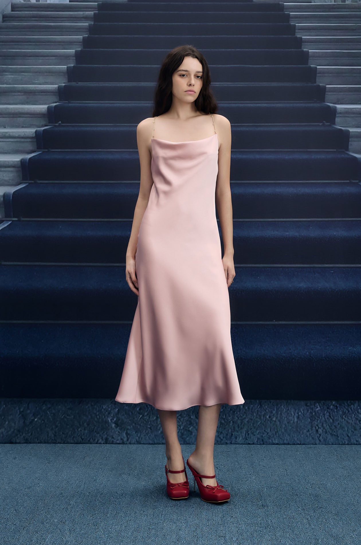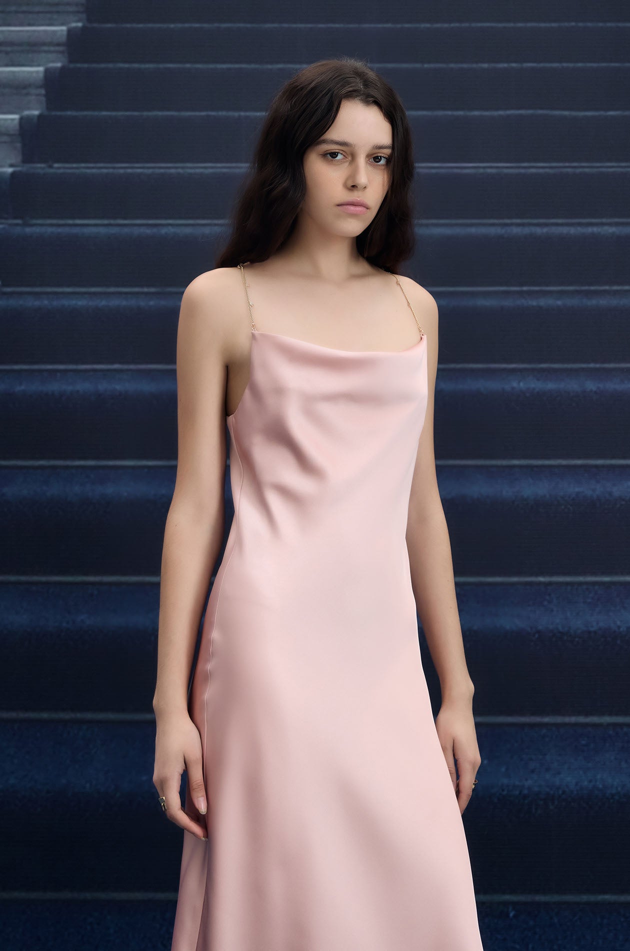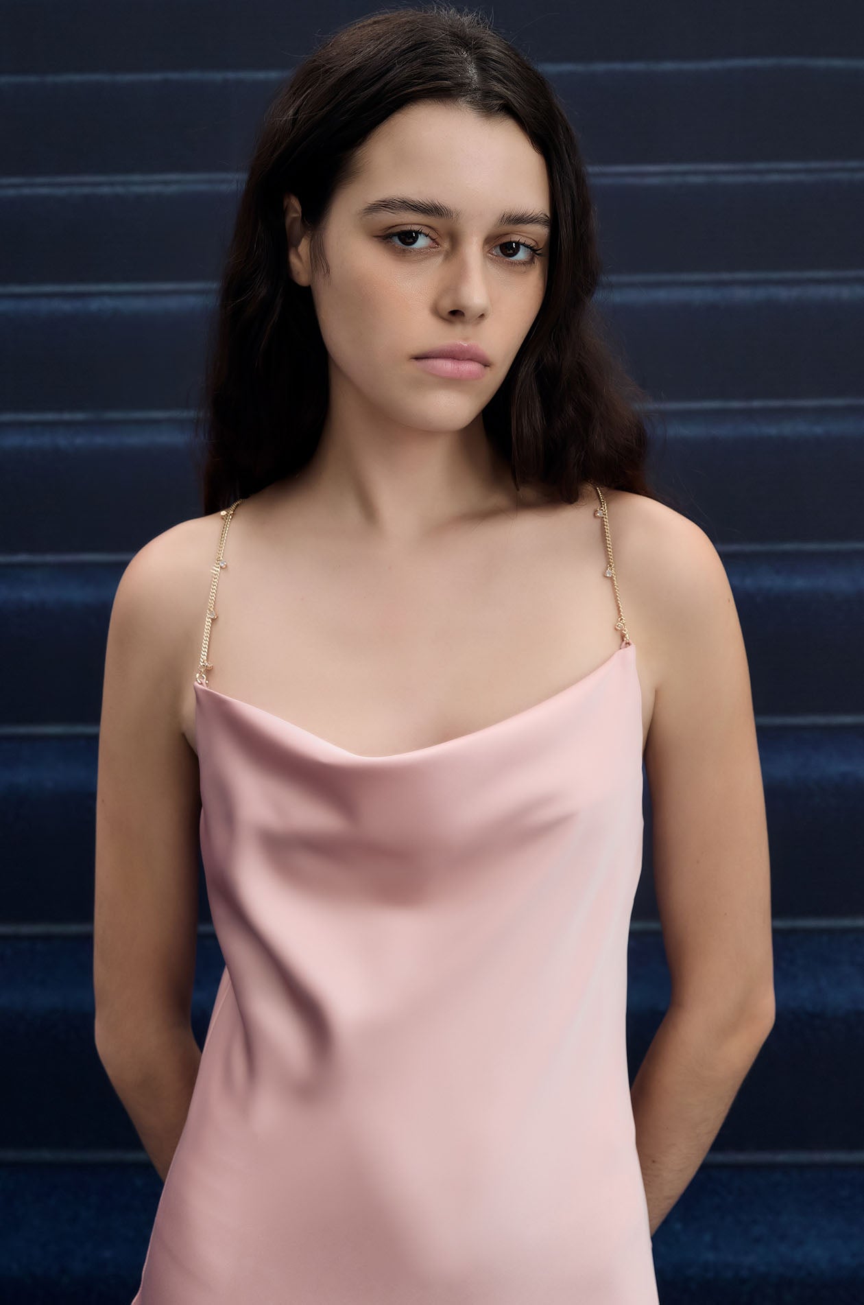 Strappy slip midi dress in satin. Cowl neckline and removable chain straps with rhinestones embellishment. Side button closure. Available in peach pink.