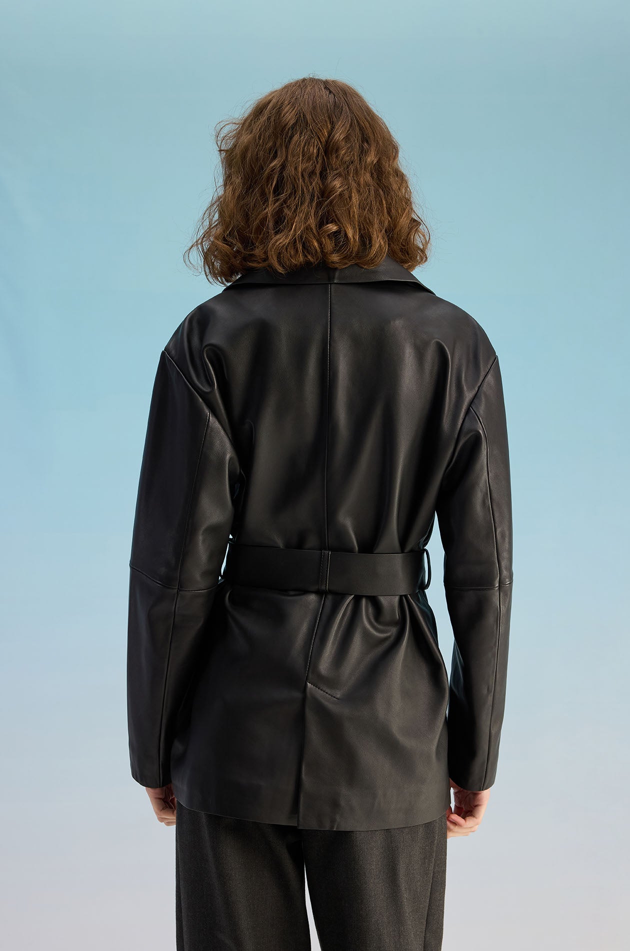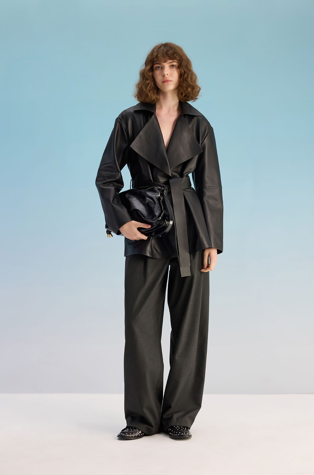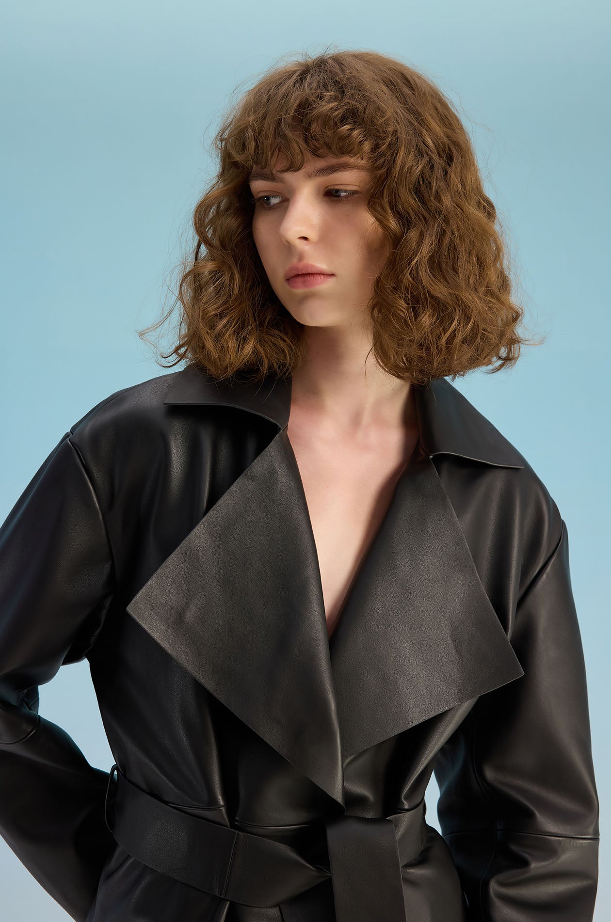 Overcoat in lamb leather. Oversized notch lapel and matching chunky tied belt. Available in black.