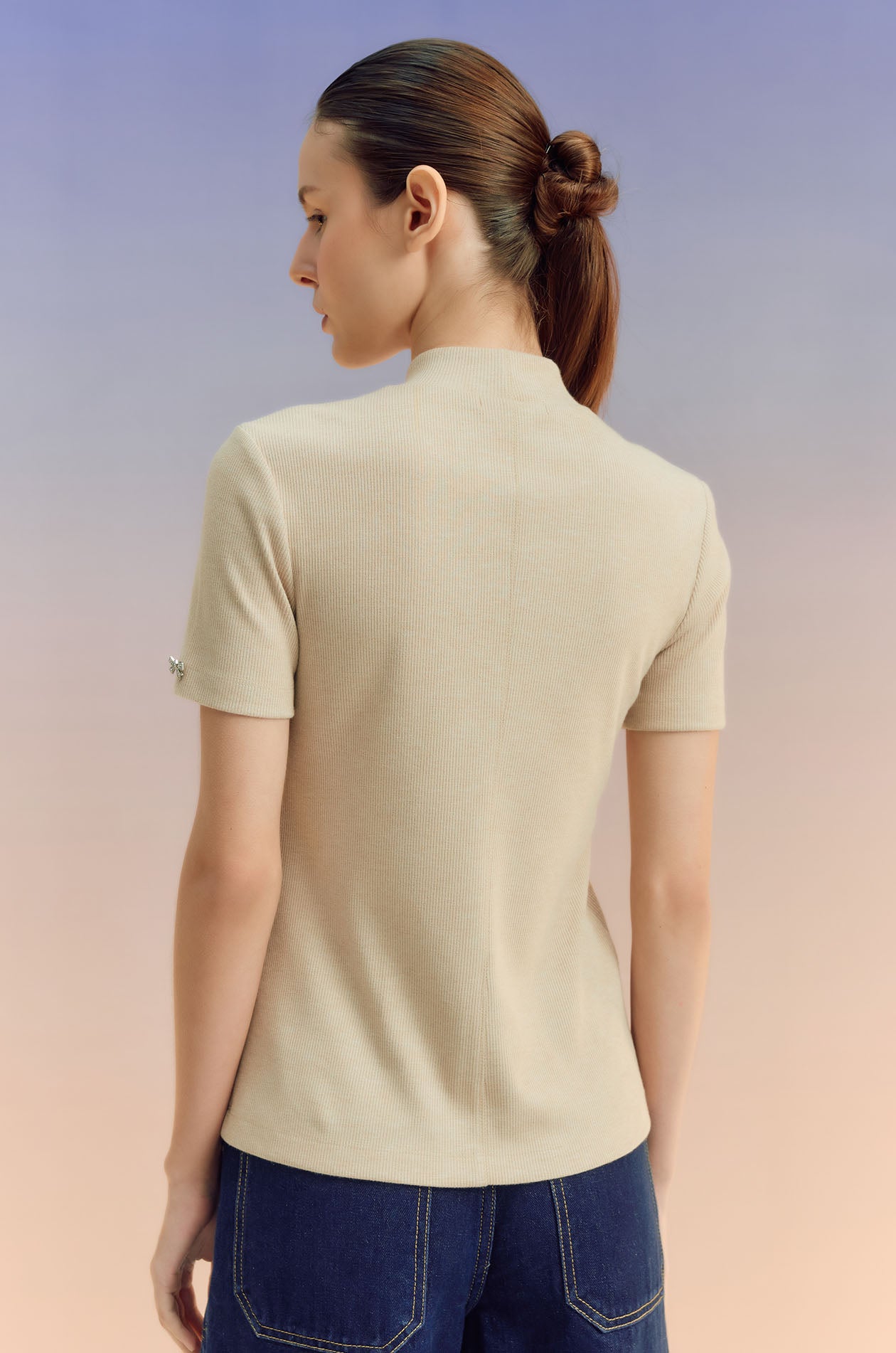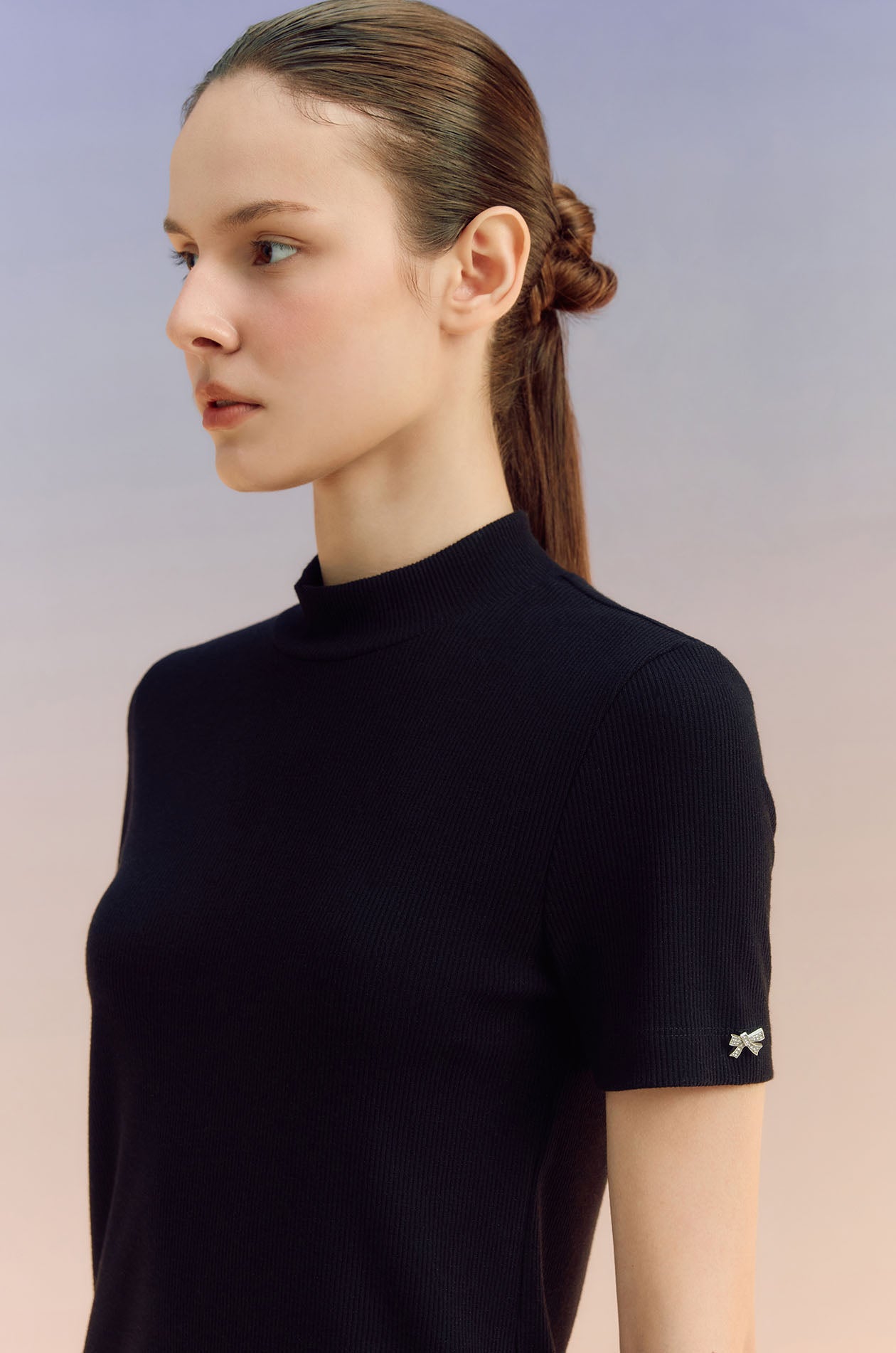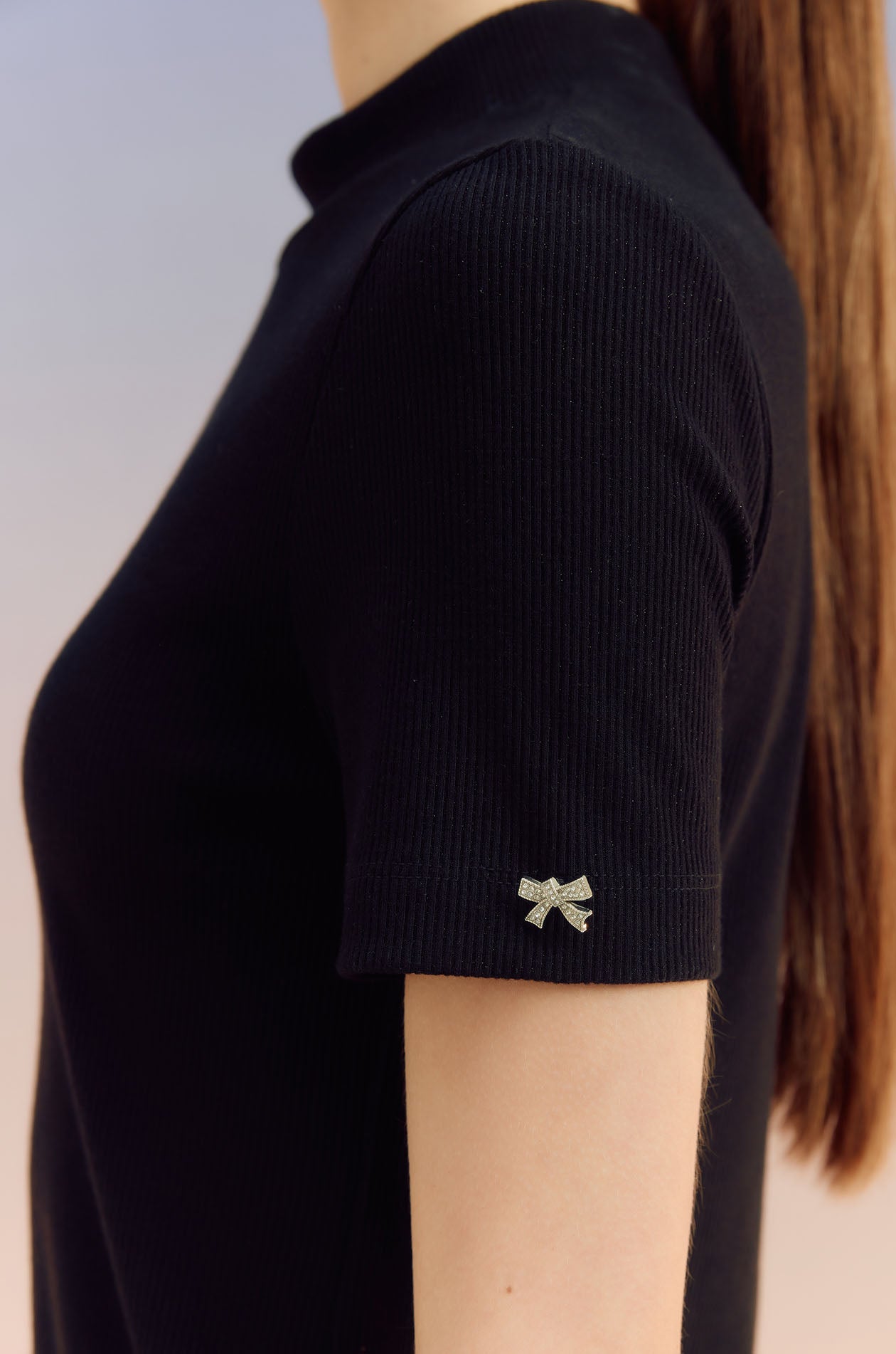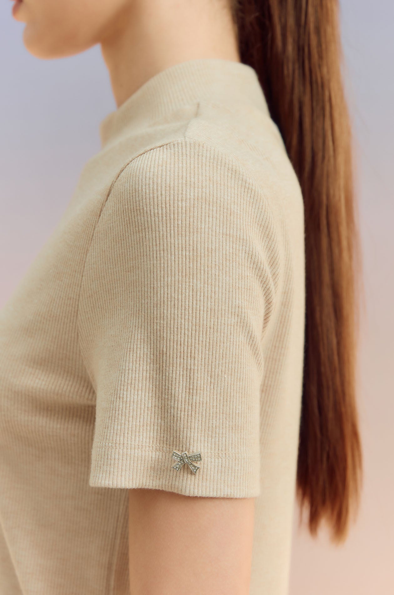 Short-sleeved top in ribbed jersey with glitter effect. Slim fit with mock neck and rhinestone-bow embellishment at the sleeve. Available in beige and black.