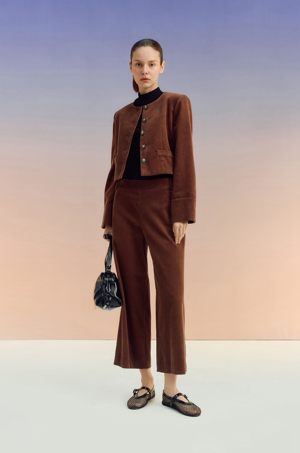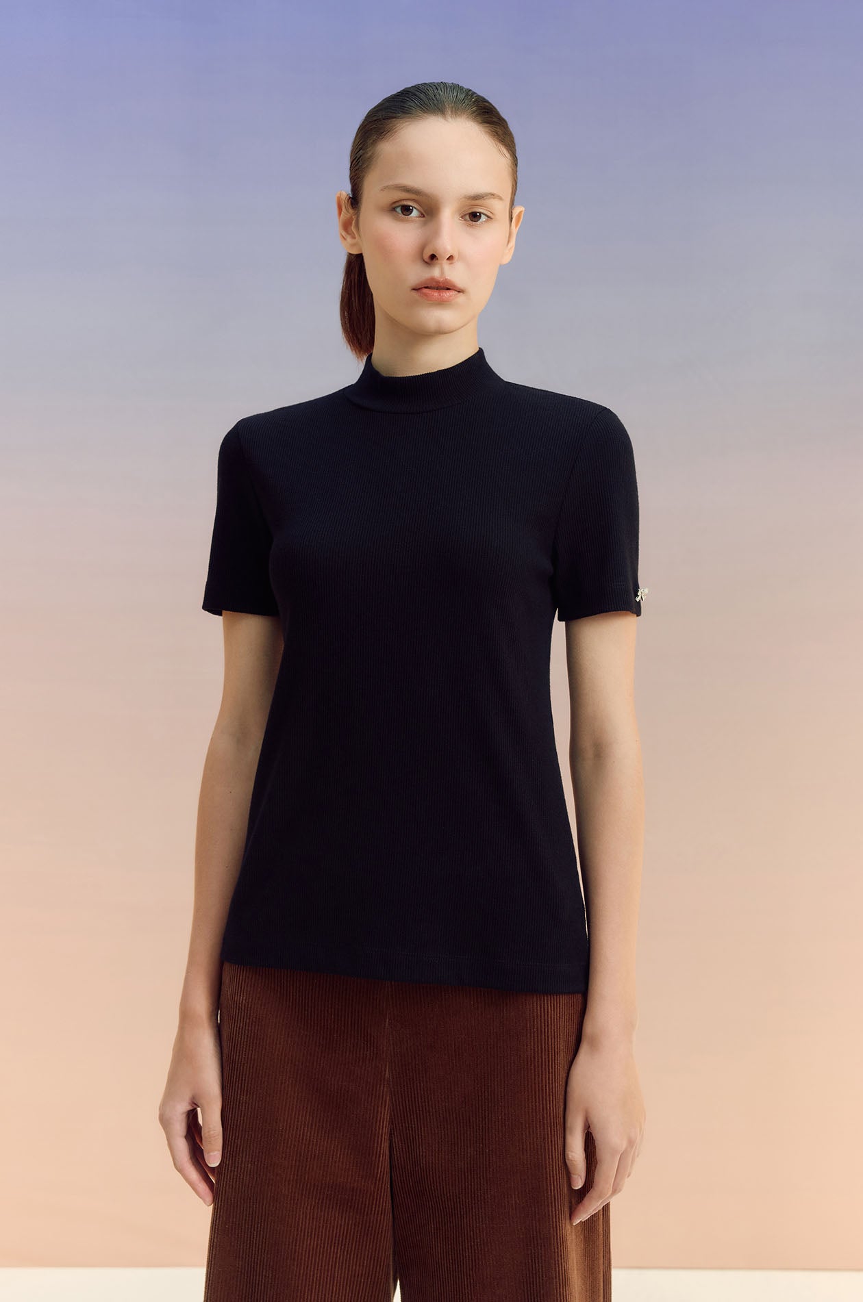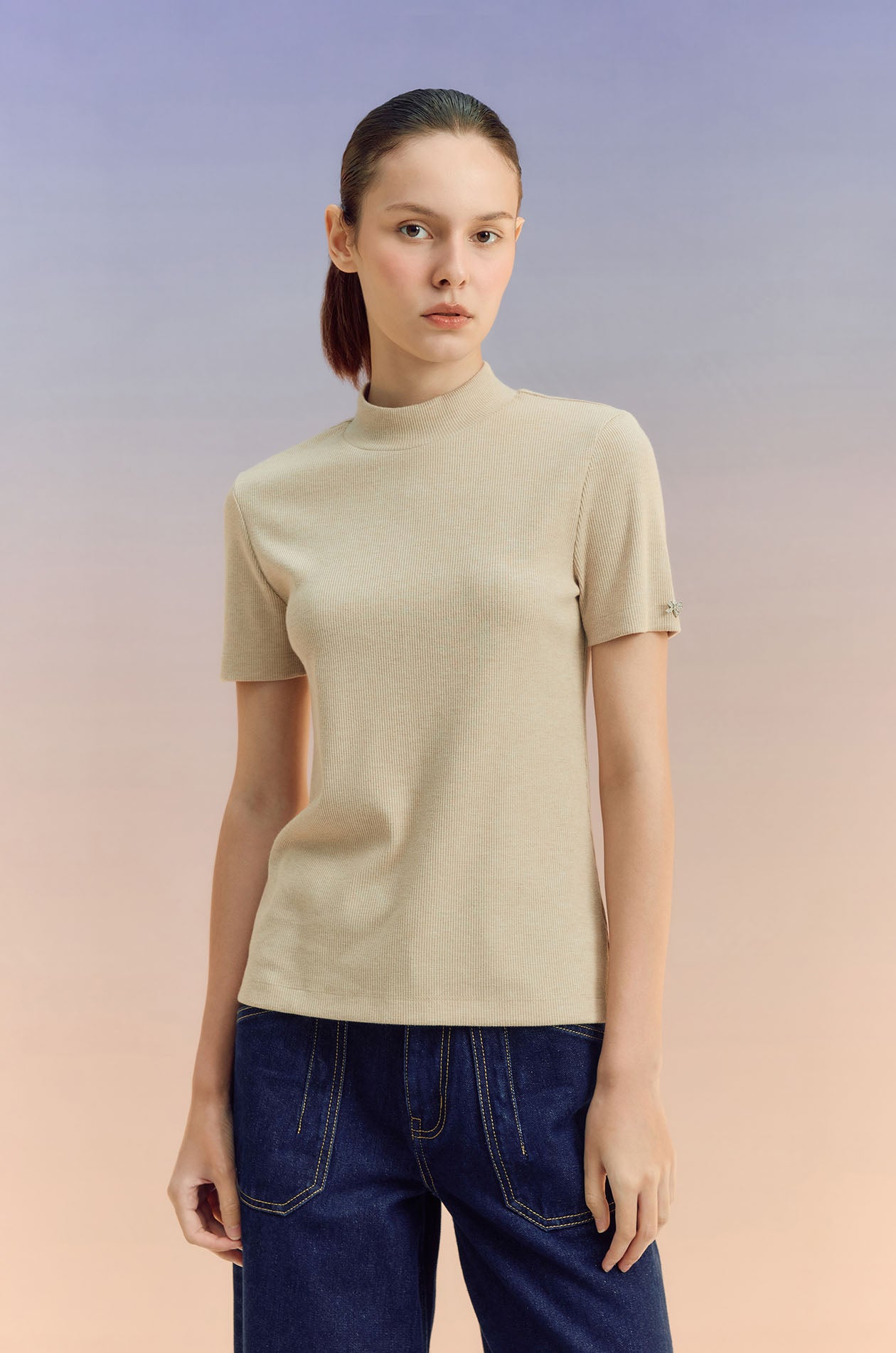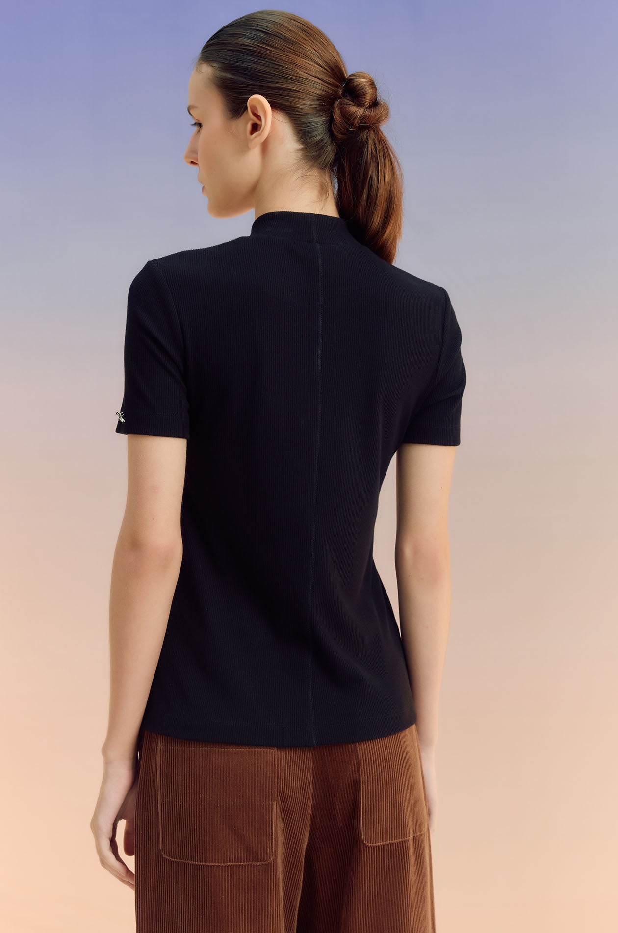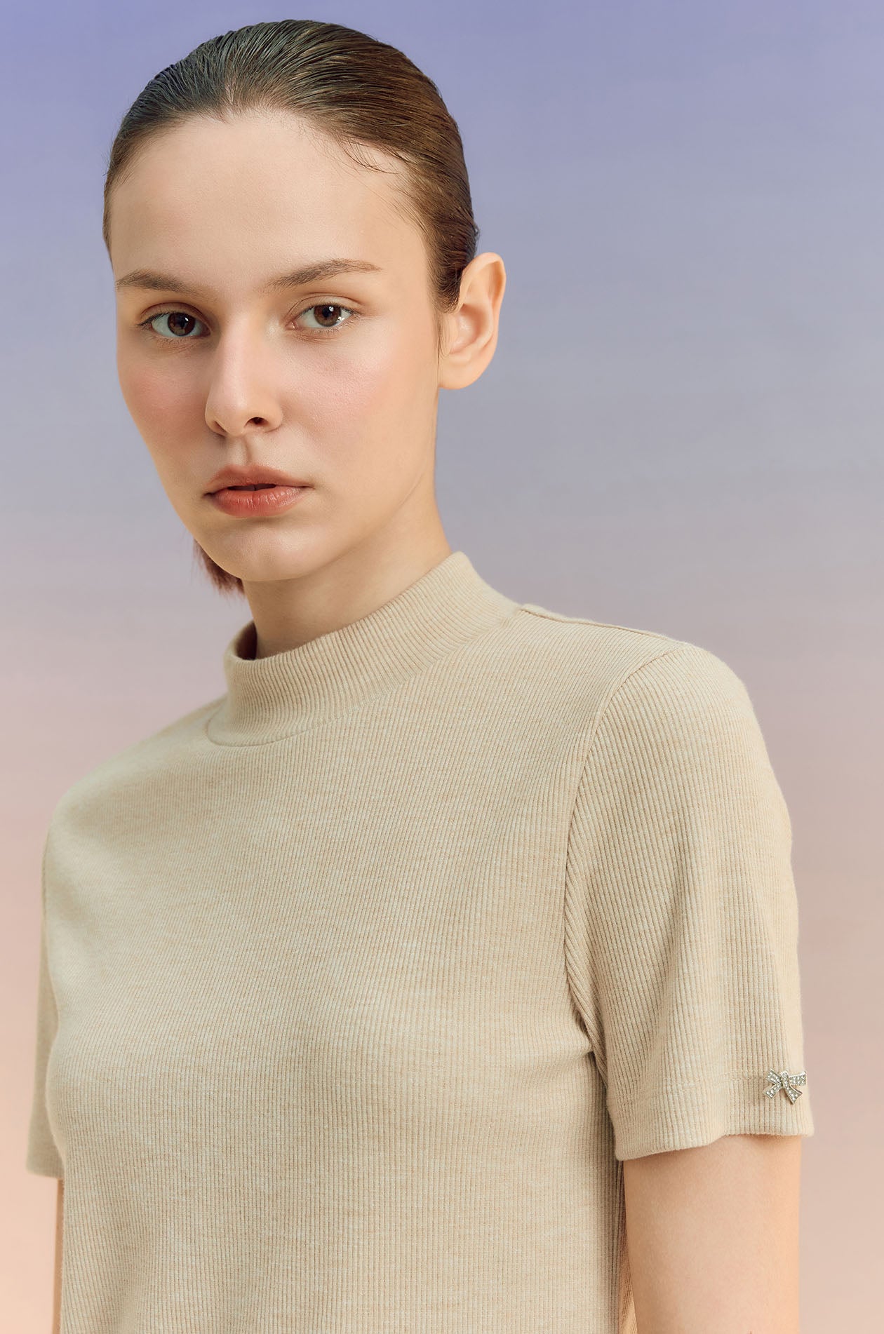 Short-sleeved top in ribbed jersey with glitter effect. Slim fit with mock neck and rhinestone-bow embellishment at the sleeve. Available in beige and black.