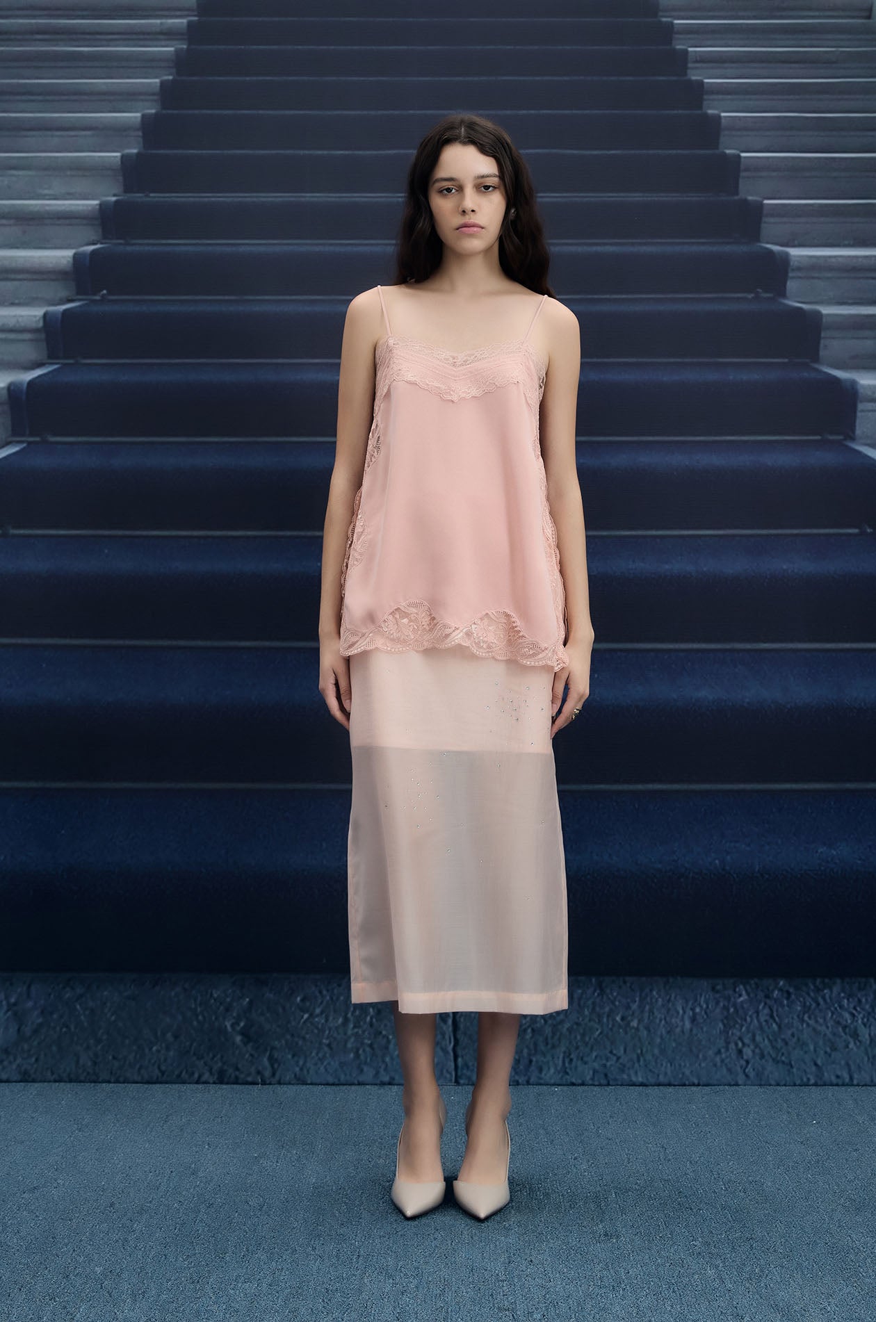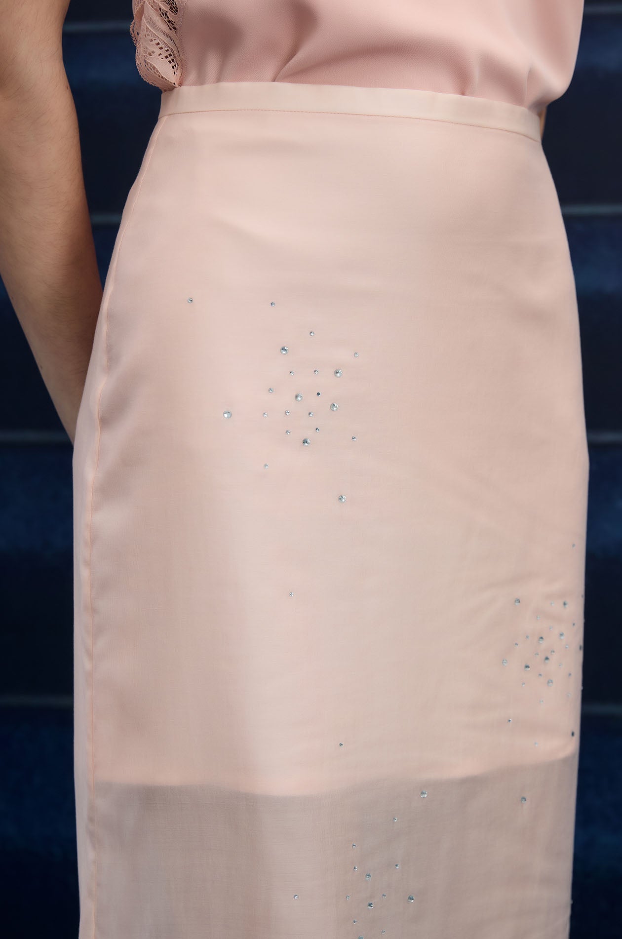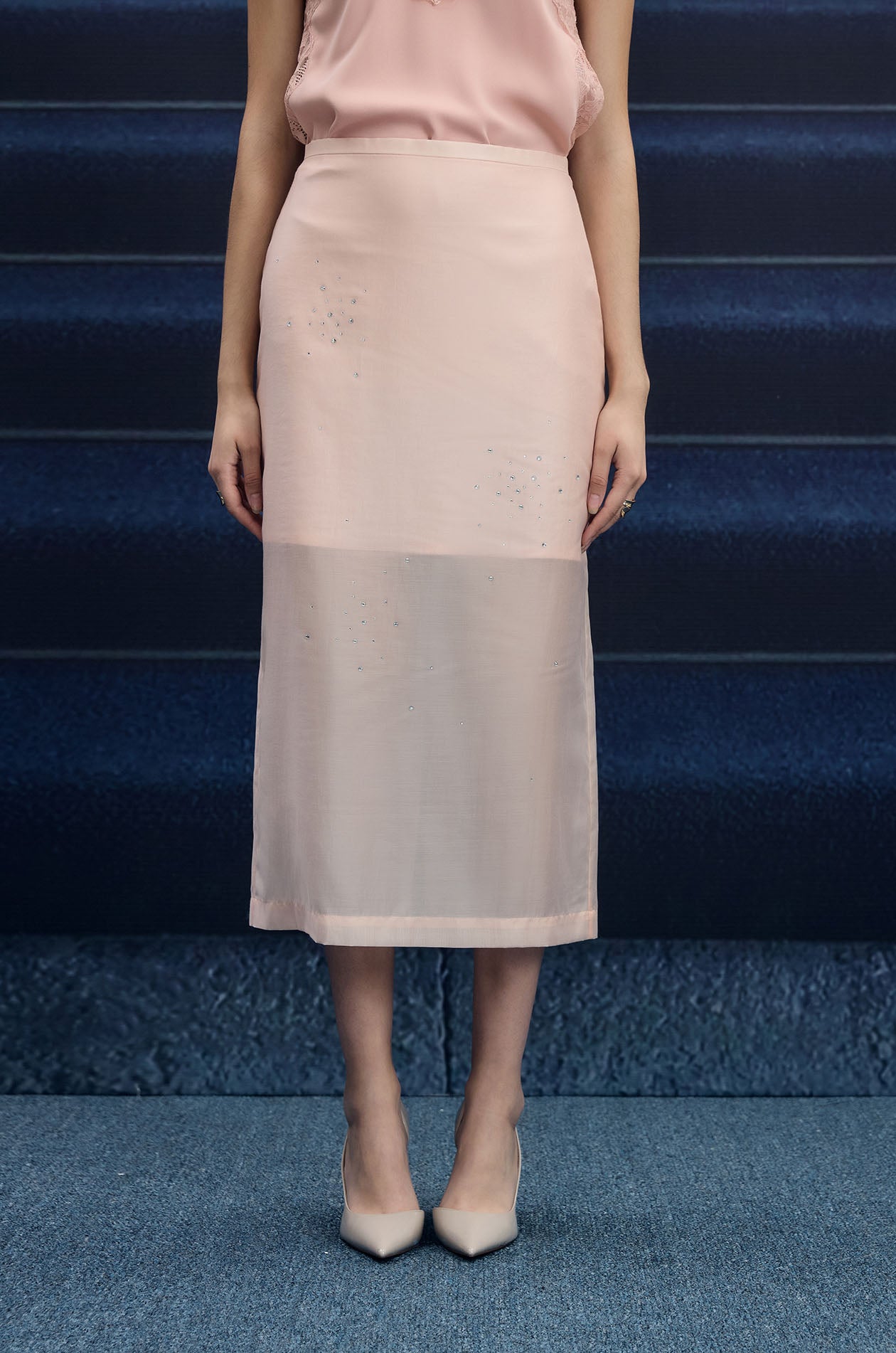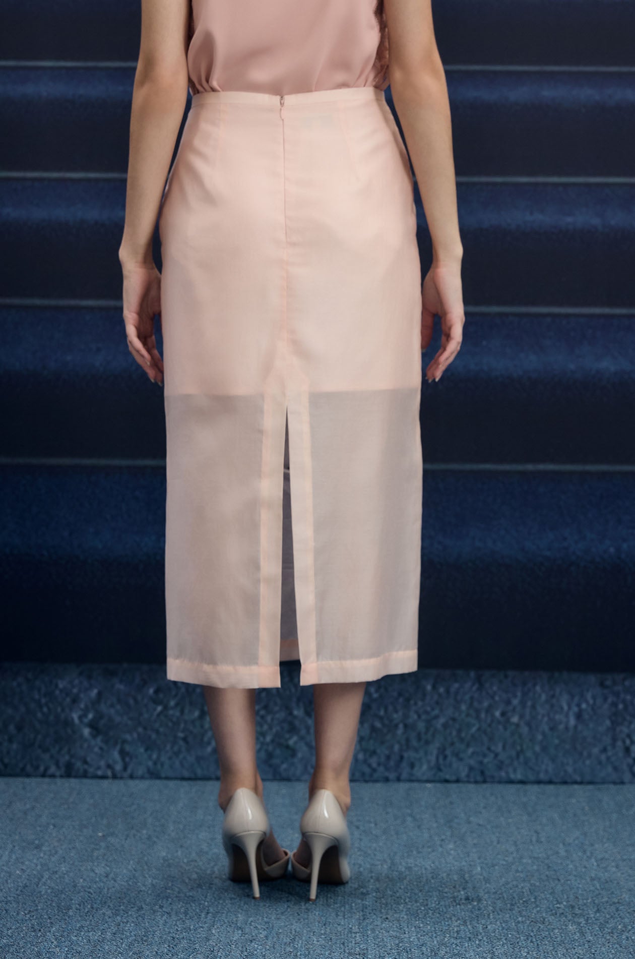 Mid-rise midi skirt in silk organza with sheer effect. Column silhouette with back slit and partial lining. Available in coral.