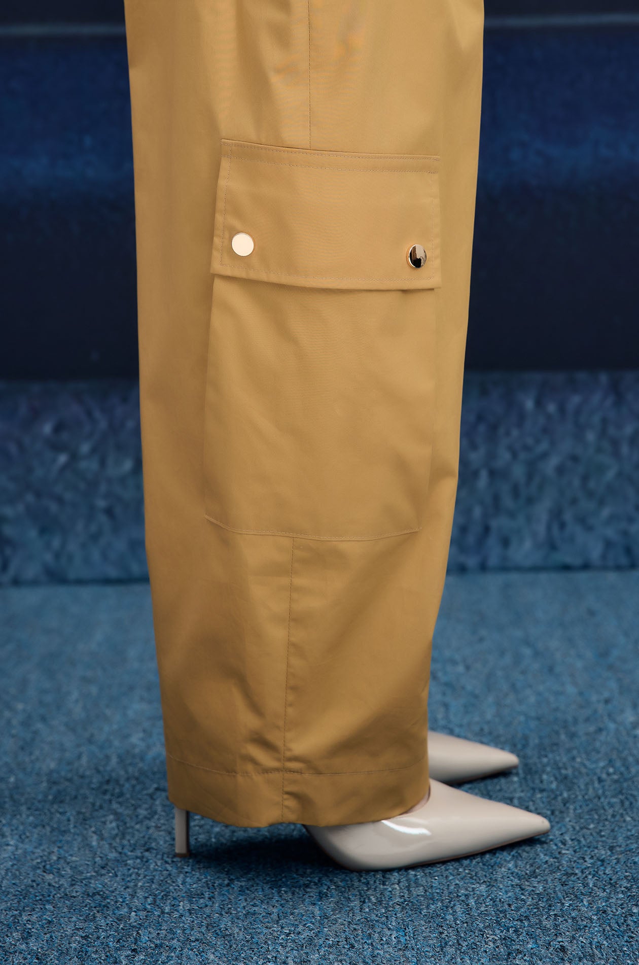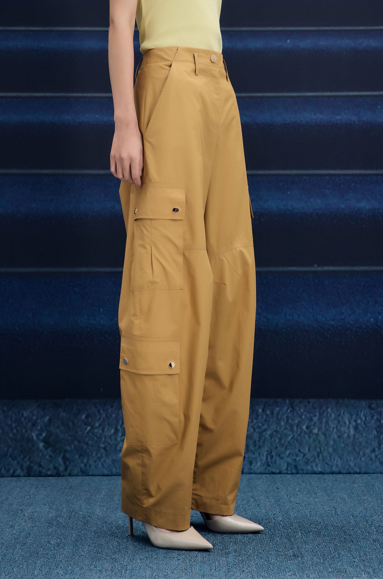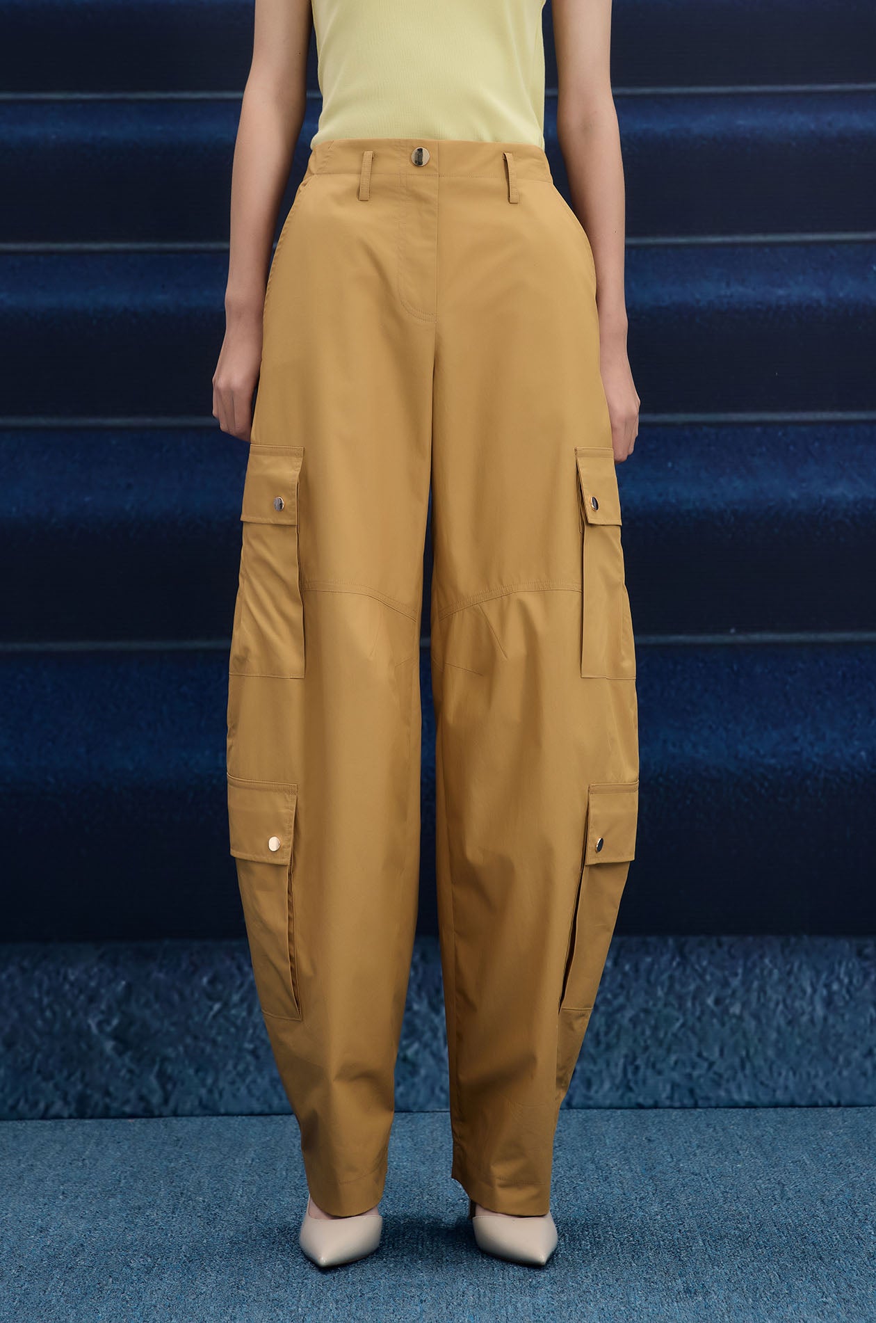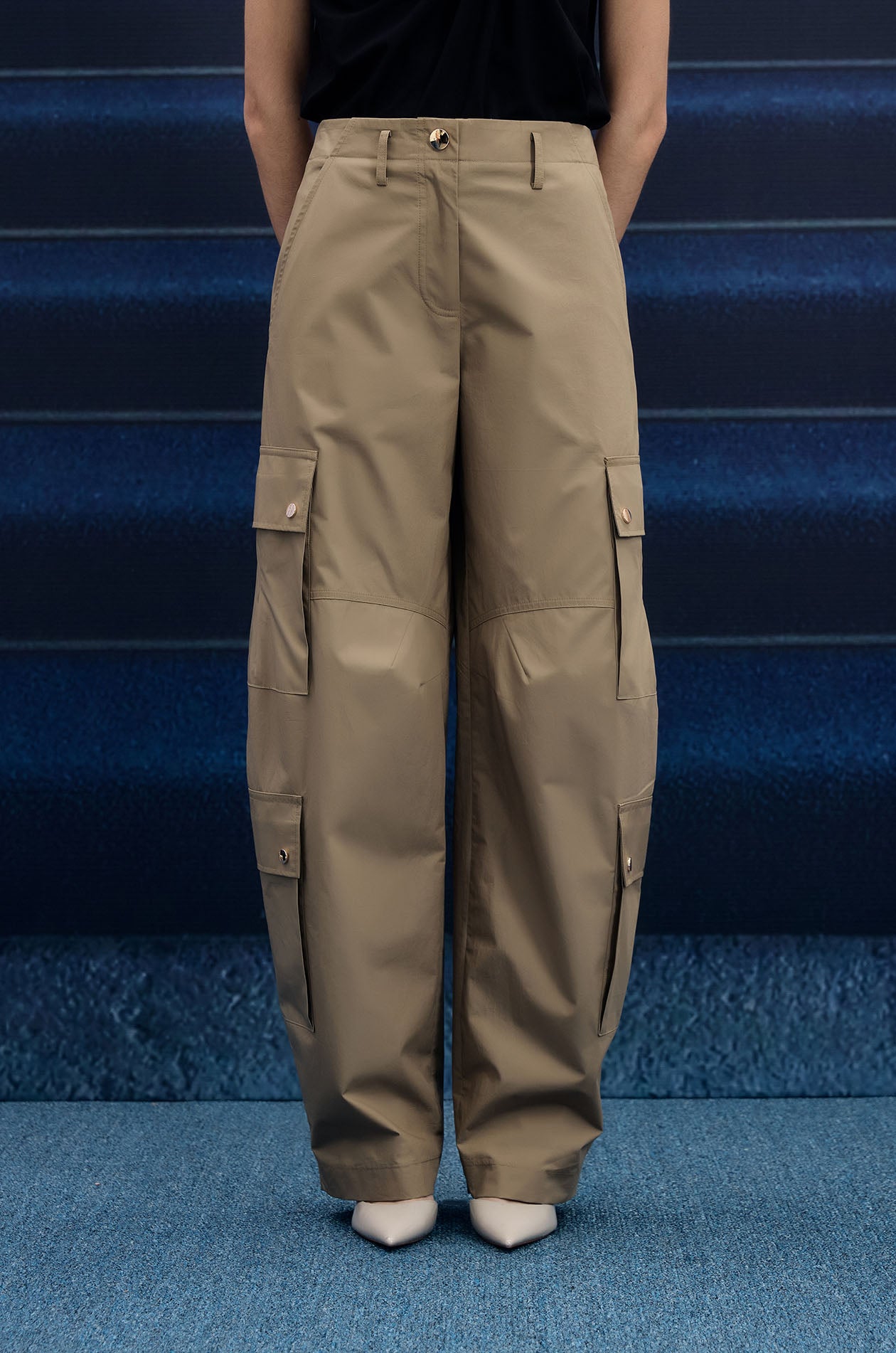 Mid-rise pants in poplin. Pegged legs with side pockets and cargo pockets. Front button and zip closure. Available in olive brown and camel.