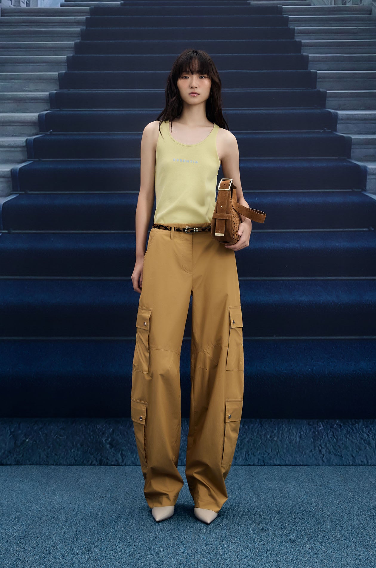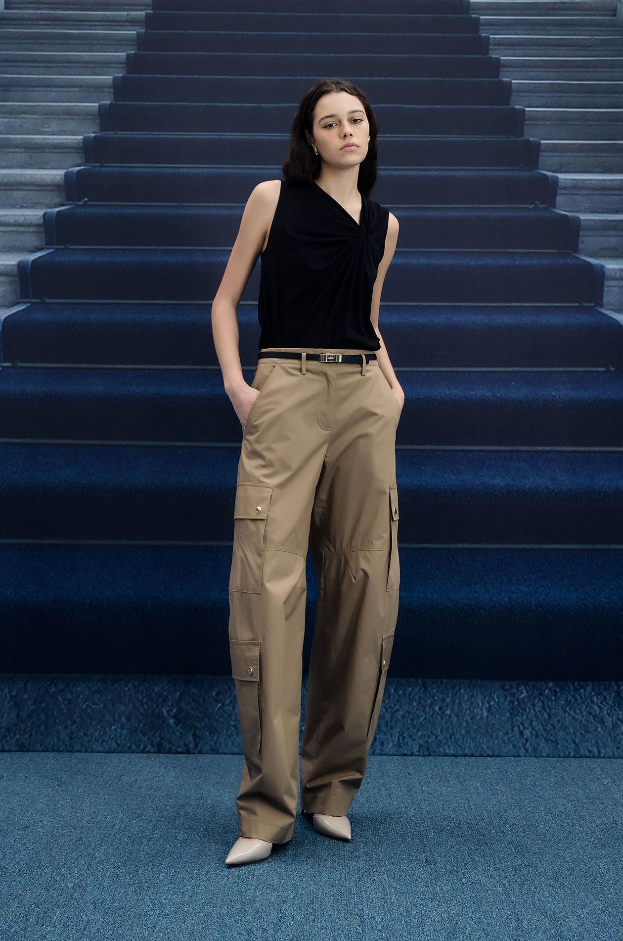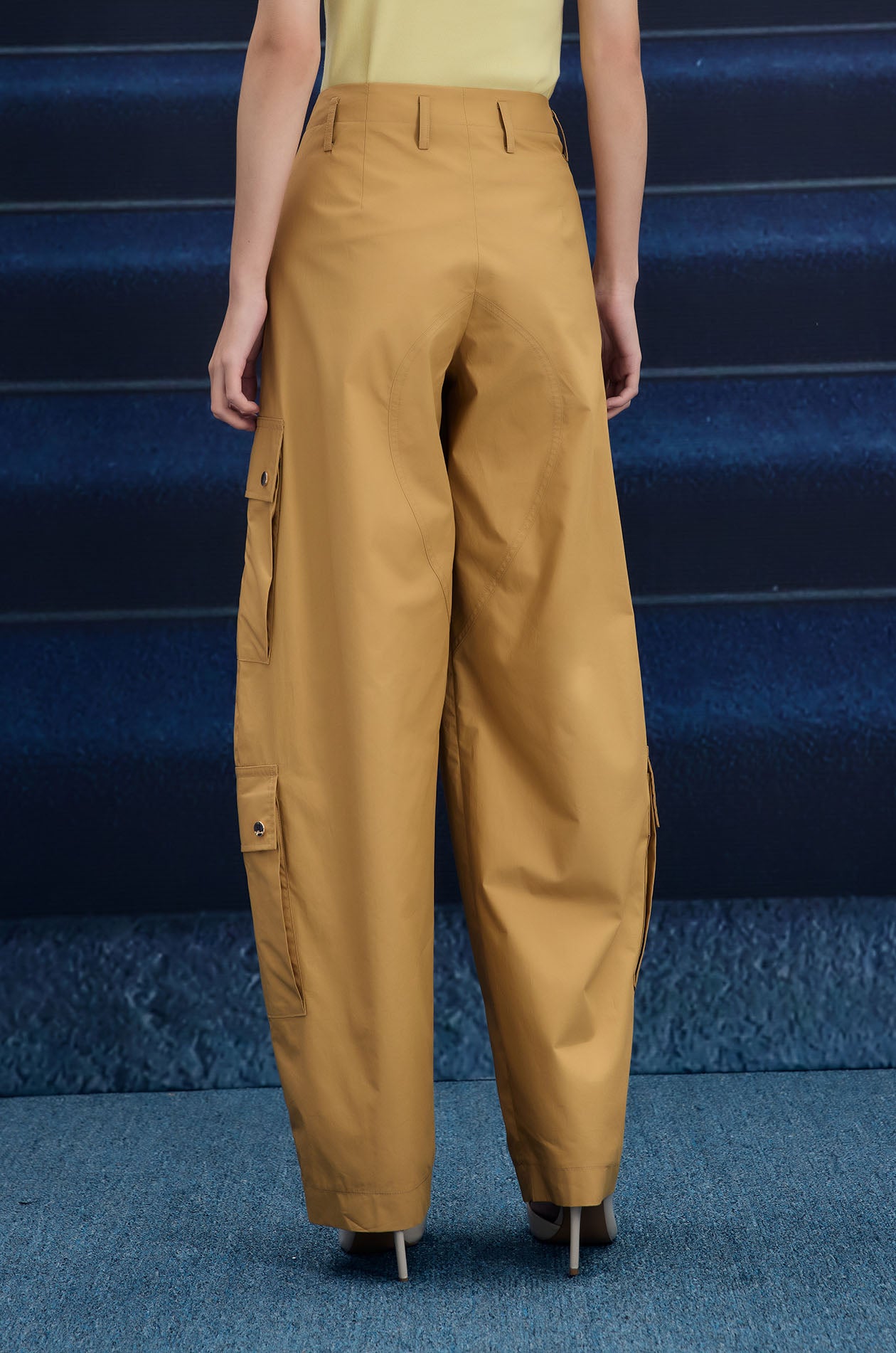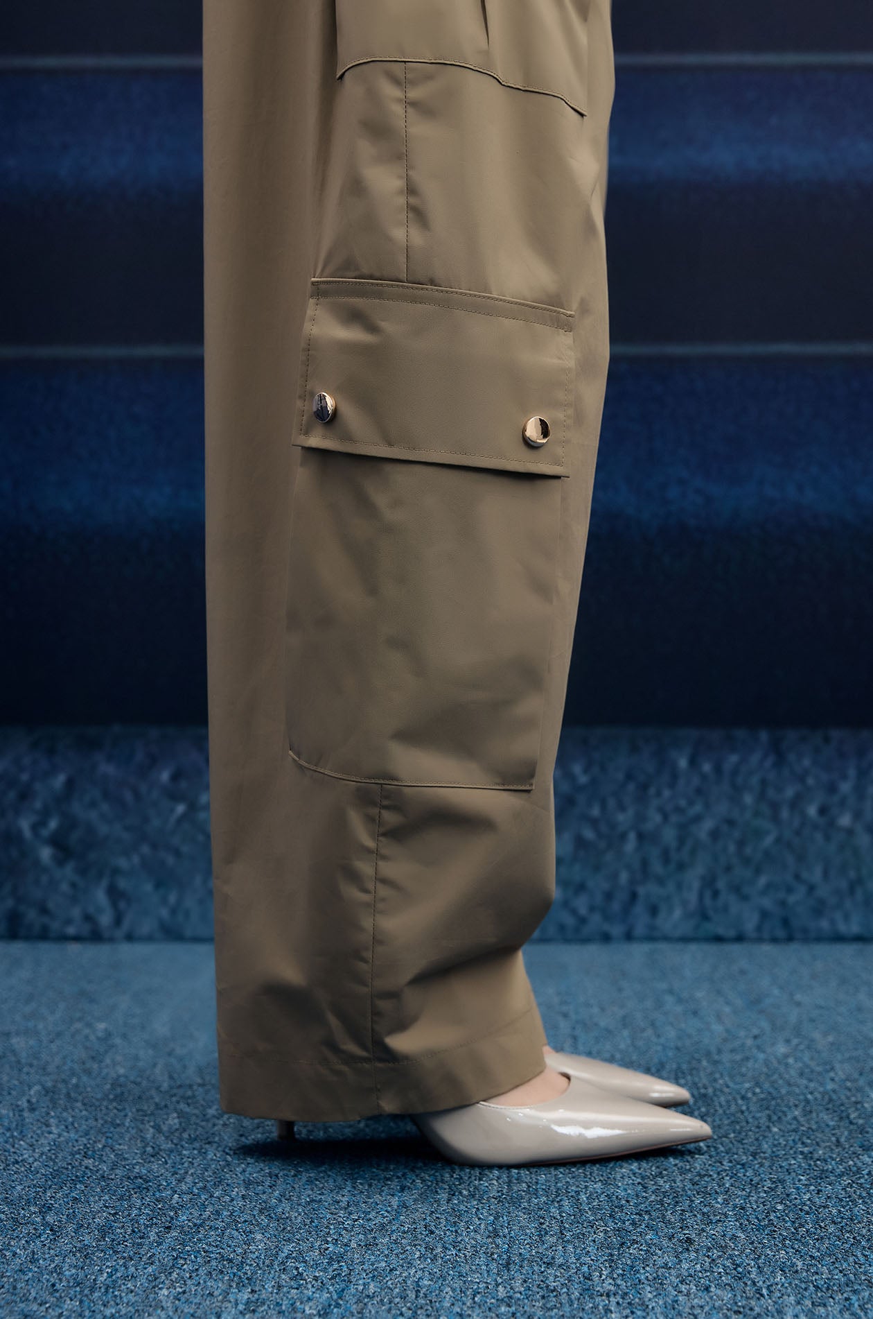 Mid-rise pants in poplin. Pegged legs with side pockets and cargo pockets. Front button and zip closure. Available in olive brown and camel.