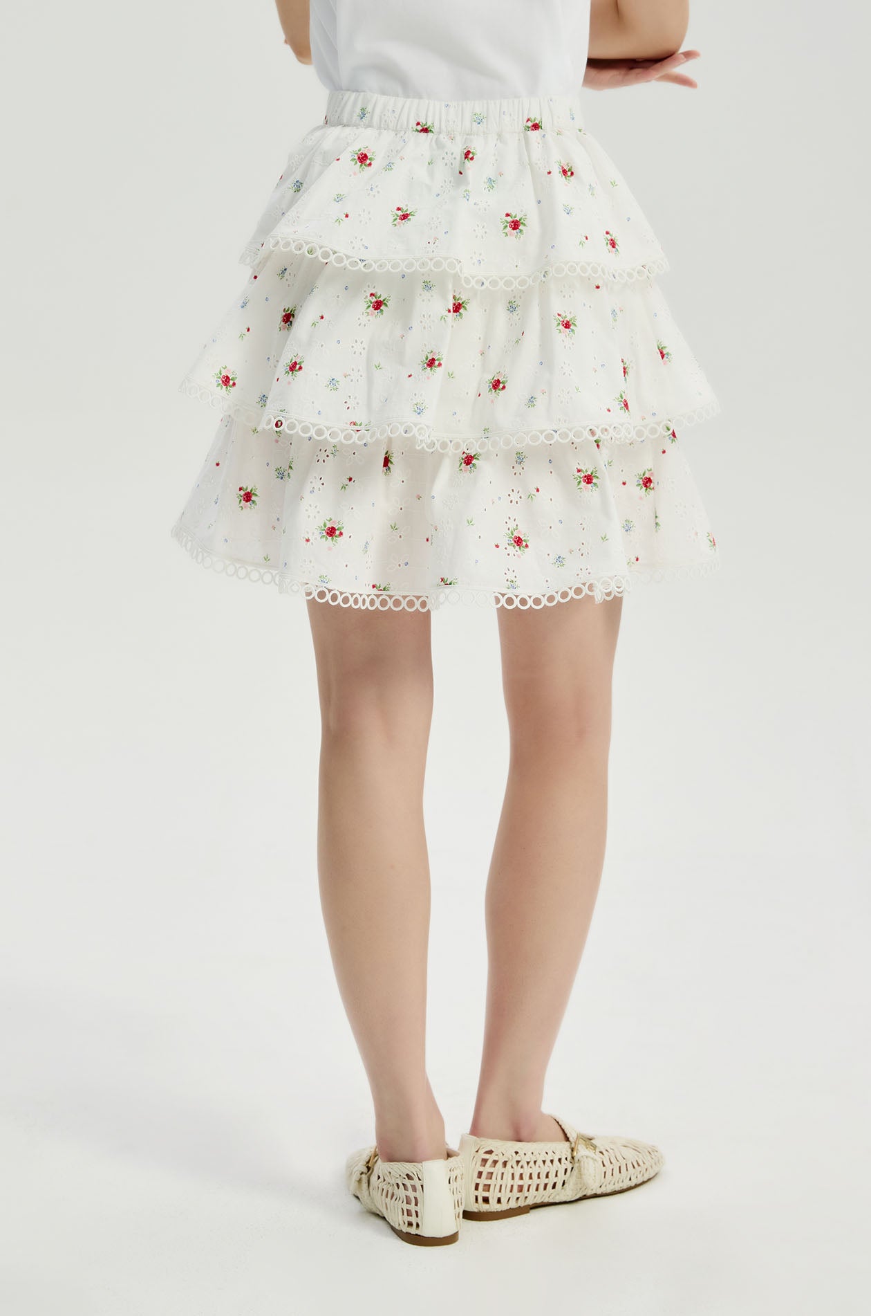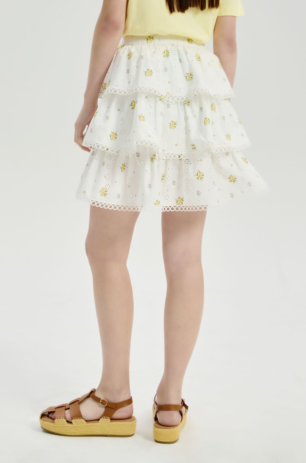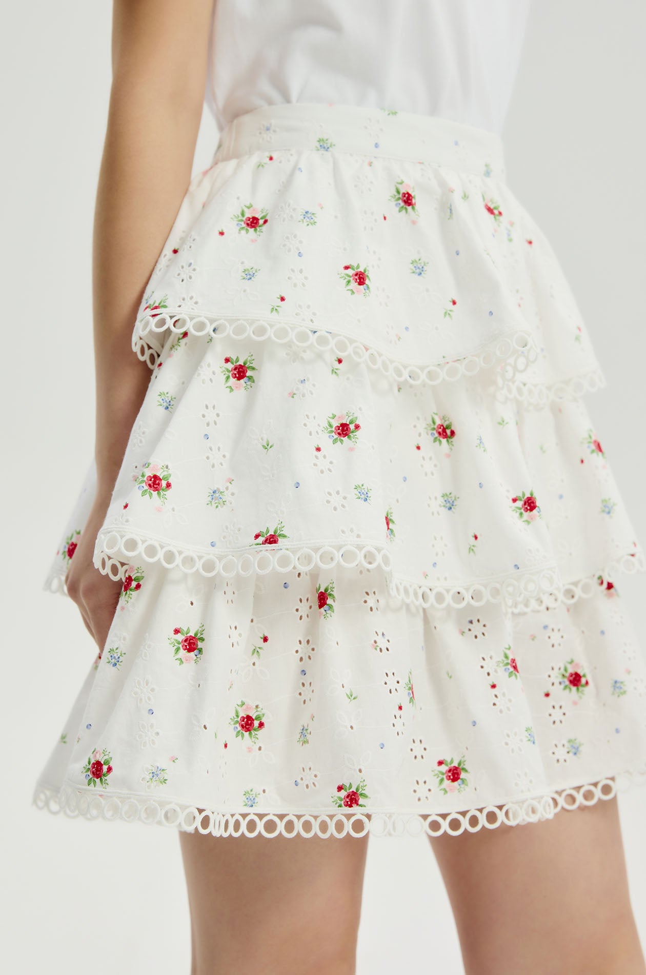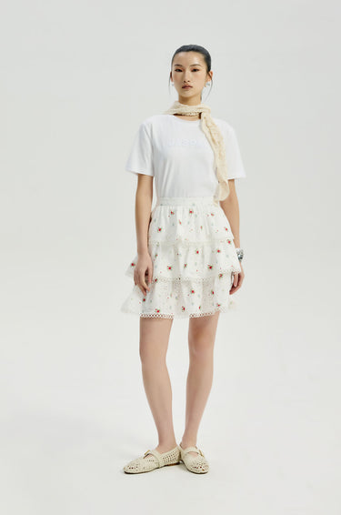 Mid-rise mini skirt in broderie anglaise with allover ditsy floral print. Layered design with elastic back waistband. Side zip closure. Available in white/red and white/yellow.