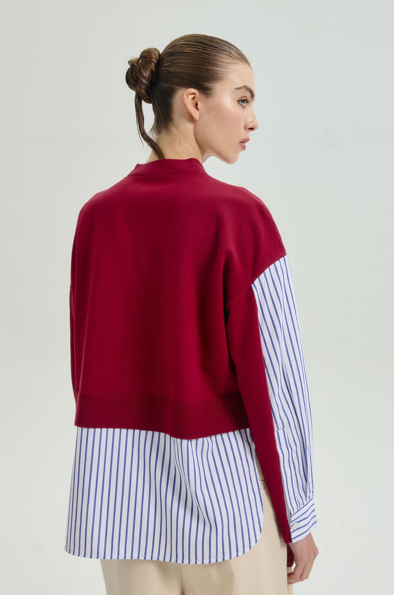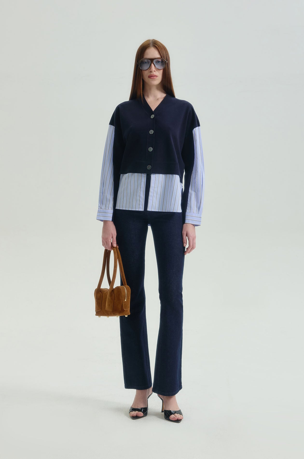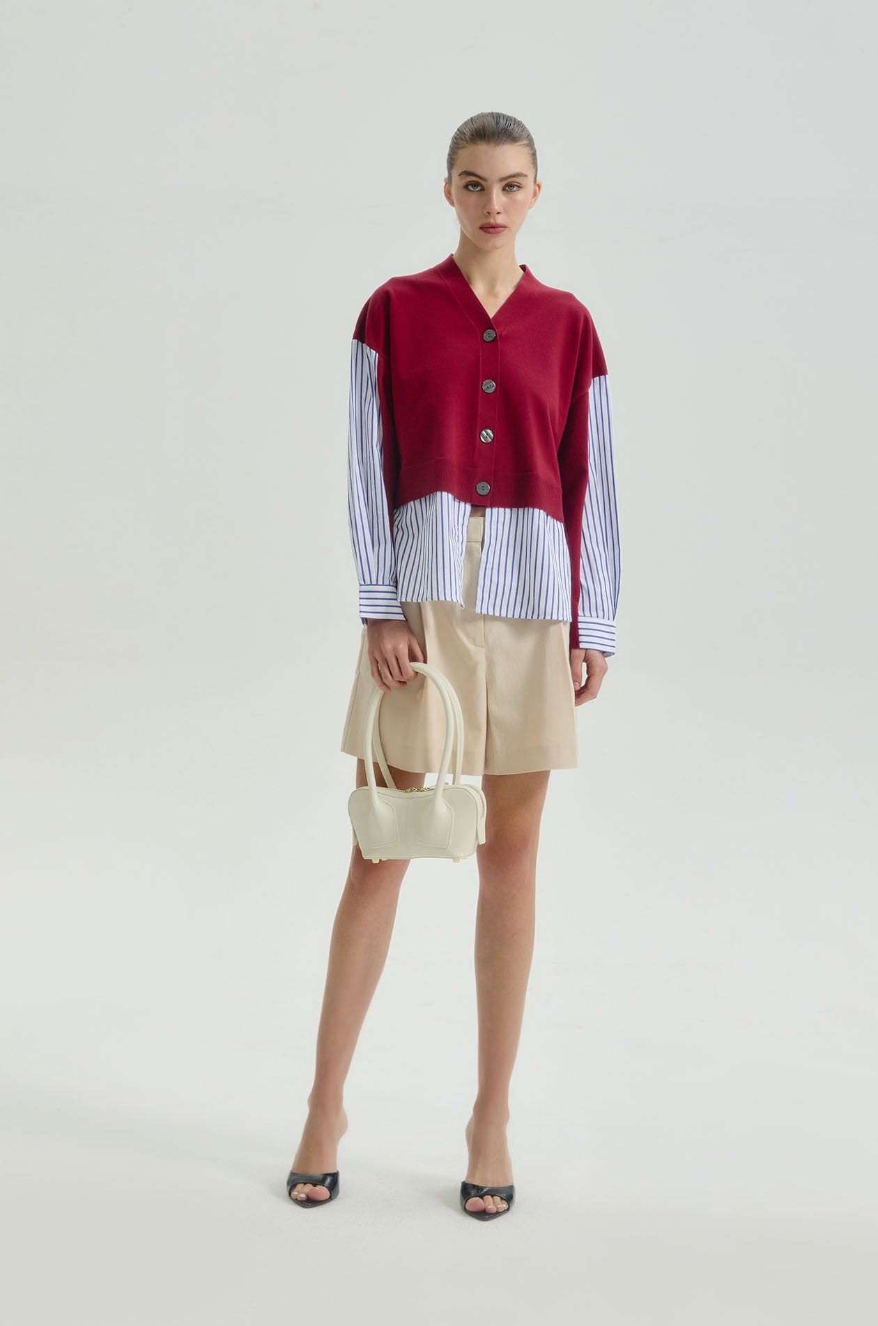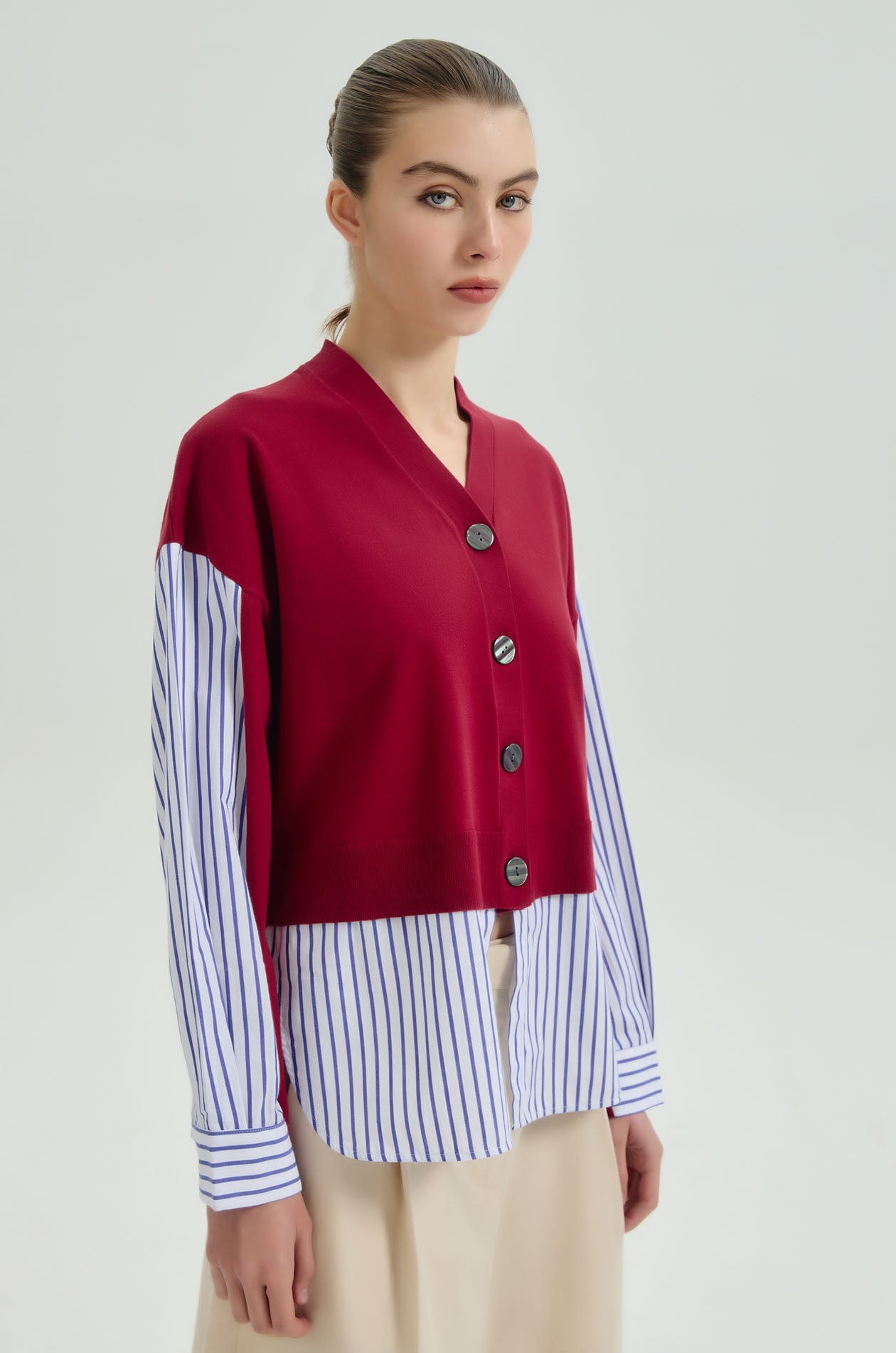 Long-sleeved hybrid cardigan in a combination of poplin and knit fabric. Loose fit with V neckline. Front button closure. Available in dark navy and red.