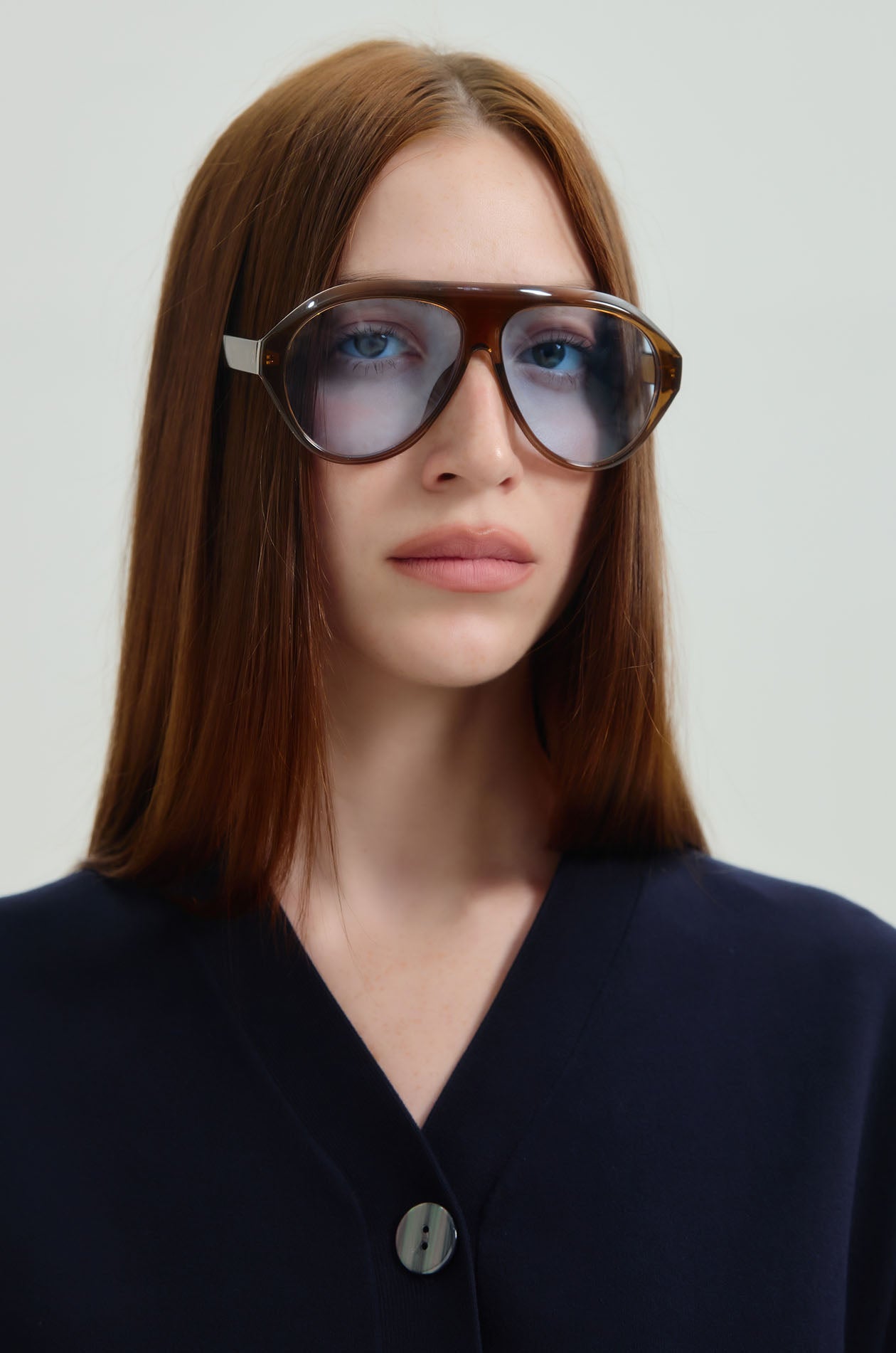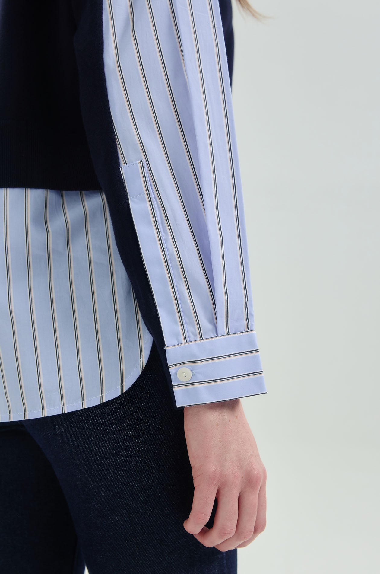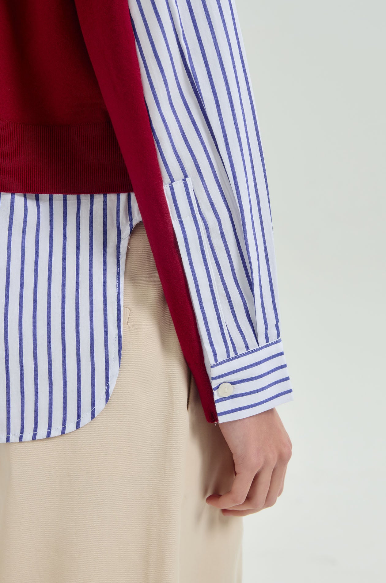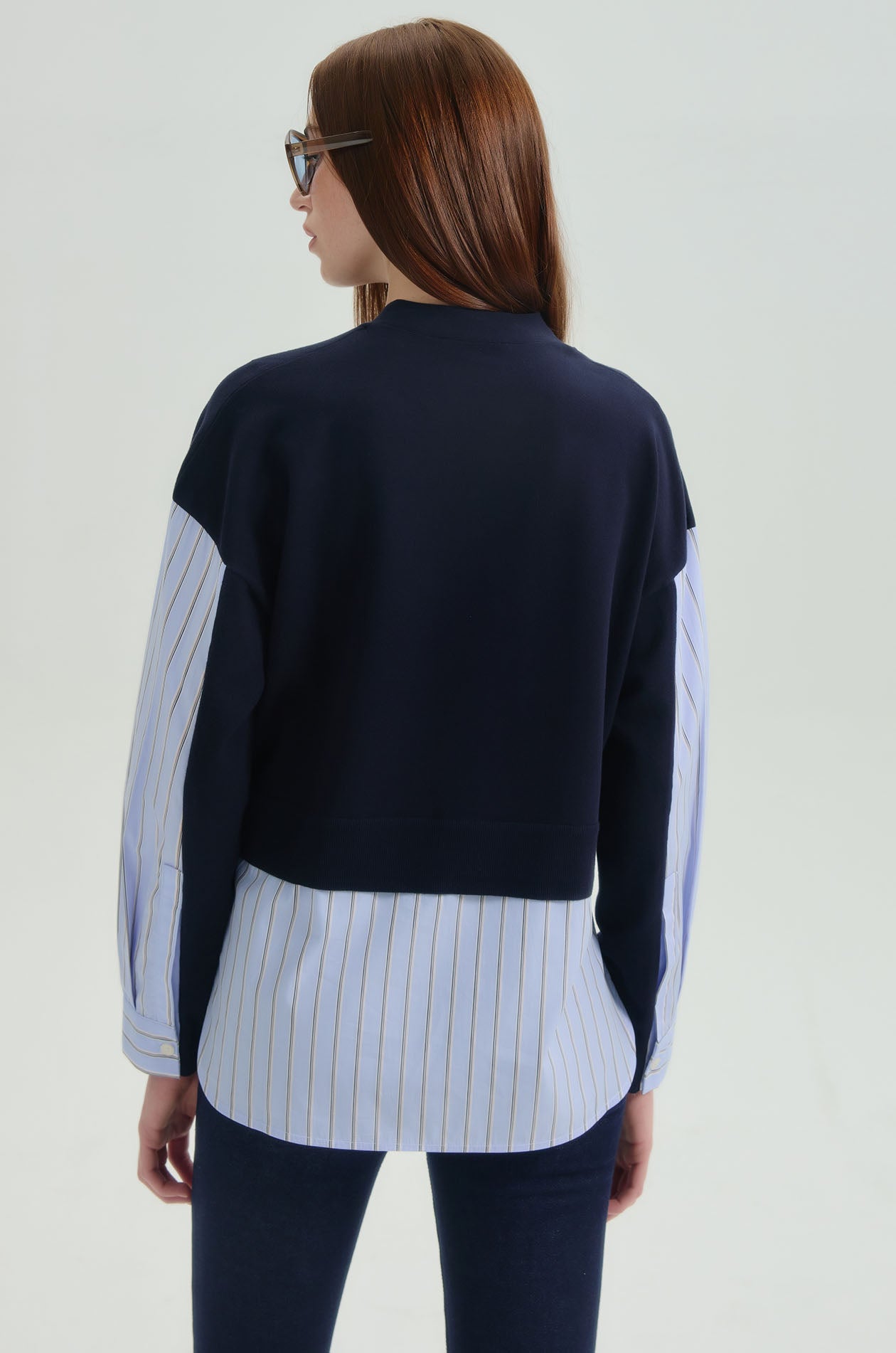 Long-sleeved hybrid cardigan in a combination of poplin and knit fabric. Loose fit with V neckline. Front button closure. Available in dark navy and red.