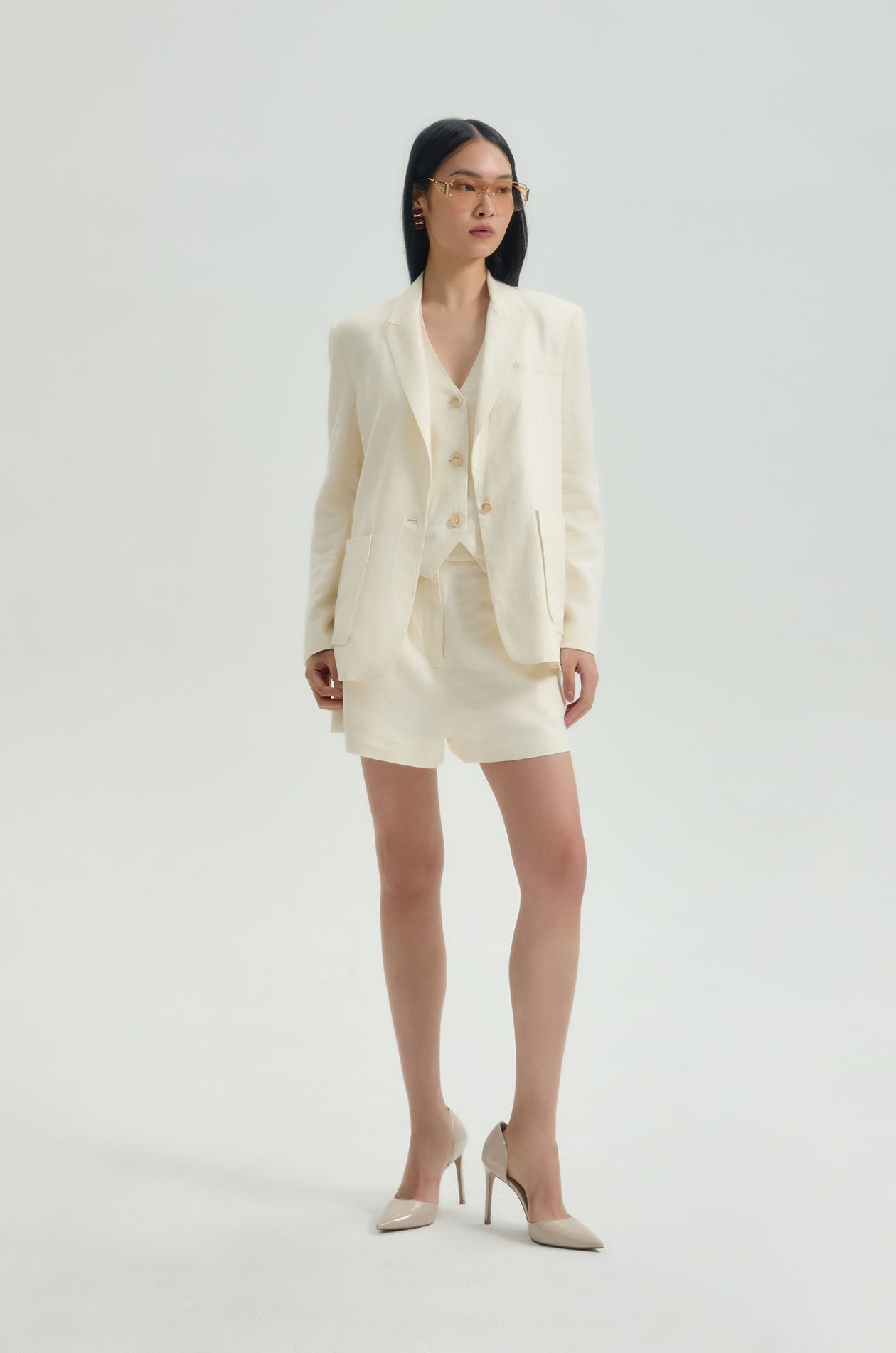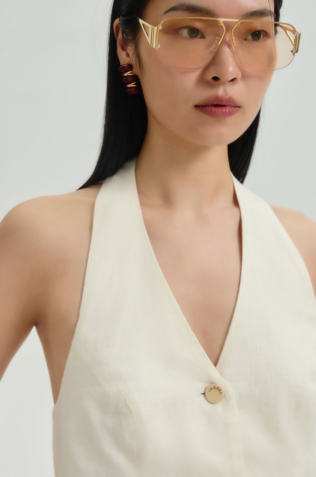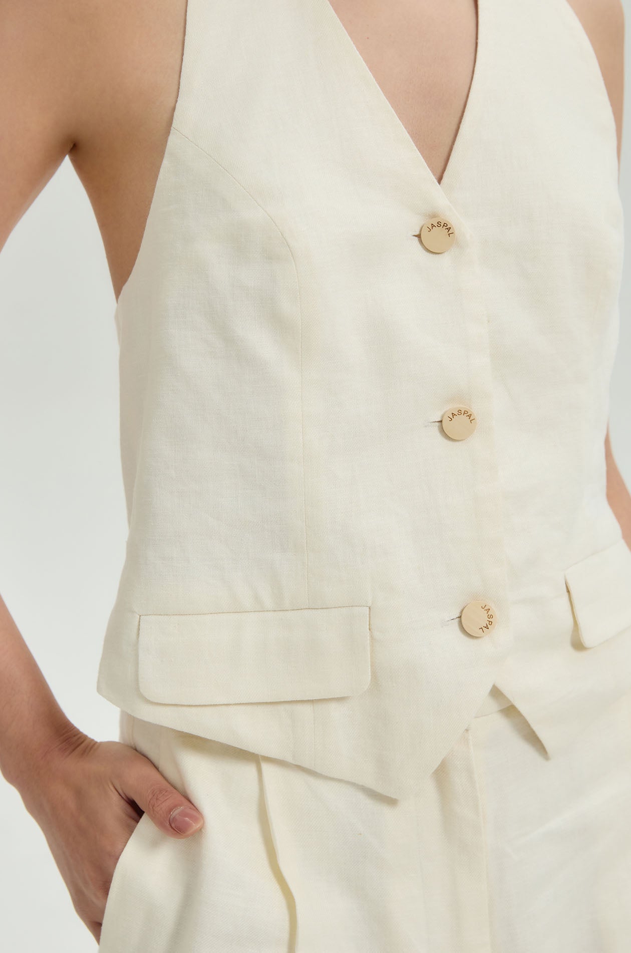 Single-breasted cropped vest in fancy twill. Halter neck design and faux pockets. Front button closure. Available in off-white.