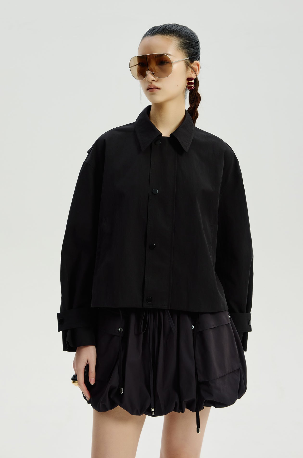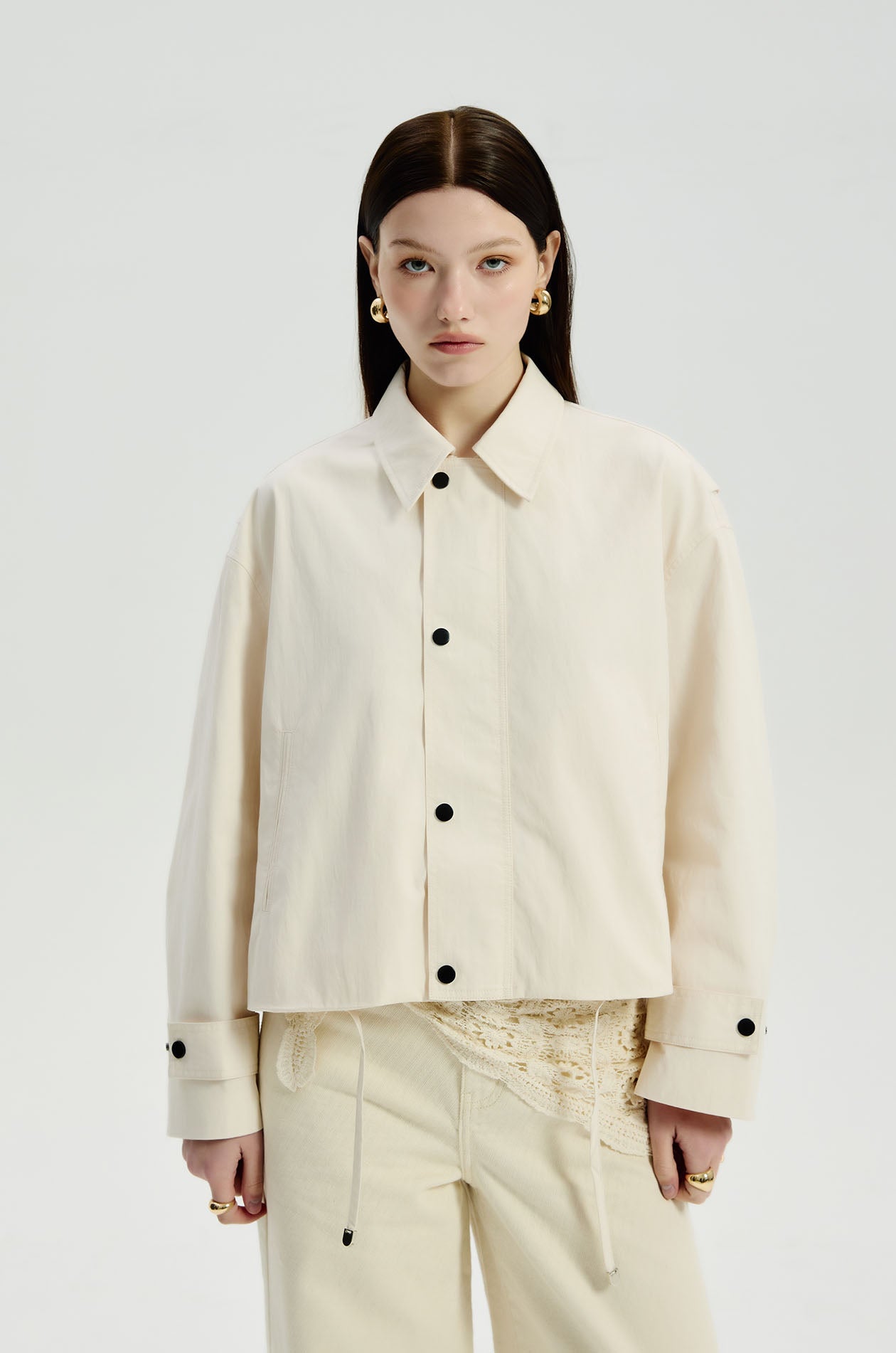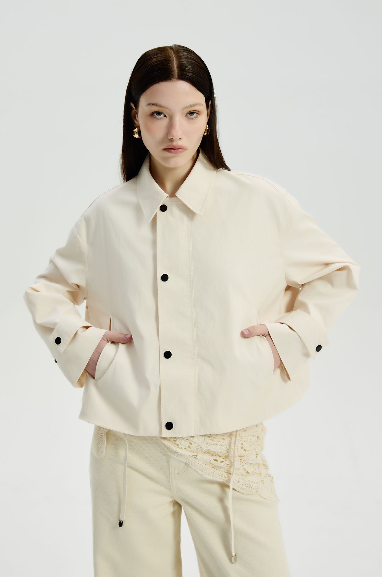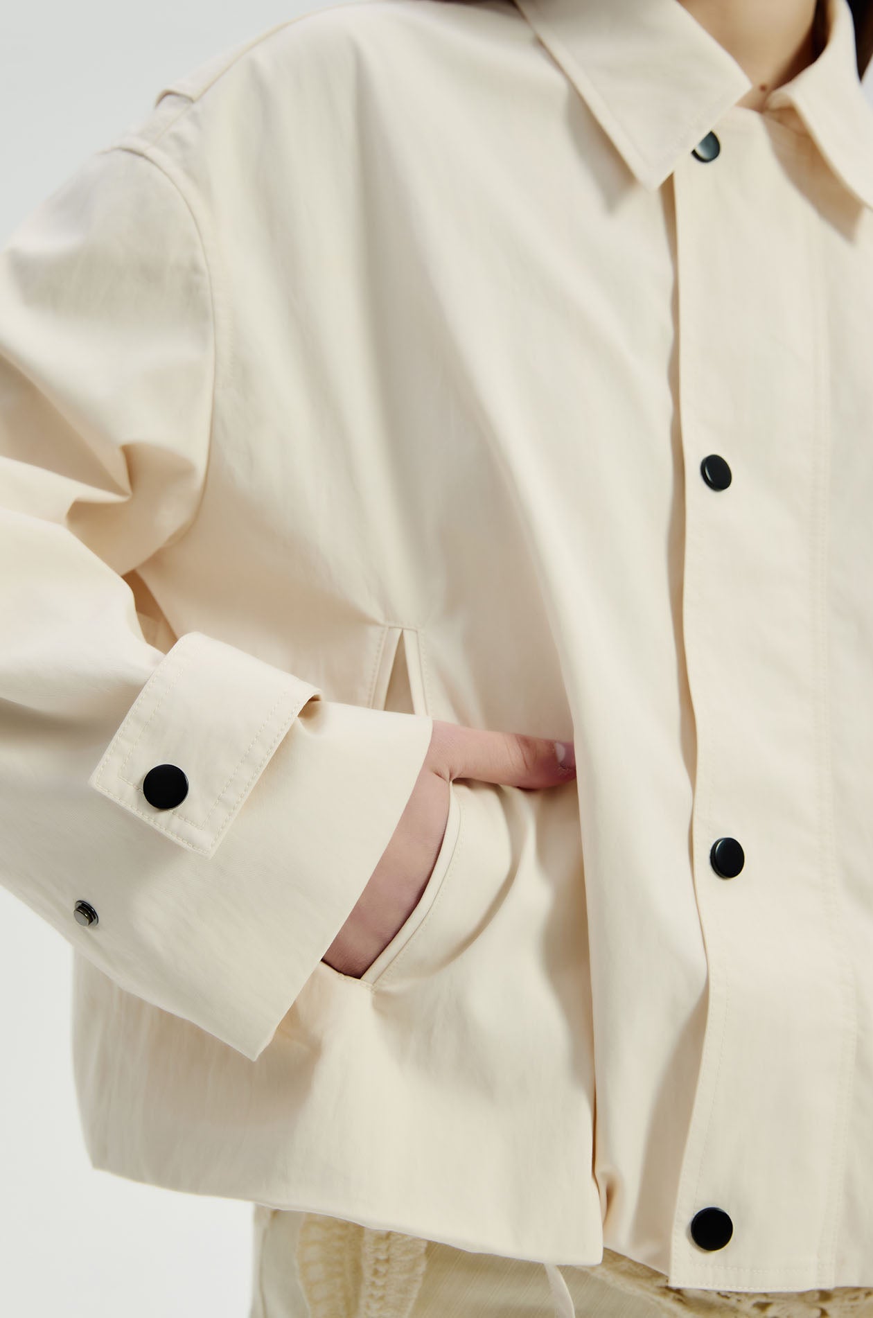 Long-sleeved jacket in technical fabric. Relaxed fit with classic collar, side pockets, and adjuster straps at the cuffs. Front zip and button closure. Available in light beige and black.