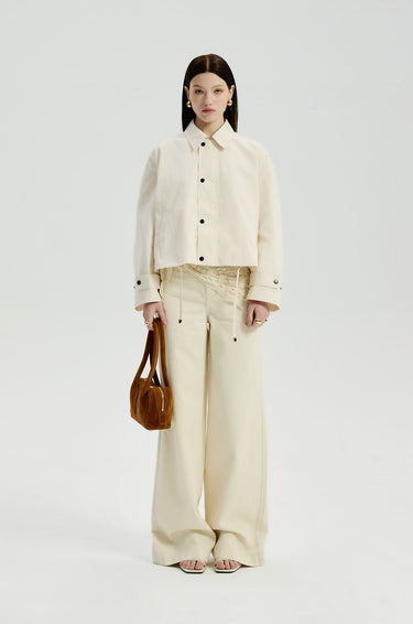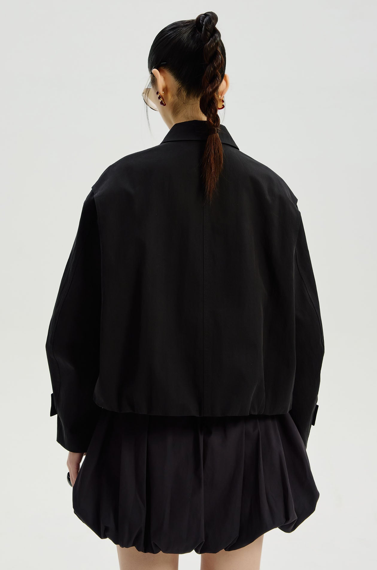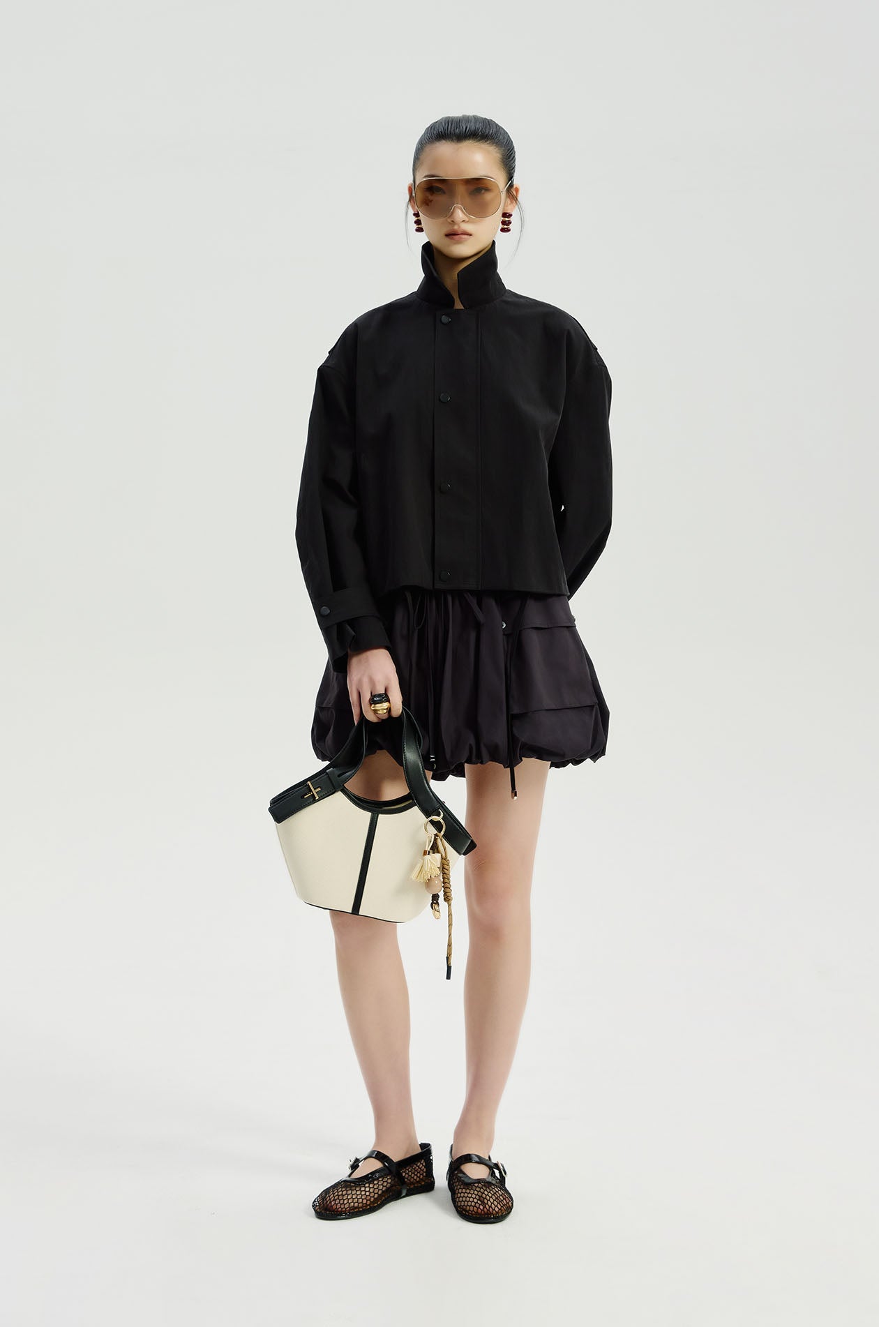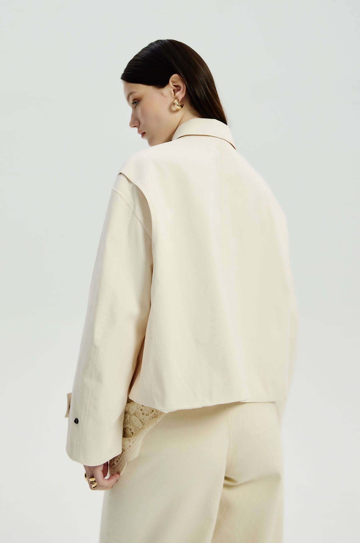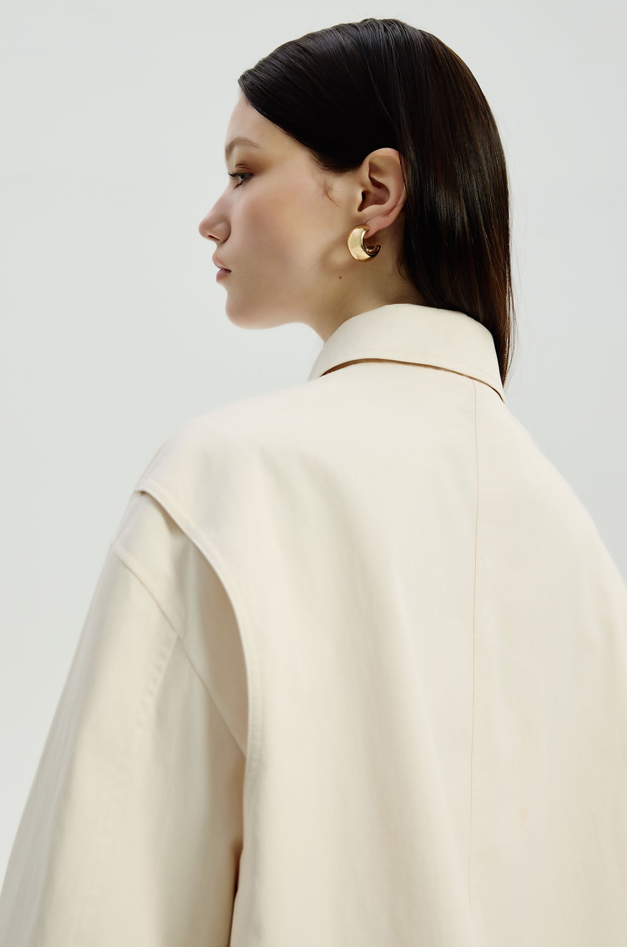 Long-sleeved jacket in technical fabric. Relaxed fit with classic collar, side pockets, and adjuster straps at the cuffs. Front zip and button closure. Available in light beige and black.