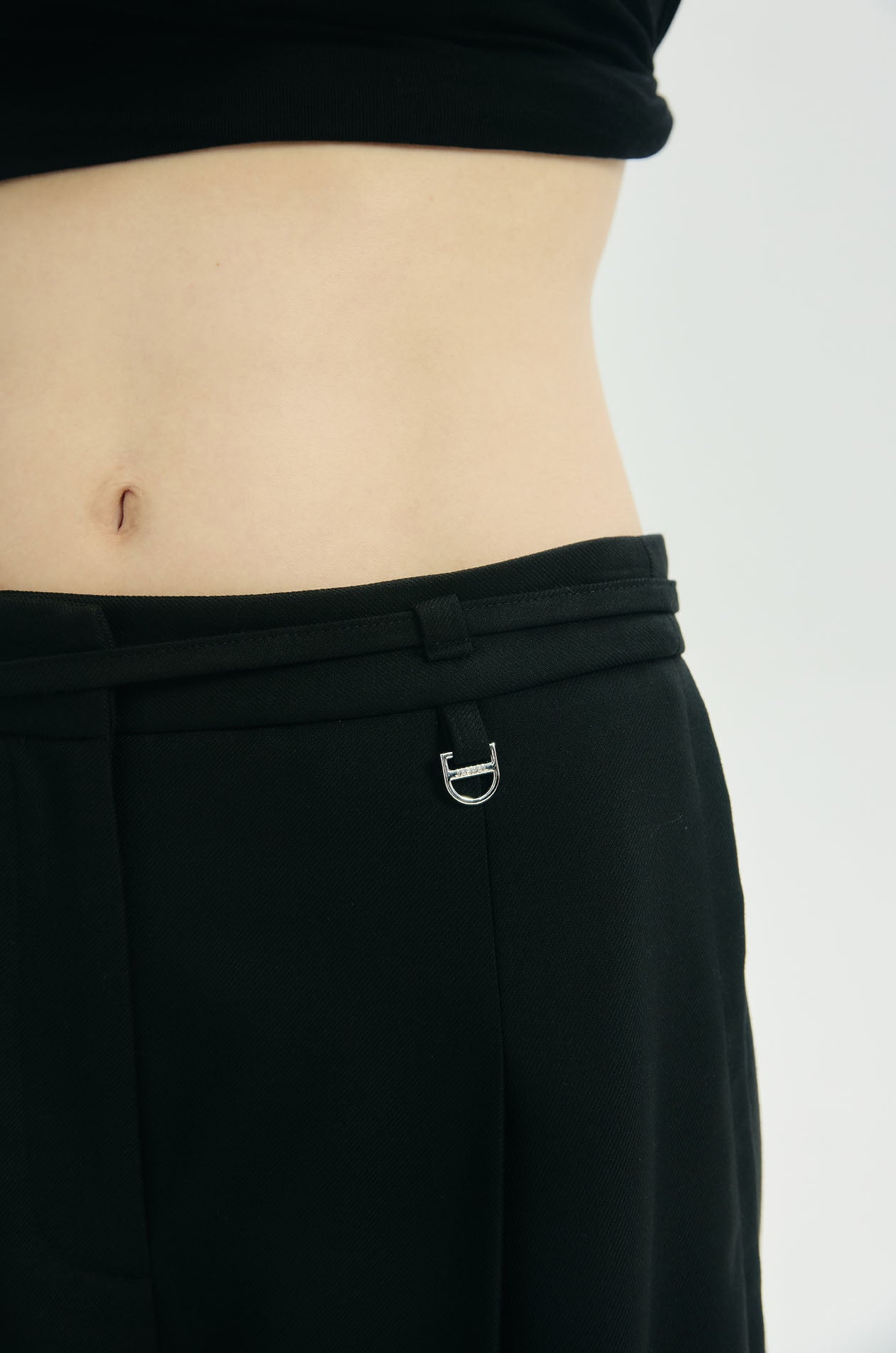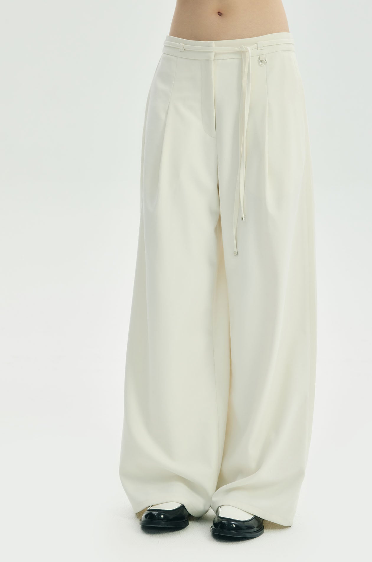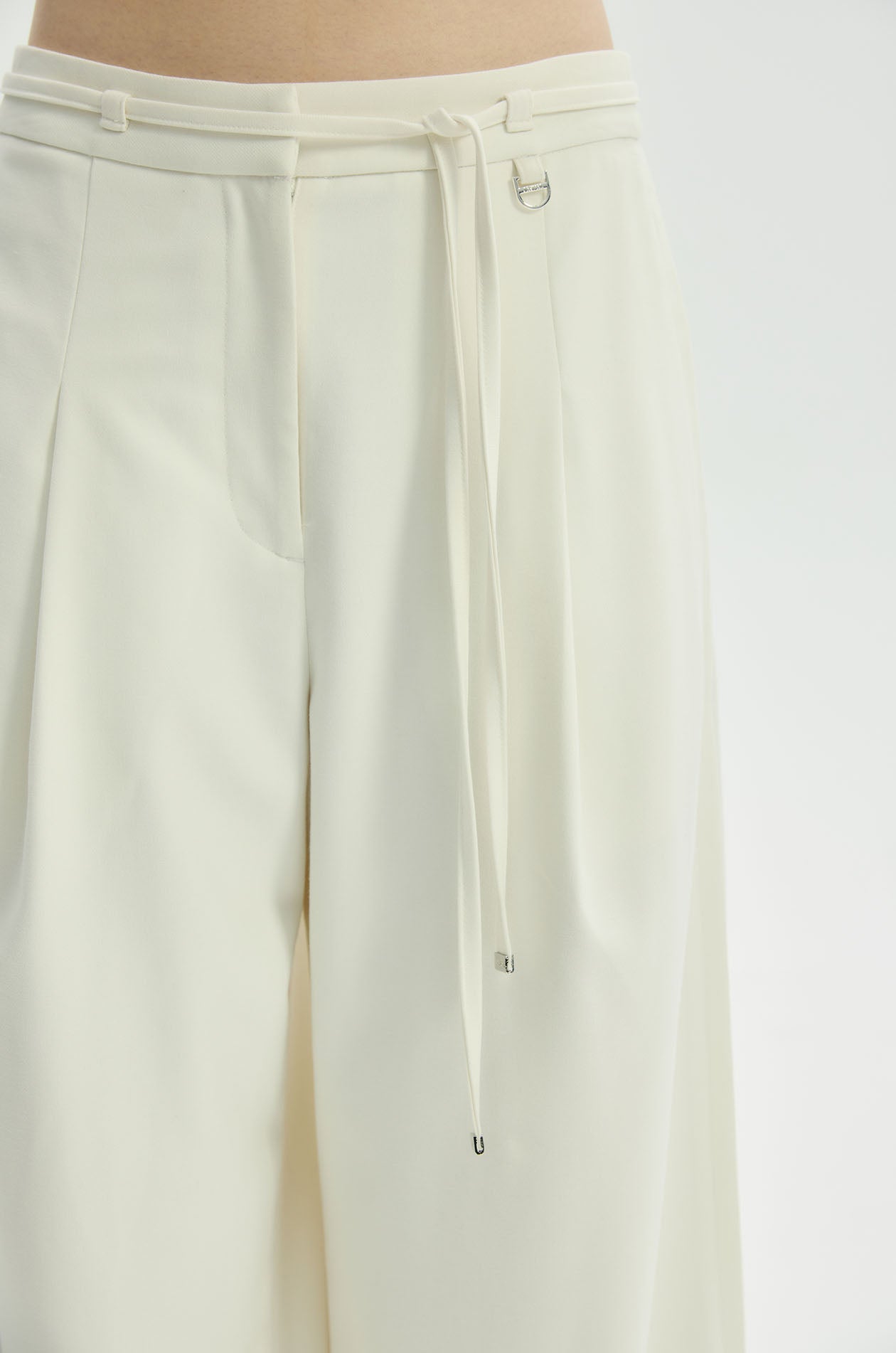 High-rise pants in crepe twill. Wide legs with front pleats and chunky creases on both sides. Silver-tone D-ring embellish at a belt loop. Side pockets and faux back pockets. Matching skinny tie. Front hook and zip closure. Available in black and off-white.