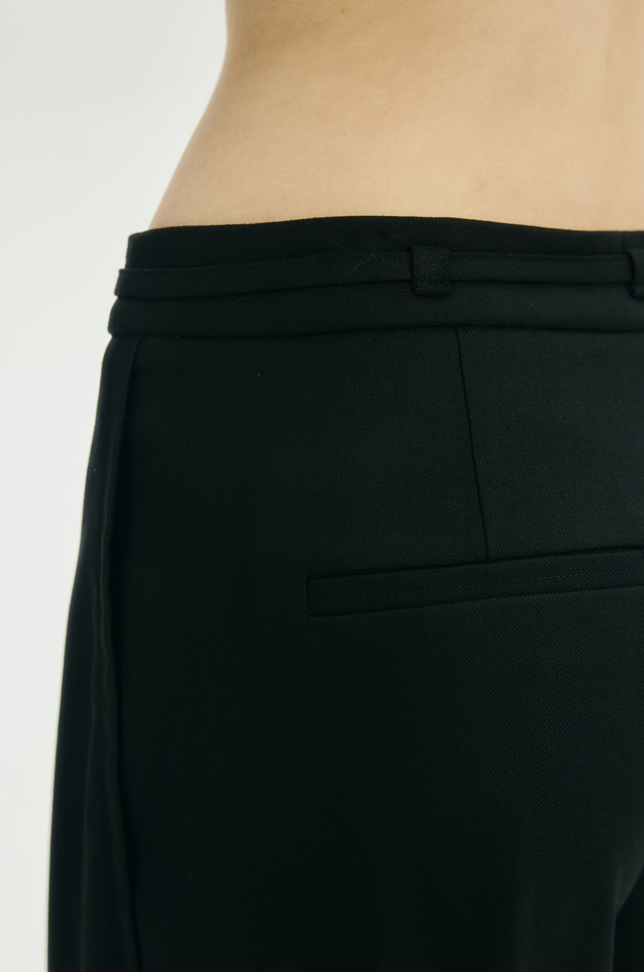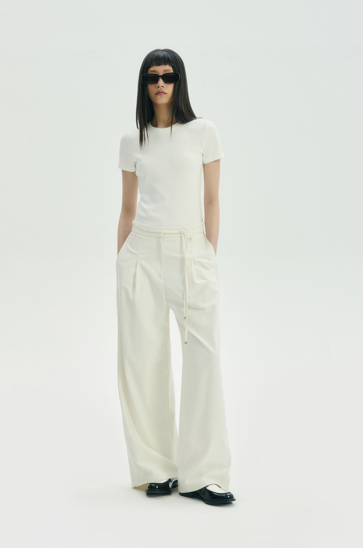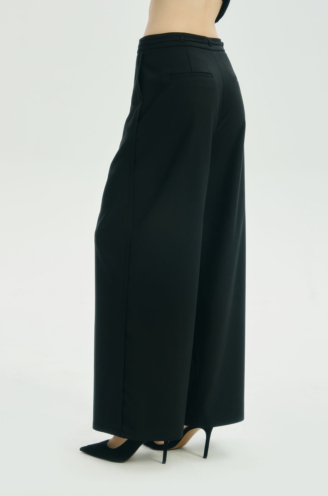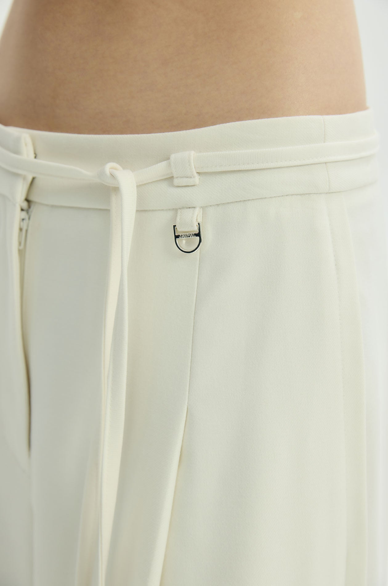 High-rise pants in crepe twill. Wide legs with front pleats and chunky creases on both sides. Silver-tone D-ring embellish at a belt loop. Side pockets and faux back pockets. Matching skinny tie. Front hook and zip closure. Available in black and off-white.