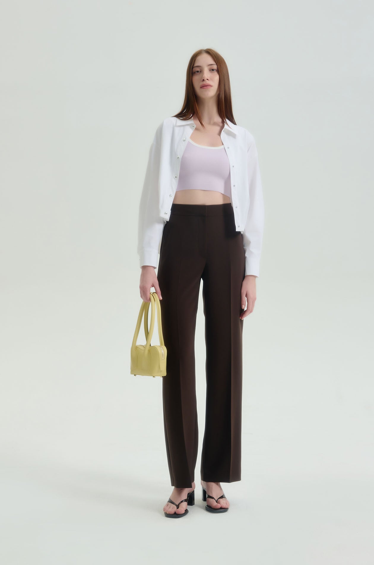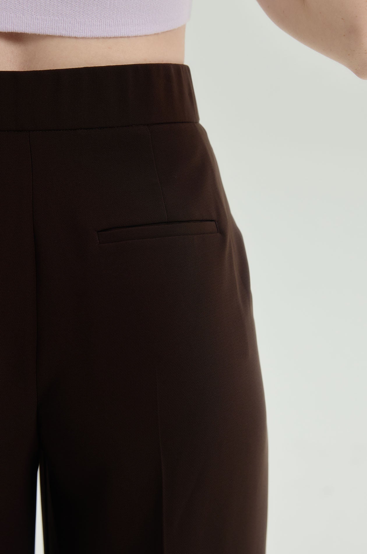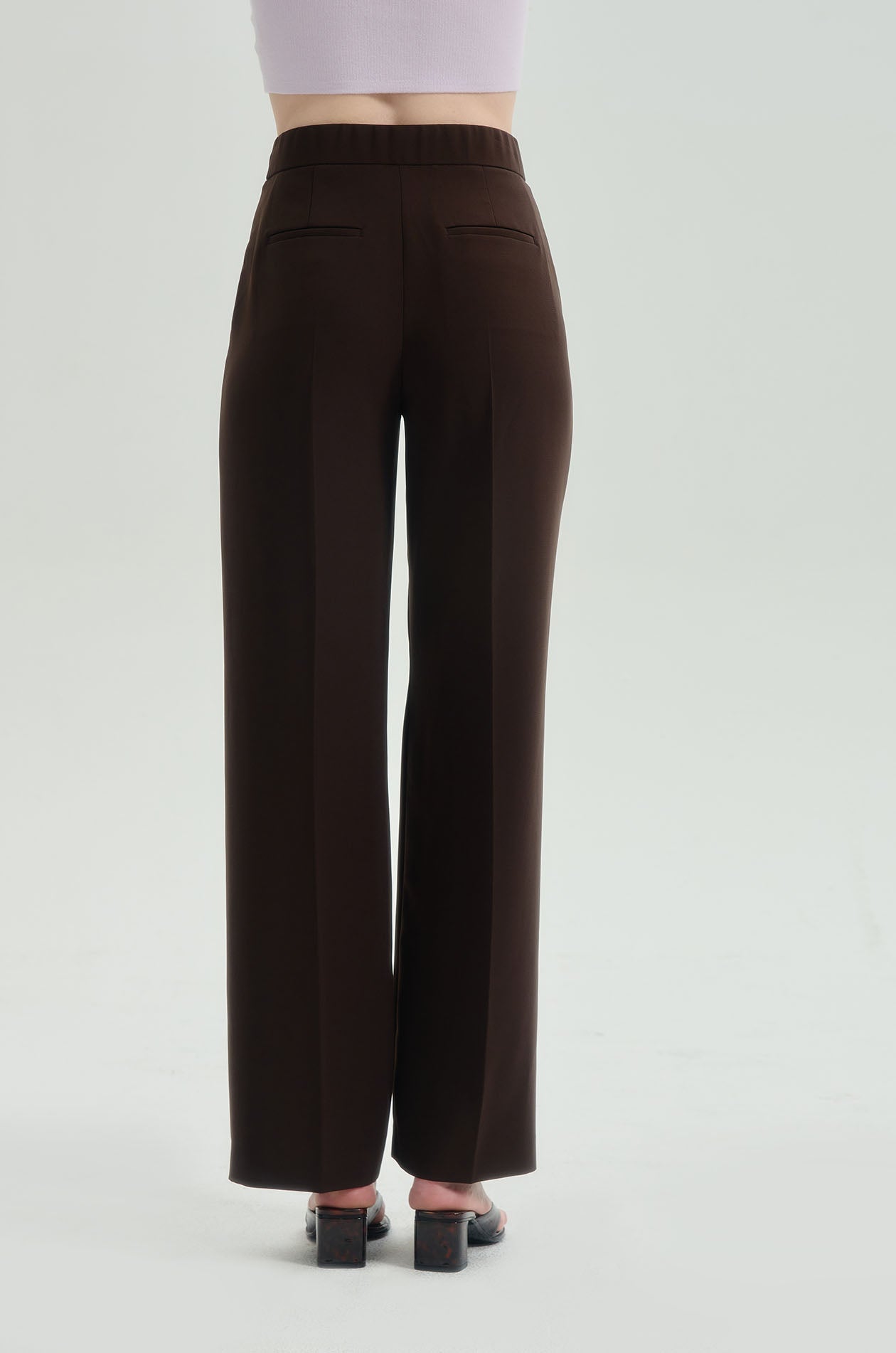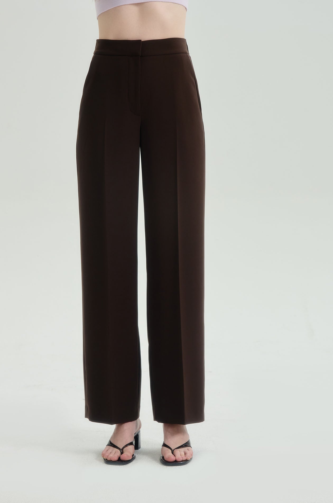 High-rise pants in suiting fabric. Wide legs with double pleats and side pockets. Silver-tone D-ring applique at a belt loop. Front hook and zip closure. Available in black and dark brown.
