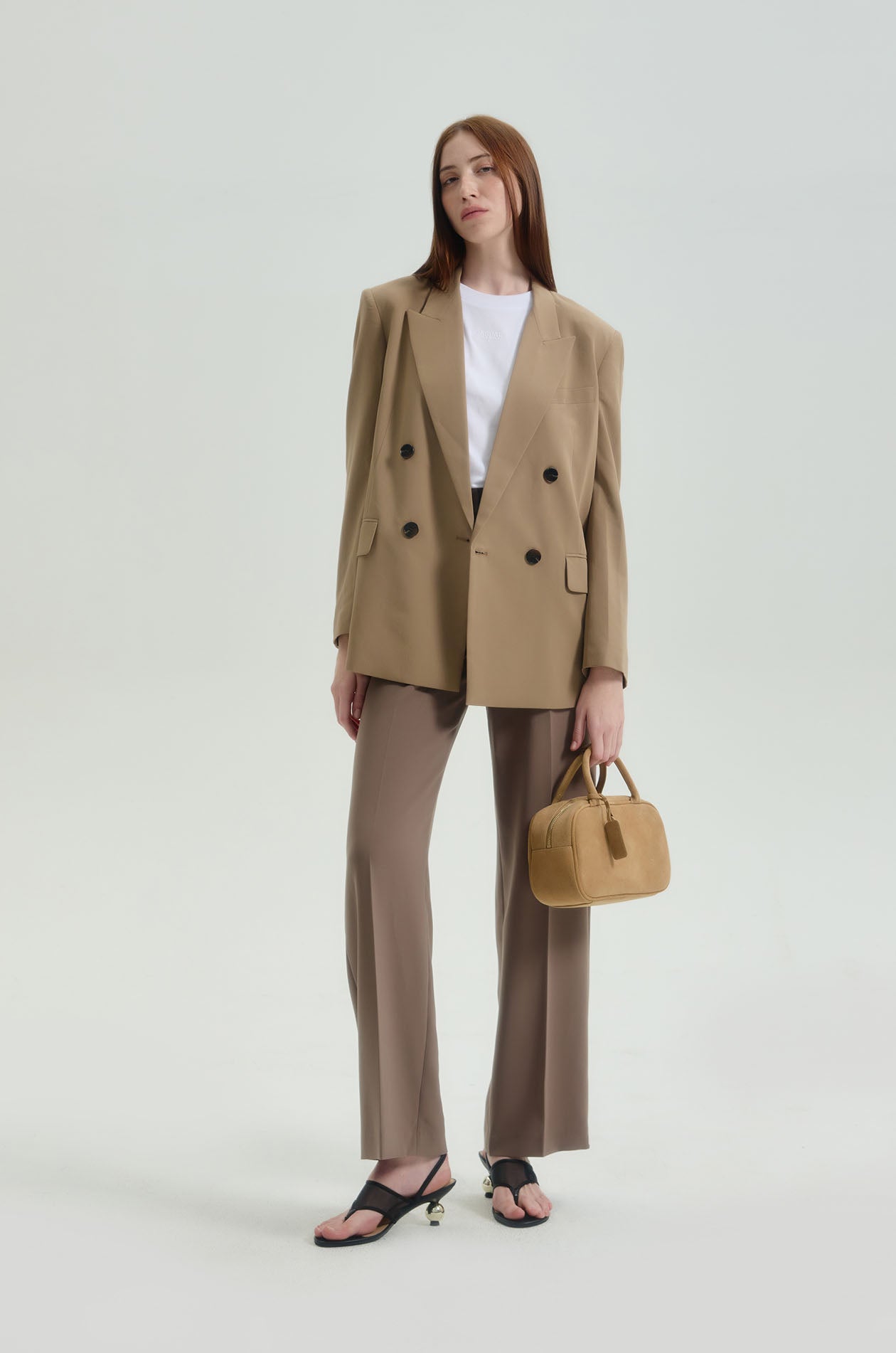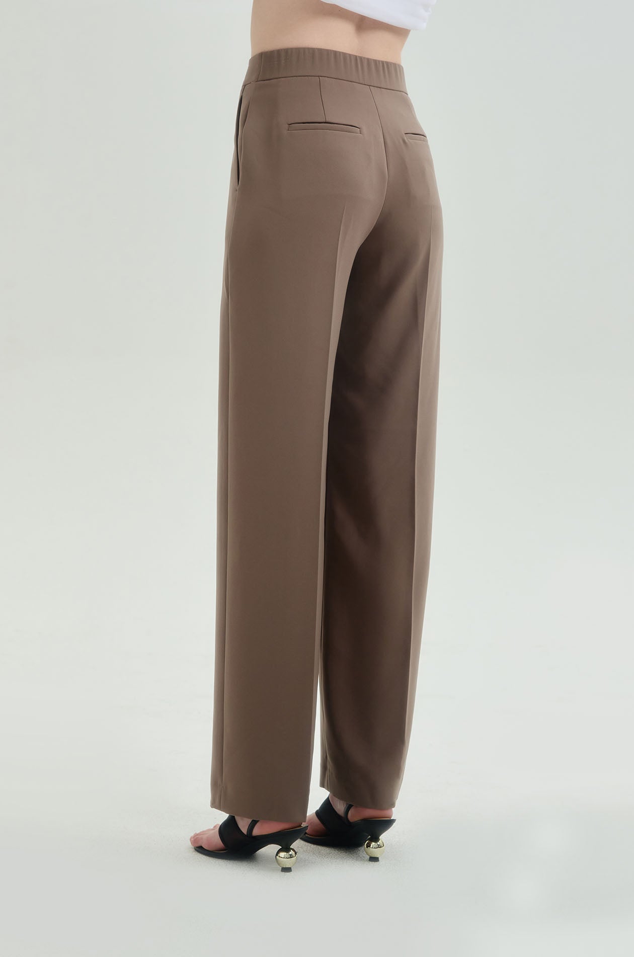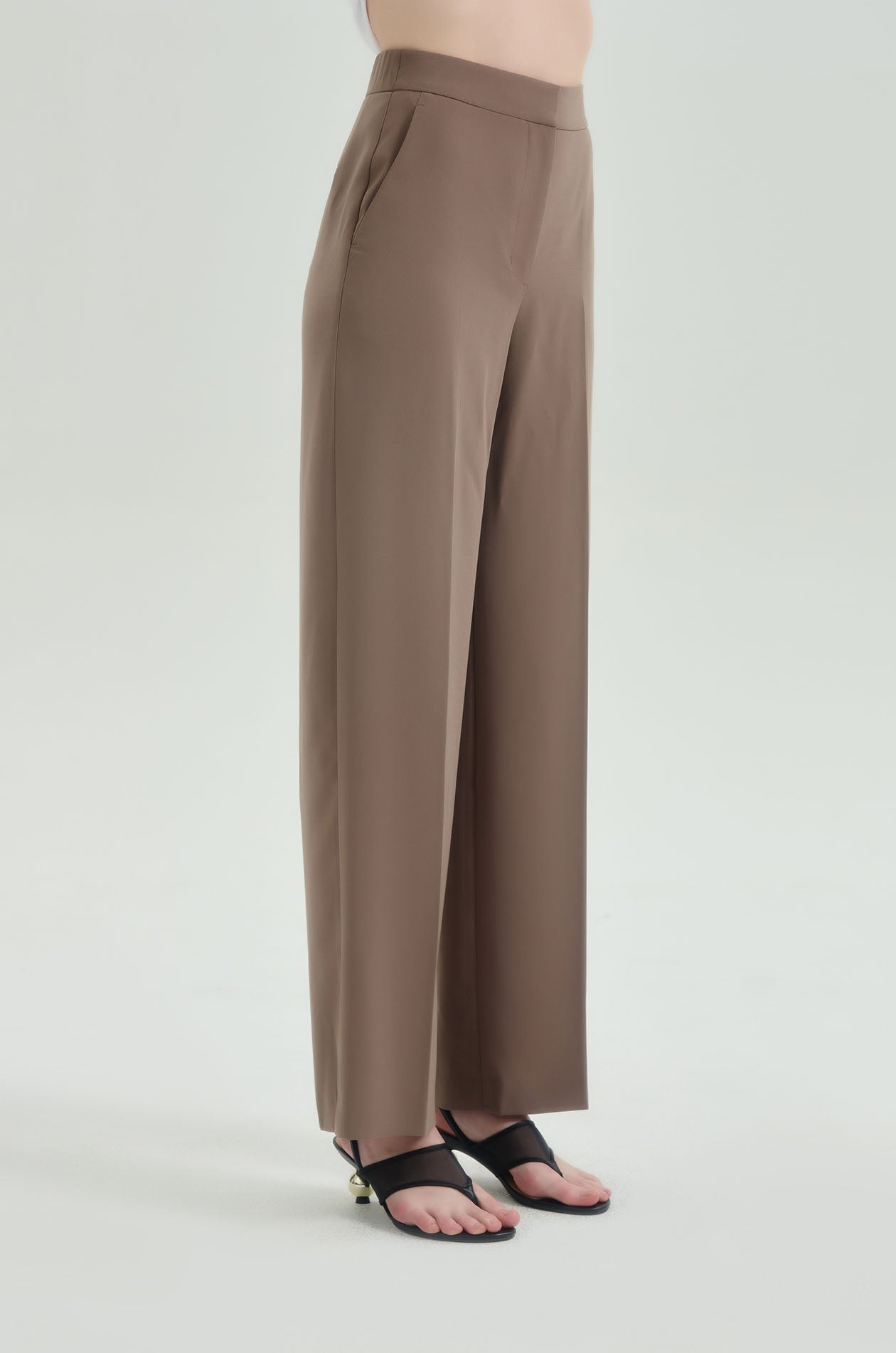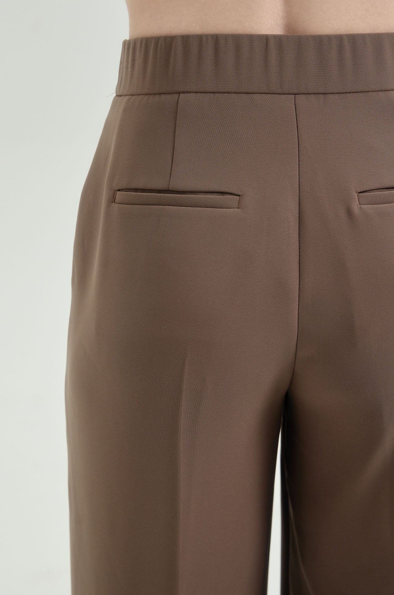 High-rise pants in suiting fabric. Wide legs with double pleats and side pockets. Silver-tone D-ring applique at a belt loop. Front hook and zip closure. Available in black and dark brown.