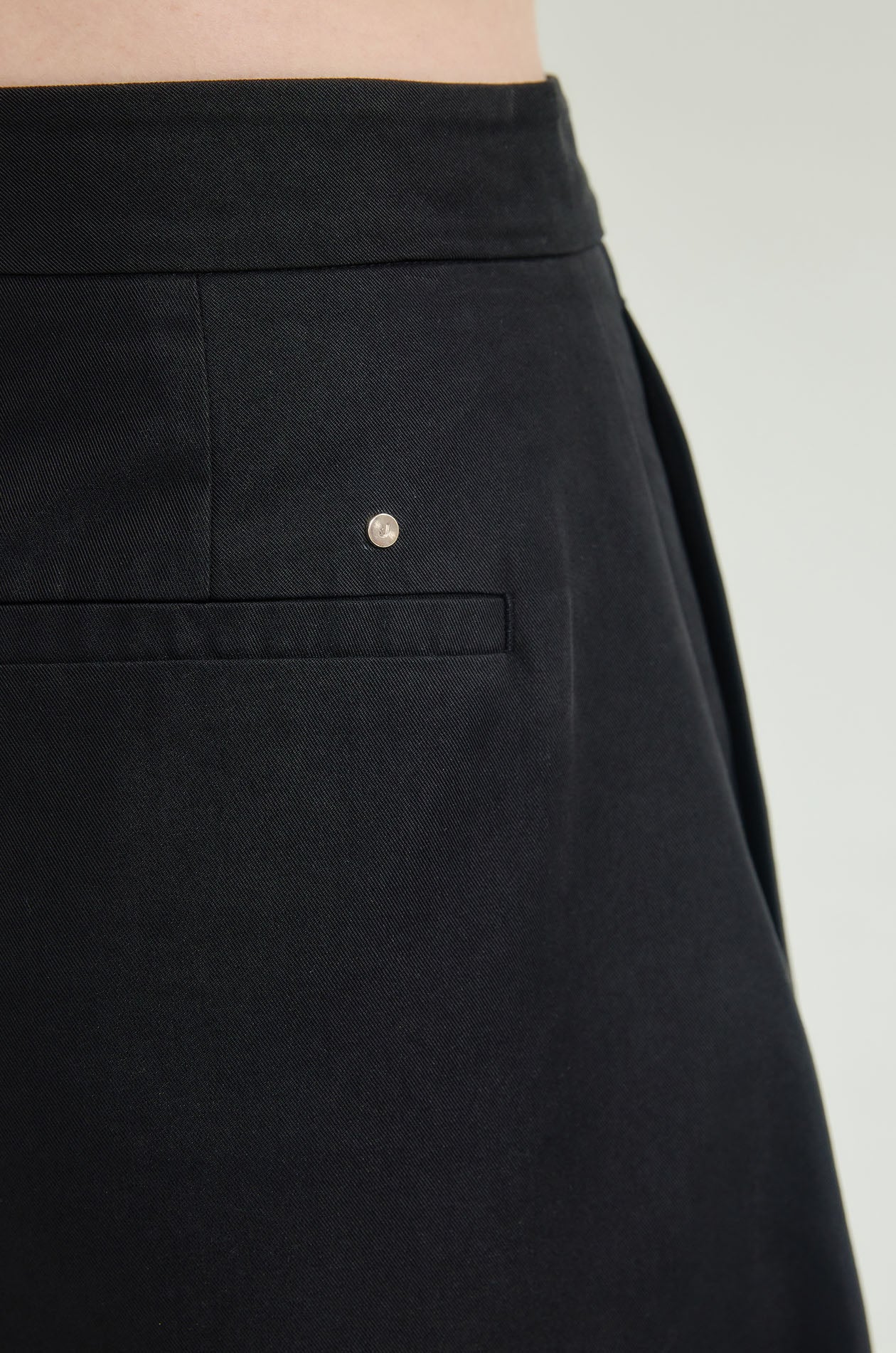 High-rise pants in taslan fabric. Designed for a structured barrel-leg silhouette, featuring side and back pockets. Front hook and zip closure. Available in black and beige.