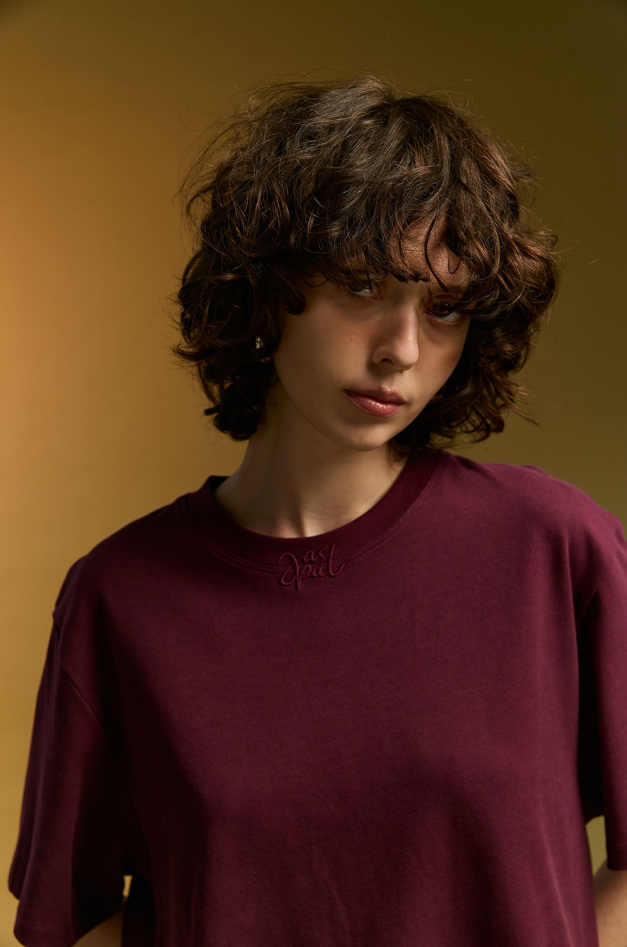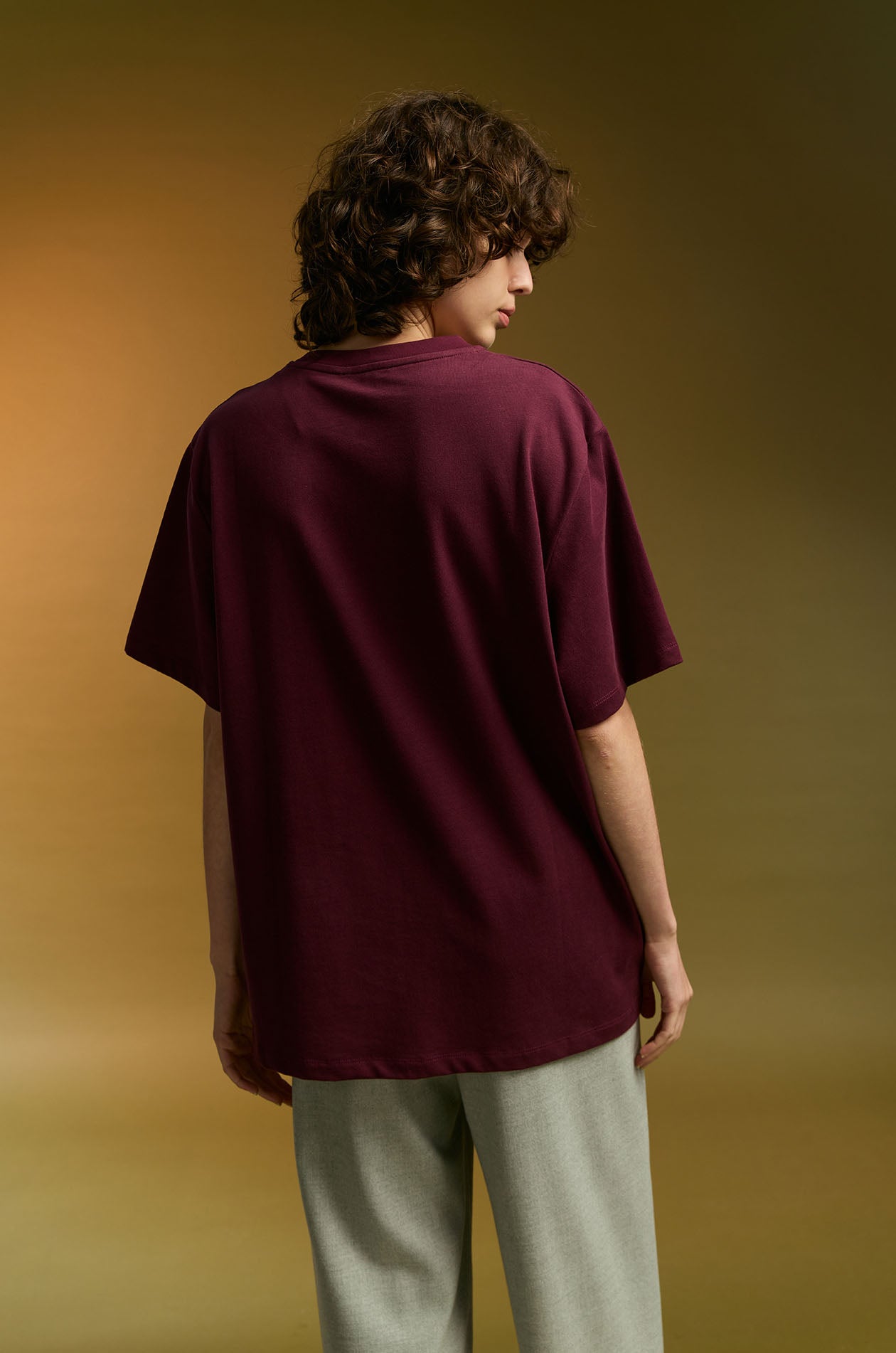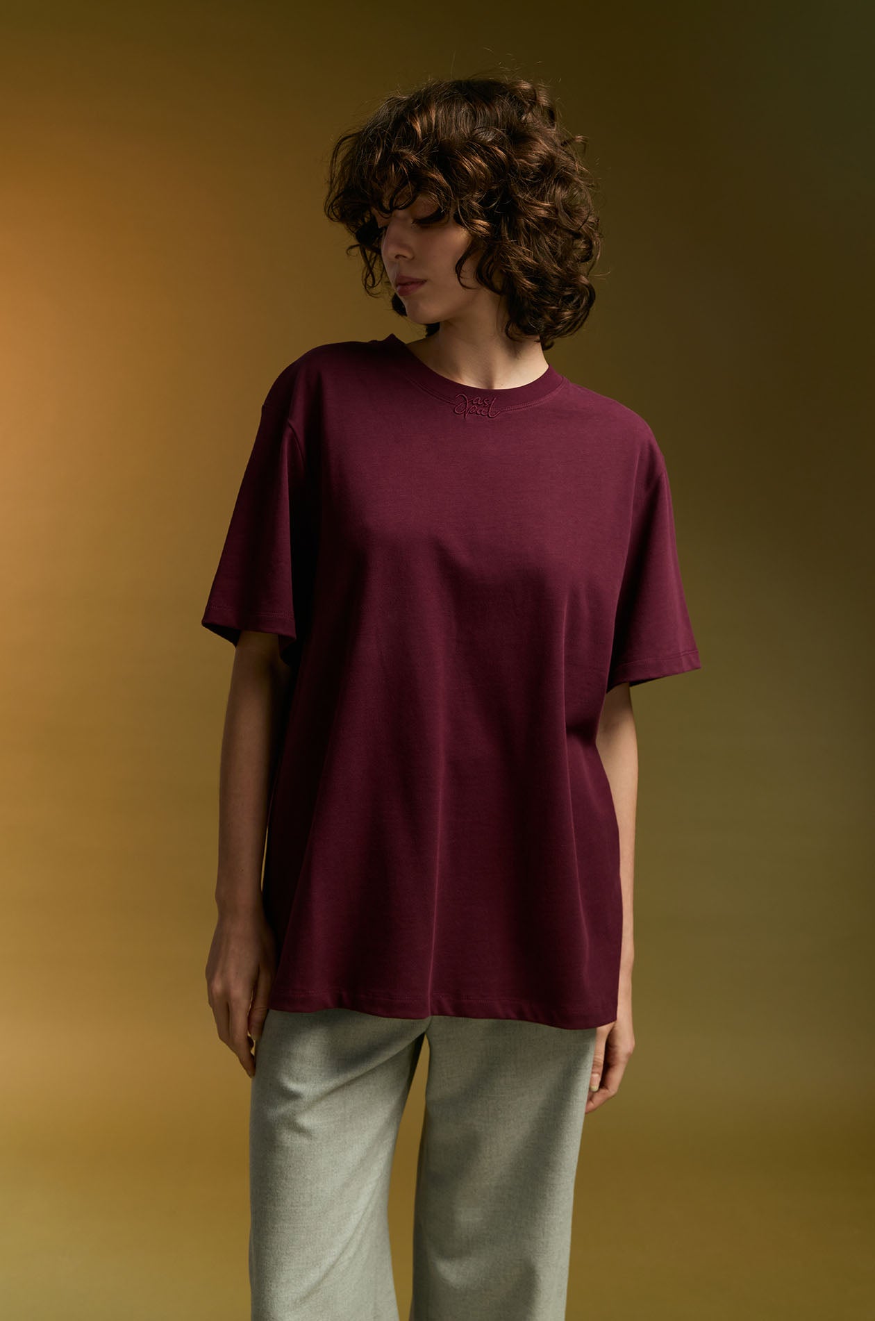 Short-sleeved oversized t-shirt in jersey, crafted from sustainable lyocell. A timeless masculine silhouette makes this piece a chic everyday essential. Ribbed round neck with Jaspal logo embroidery. Available in white, mocha mousse, and cherry liquor.