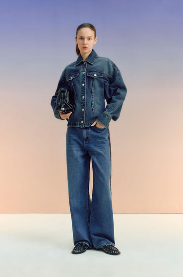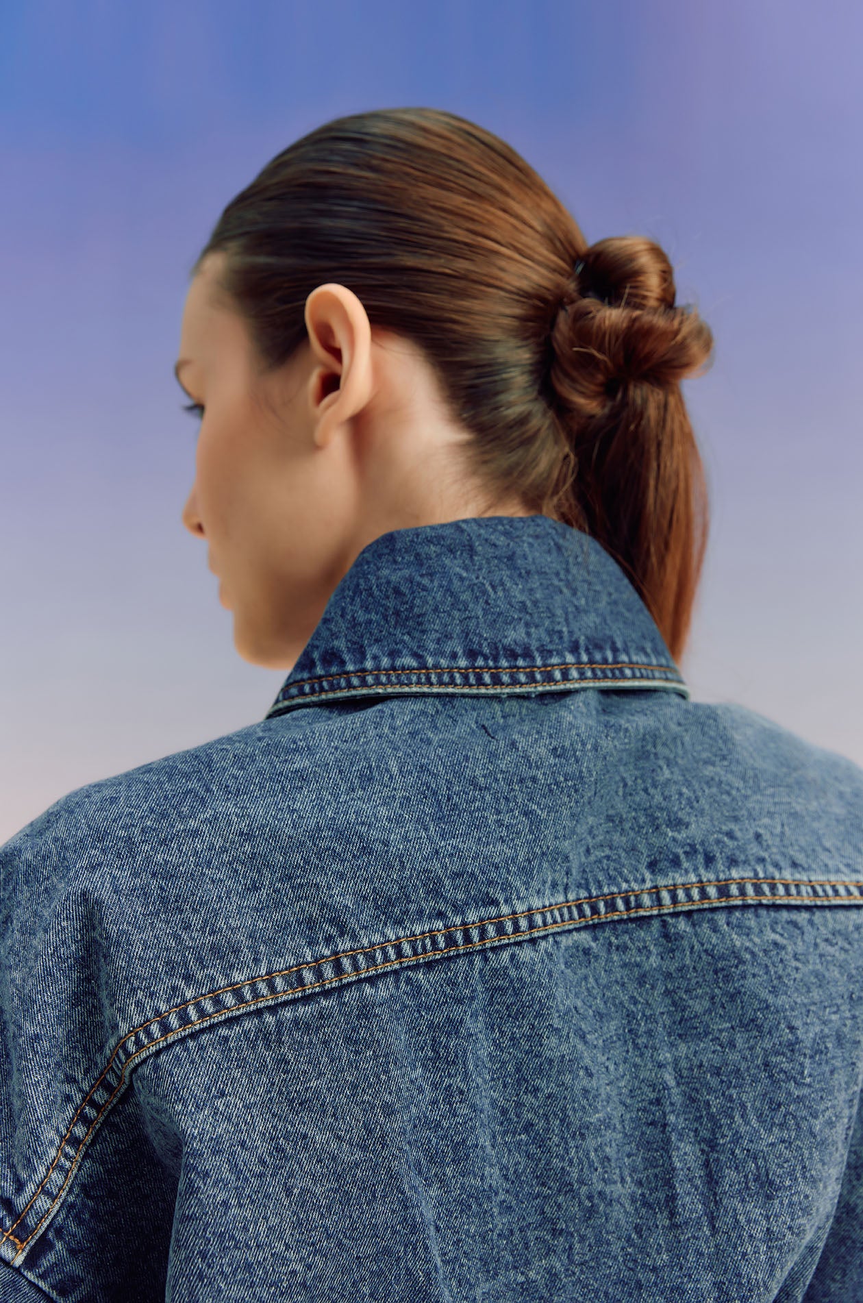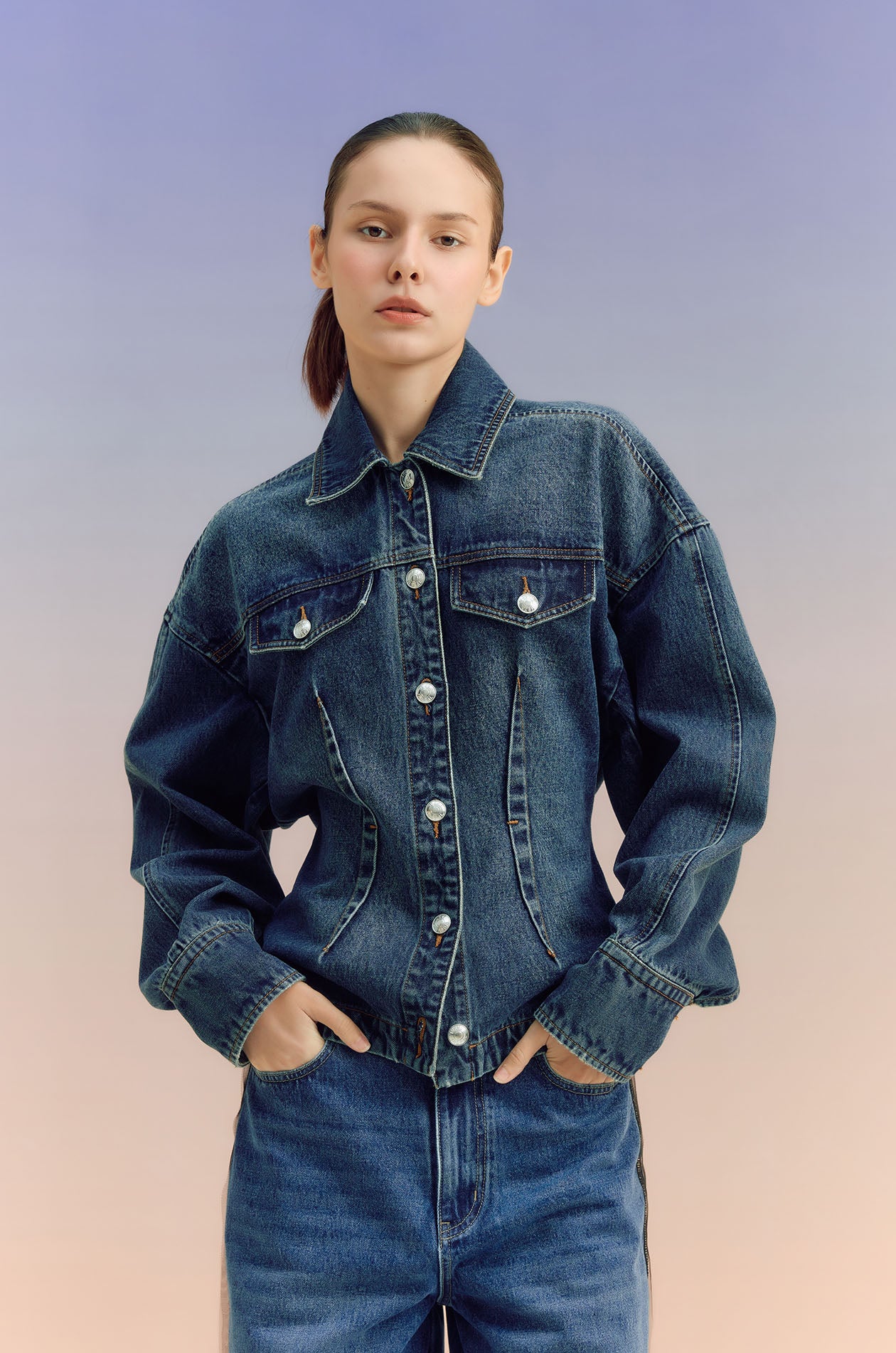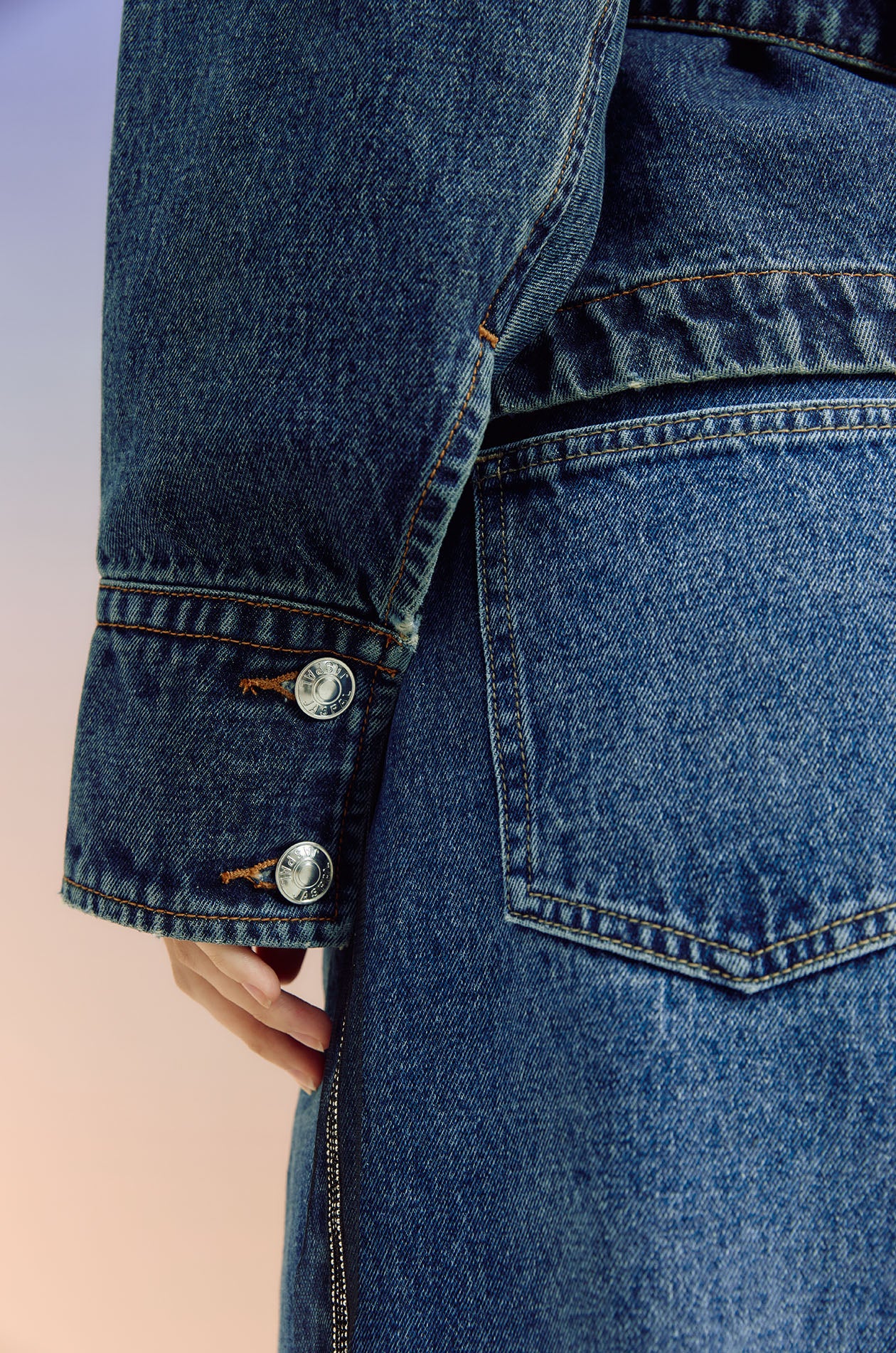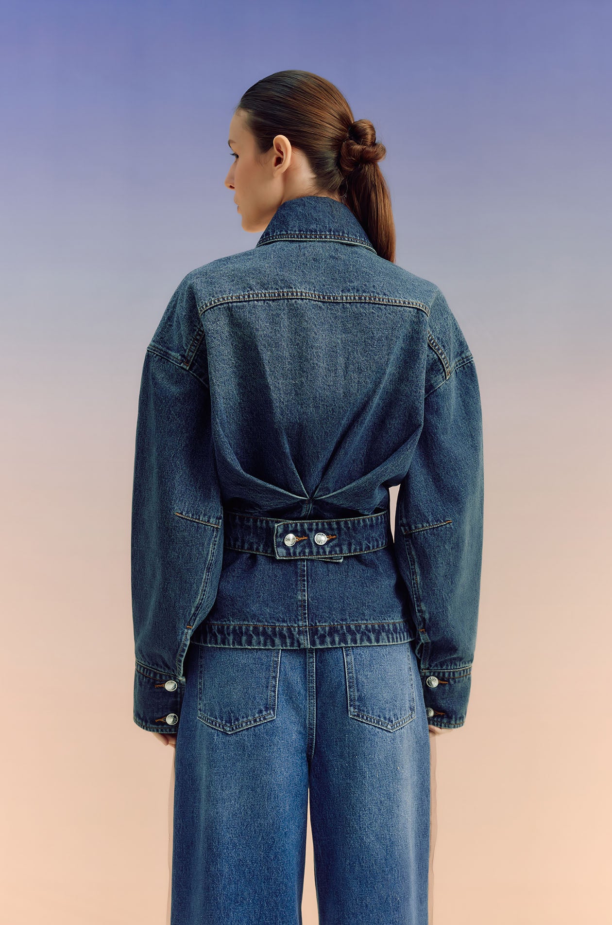 Drop-shoulder trucker jacket in cotton denim. Peplum silhouette with long-barrel sleeves. Spread collar, faux chest pockets, oversized cuffs, and adjuster strap at the back. Front button closure. Available in dark blue.
