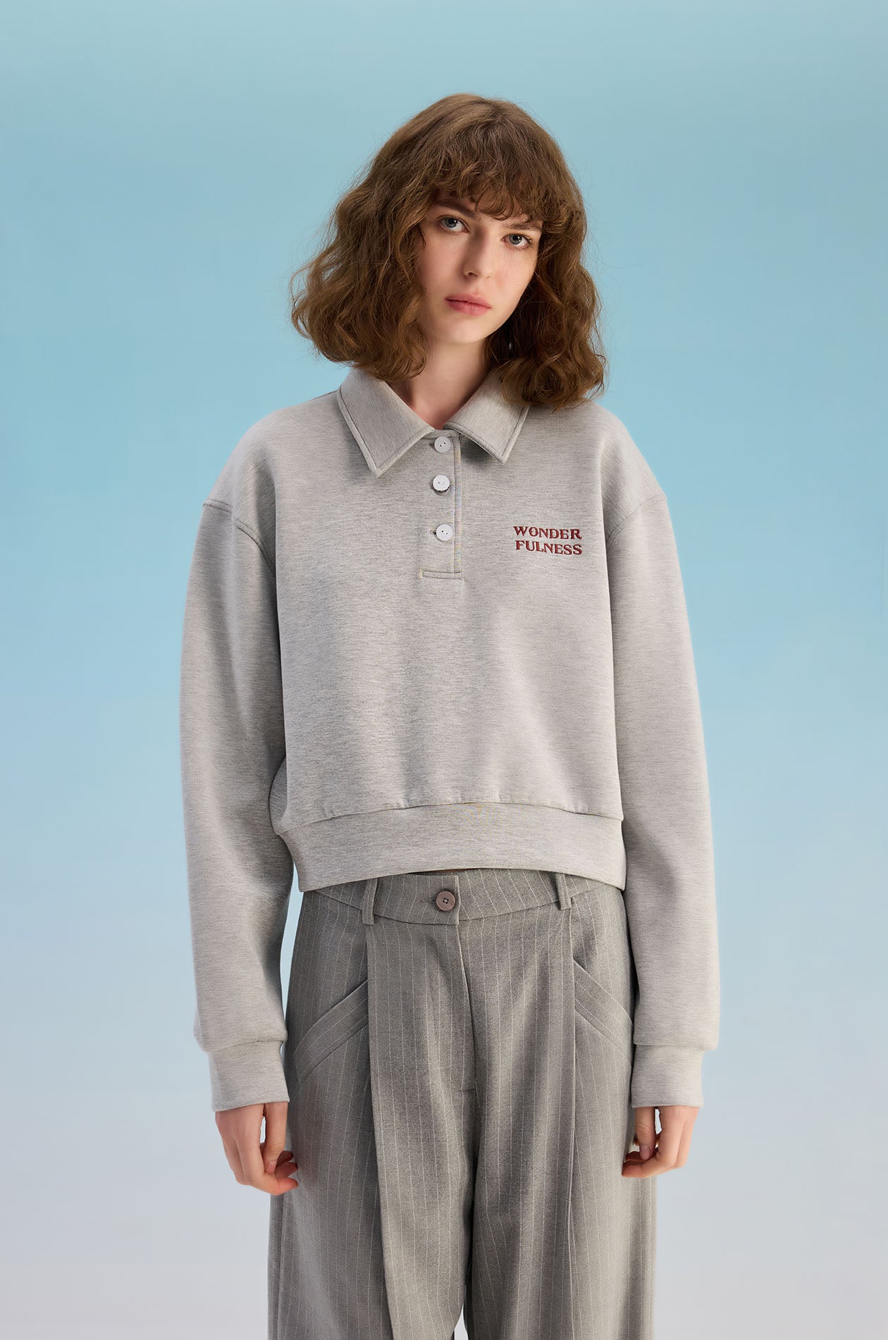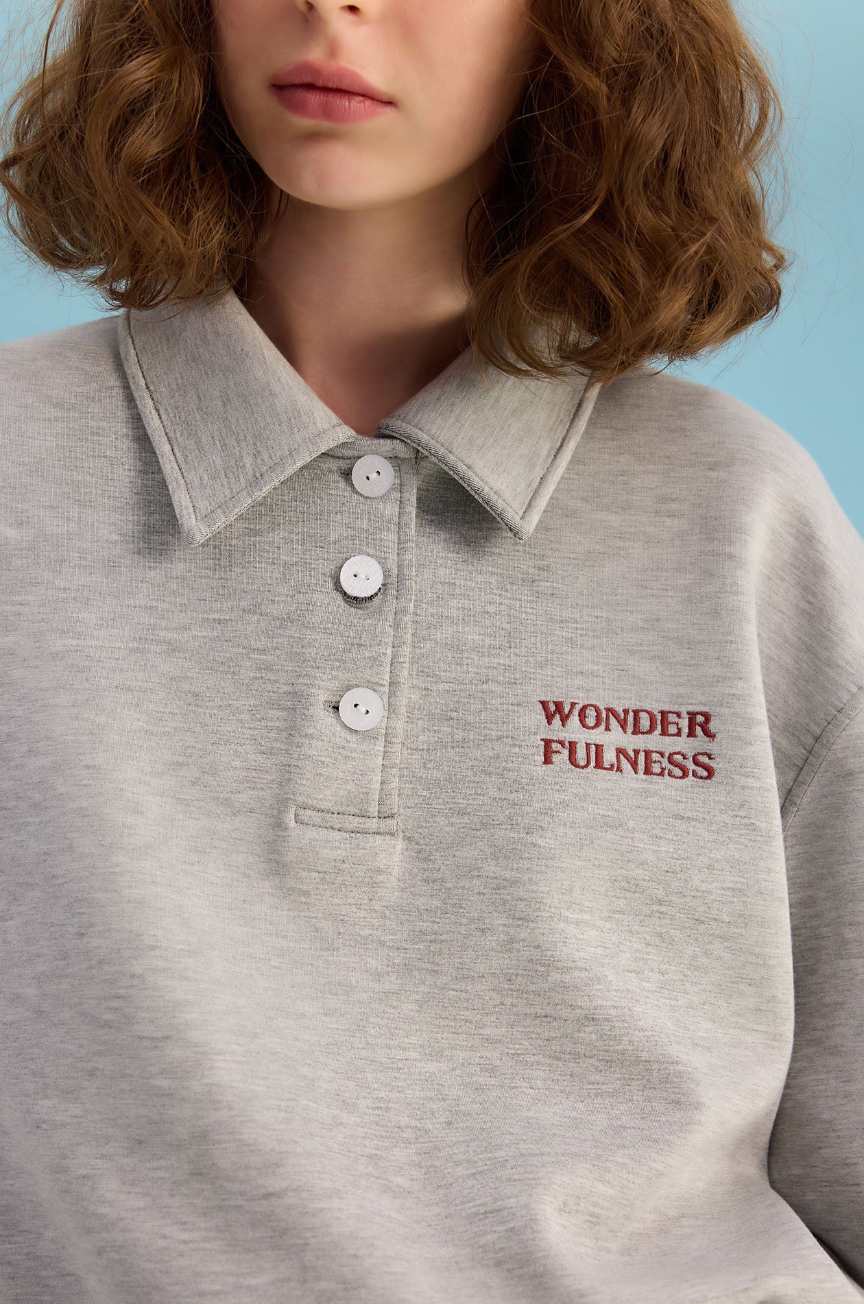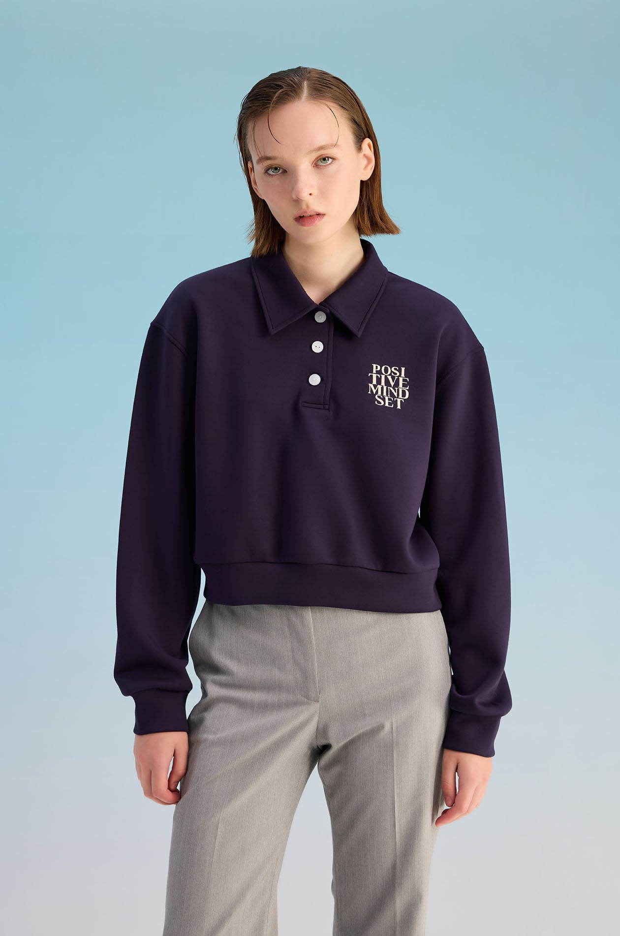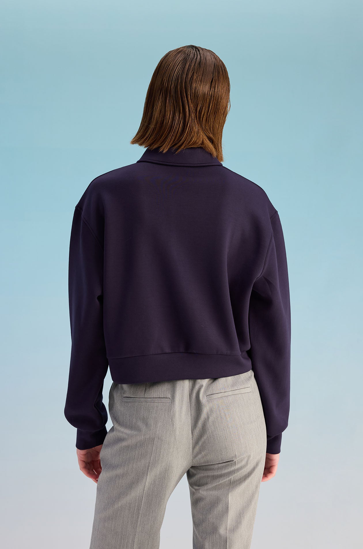 Pullover sweatshirt in double jersey. Boxy silhouette with polo collar and embroidery at the chest. Half button closure. Available in navy and grey.