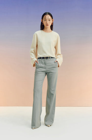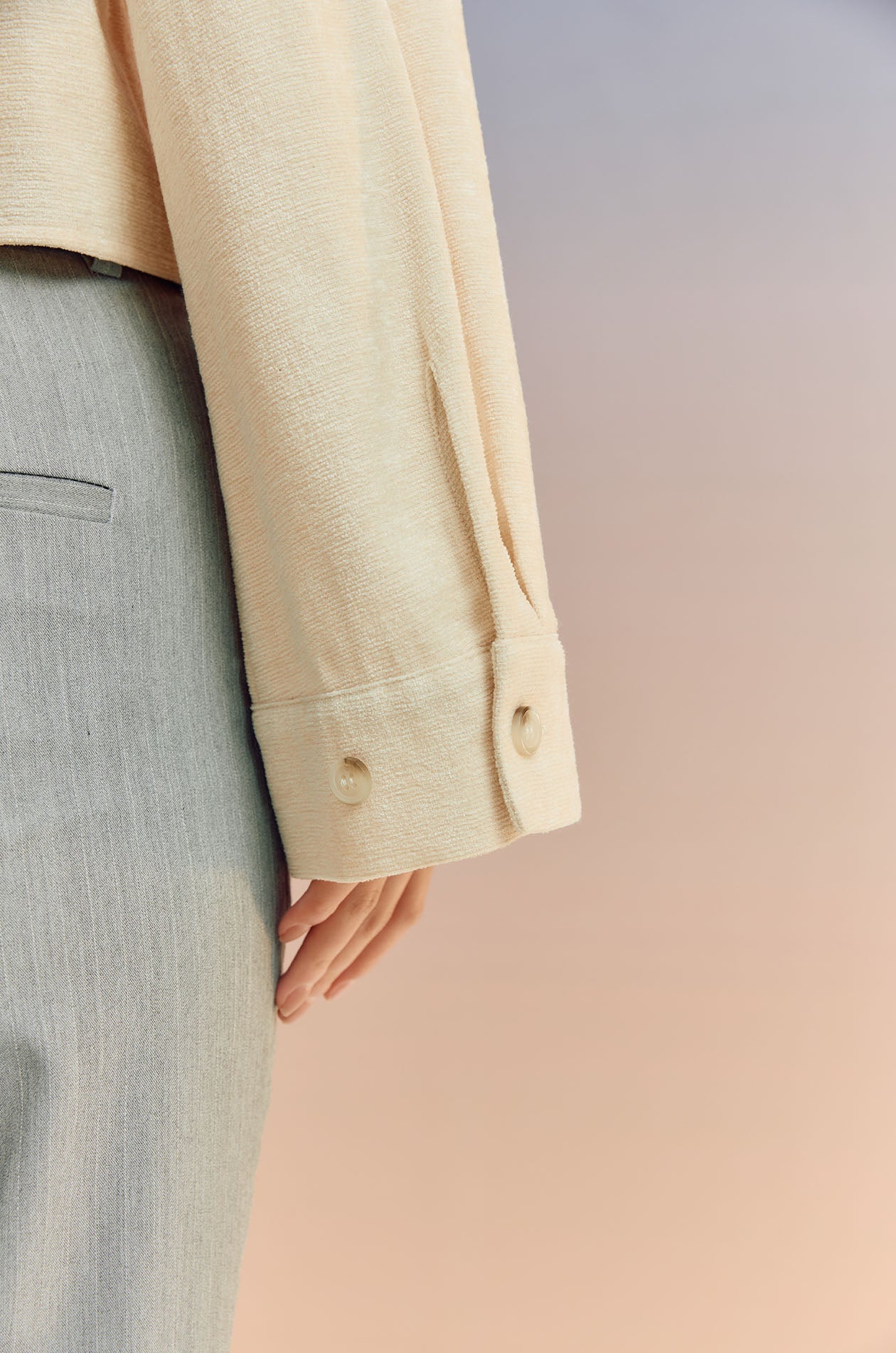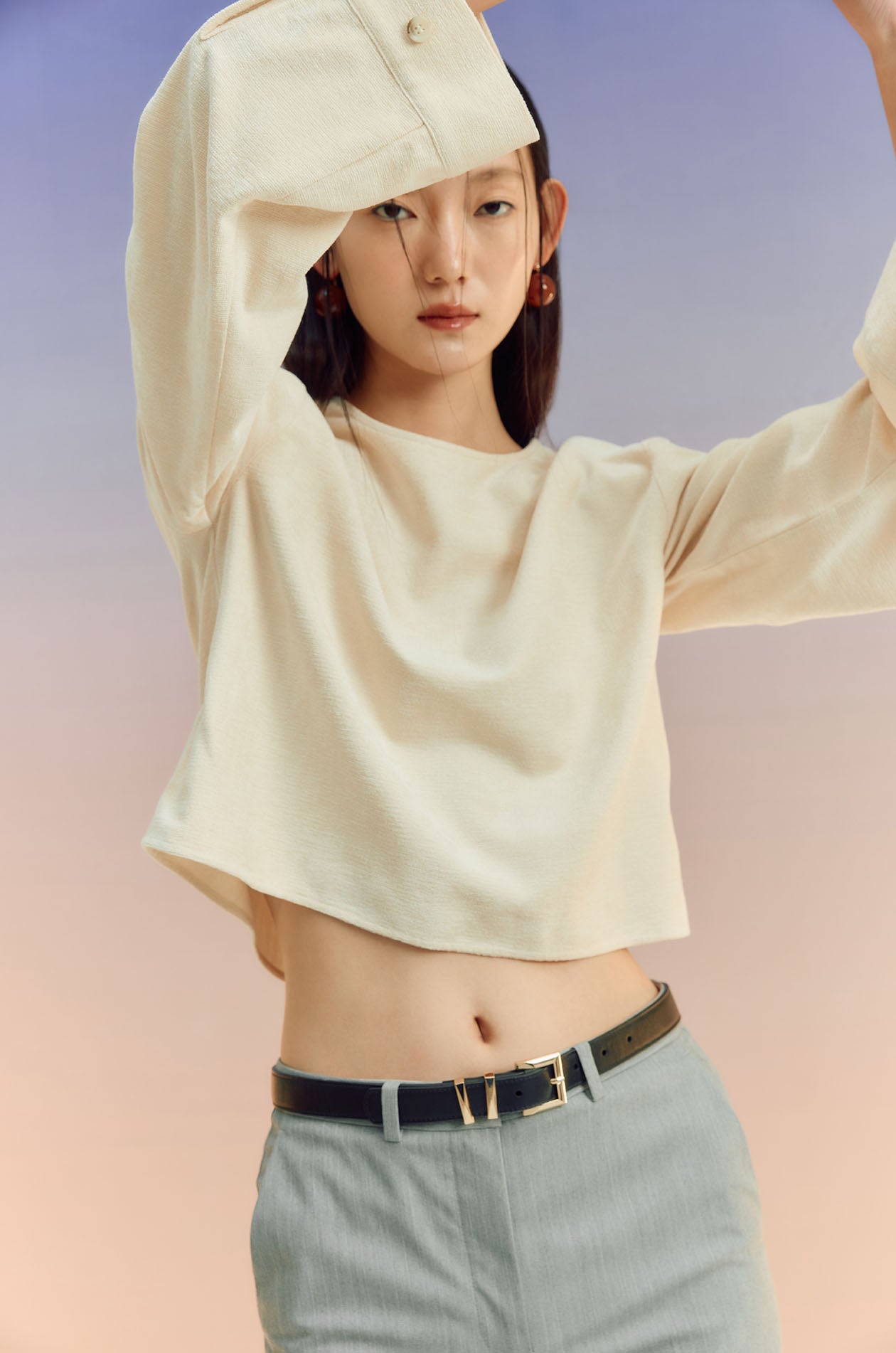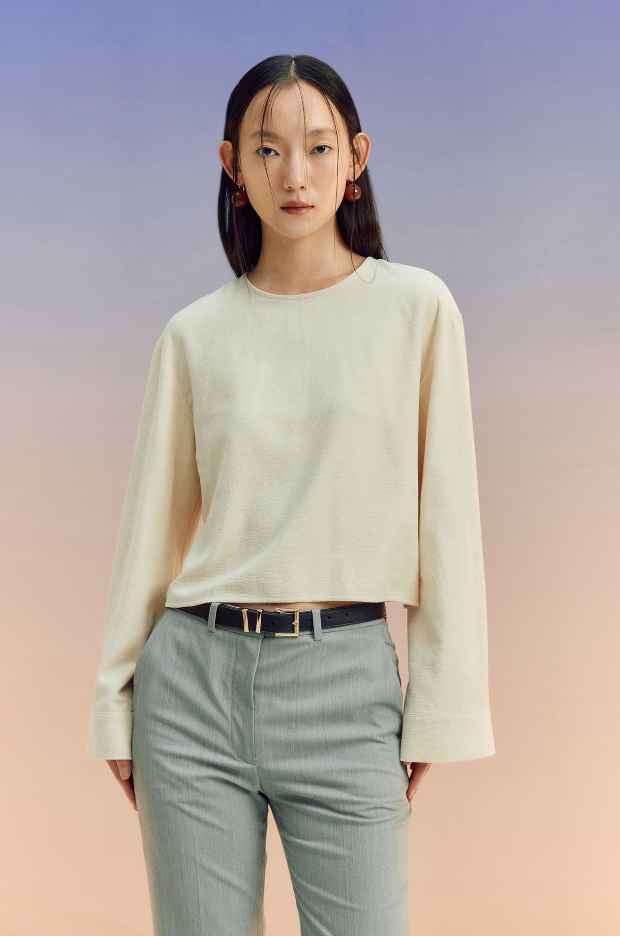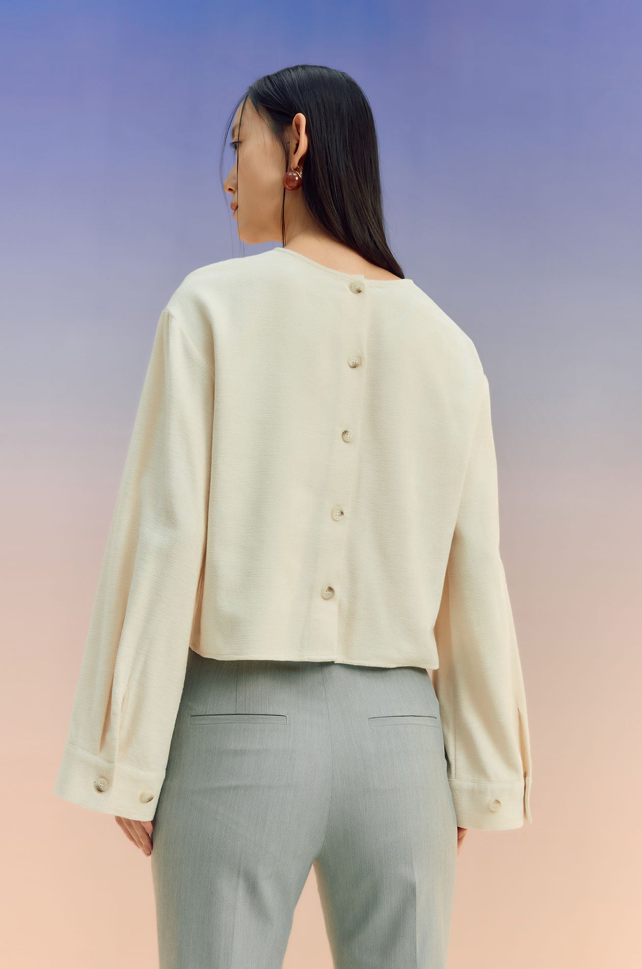 Long-sleeved boxy top in micro corduroy. Oversize fit with backward design, round neck, and wide sleeves. Back button closure. Available in beige.
