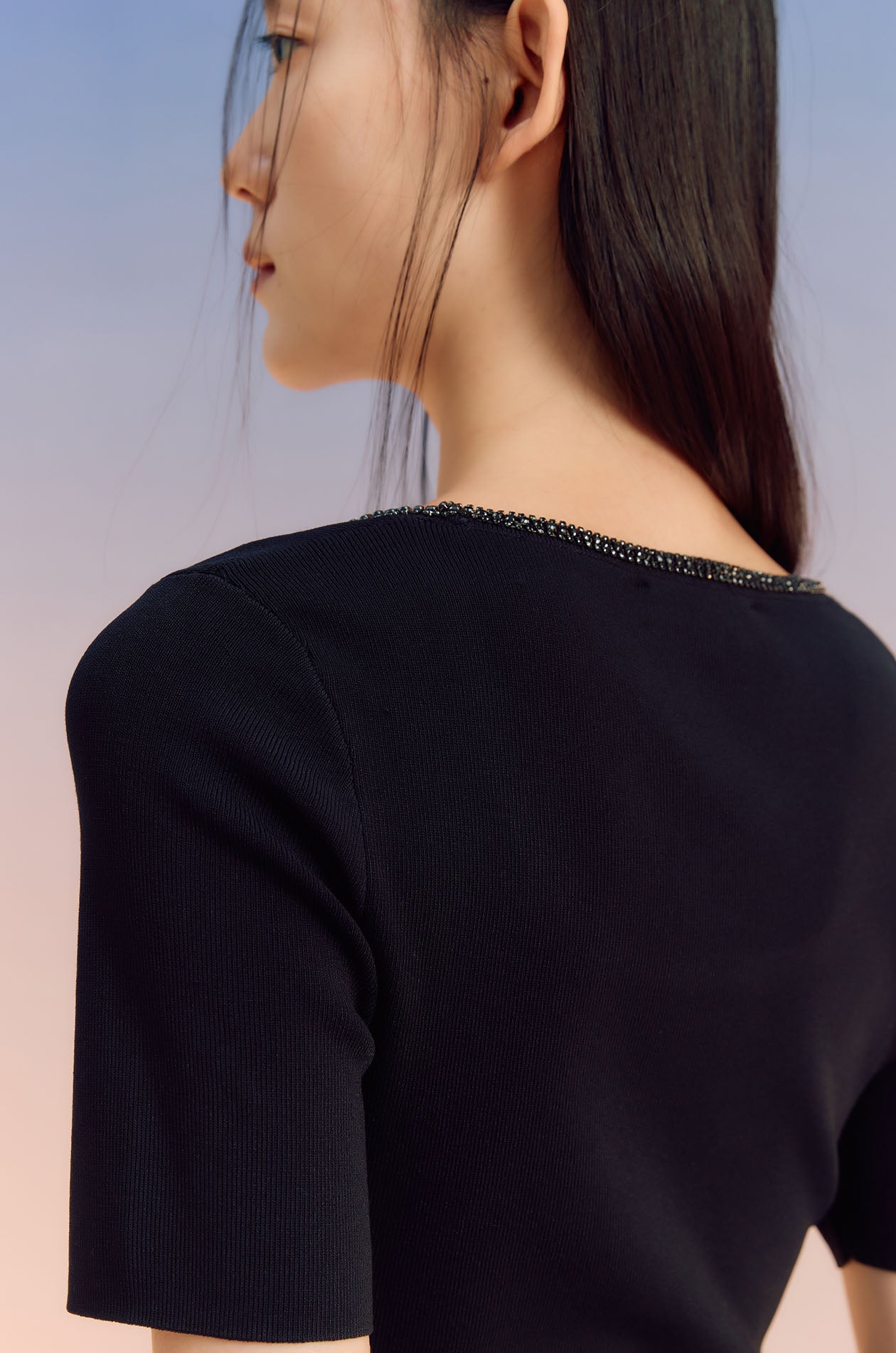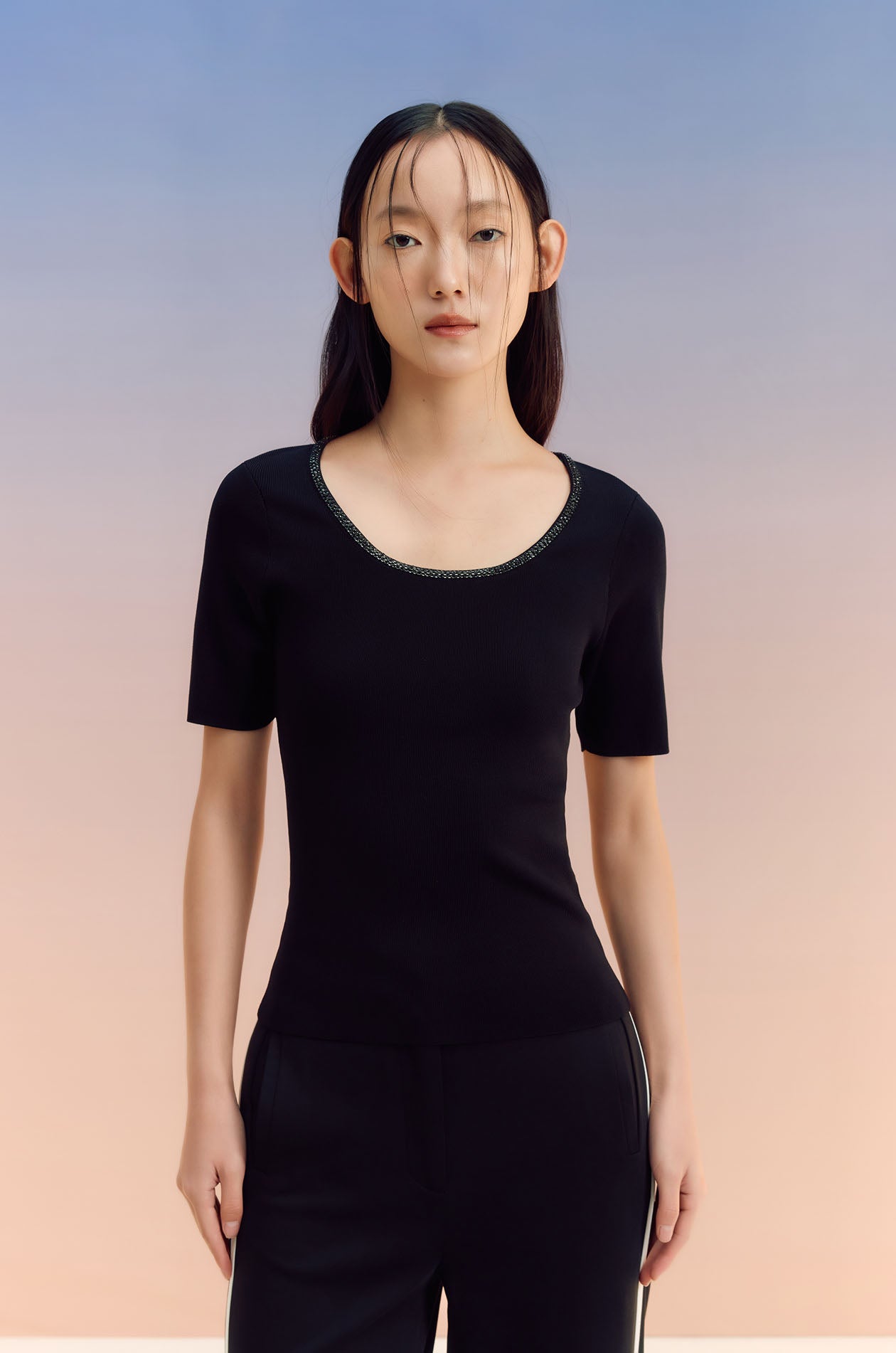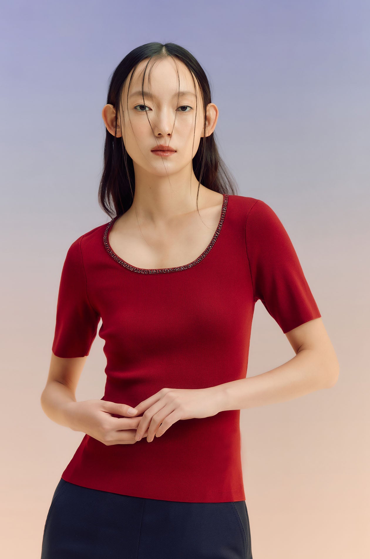 Short-sleeved top in knit fabric. Fitted silhouette with round neck and rhinestone embellishment around neckline. Available in black and red.