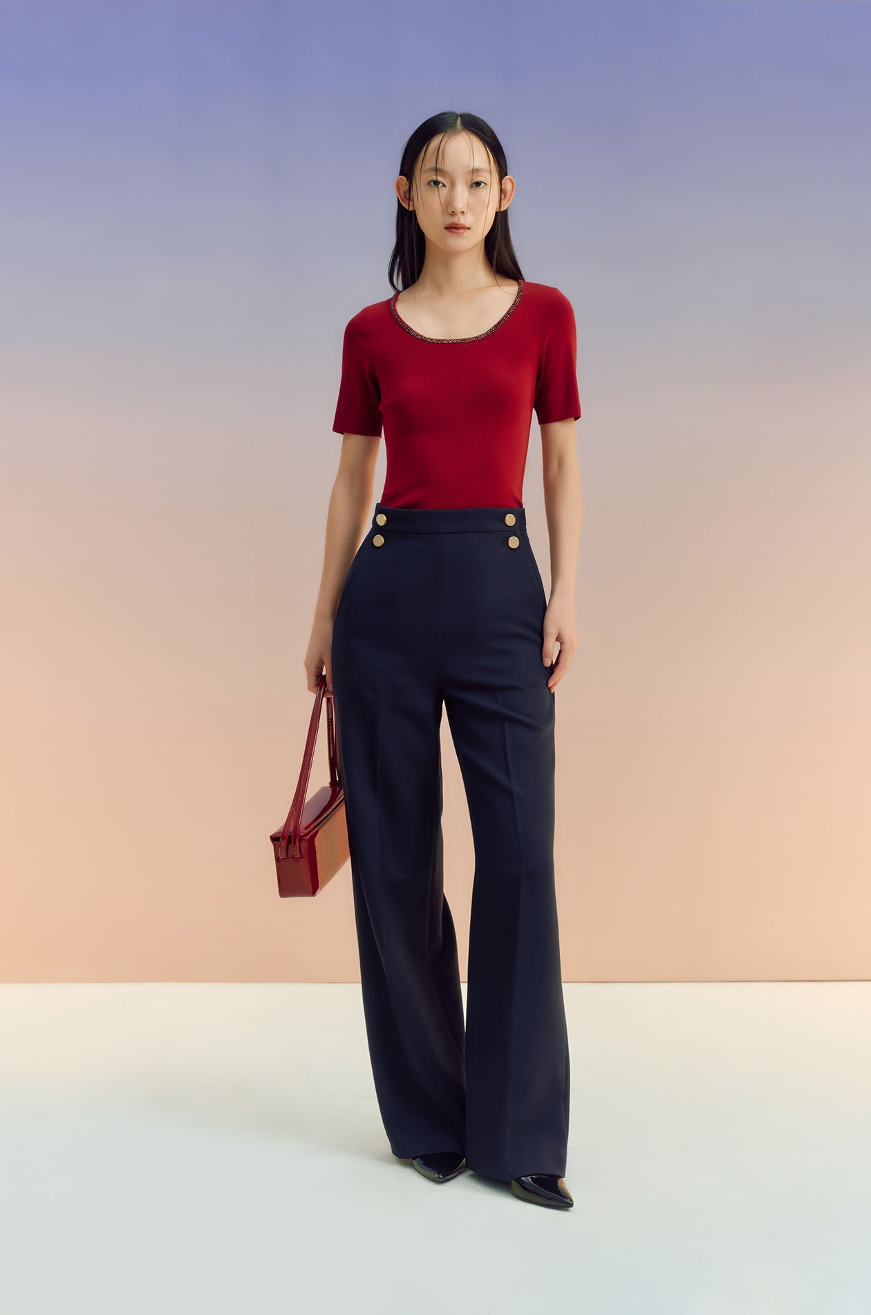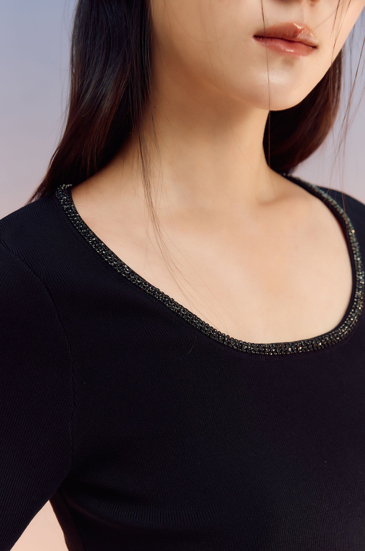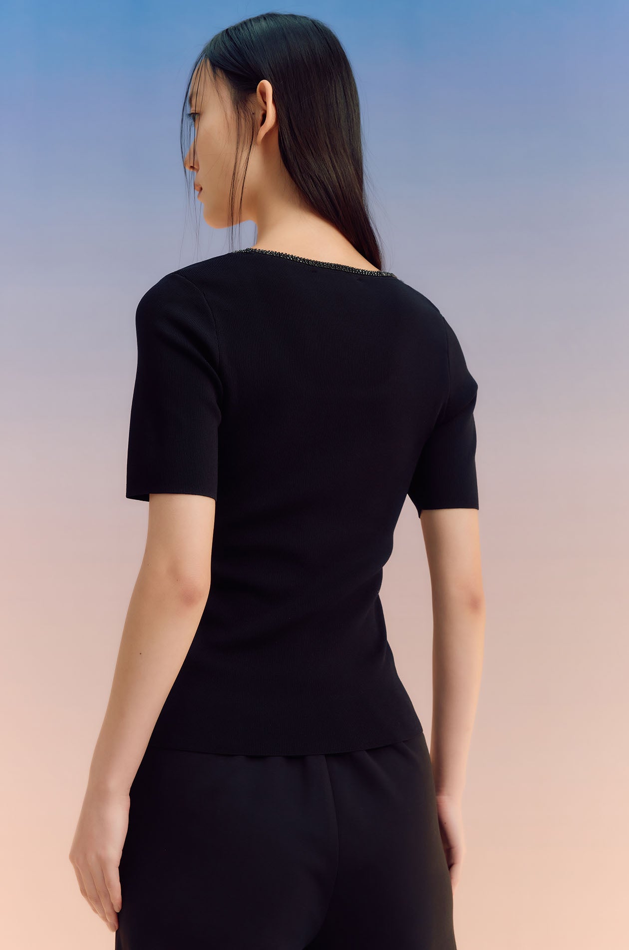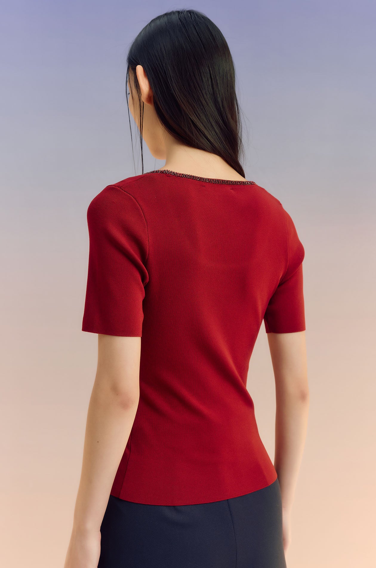 Short-sleeved top in knit fabric. Fitted silhouette with round neck and rhinestone embellishment around neckline. Available in black and red.