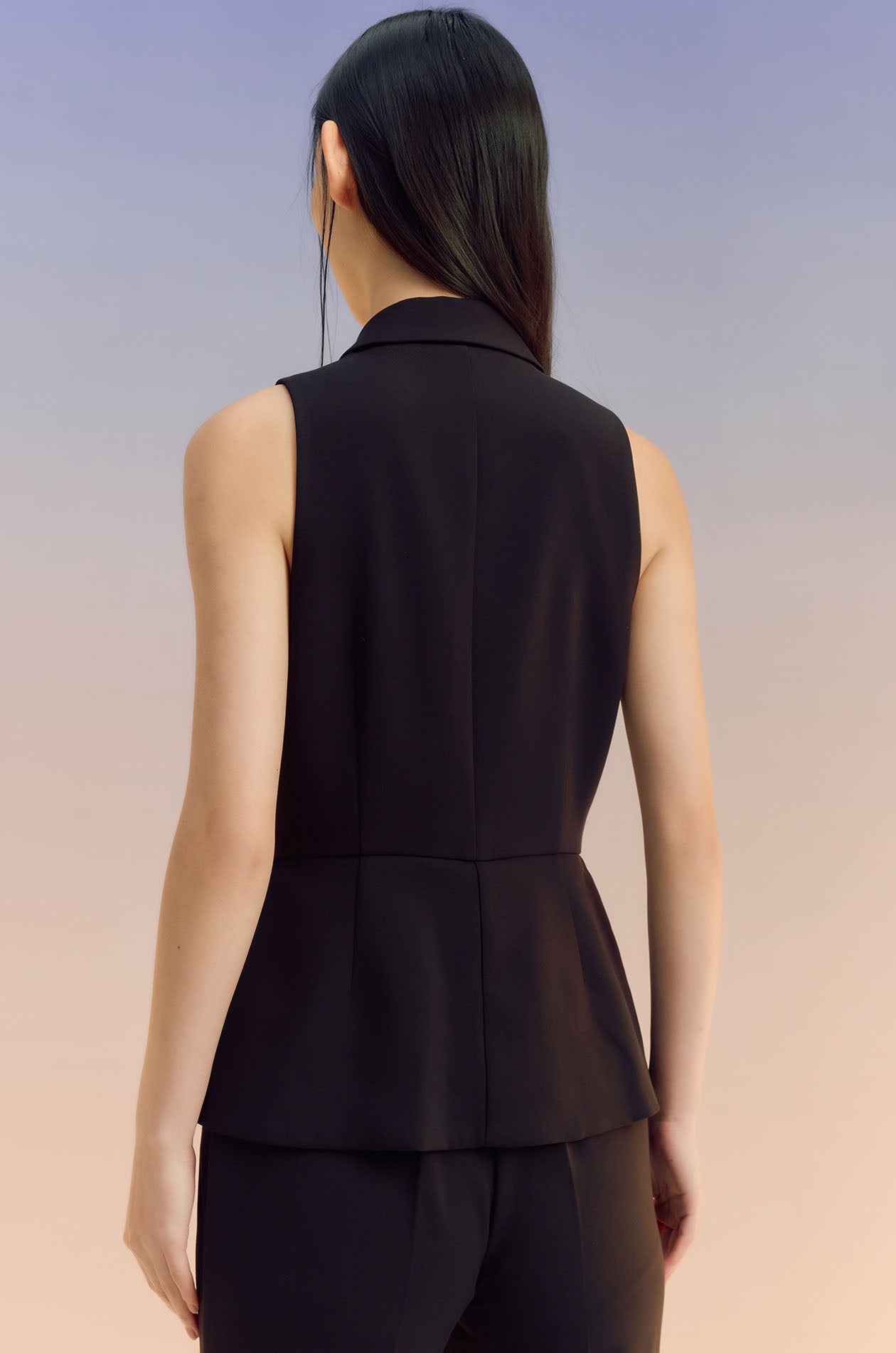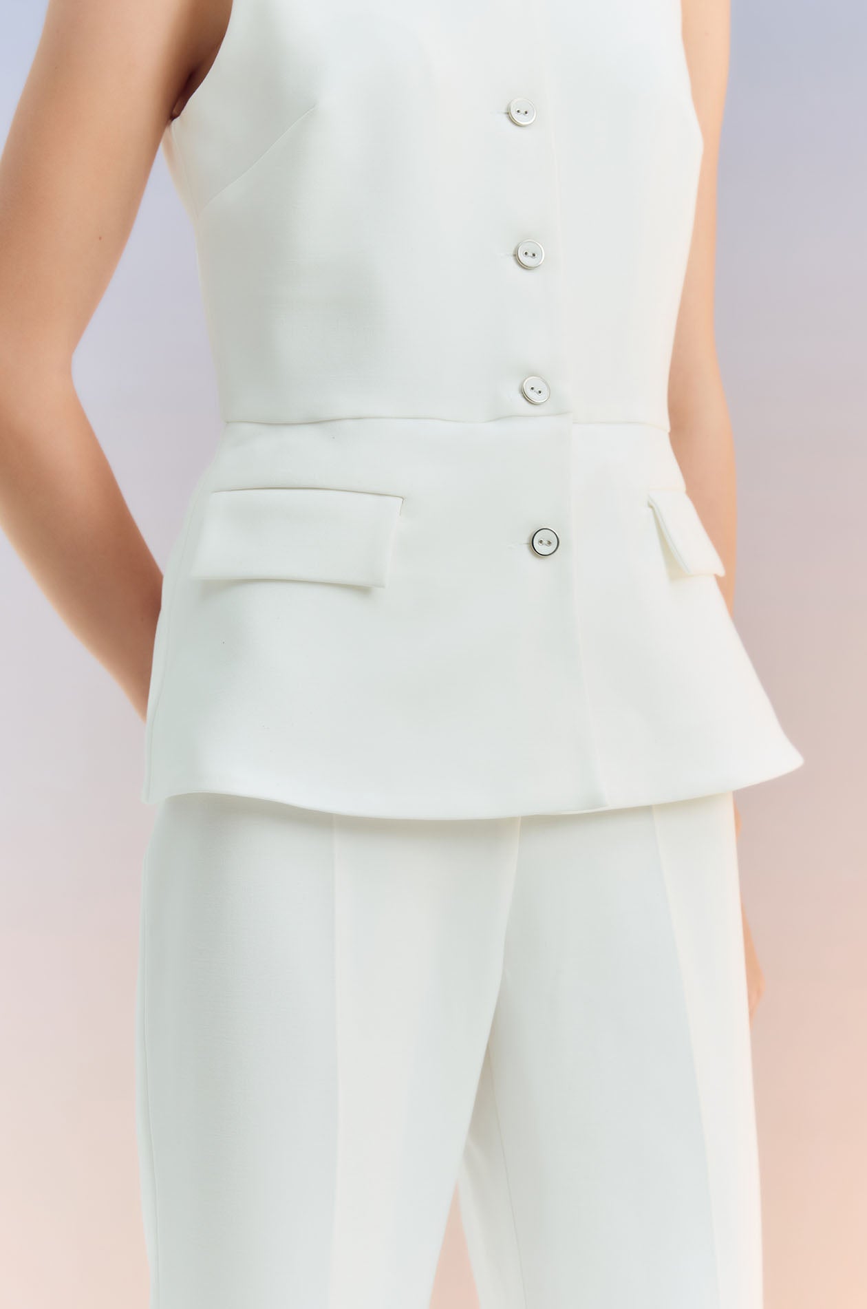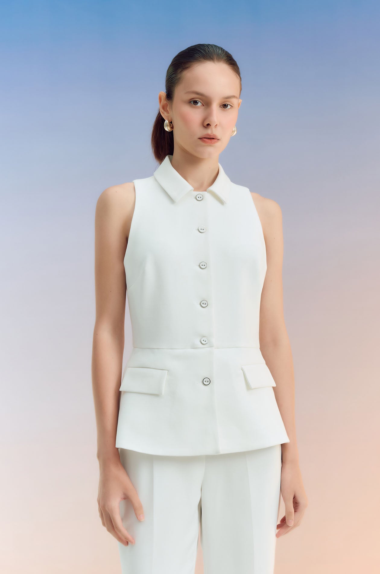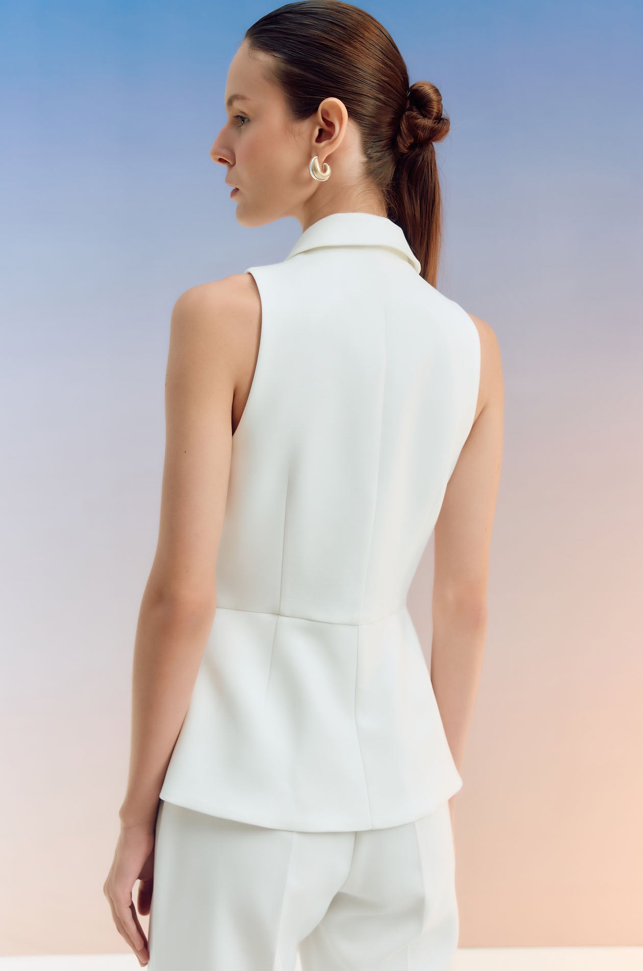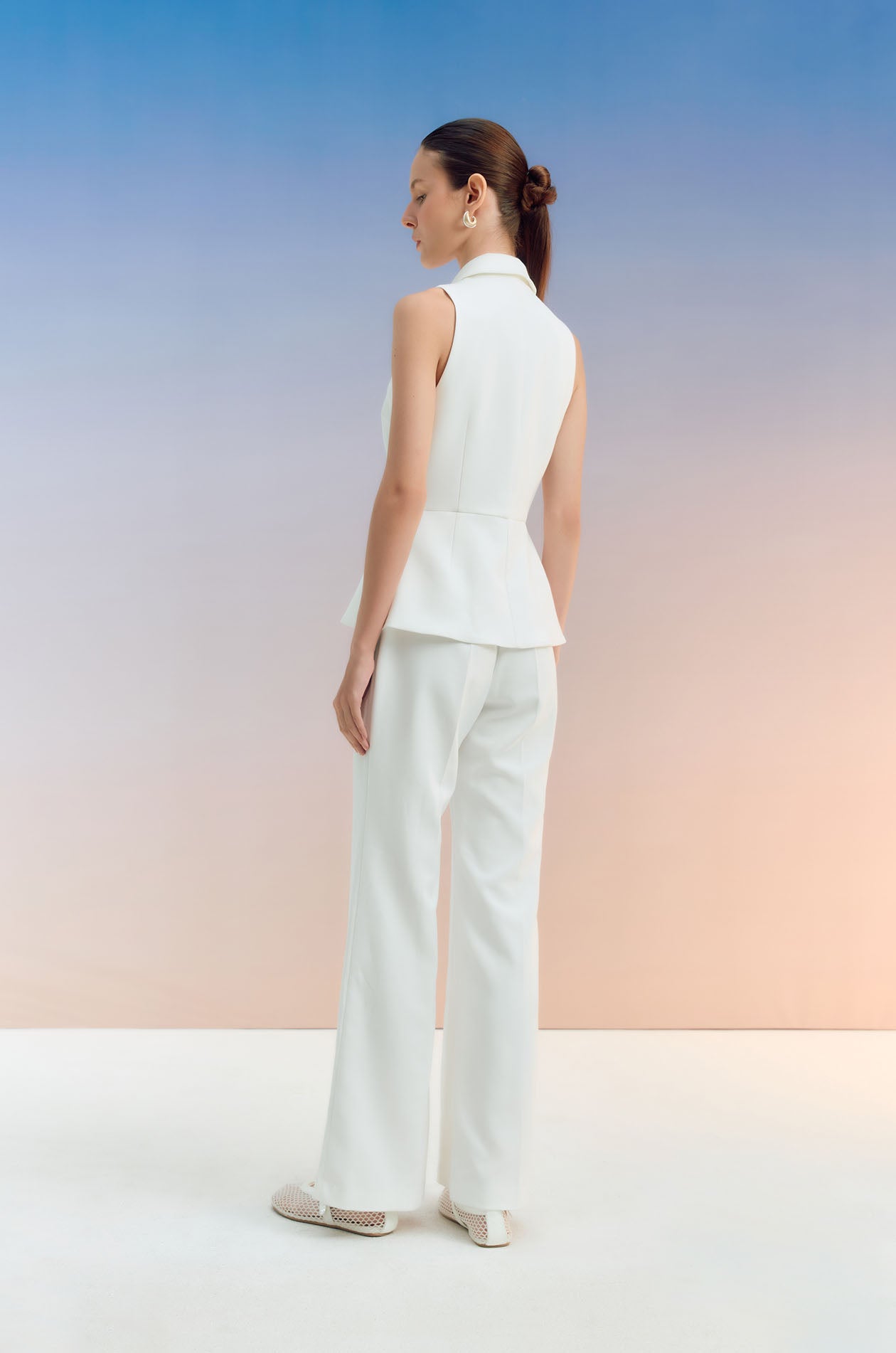 Sleeveless jumpsuit in terry rayon. Peak collar, faux pockets, and flare pants. Front button and zip closure. Available in black and off-white.