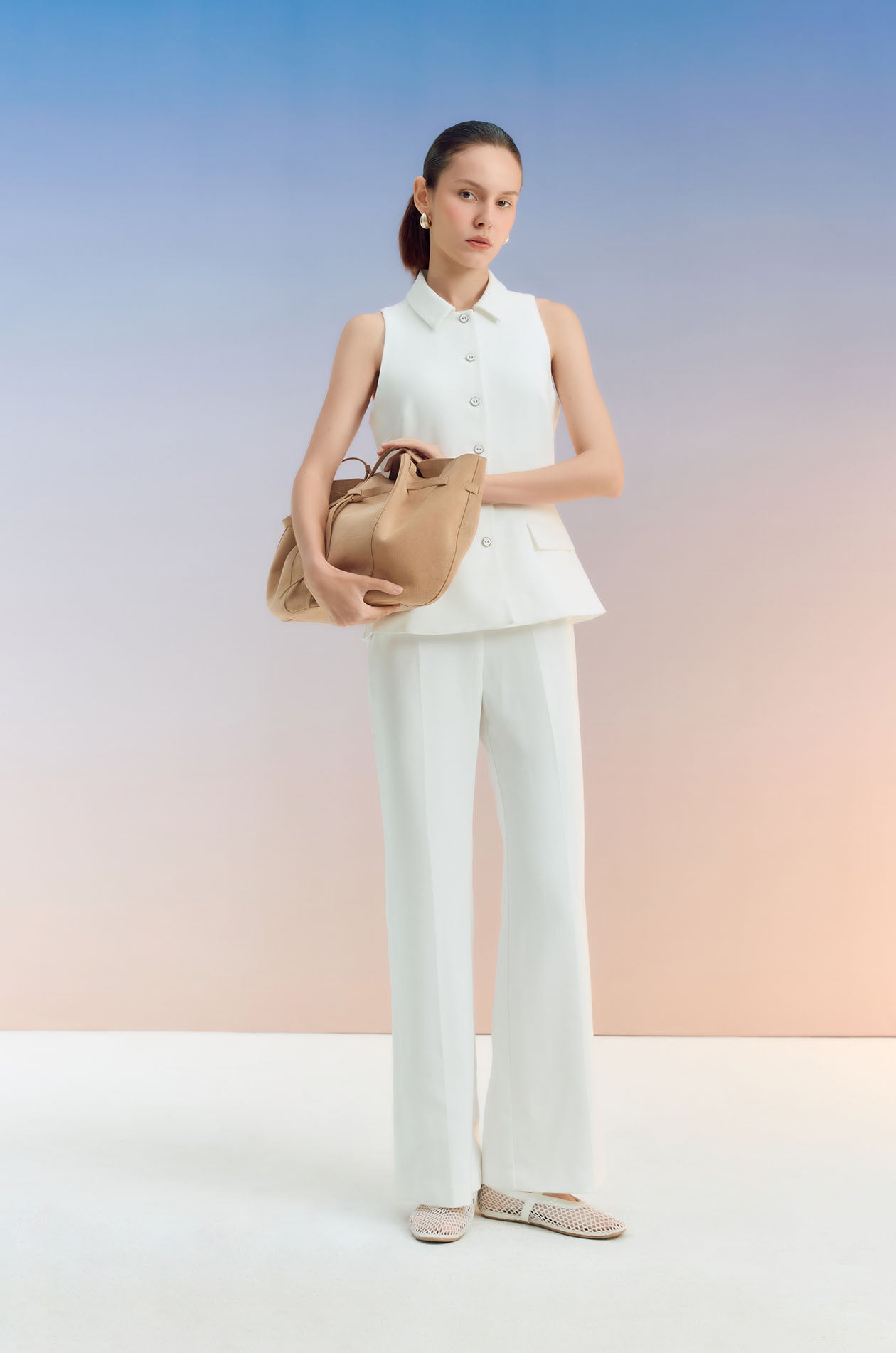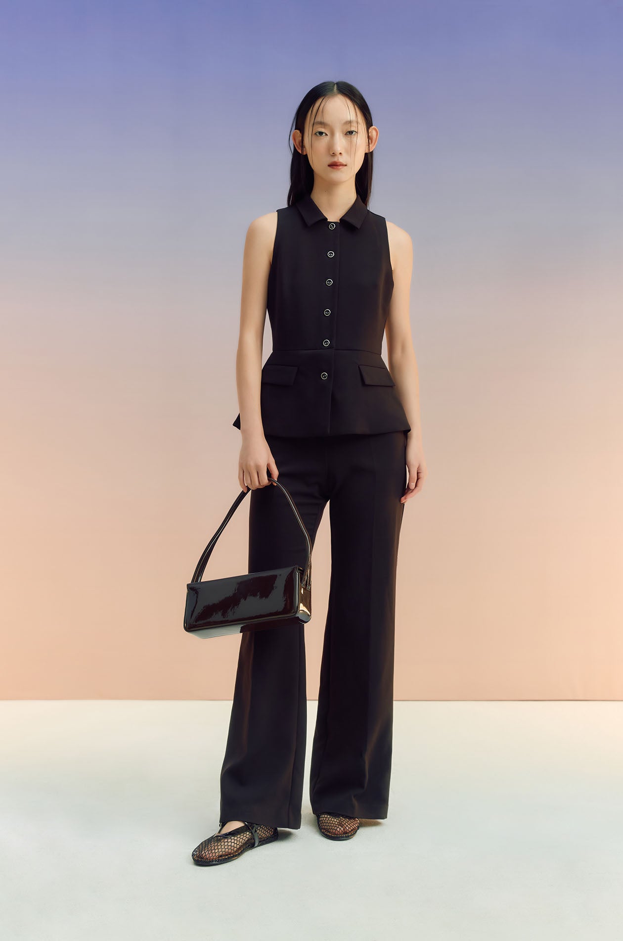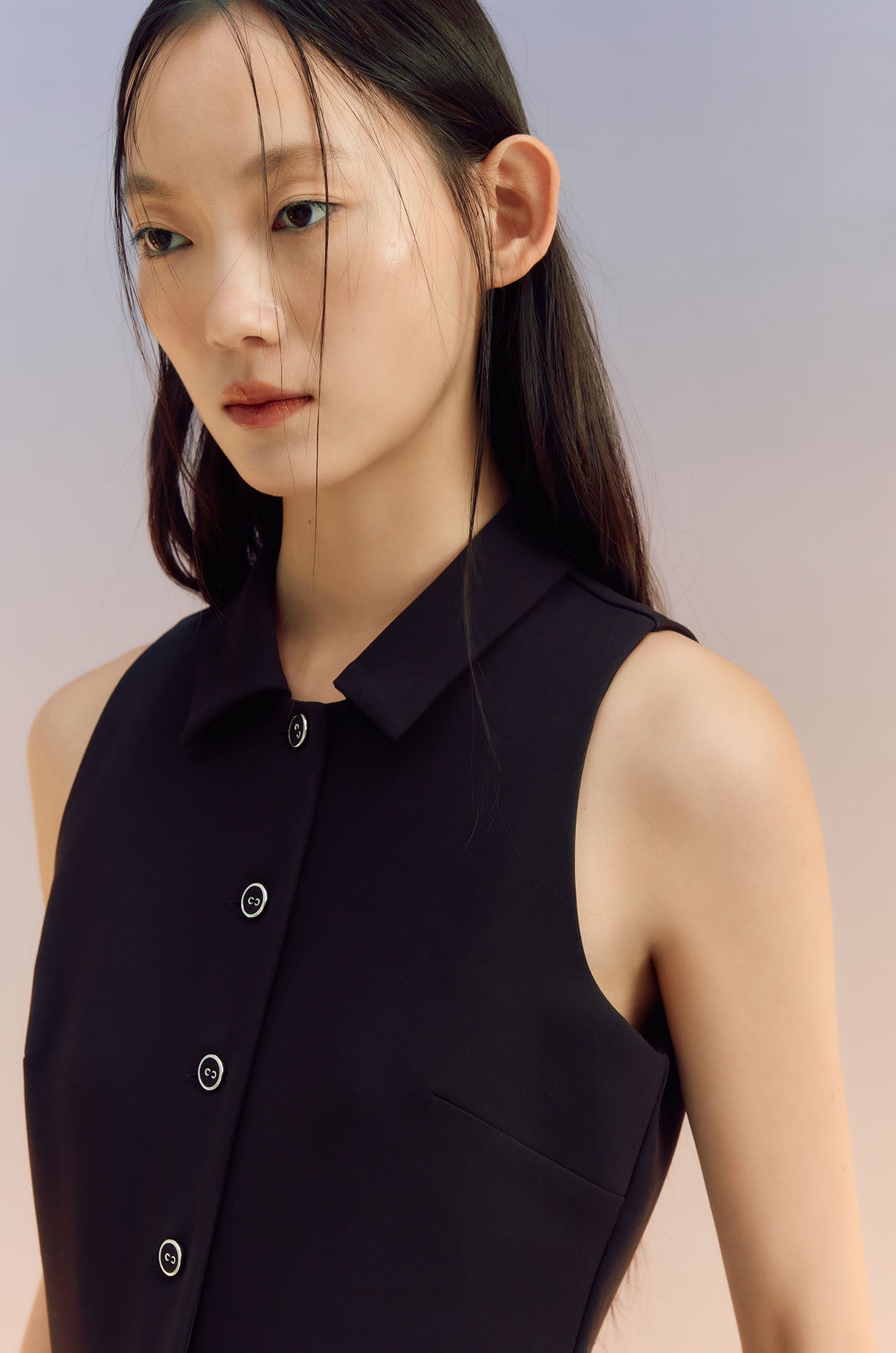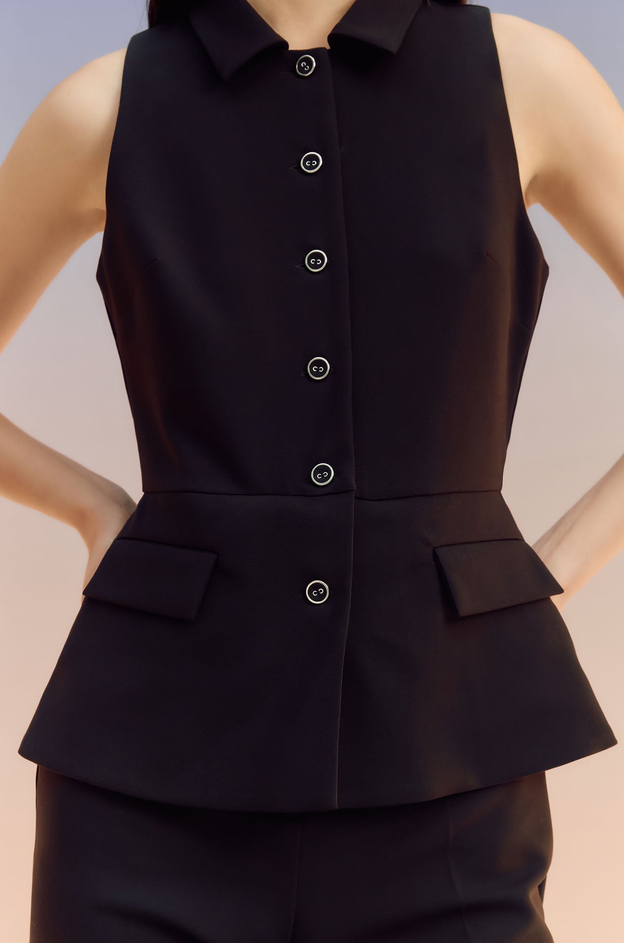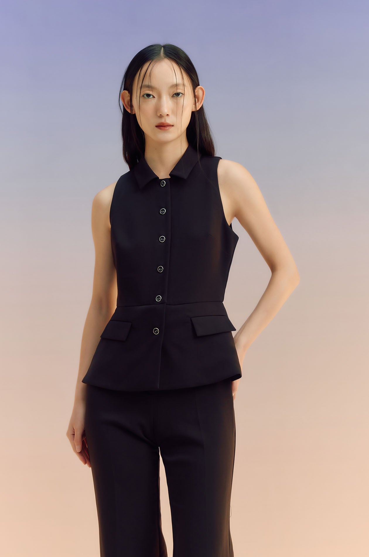 Sleeveless jumpsuit in terry rayon. Peak collar, faux pockets, and flare pants. Front button and zip closure. Available in black and off-white.
