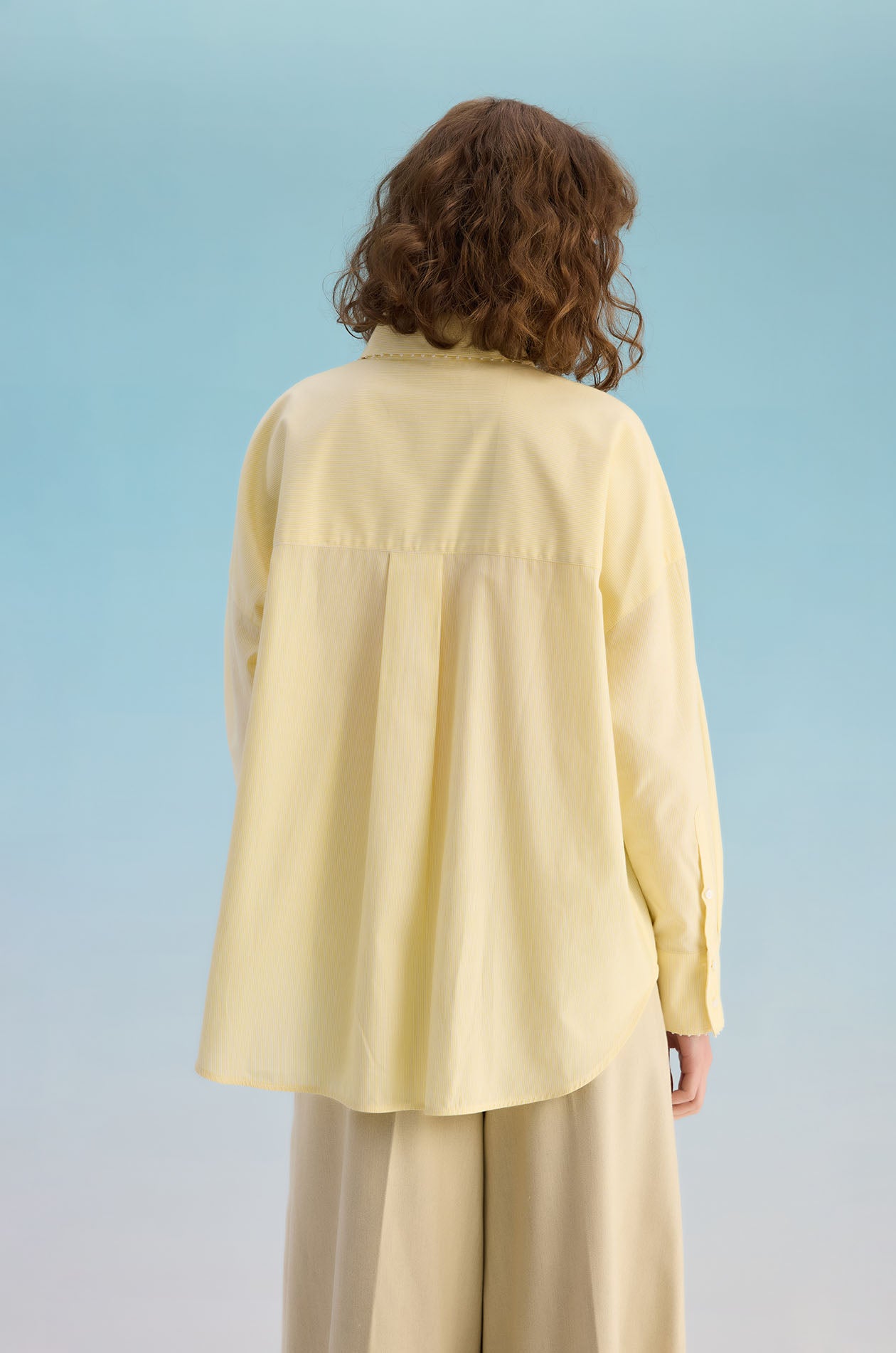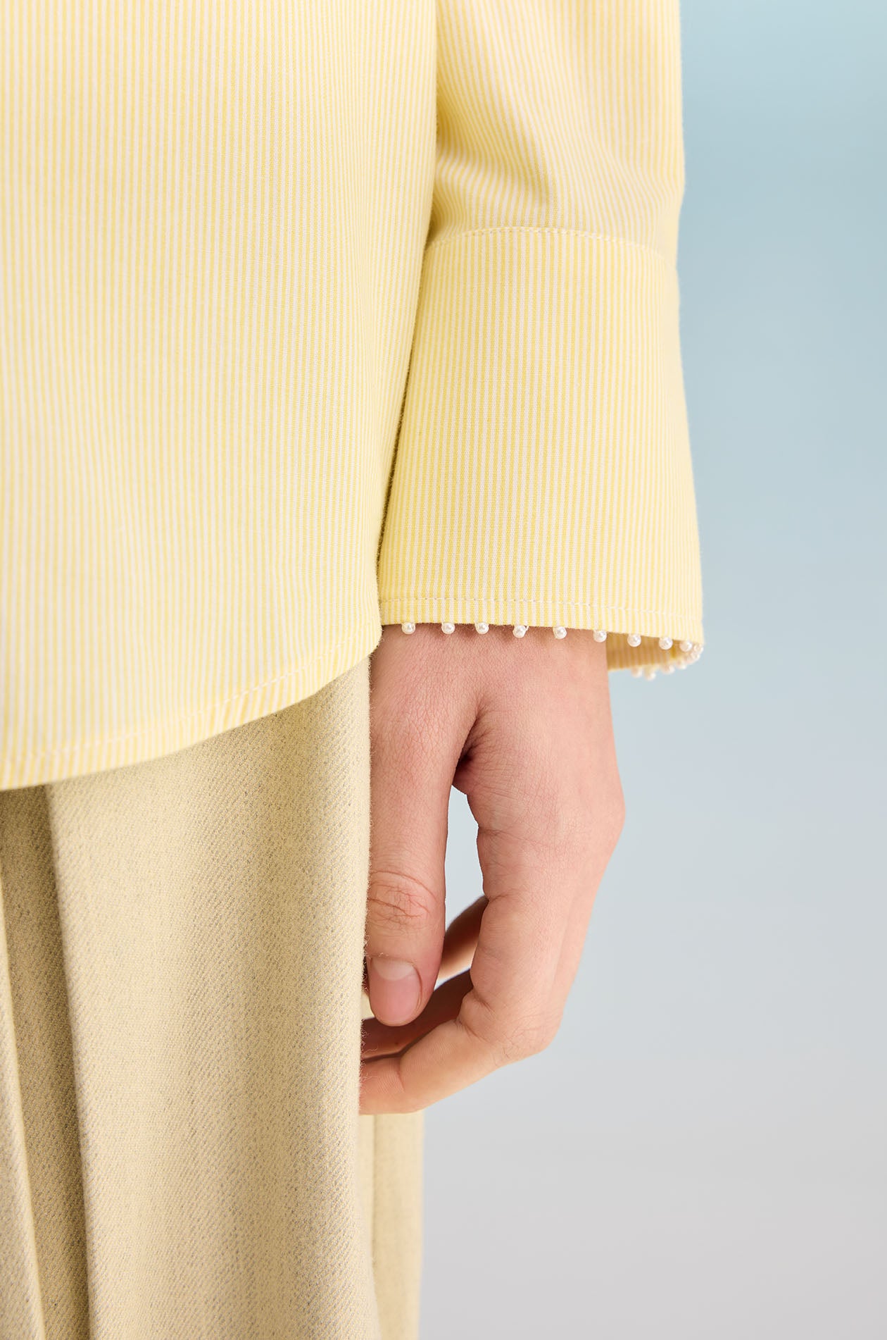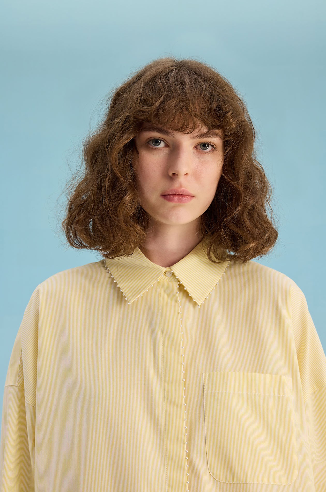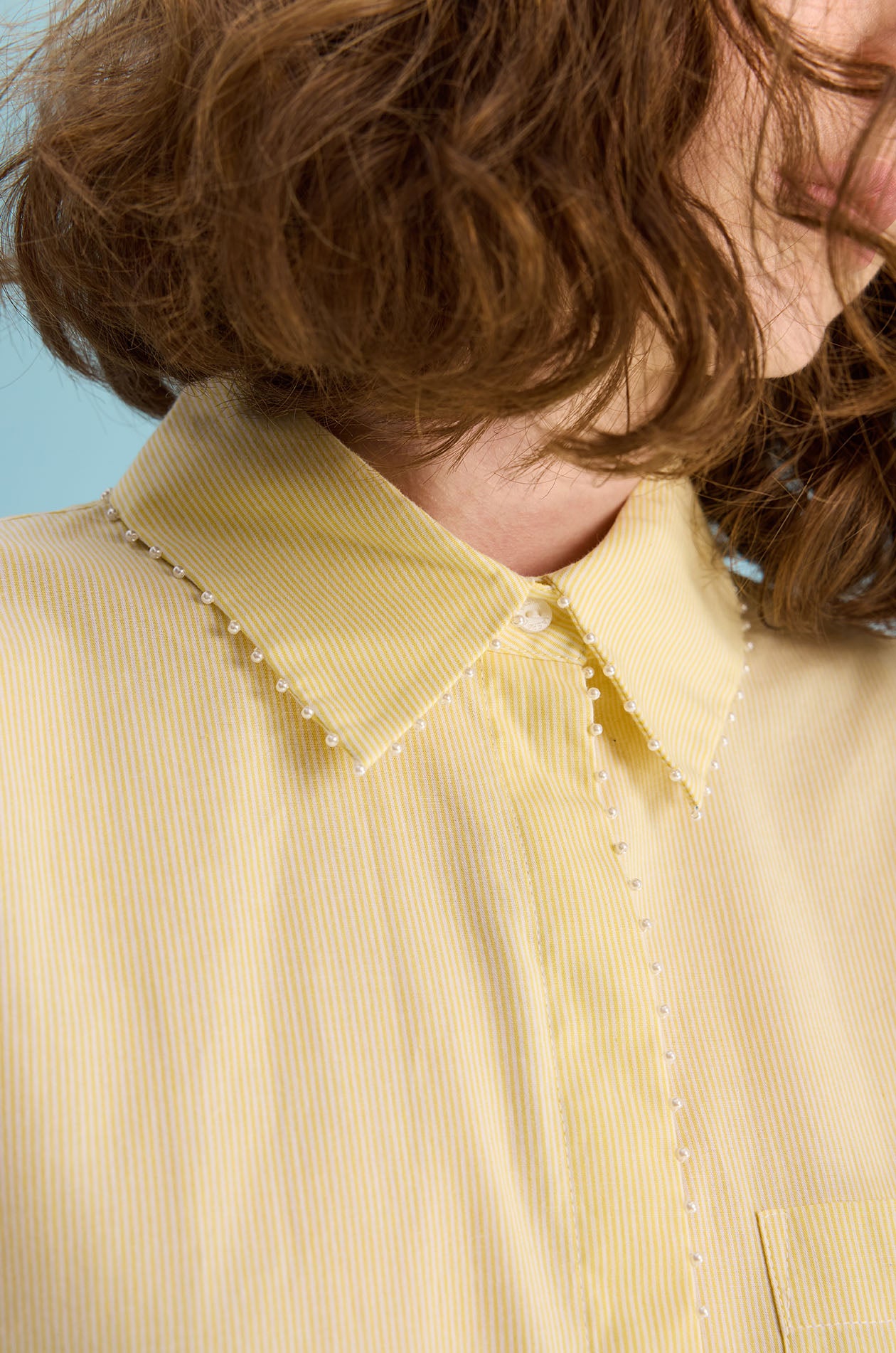 Long-sleeved shirt in cotton poplin. Oversize fit with classic collar, chest pocket, and oversized cuffs. Pearl bead embellishment. Front button closure. Available in striped yellow and white.