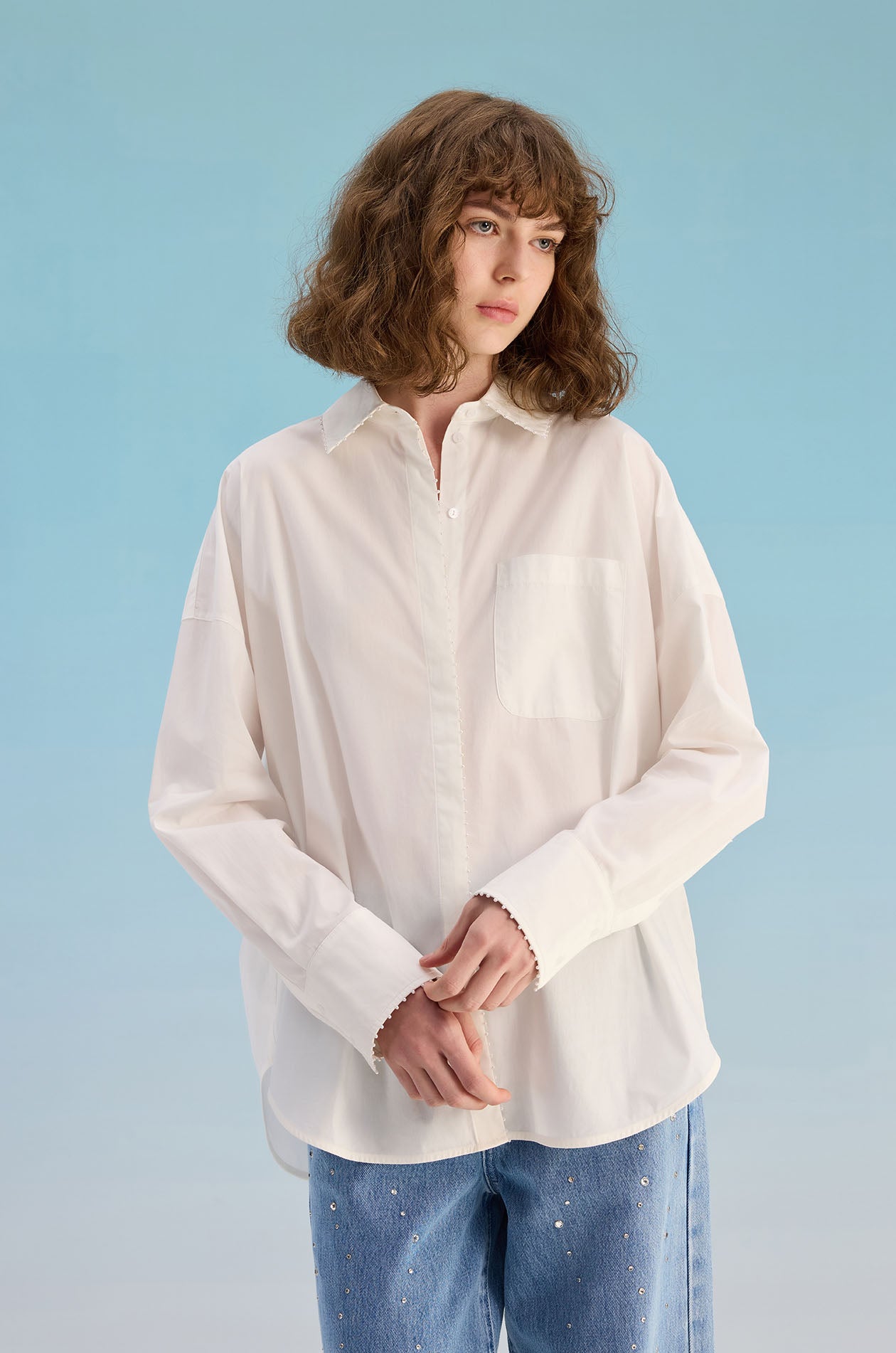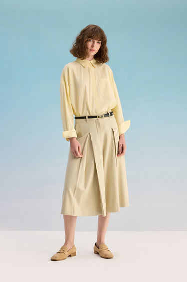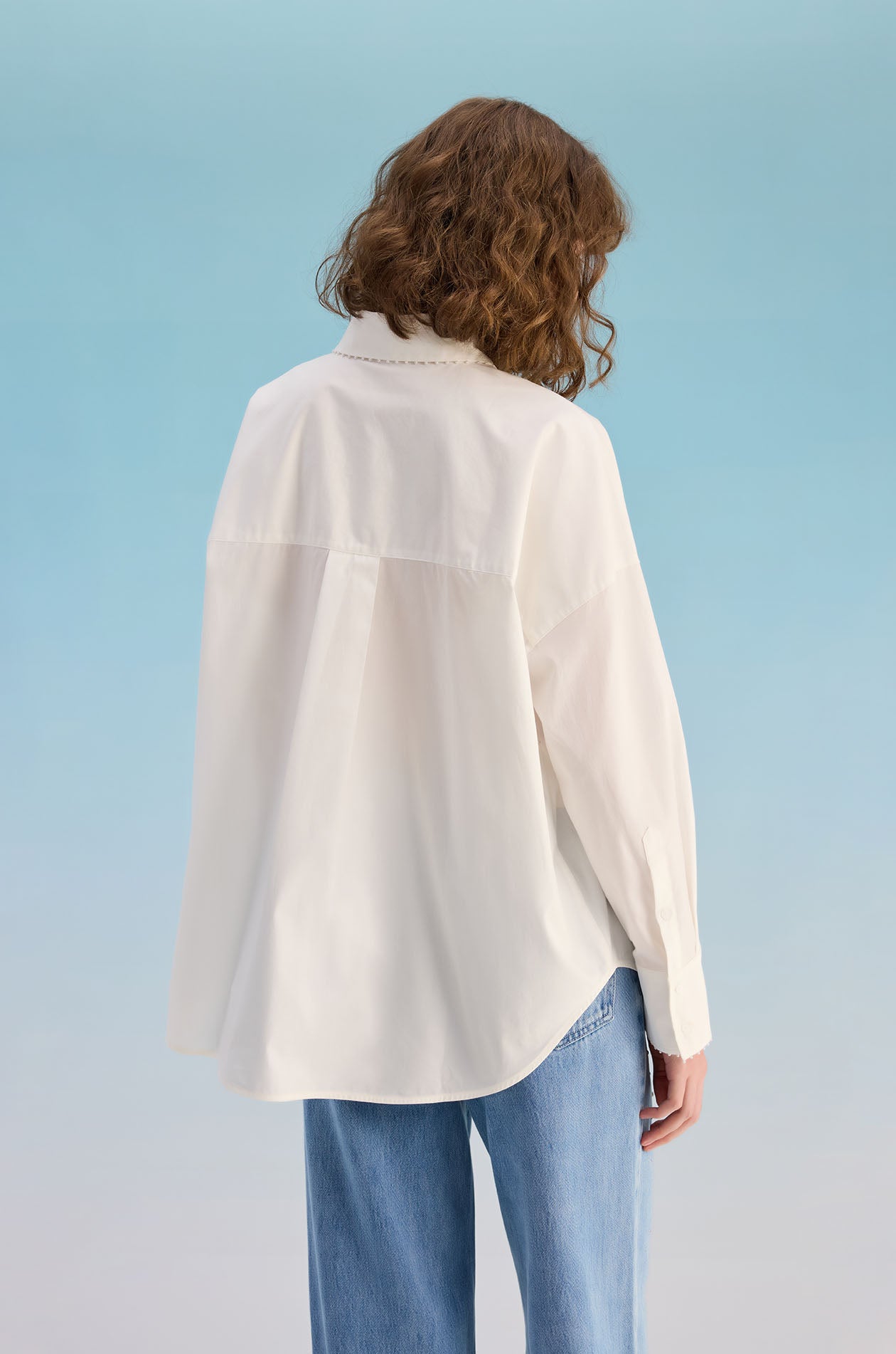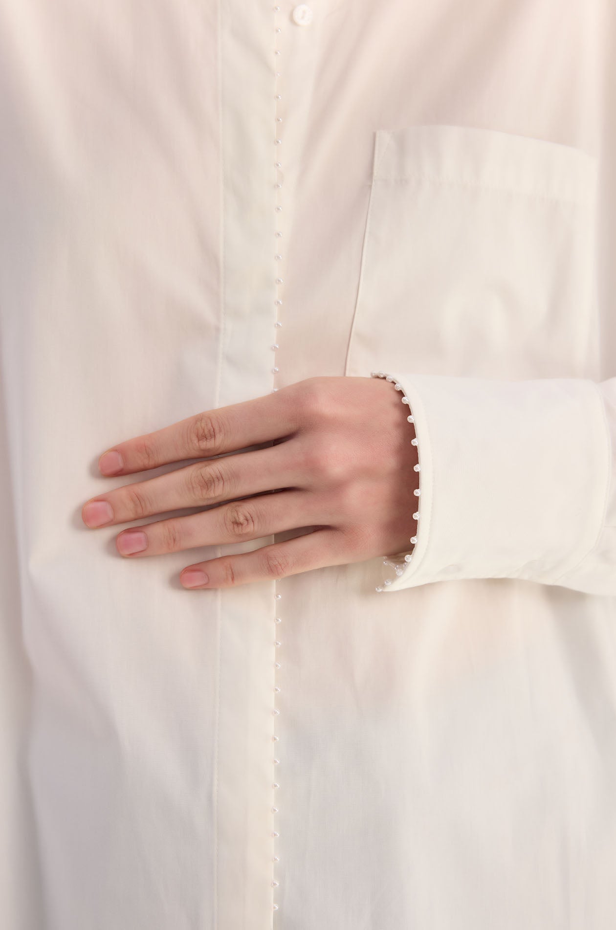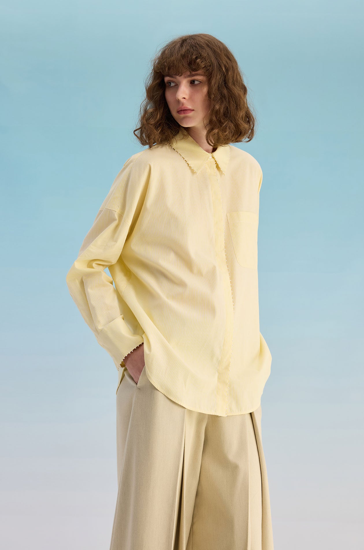 Long-sleeved shirt in cotton poplin. Oversize fit with classic collar, chest pocket, and oversized cuffs. Pearl bead embellishment. Front button closure. Available in striped yellow and white.