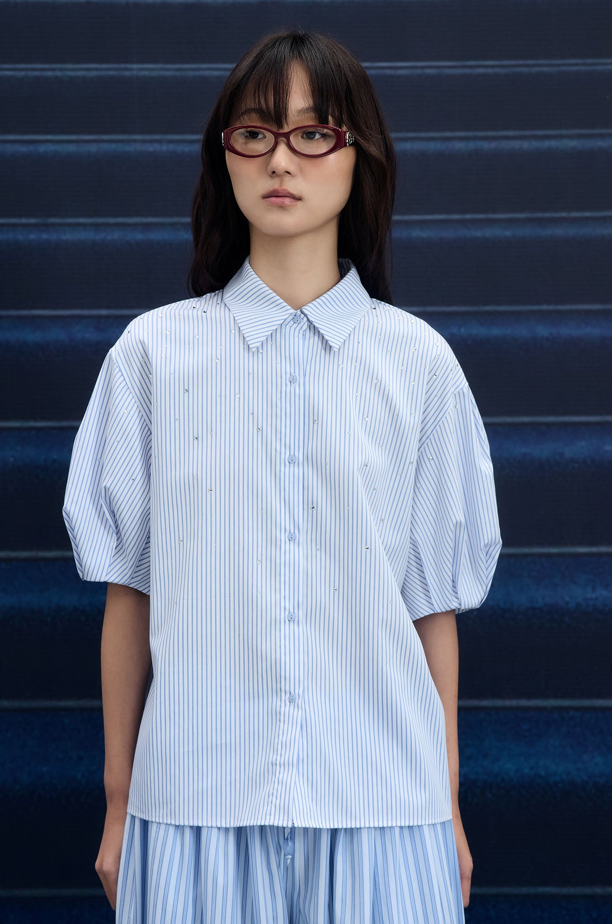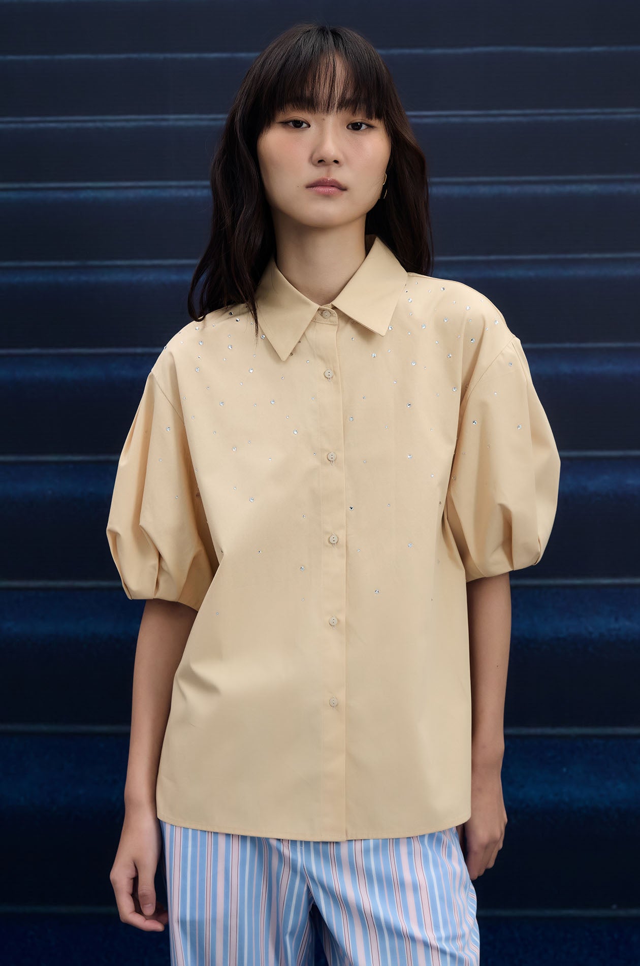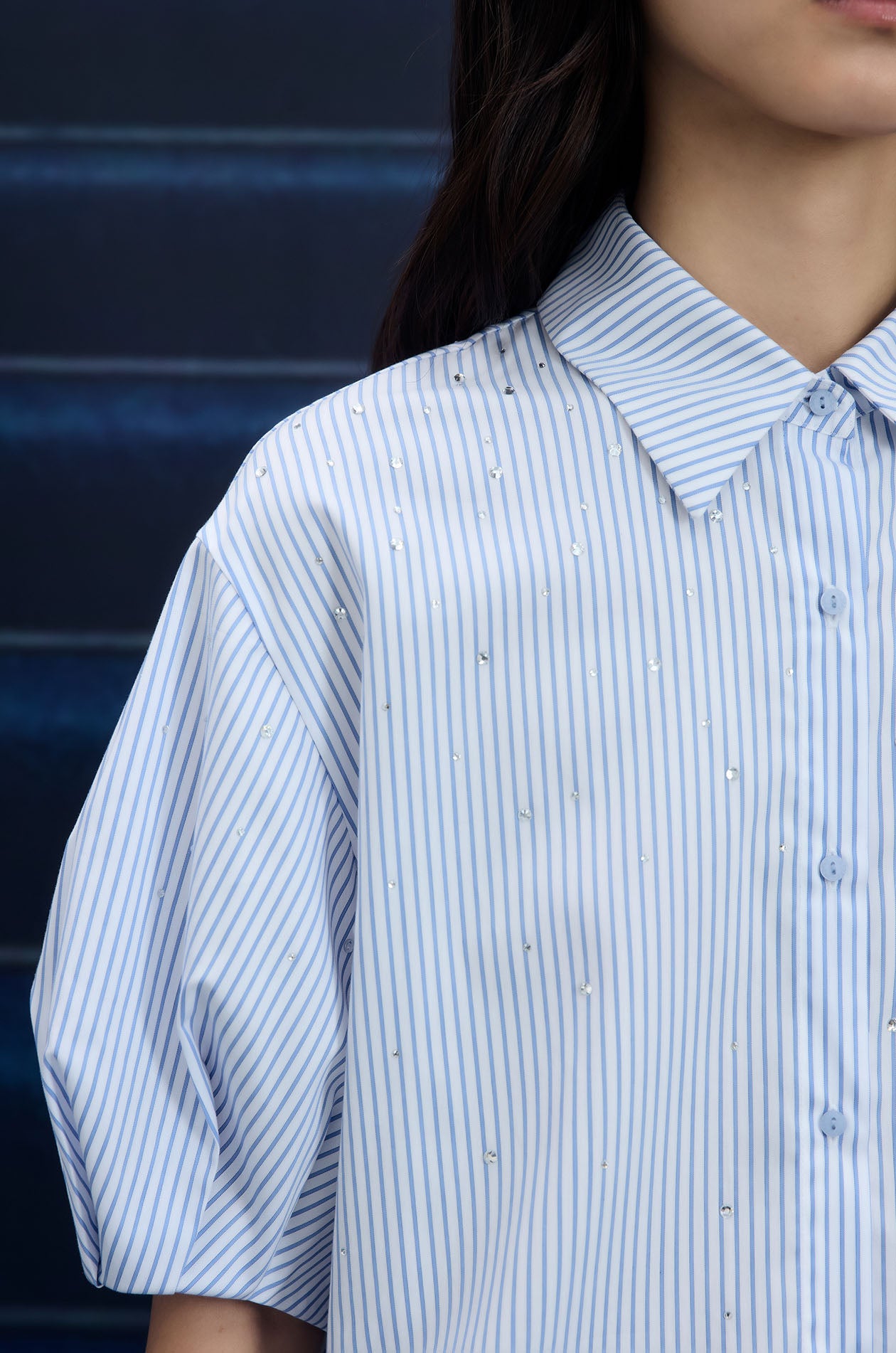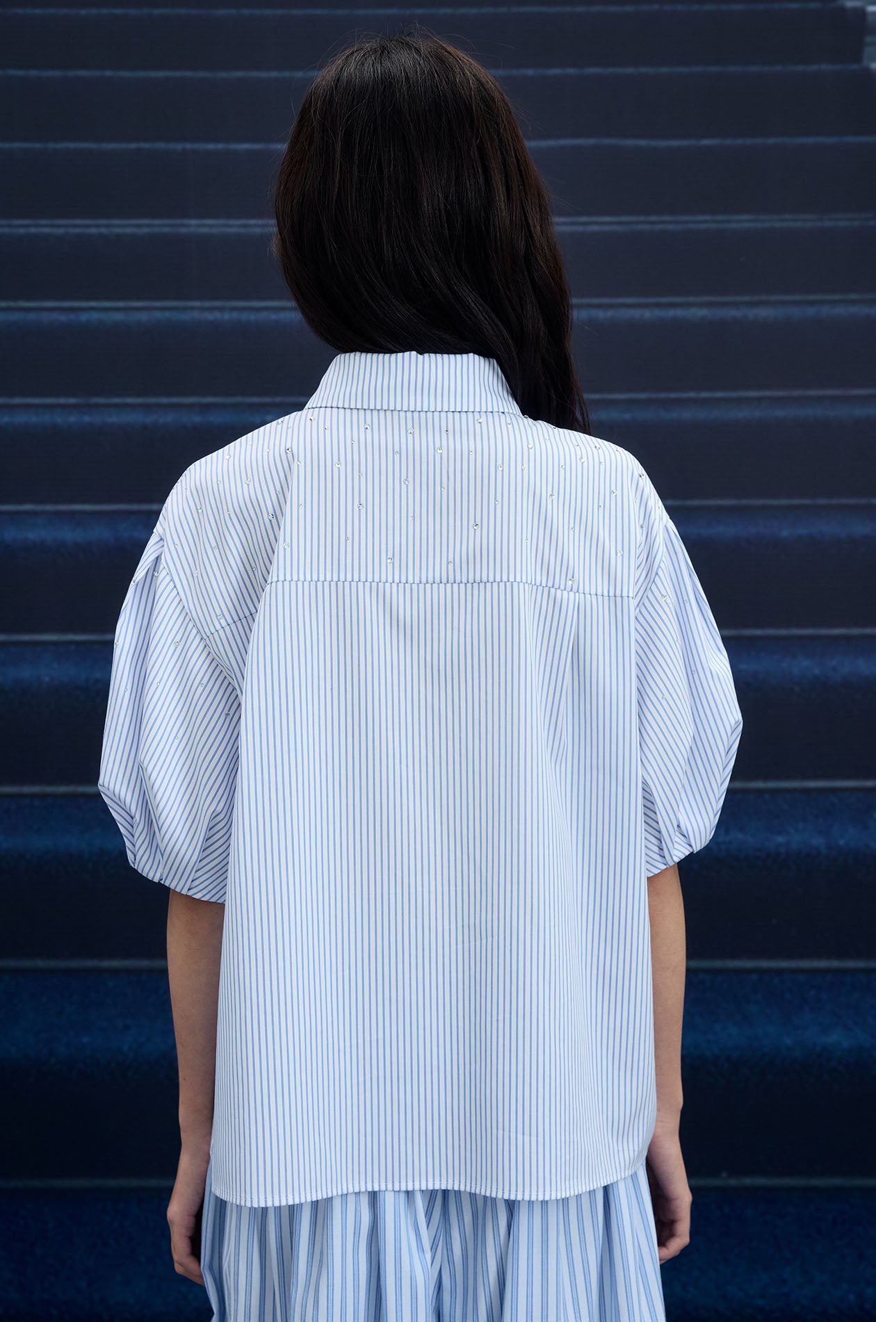 Short-puff-sleeved shirt in poplin. Accented with rhinestone on the upper part. Oversized-fit boxy silhouette with classic collar. Front button closure. Available in beige and striped blue.