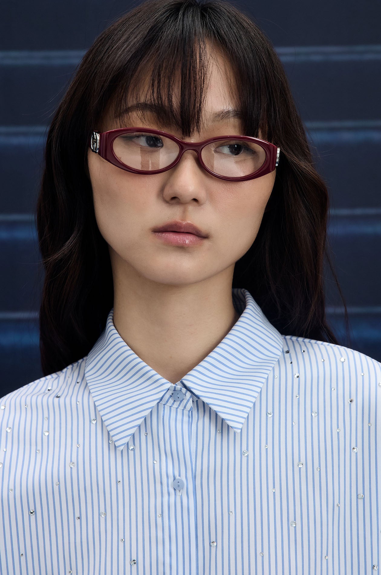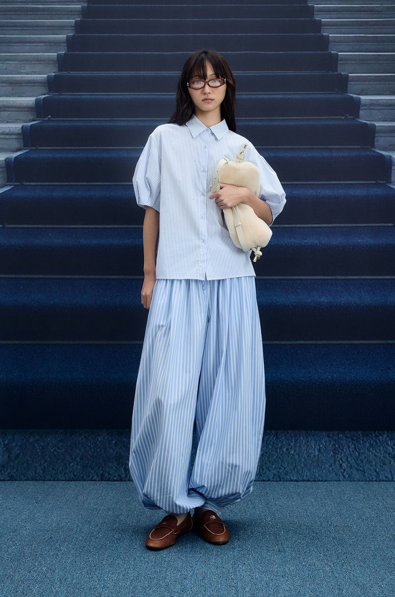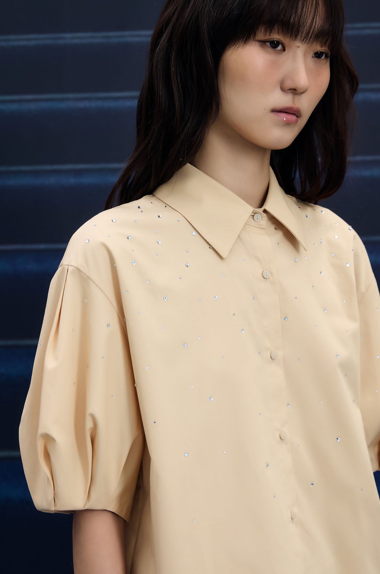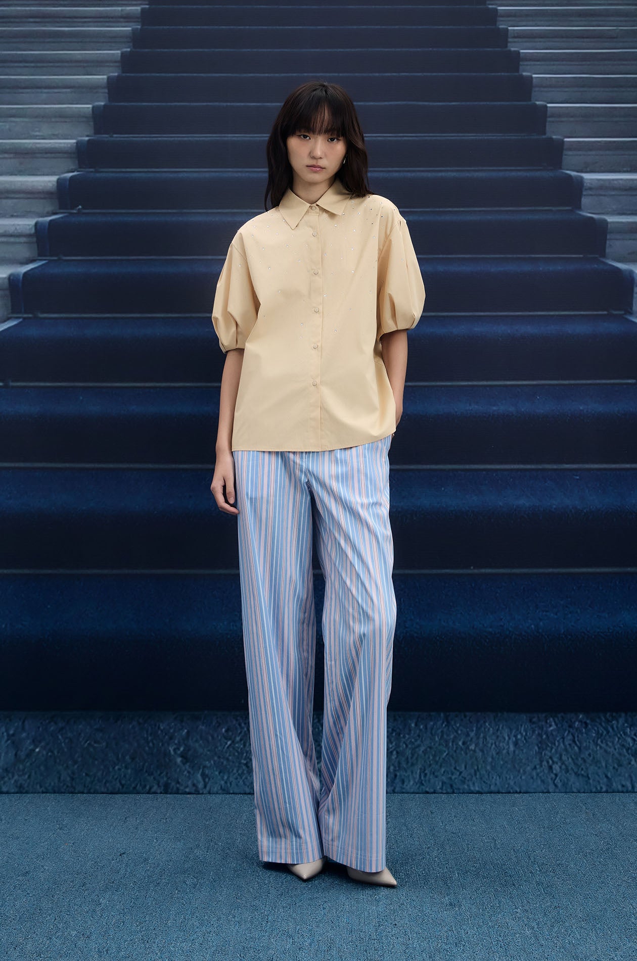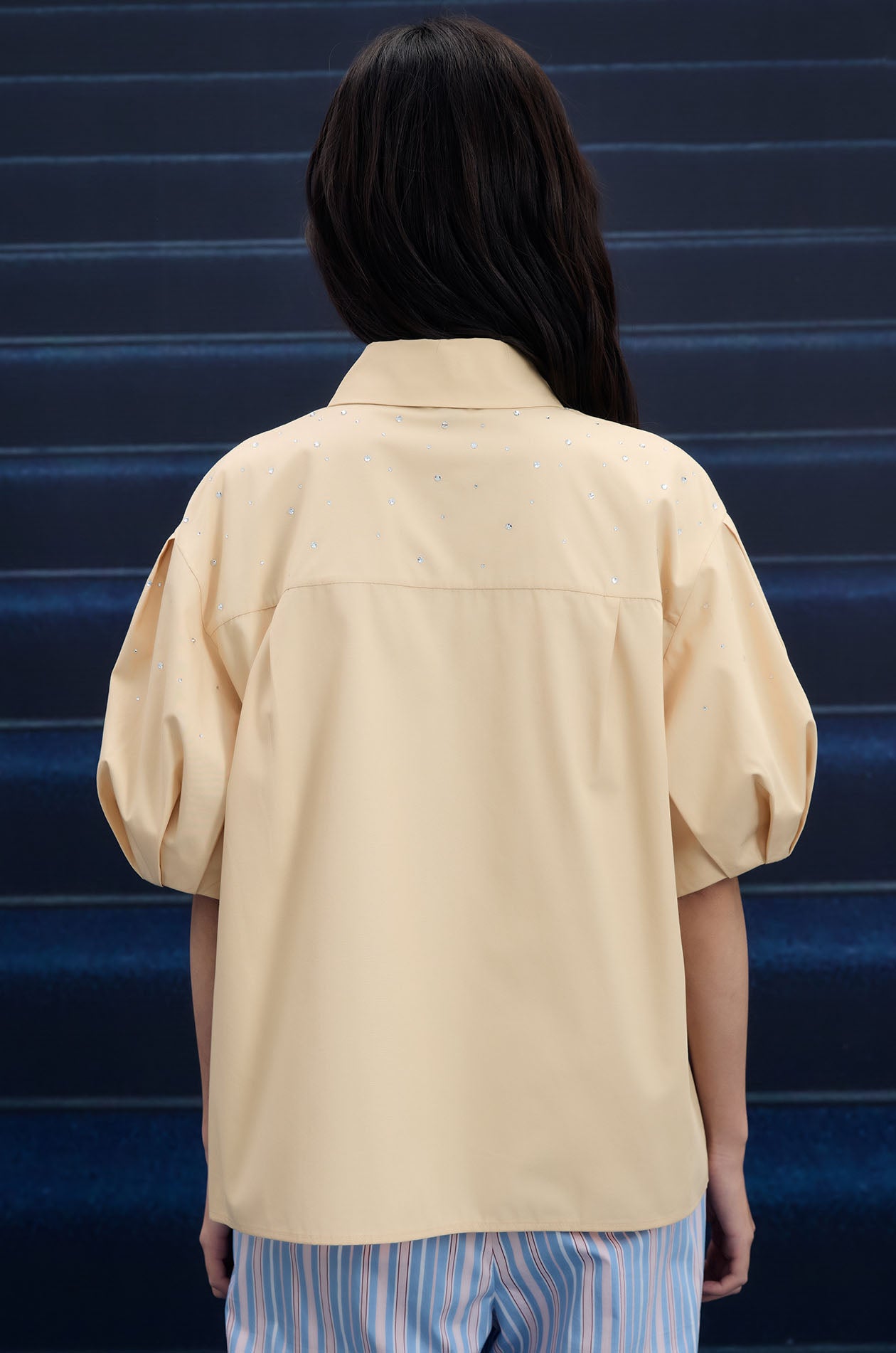 Short-puff-sleeved shirt in poplin. Accented with rhinestone on the upper part. Oversized-fit boxy silhouette with classic collar. Front button closure. Available in beige and striped blue.