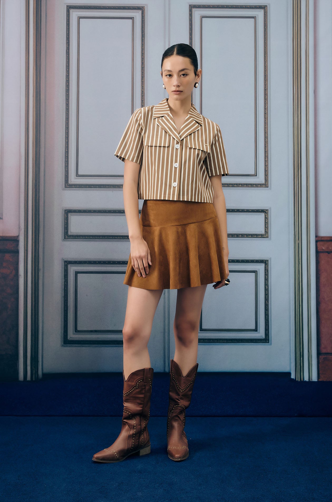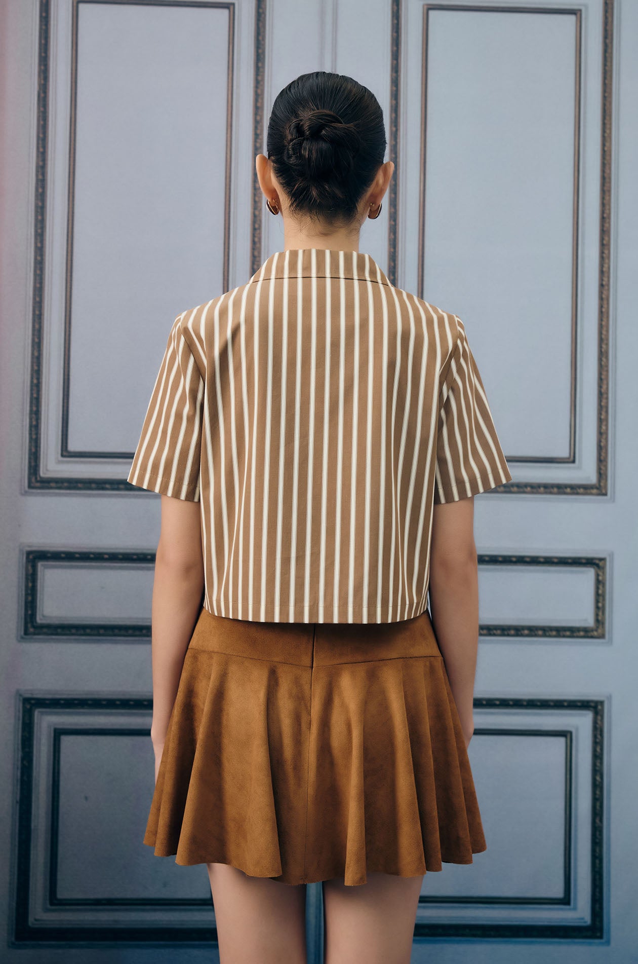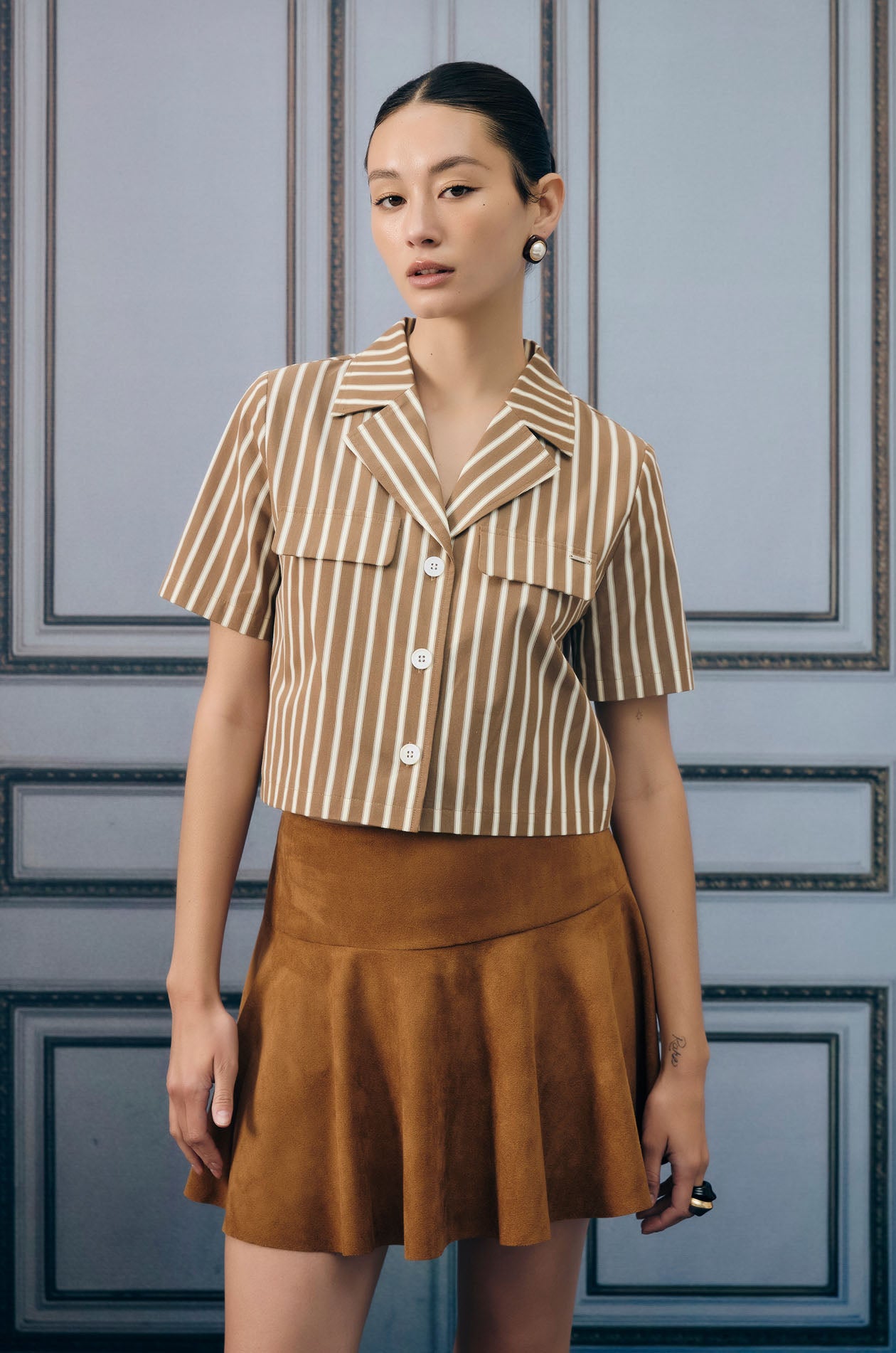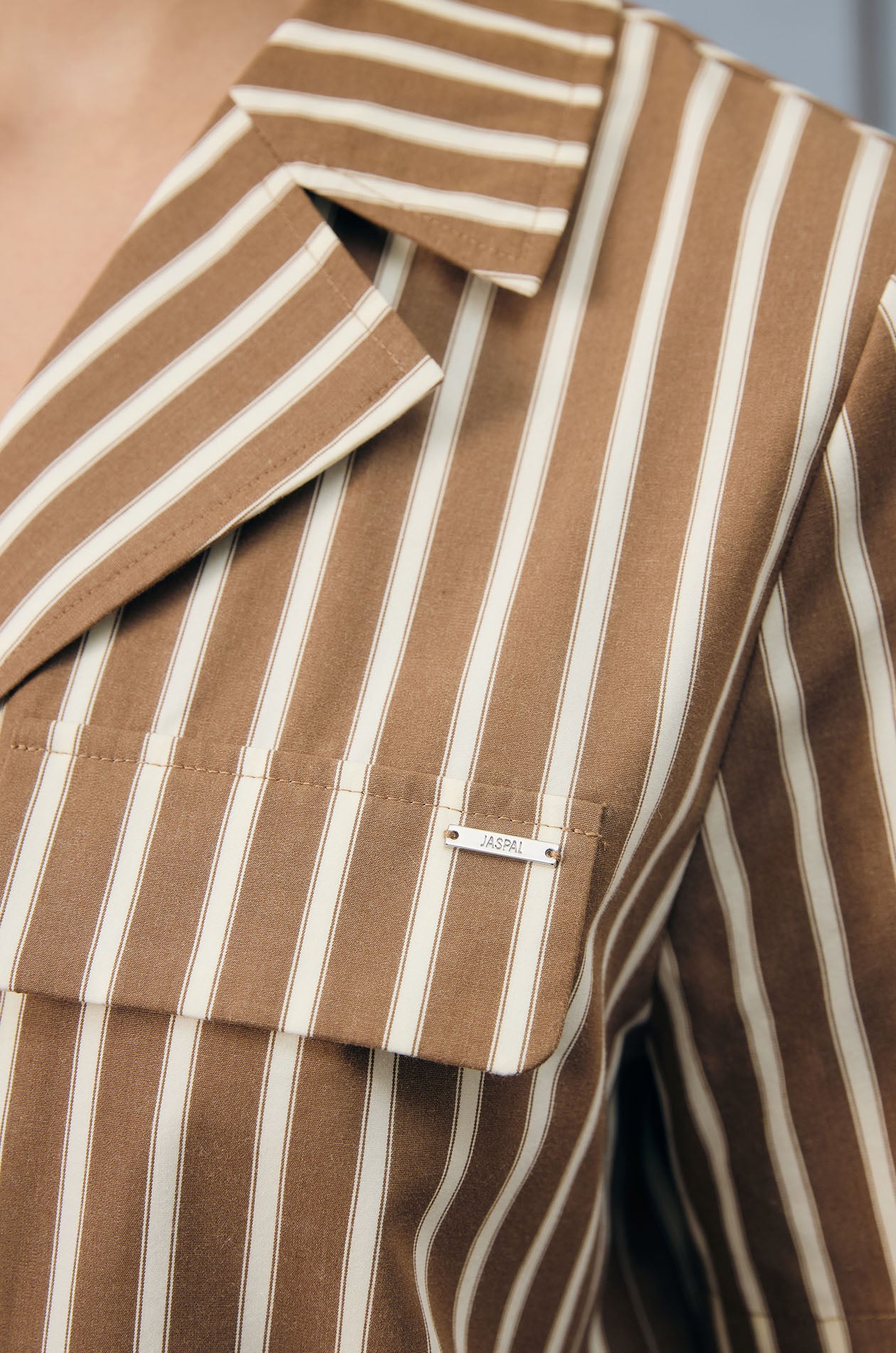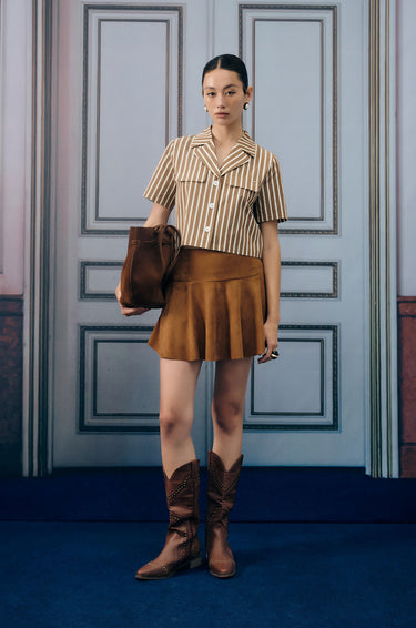 Short-sleeved cropped shirt in denim-like fabric. Vertical stripes. Notched collar and faux flap pockets. Front button closure. Available in brown.