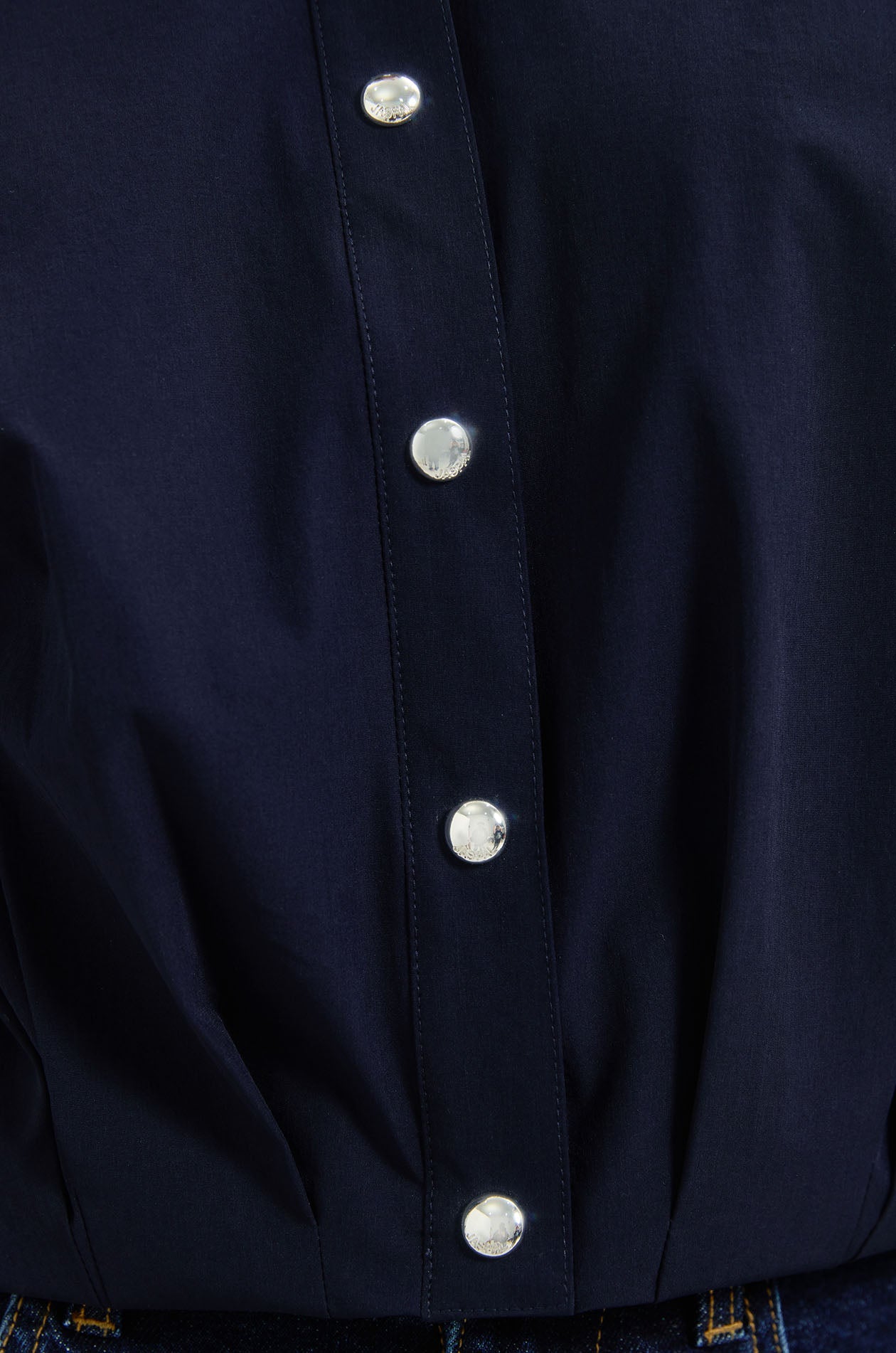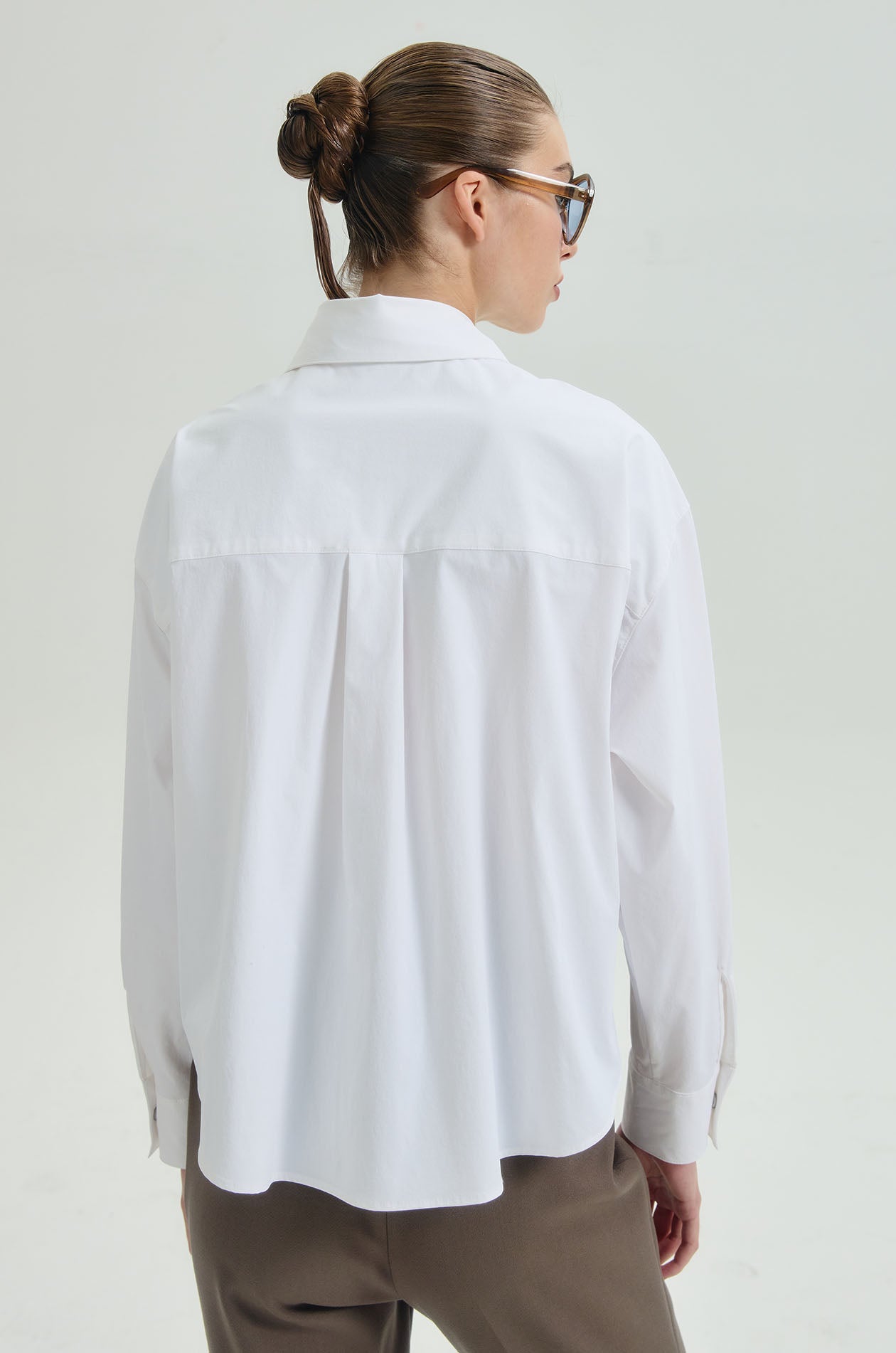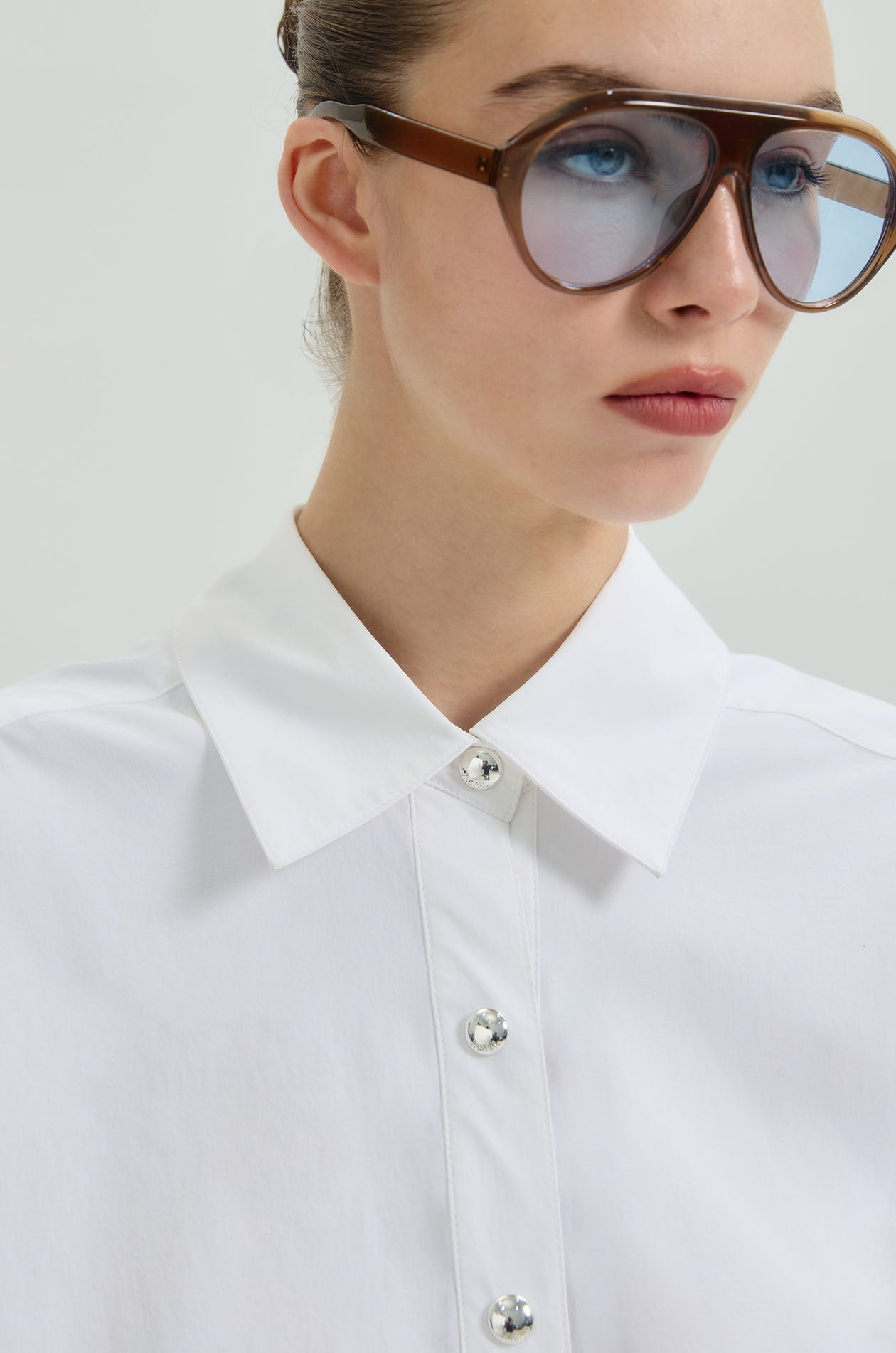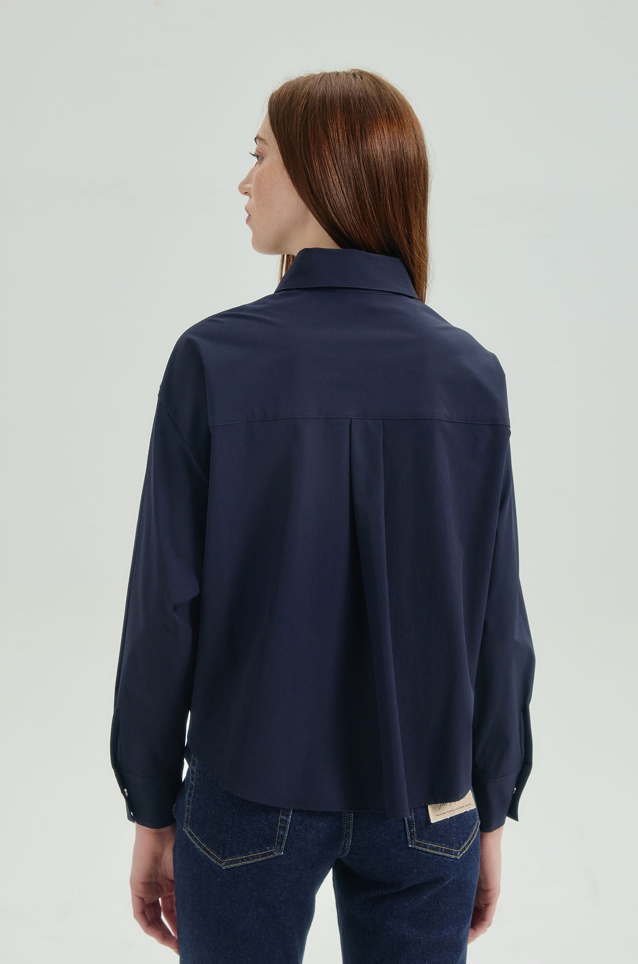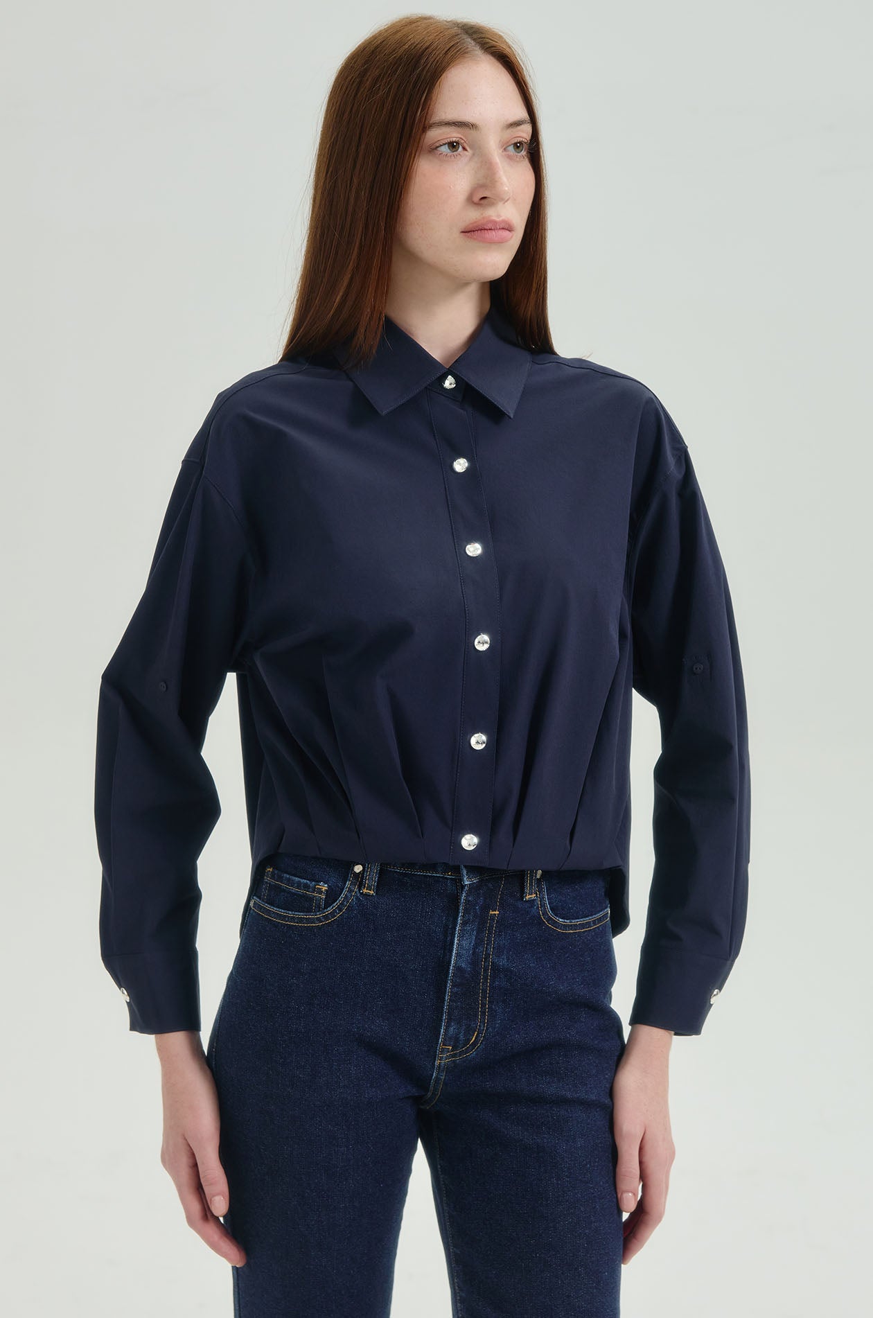 Long-sleeved shirt in stretchy technical fabric. Oversized fit with classic collar, fold-back detail at front hem, and buttoned straps at both sleeves. Front button closure. Available in dark navy and white.