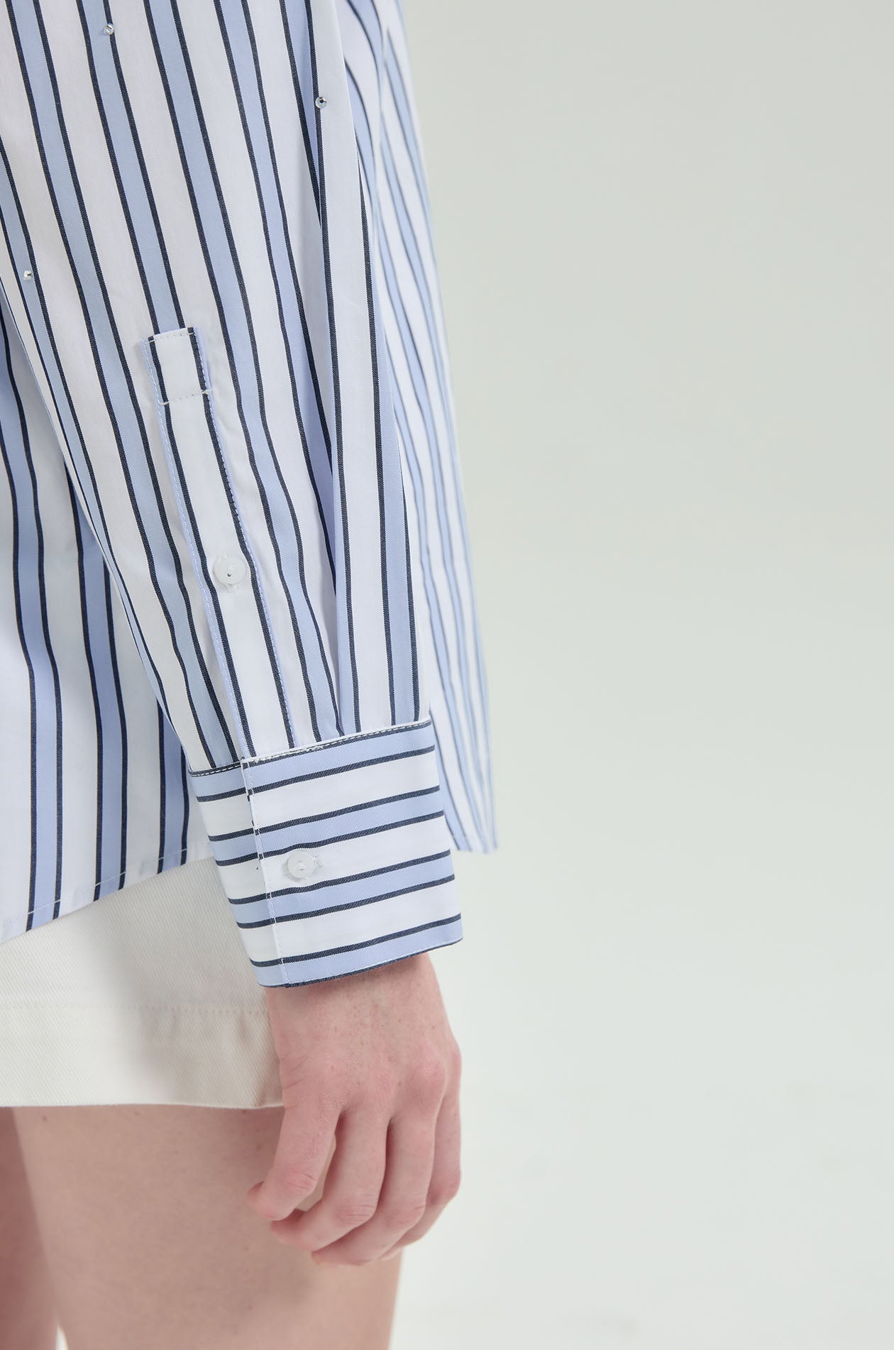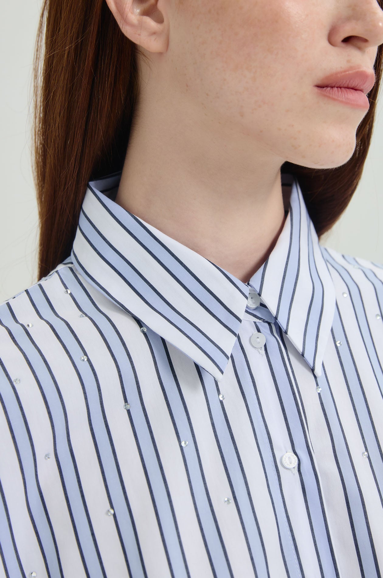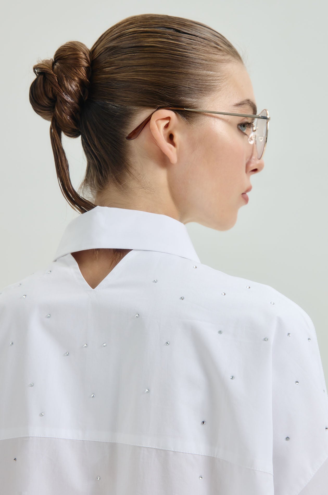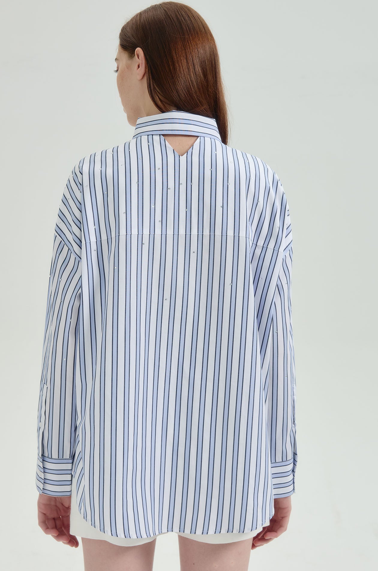 Long-sleeved shirt in cotton poplin. Oversized fit with classic collar, V-shaped cut-out at the back, and rhinestone embellishment at the upper bodice. Front button closure. Available in solid white, striped pink, and striped blue.