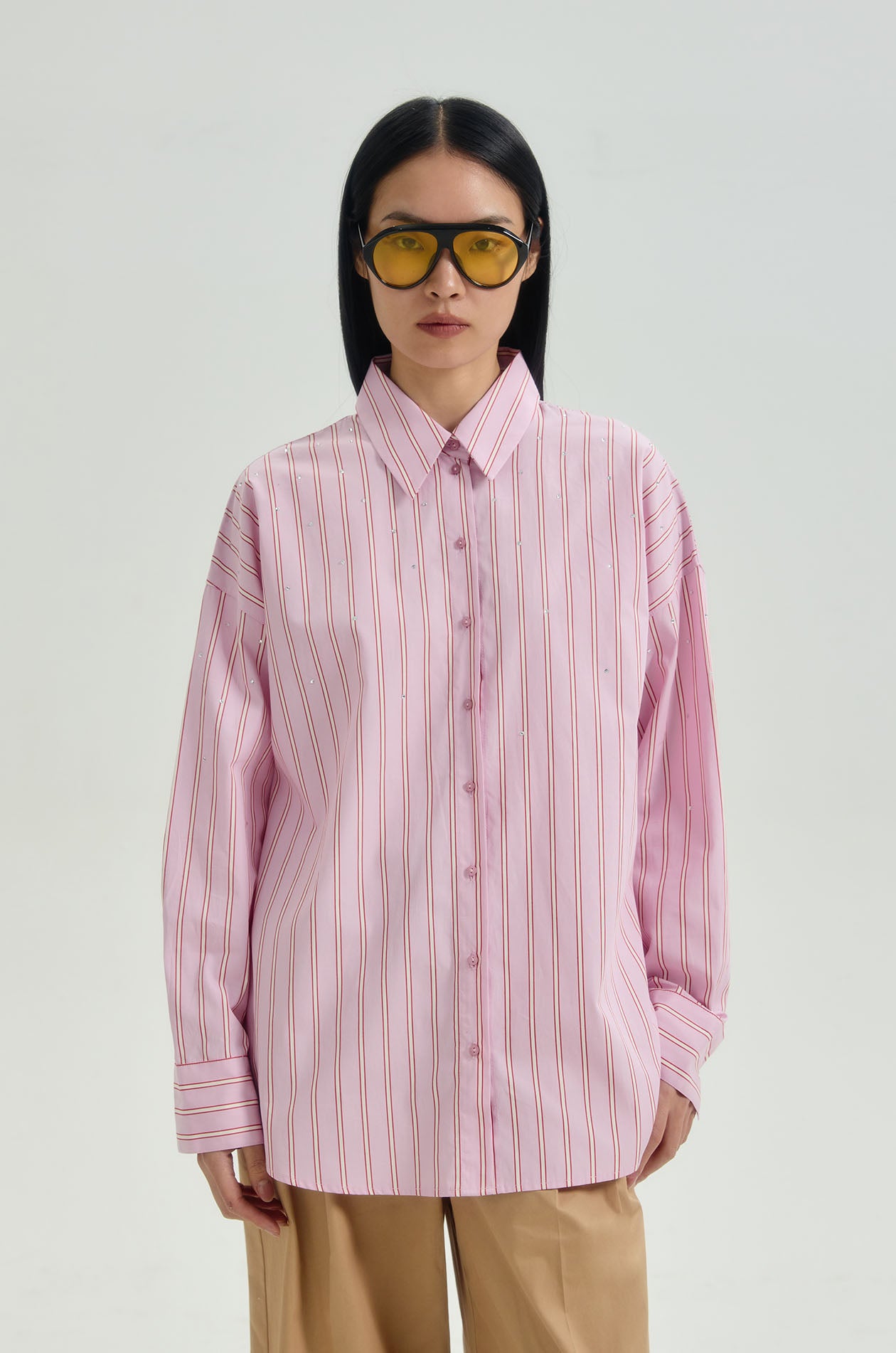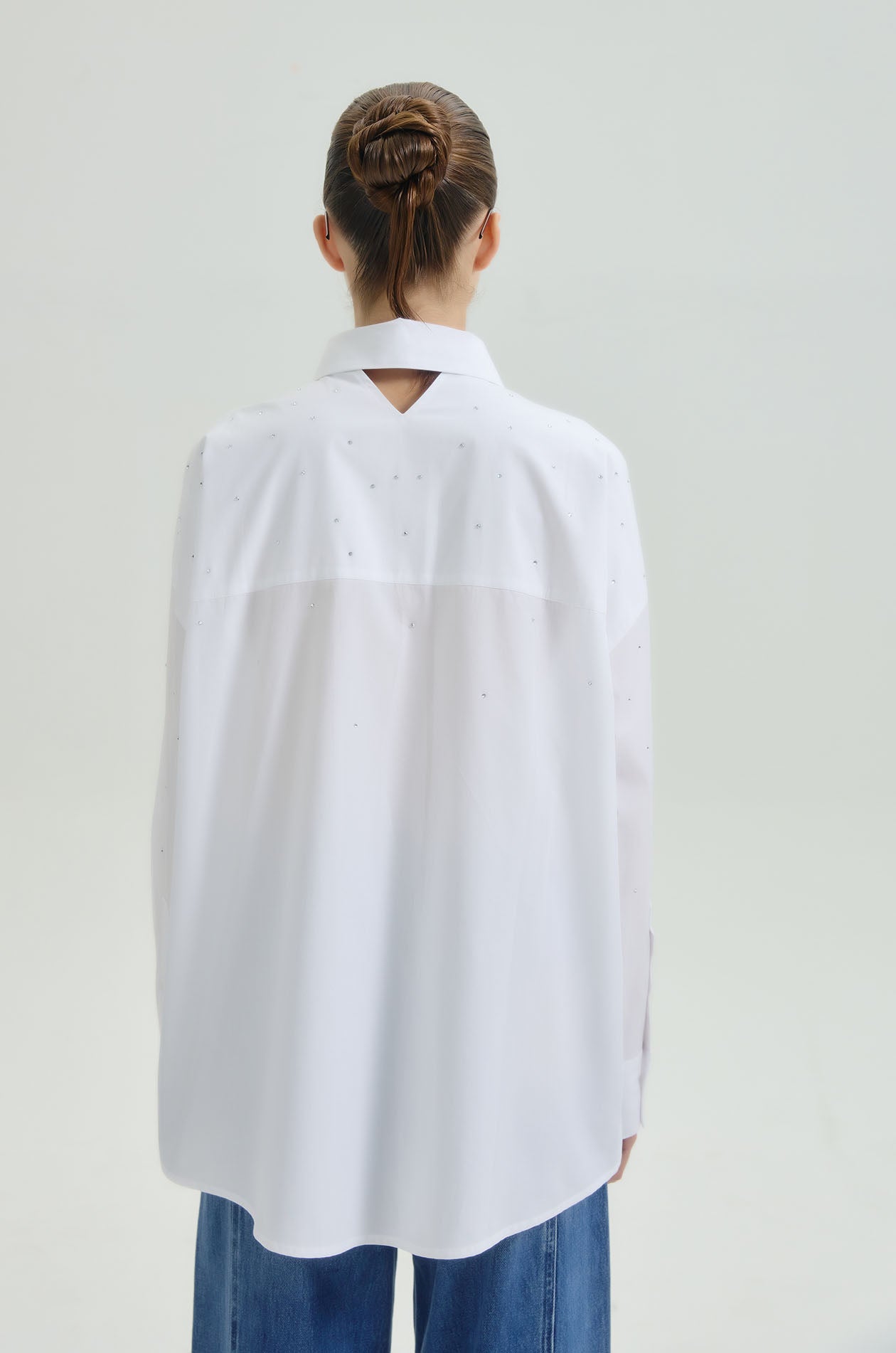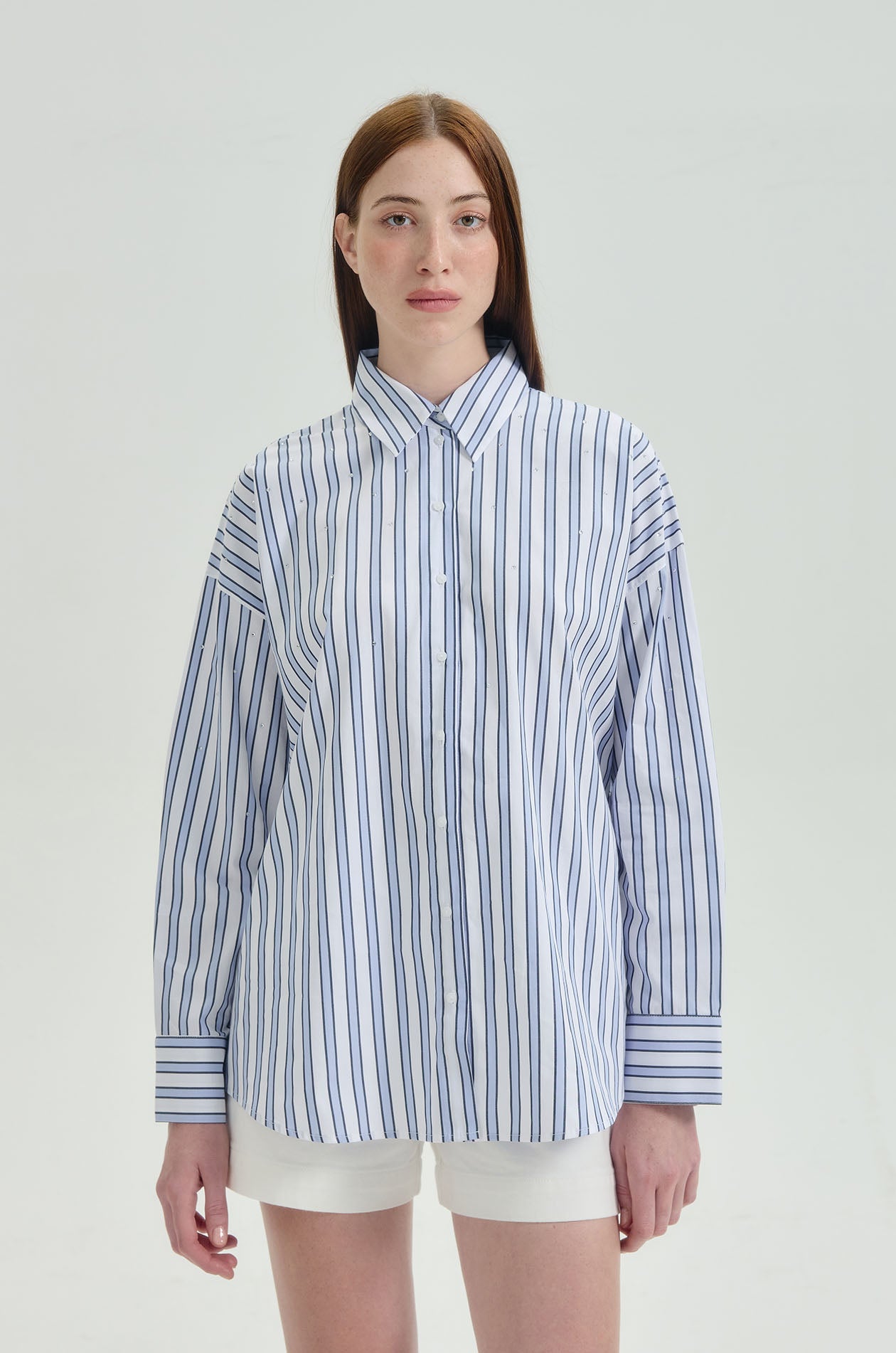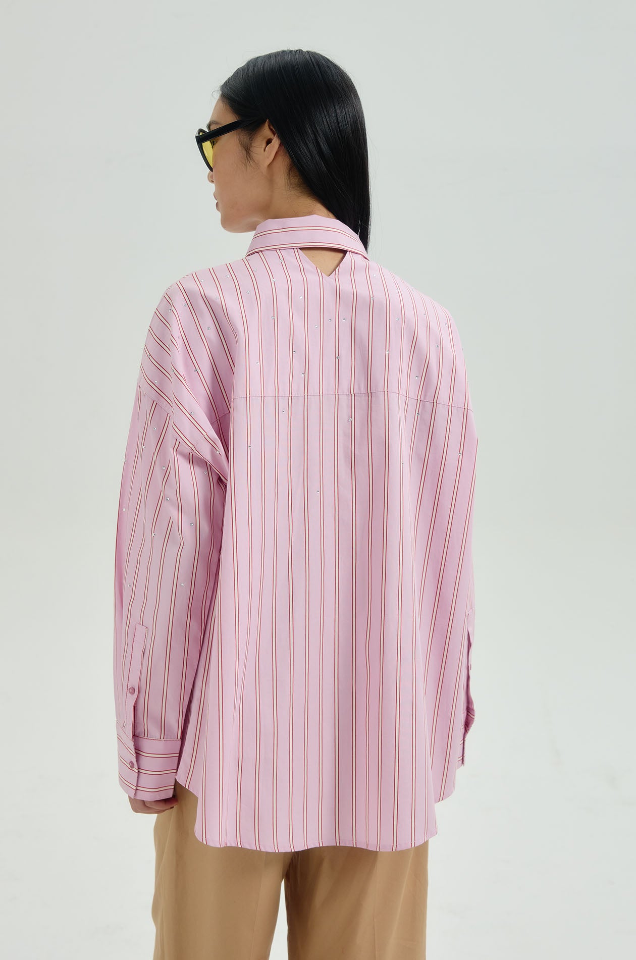 Long-sleeved shirt in cotton poplin. Oversized fit with classic collar, V-shaped cut-out at the back, and rhinestone embellishment at the upper bodice. Front button closure. Available in solid white, striped pink, and striped blue.