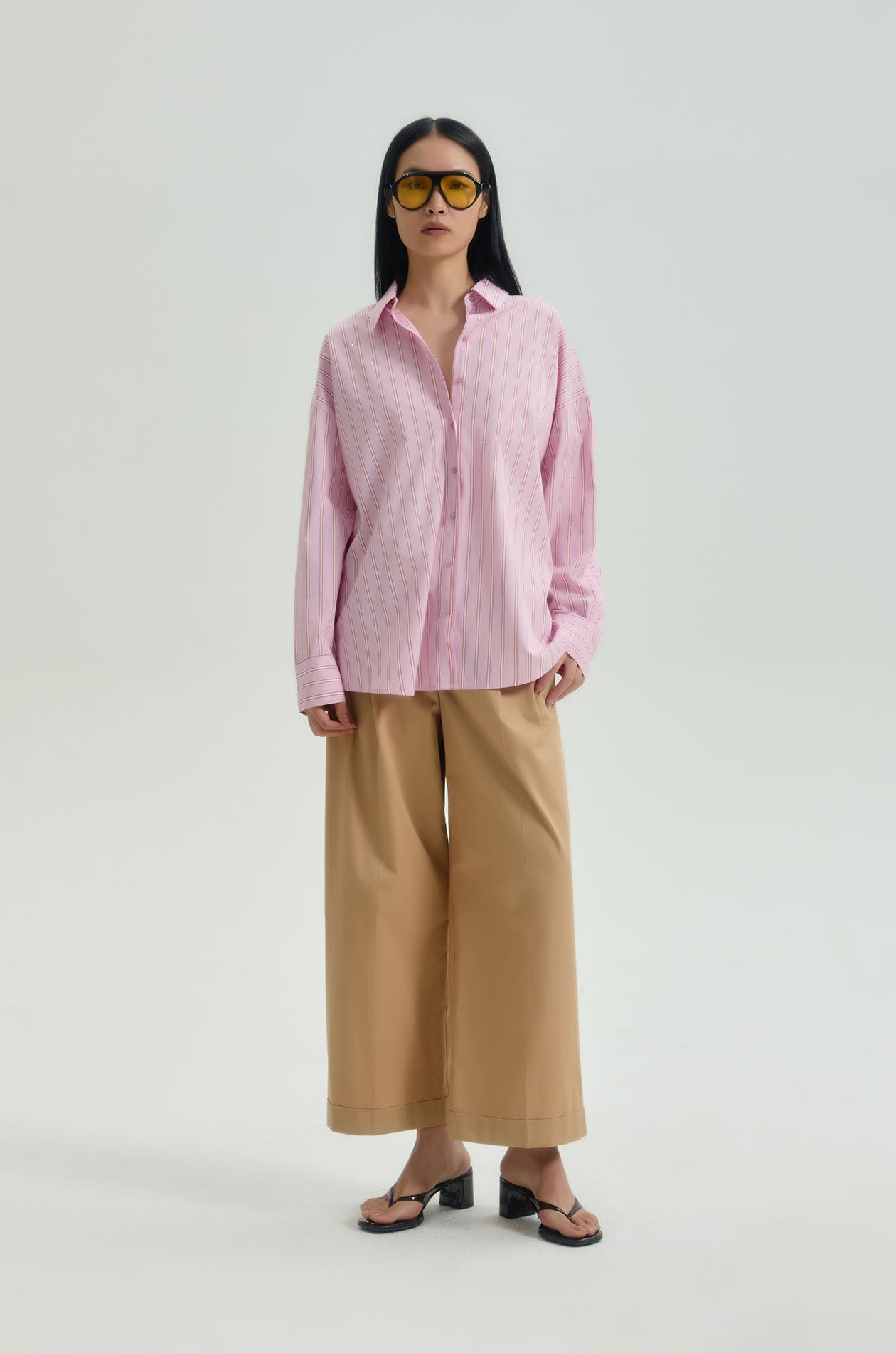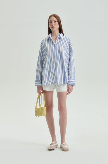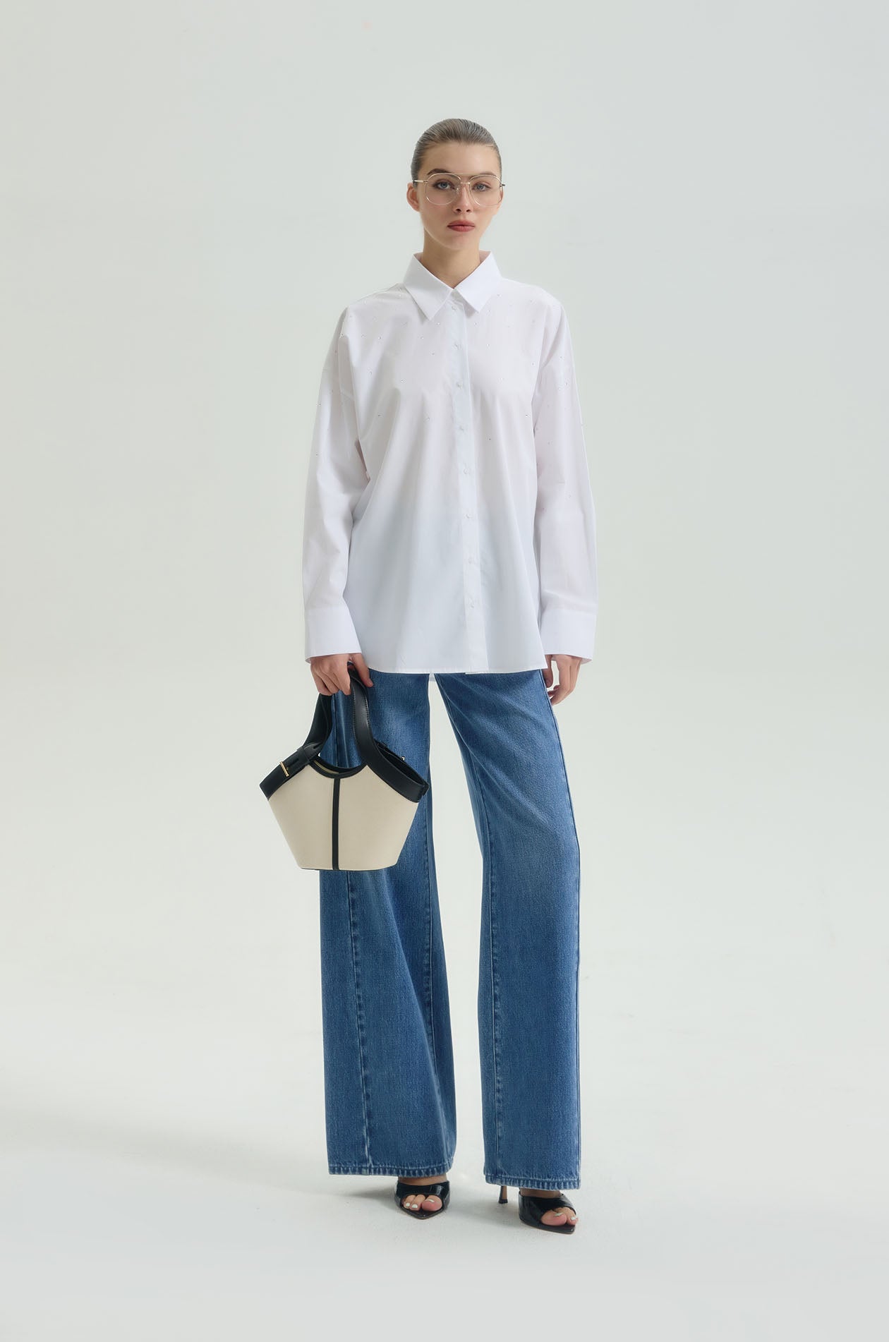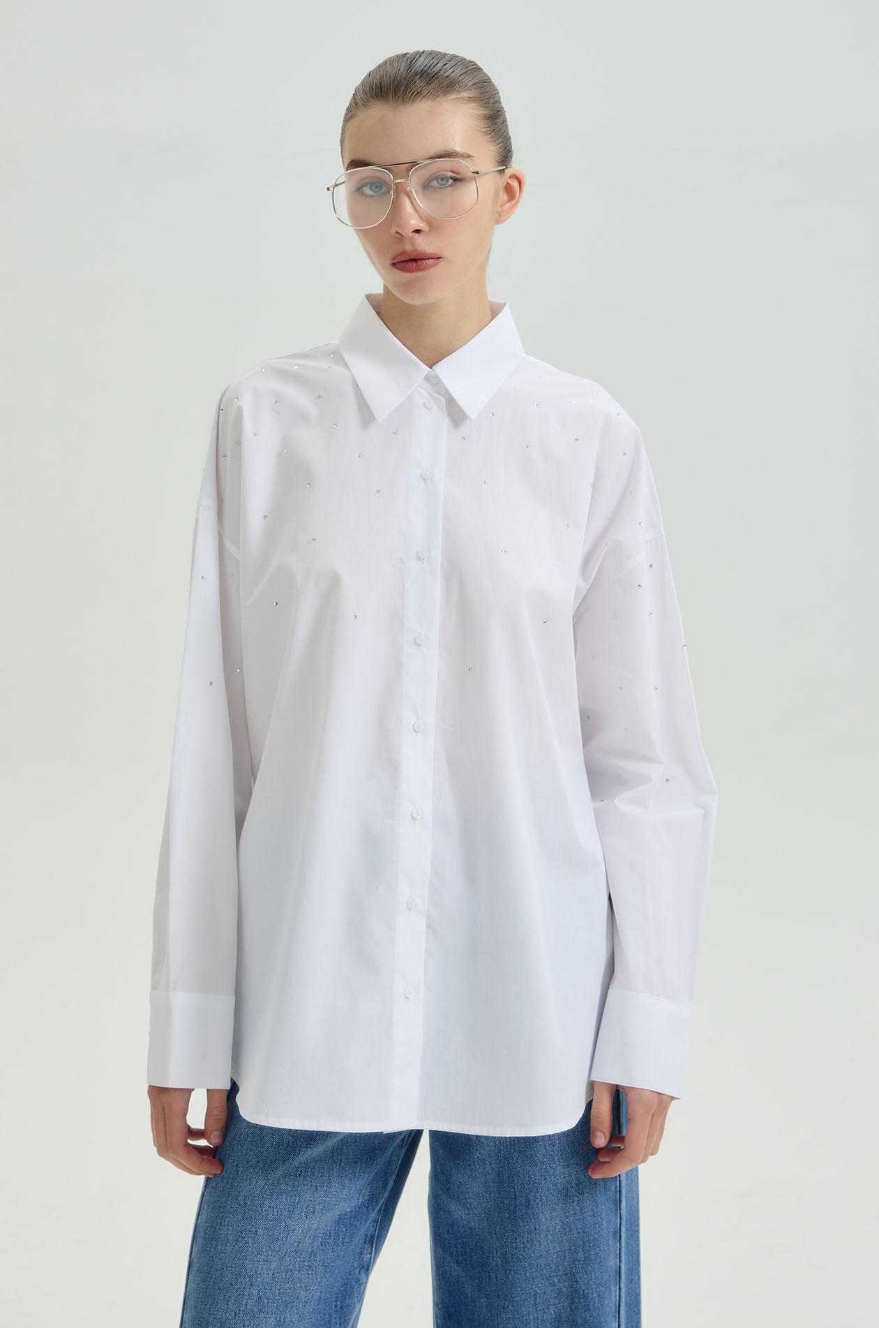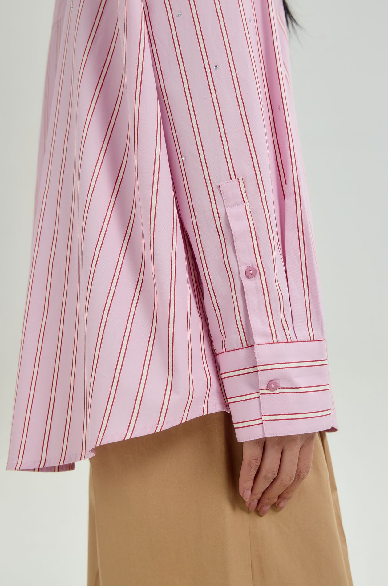 Long-sleeved shirt in cotton poplin. Oversized fit with classic collar, V-shaped cut-out at the back, and rhinestone embellishment at the upper bodice. Front button closure. Available in solid white, striped pink, and striped blue.
