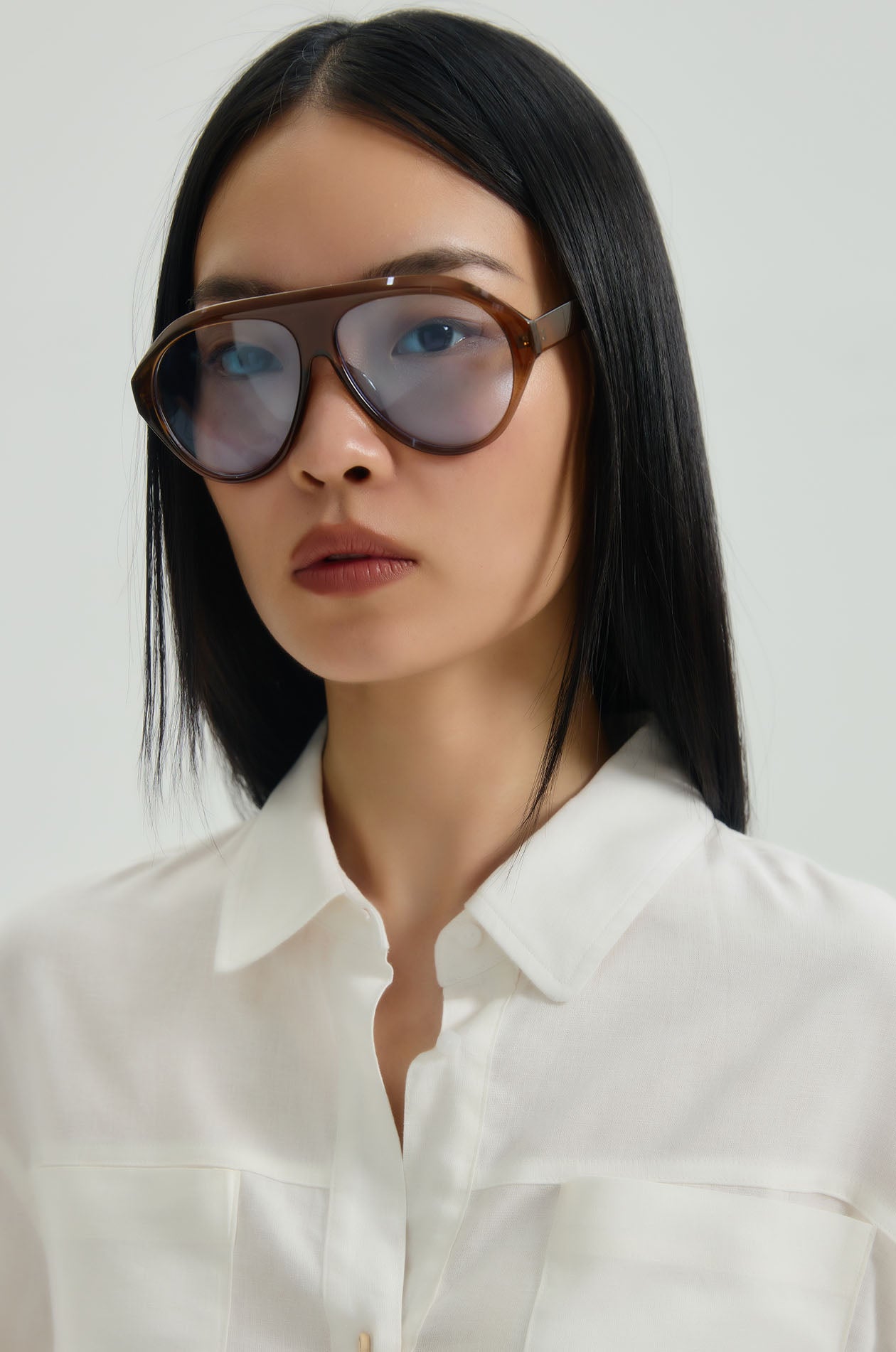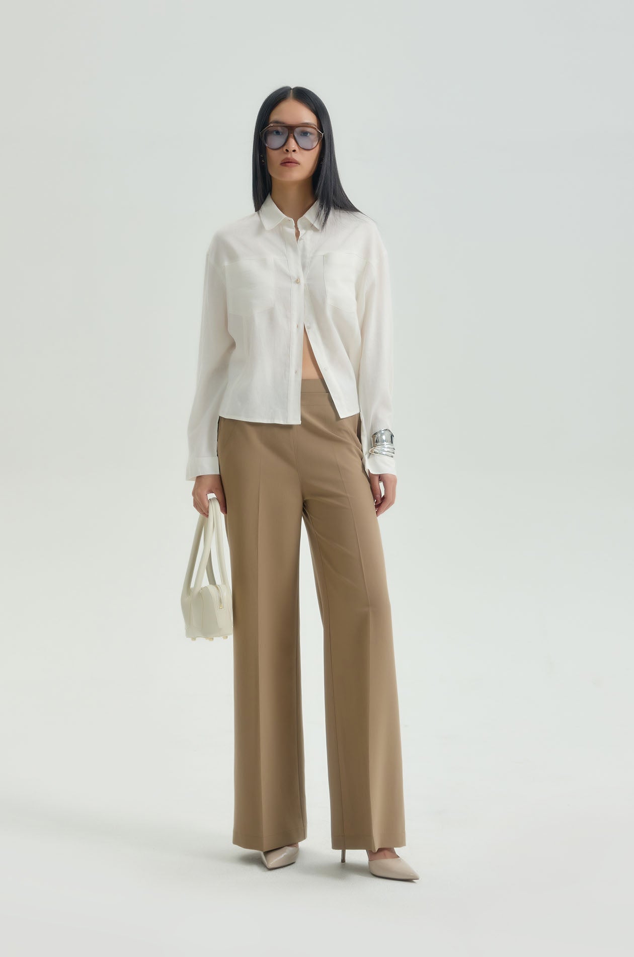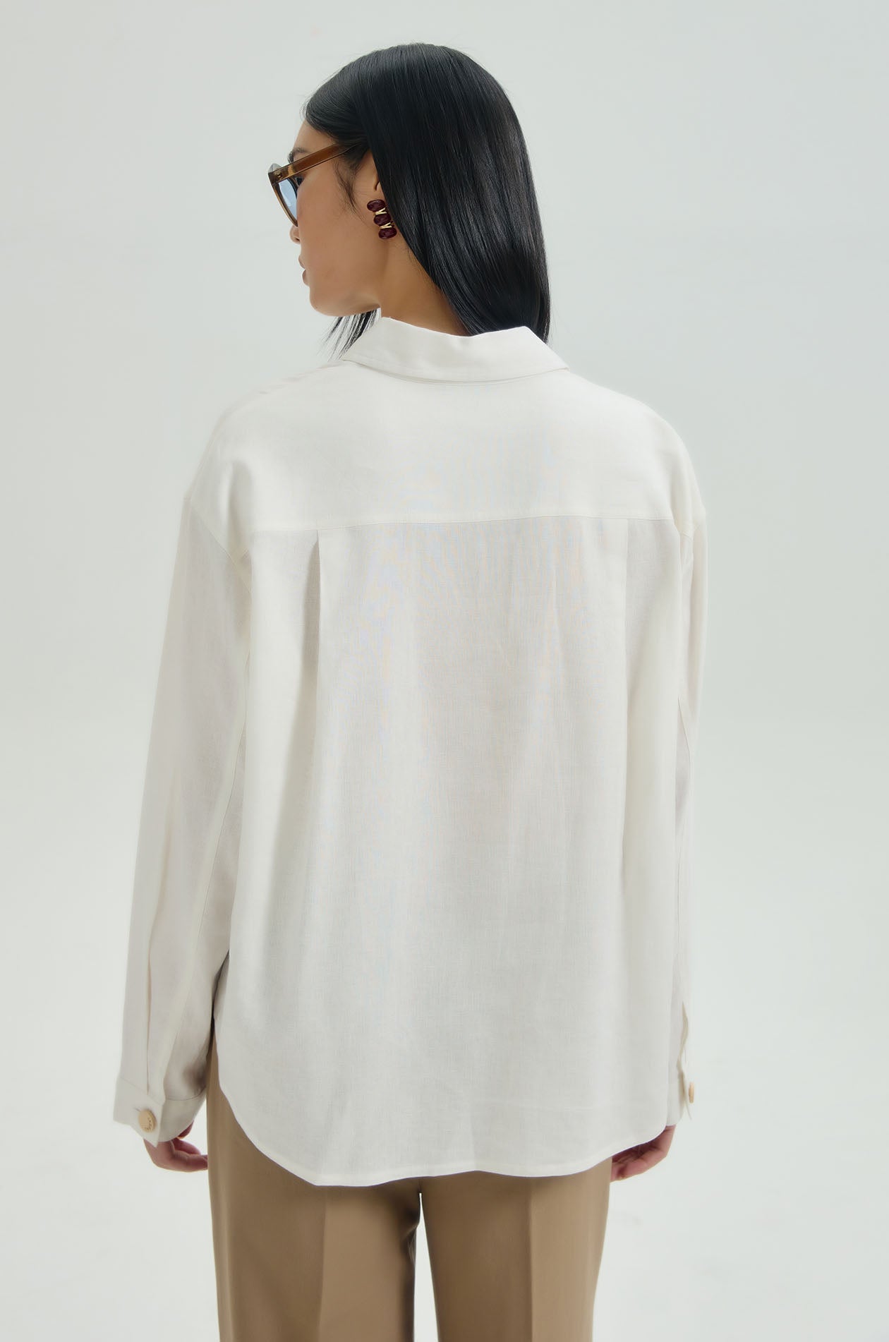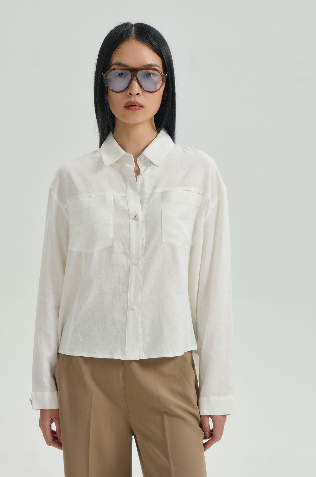 Long-sleeved shirt in find hopsack fabric. Oversized fit with classic collar, chest pockets, and asymmetric hemline. Front button closure. Available in off-white.