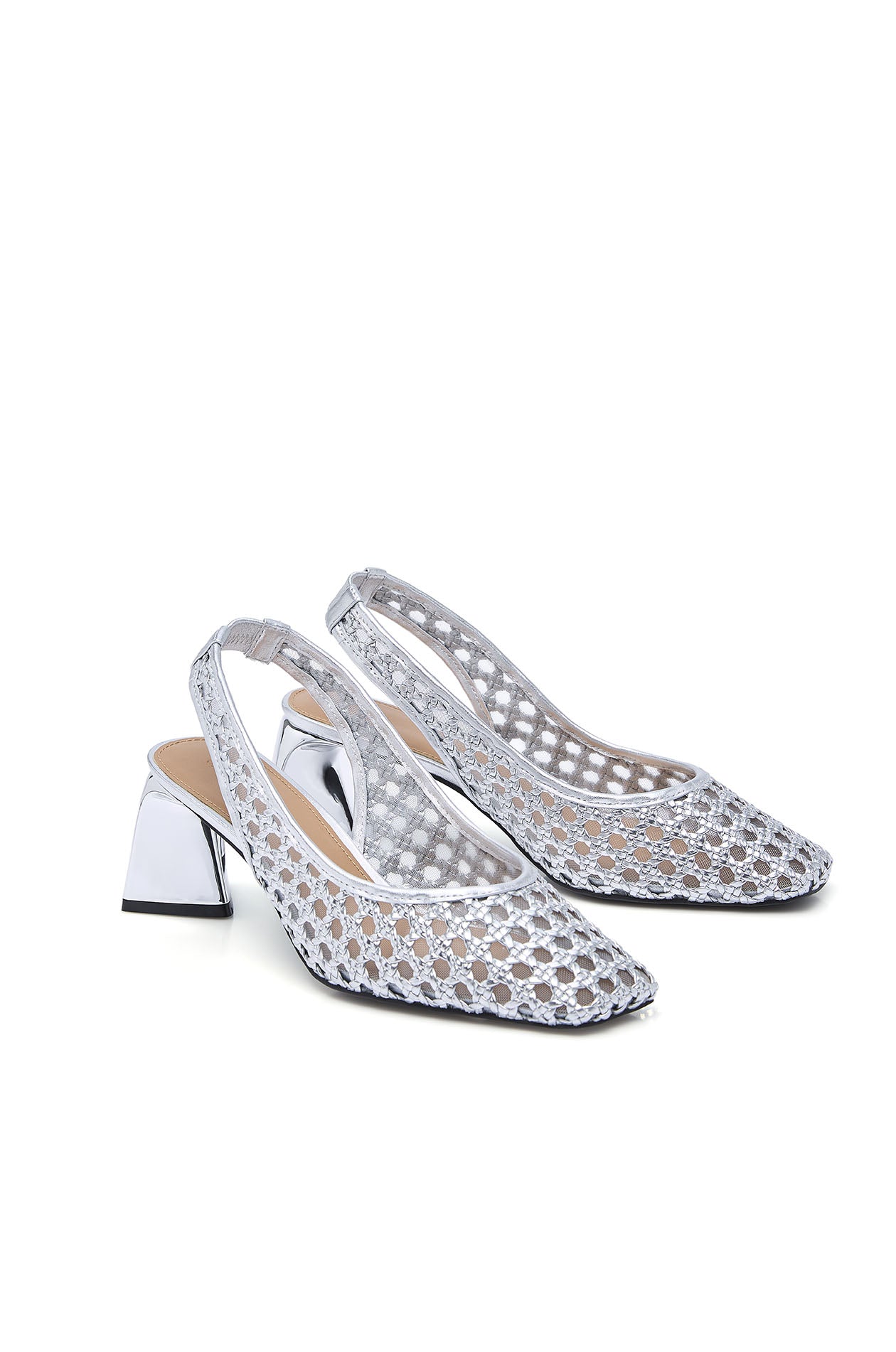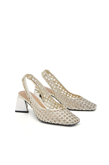 Slingback shoes in faux leather, featuring an openwork design and block heels. Available in gold and silver.