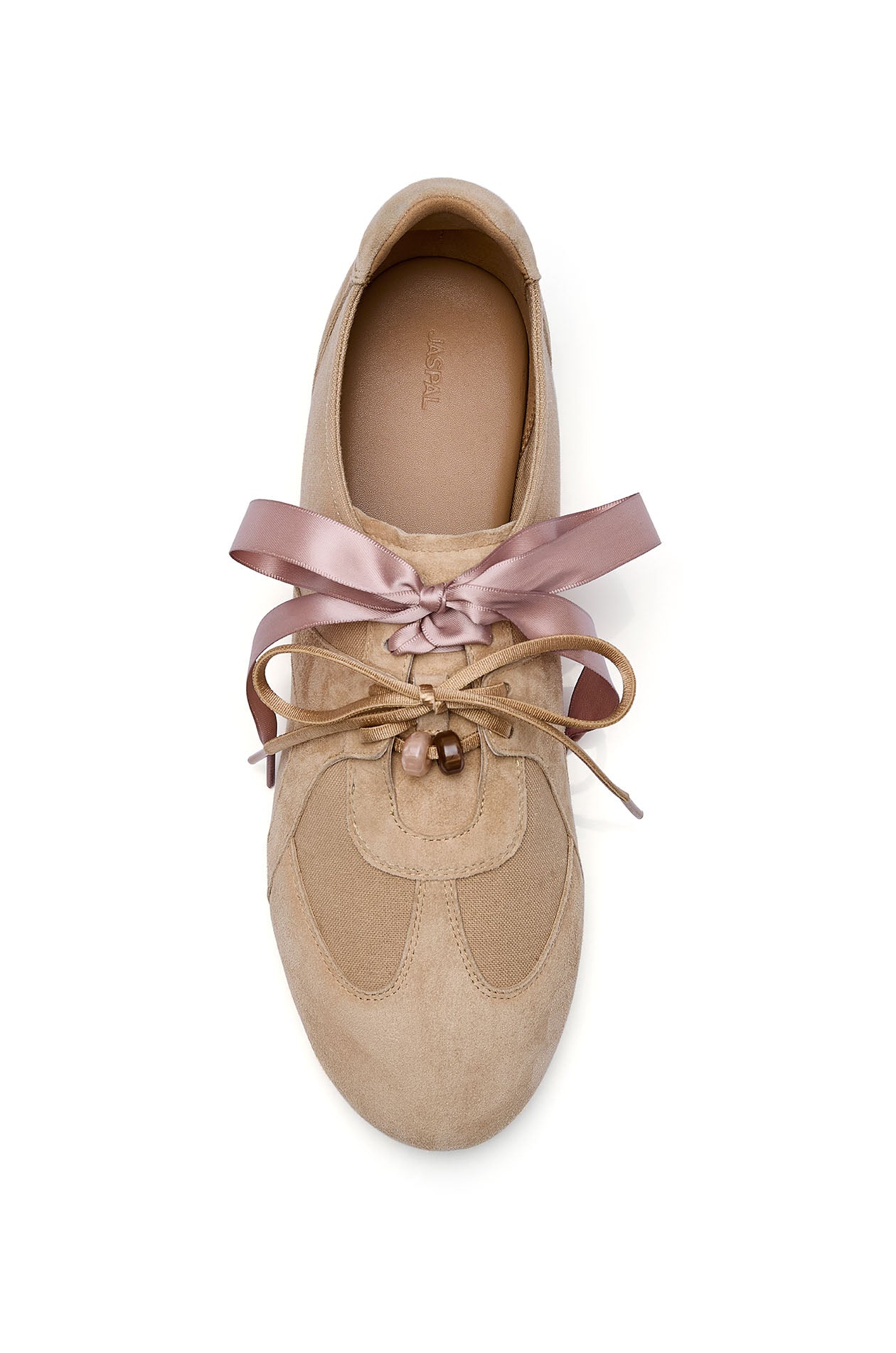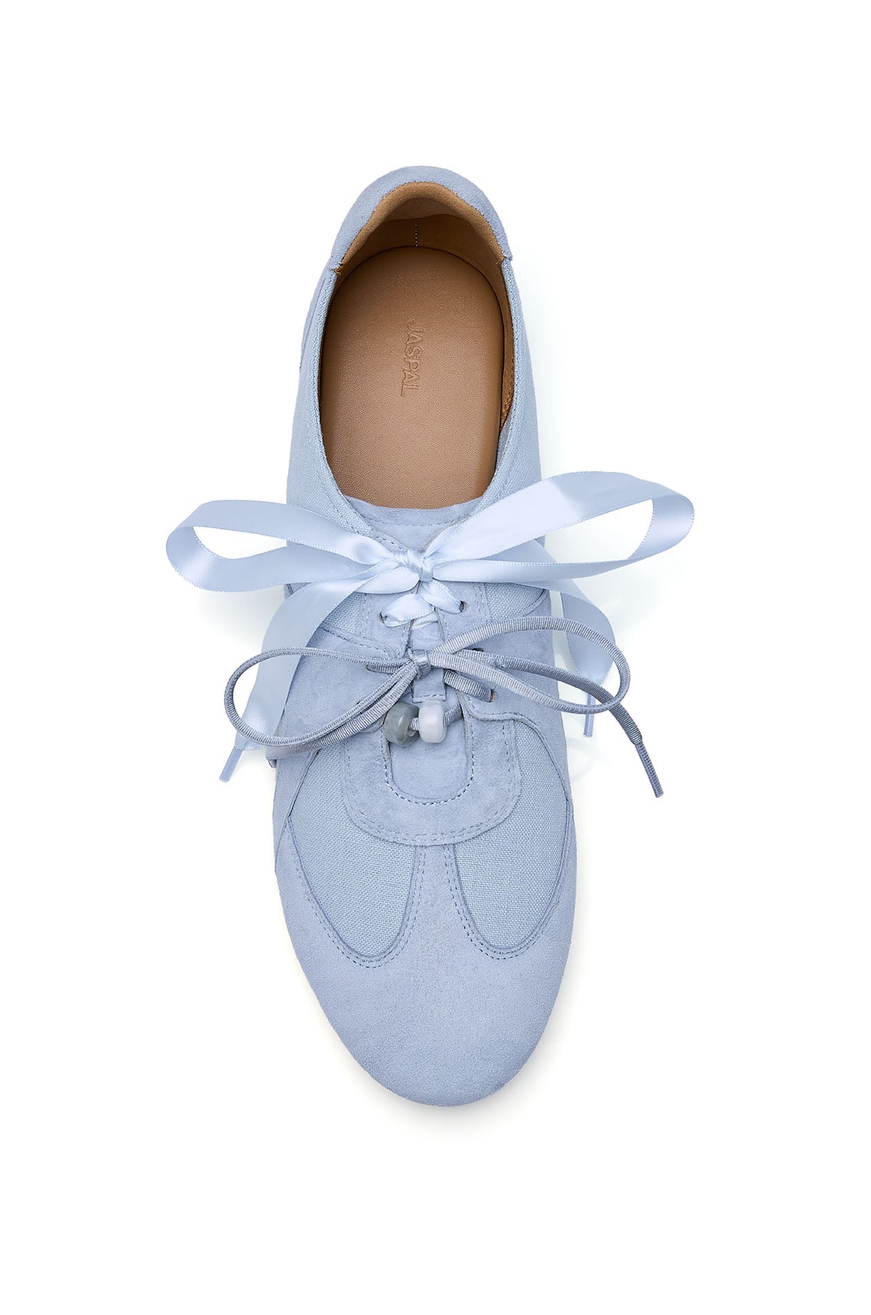 Sneakers crafted from cow leather and linen, featuring a feminine design with a round toe and tonal ribbon accent. Available in blue and nude.
