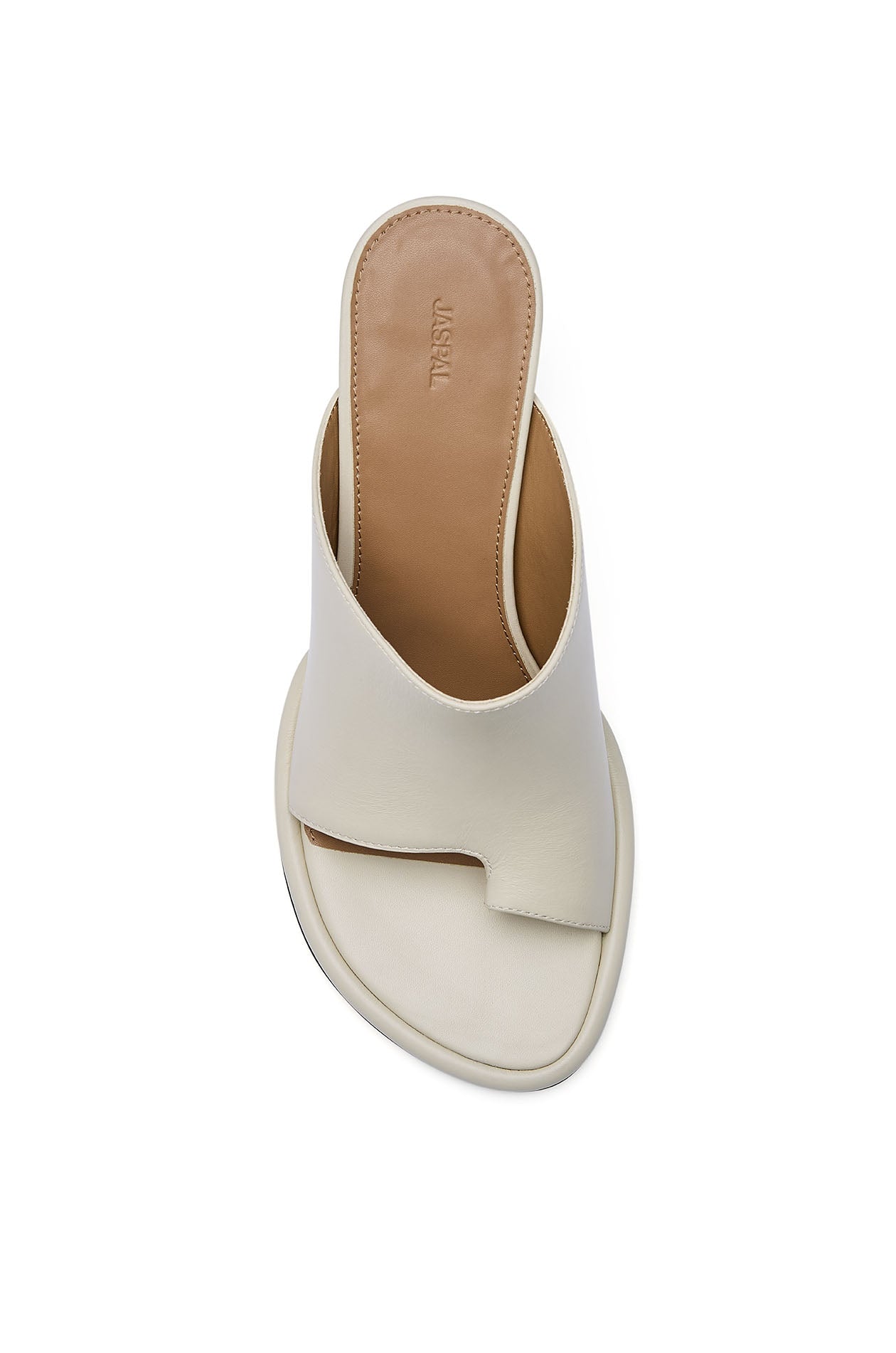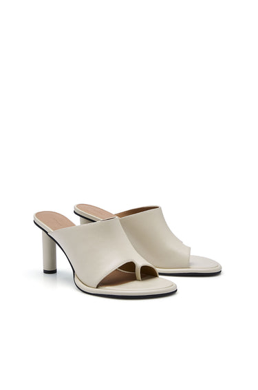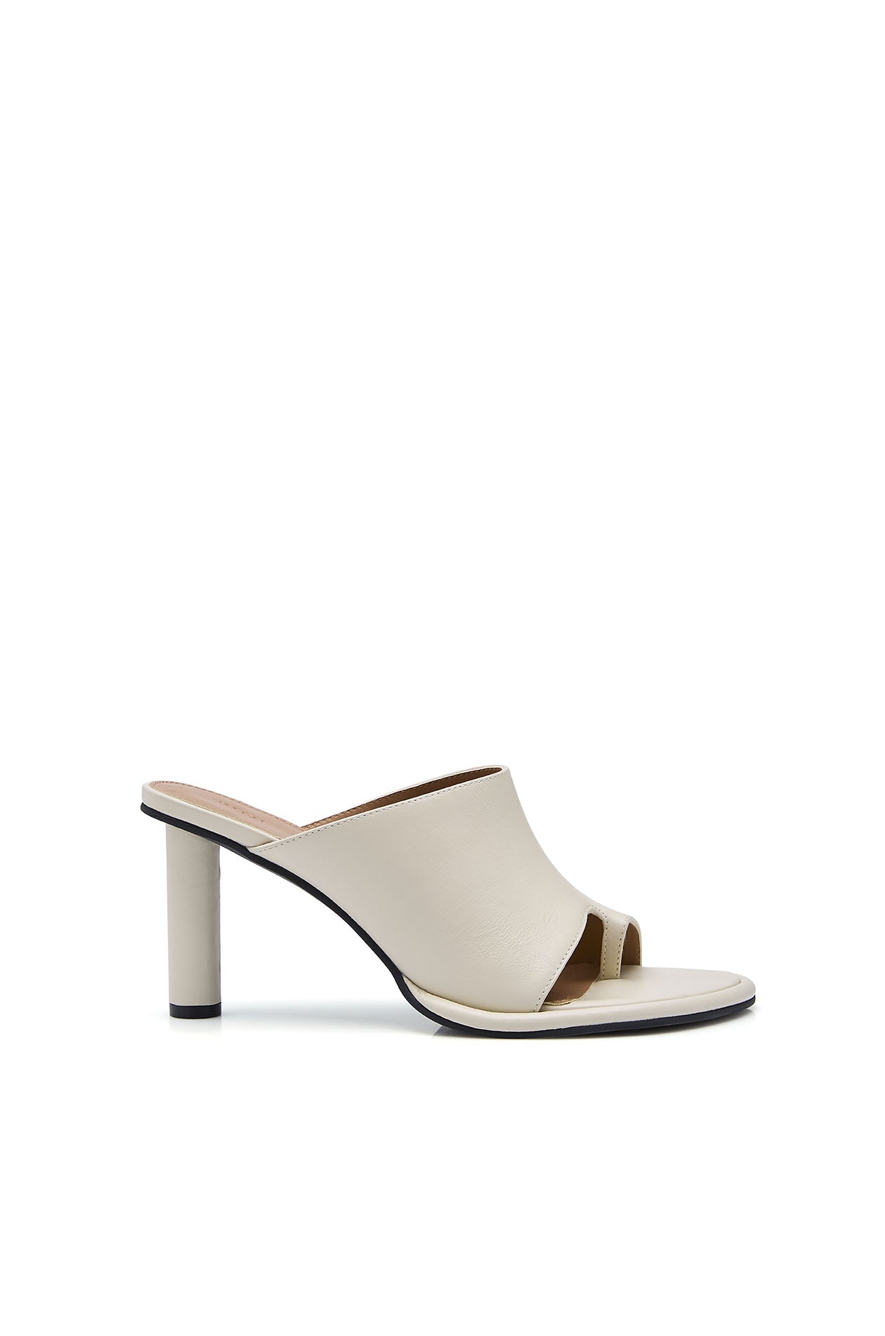Slides crafted from cow leather, featuring a hybrid style that merges thong and mule silhouettes with mid heels. Available in pale grey.