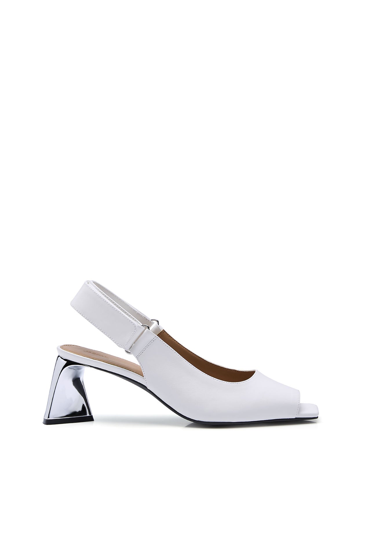 Slingback shoes in cow leather, featuring an open-toe design and block heels. Available in gold and silver.