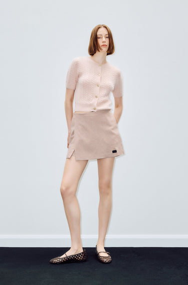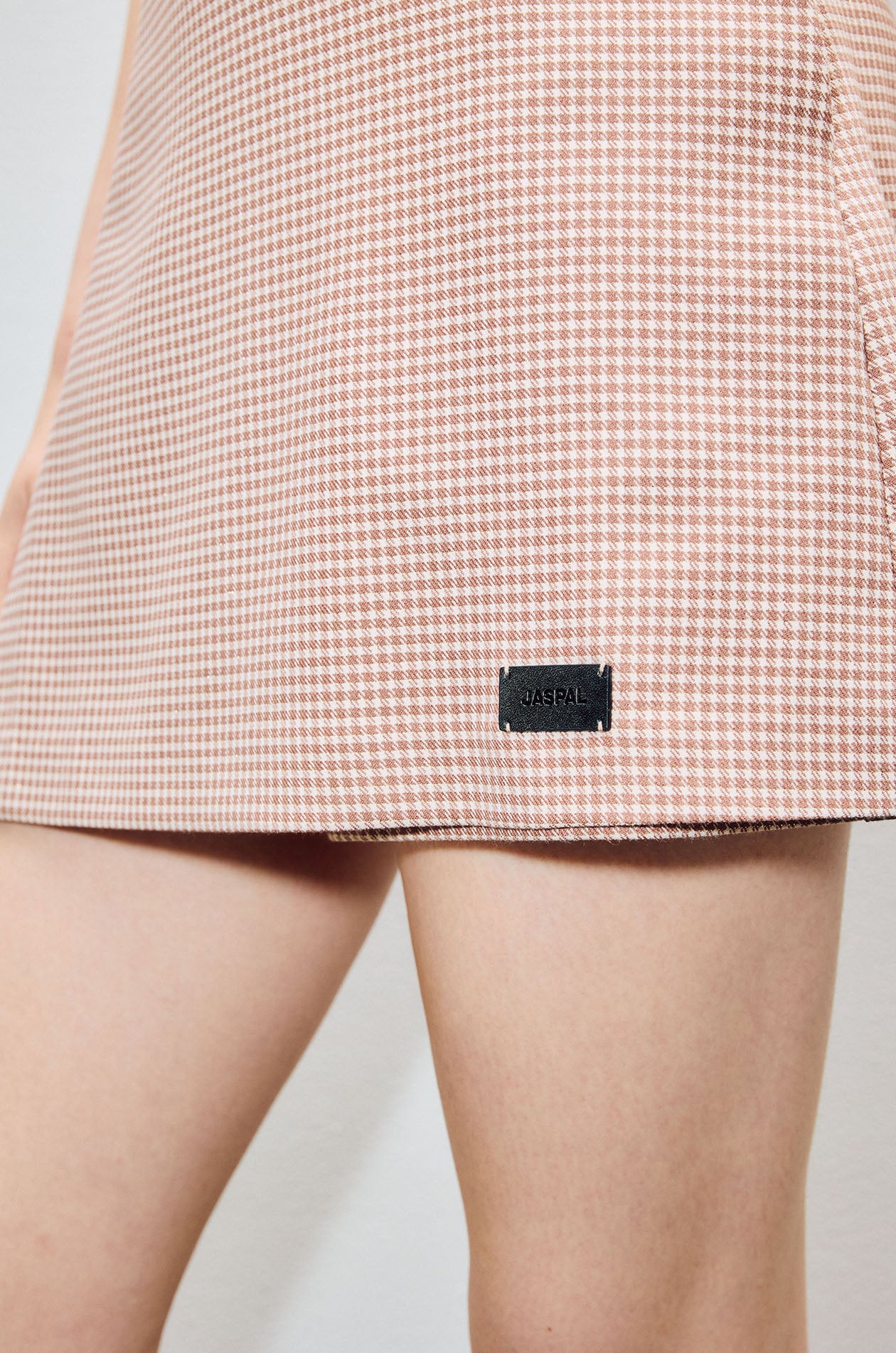 Mid-rise skort in tweed suiting fabric with houndstooth pattern. Wrap design and asymmetric hem with Jaspal badge. Side zip closure. Available in beige and black.